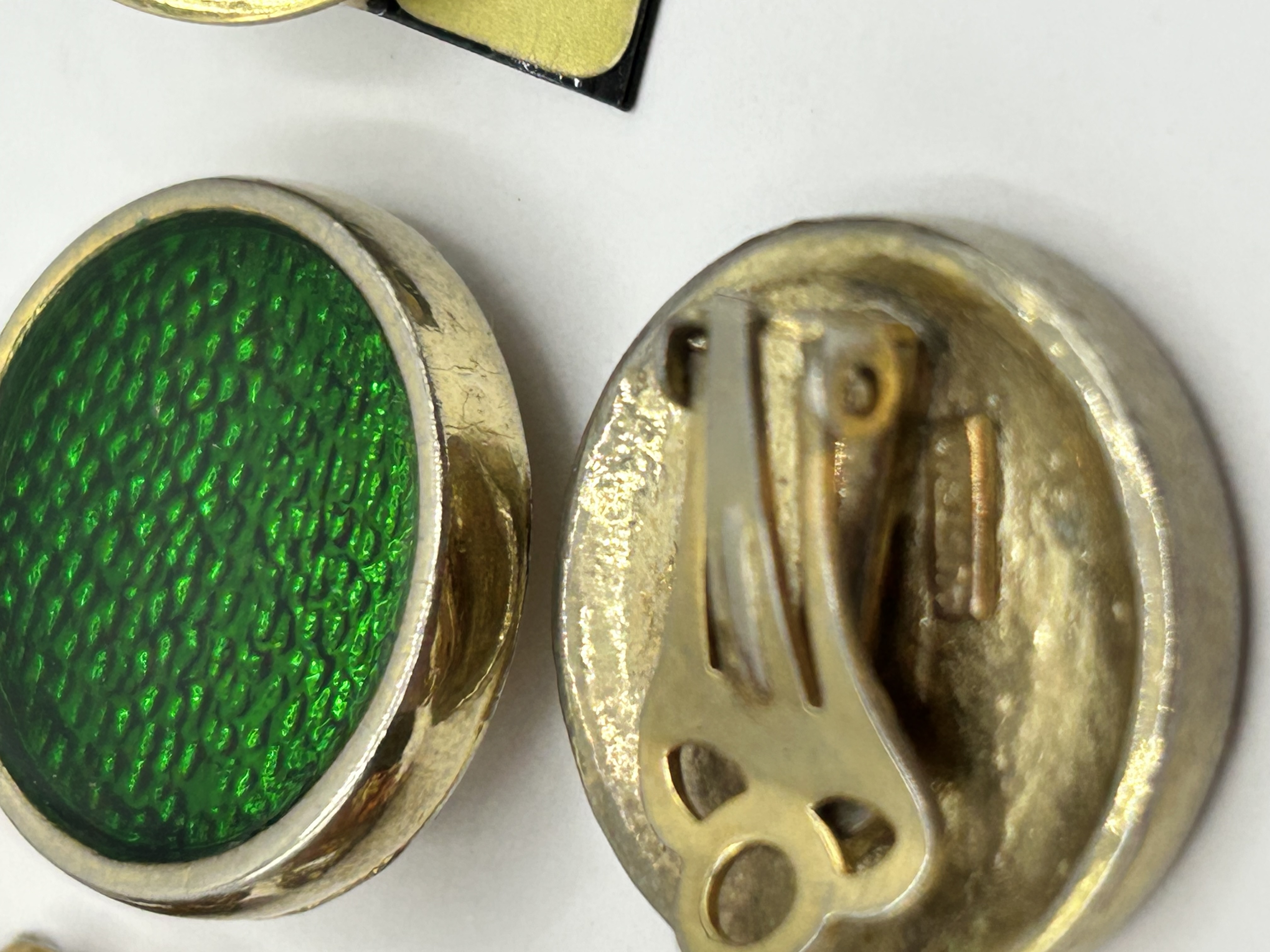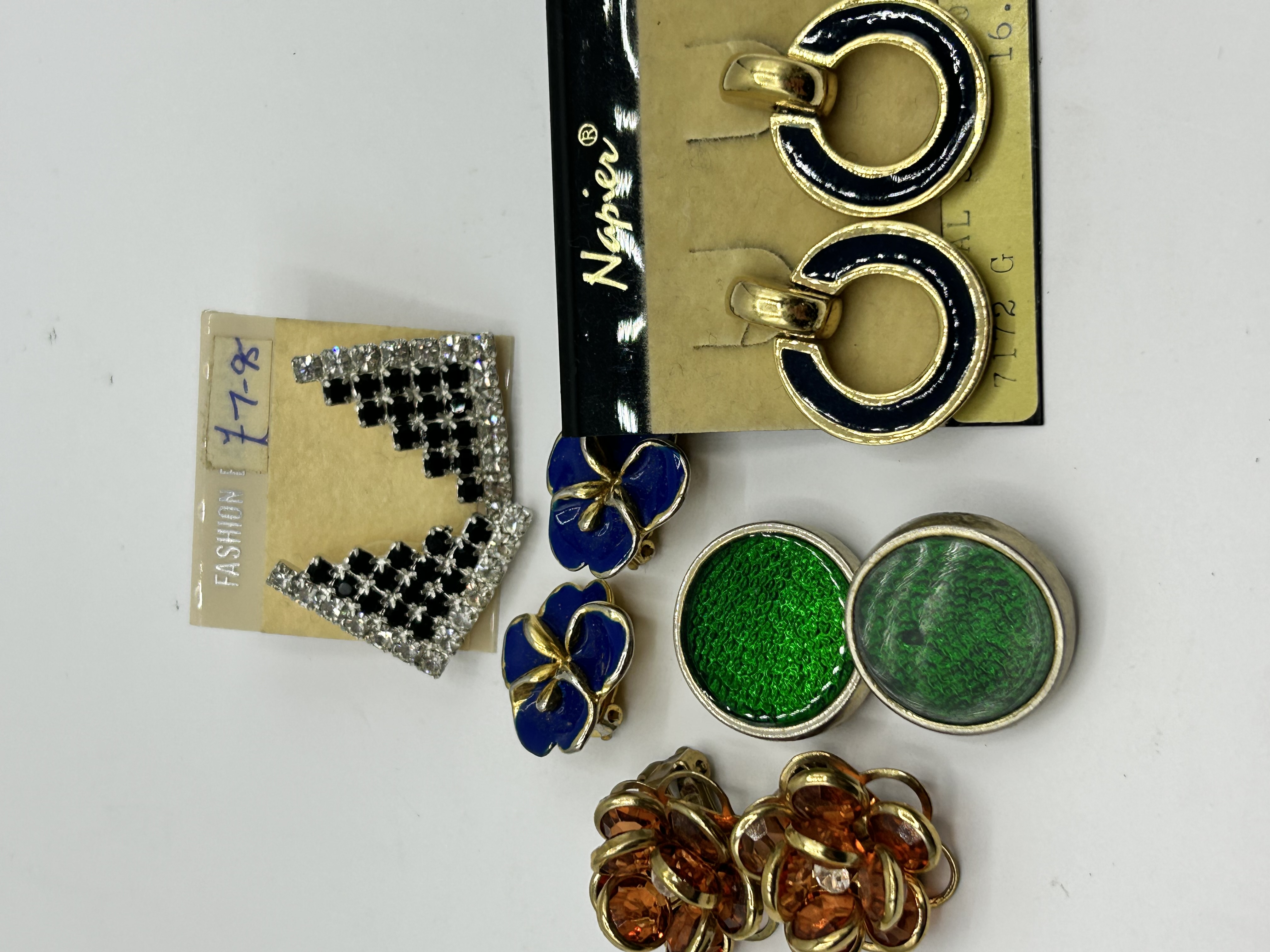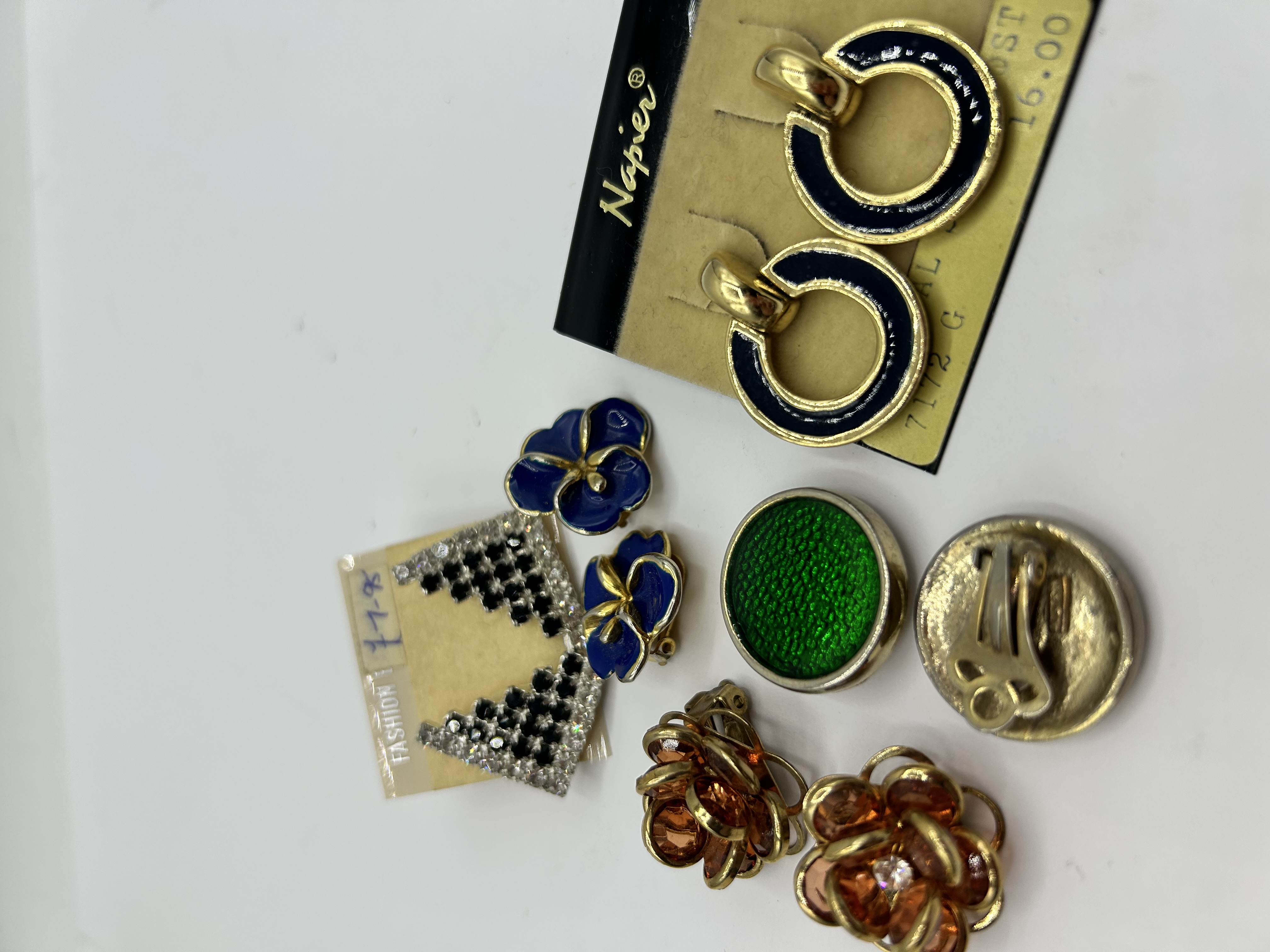 A collection of vintage costume jewelry earrings featuring various styles and makers. The group includes a pair of gold-tone door knocker earrings with navy blue enamel, presented on a Napier branded card. Also included is a pair of geometric rhinestone earrings on a card marked Fashion, featuring clear and black faceted stones. The assortment further contains floral-themed designs, including blue enameled pansies with gold-tone accents and layered gold-tone flowers set with amber-colored faceted stones. Completing the collection is a pair of round clip-on earrings featuring textured green centers within silver-tone borders. The items are constructed from base metals with gold- and silver-tone finishes, enamel, and faceted glass or synthetic stones.
