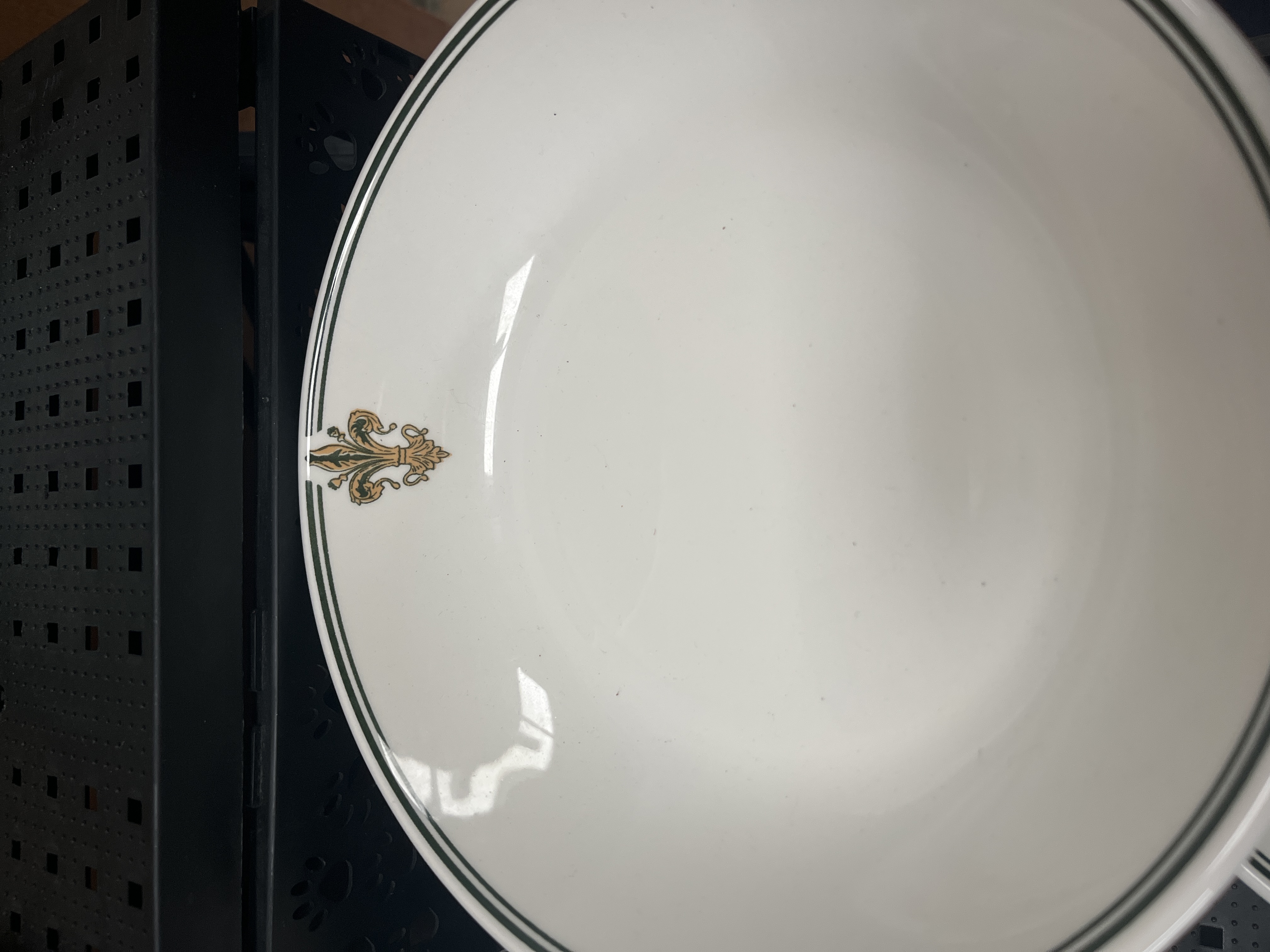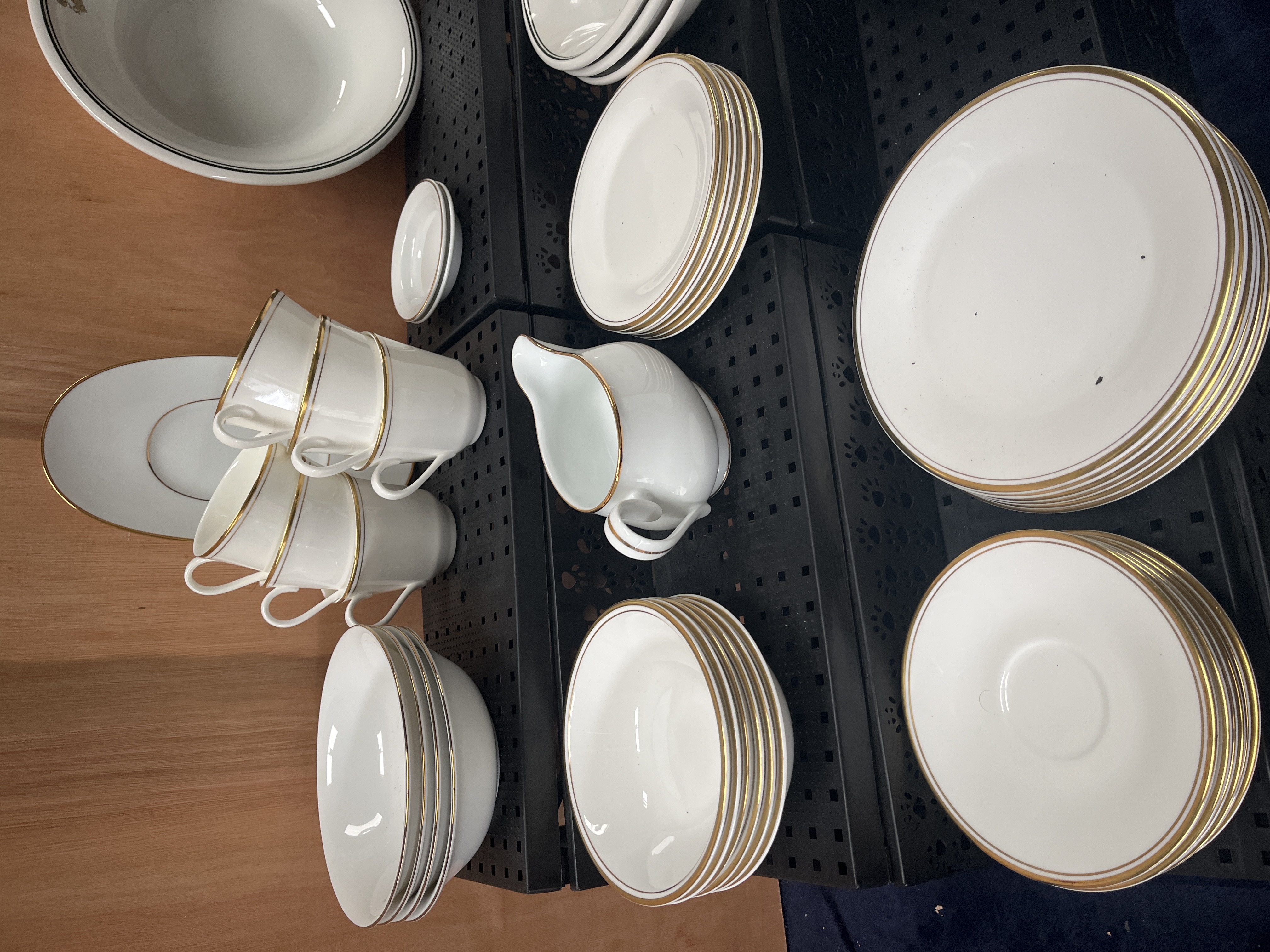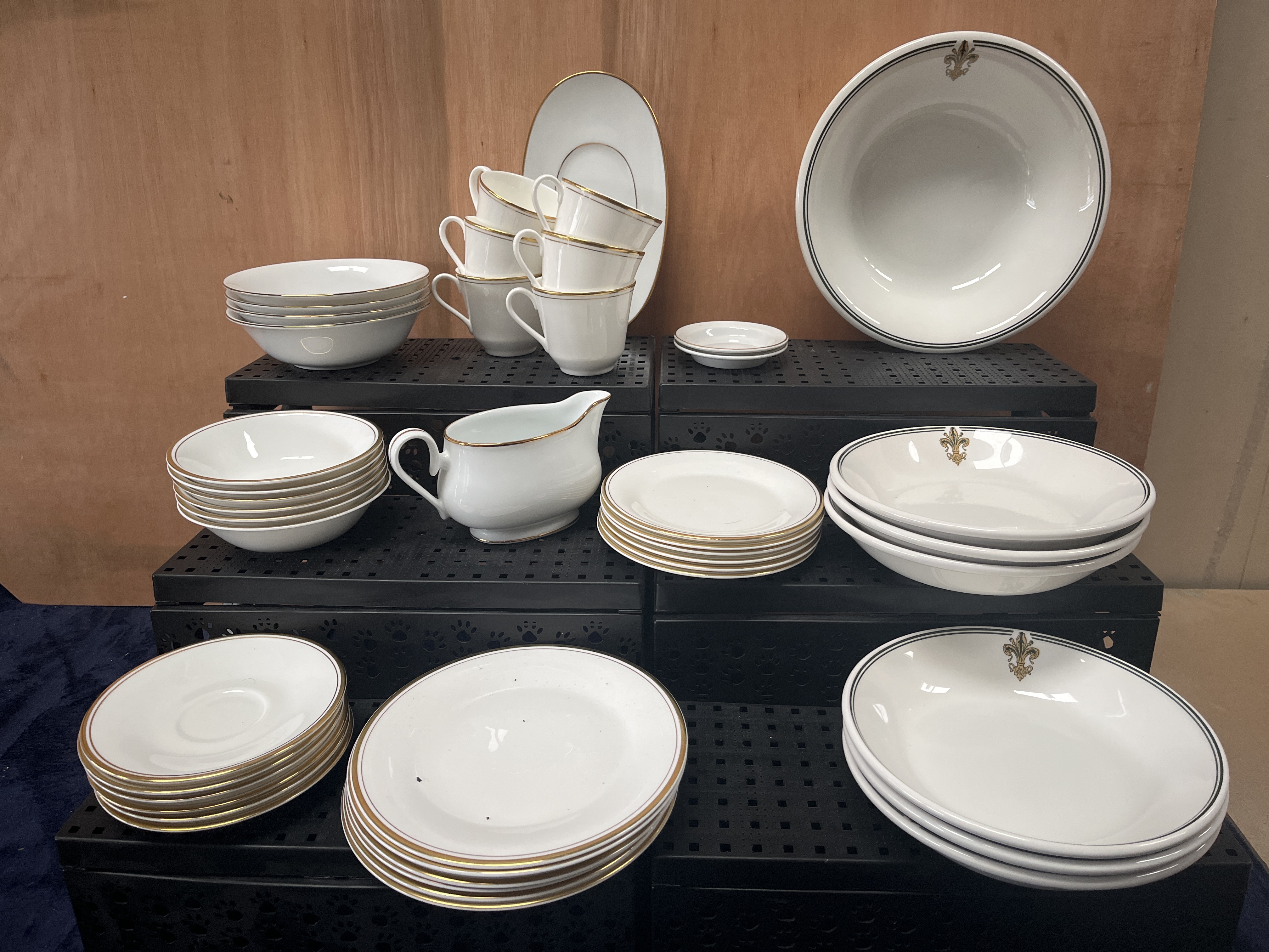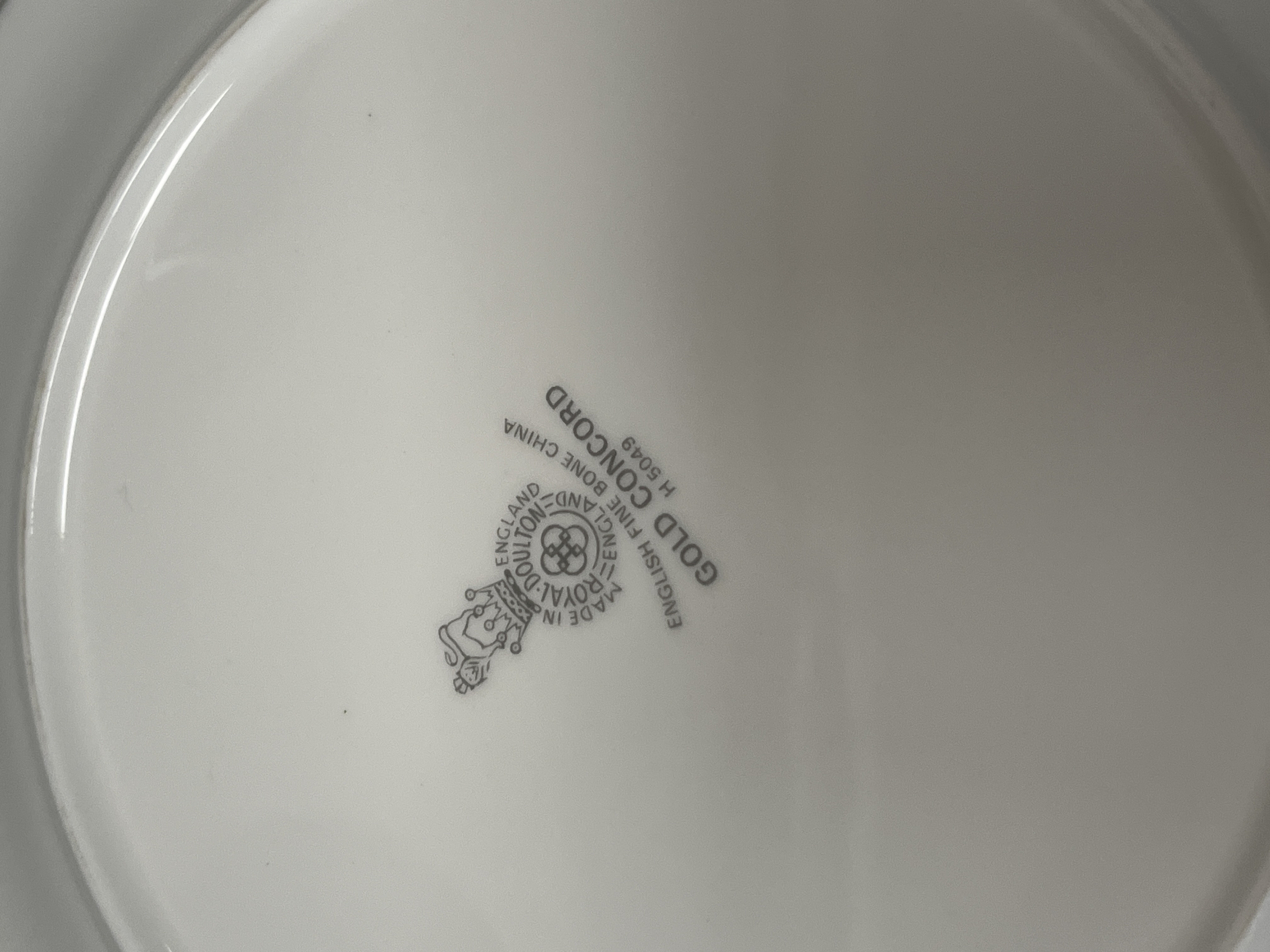 A collection of Royal Doulton English fine bone china dinnerware in the Gold Concord pattern, pattern number H 5049. The set features a white glaze with polished gold-toned rim bands. Several pieces are embellished with a stylized fleur-de-lis emblem in gold and green tones, framed by dark parallel banding, a motif associated with United States Embassy service. The assortment includes dinner plates, salad plates, bread and butter plates, saucers, teacups, a gravy boat, an oval serving platter, and various bowls. Each piece bears the Royal Doulton maker’s backstamp on the underside.