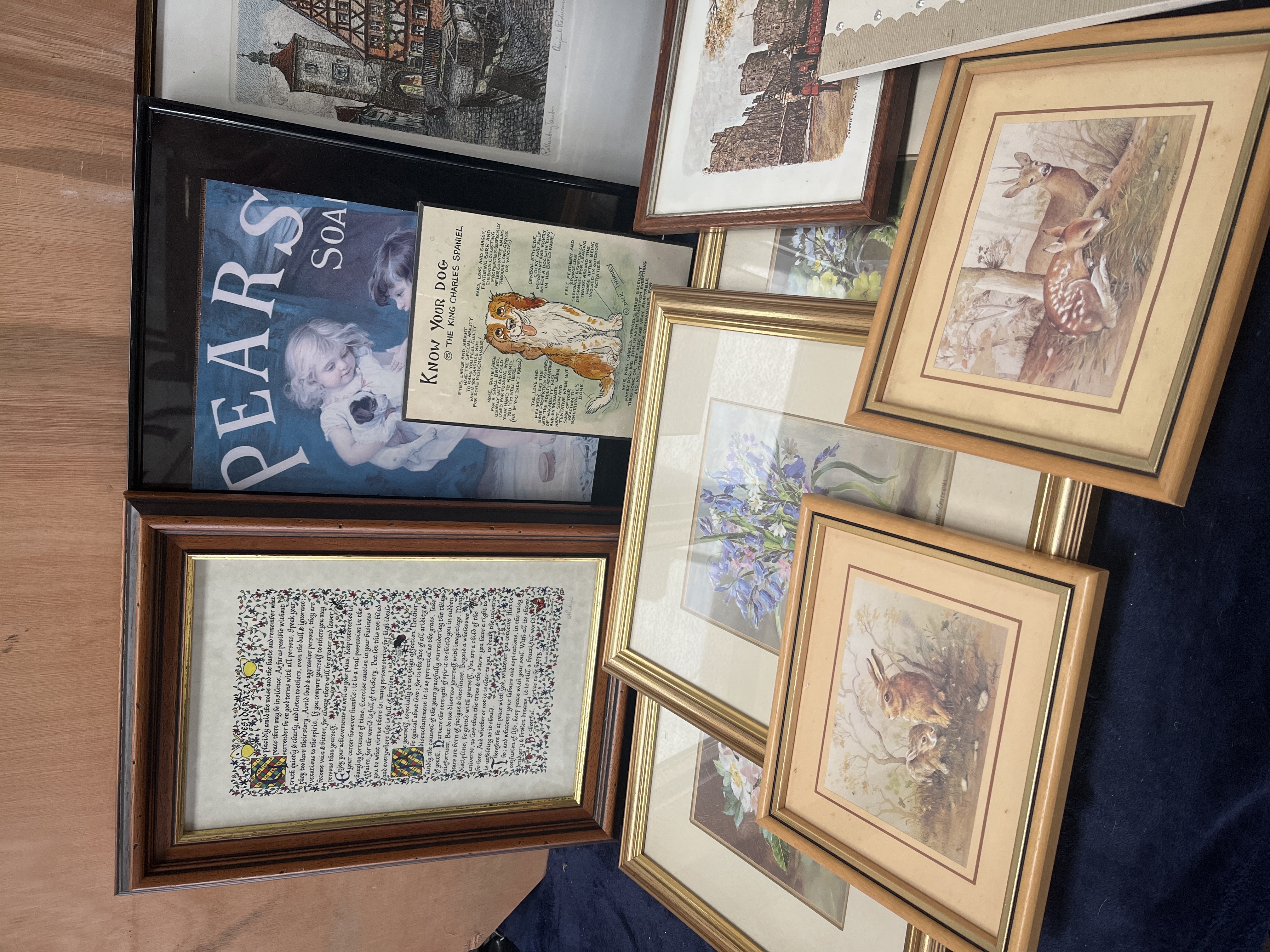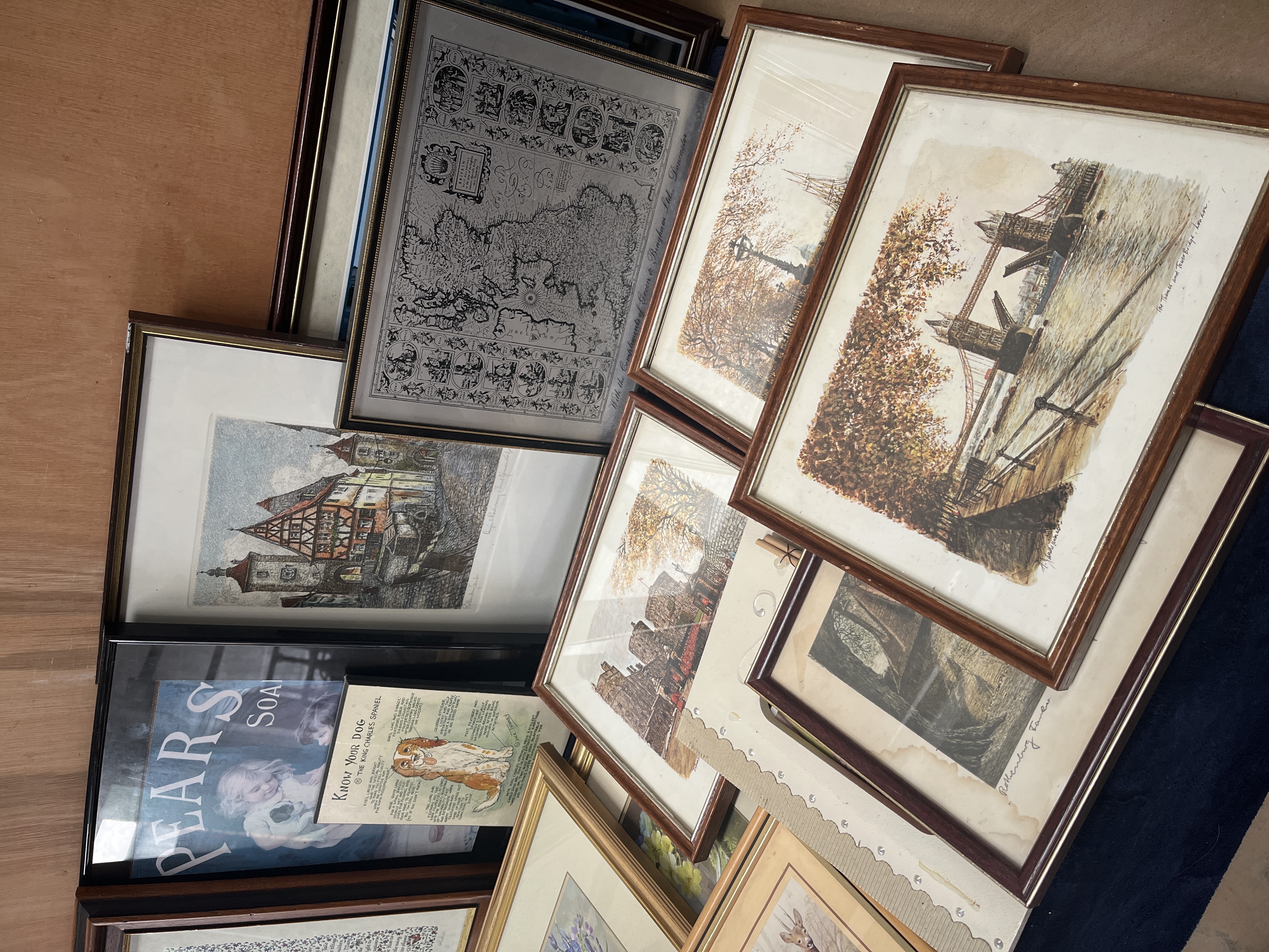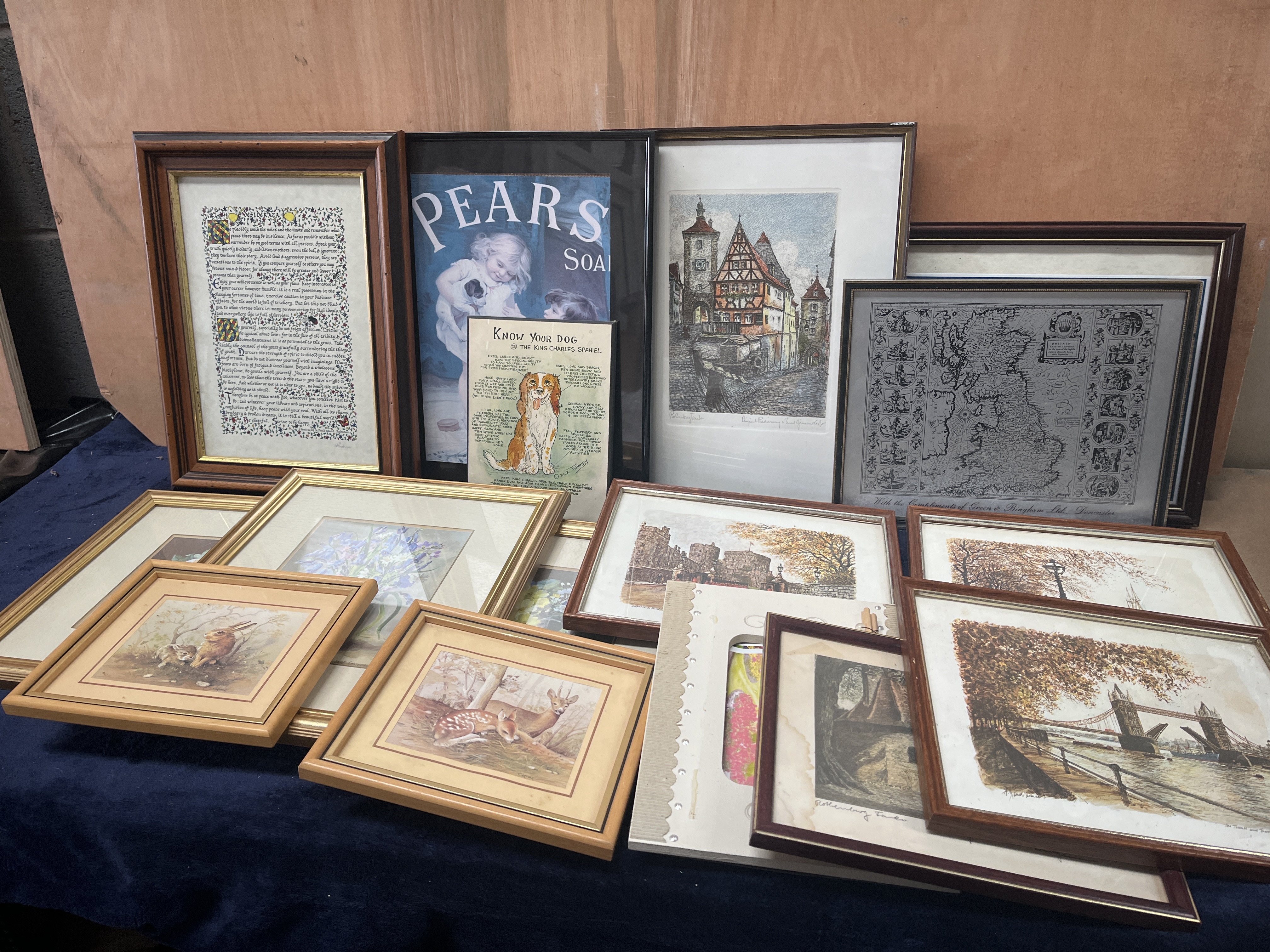 A collection of framed artwork and printed ephemera featuring prints by Anton Pieck and an original etching by Hans Grimm-Lowe. The assortment includes several village street scenes by Anton Pieck and an original etching of Rothenburg ob der Tauber by Hans Grimm-Lowe (Original Radierung). The group also contains a vintage-style Pears Soap advertisement, an informational Know Your Dog chart for the King Charles Spaniel by Dick Twinney, and a calligraphic rendering of the poem Desiderata with heraldic motifs. Additionally, the collection features a map of the British Isles with the compliments of Green and Bingham Ltd, architectural views of London Tower Bridge, and various wildlife and floral studies depicting deer and rabbits. The items are housed in a variety of wood and gilt-finished frames.