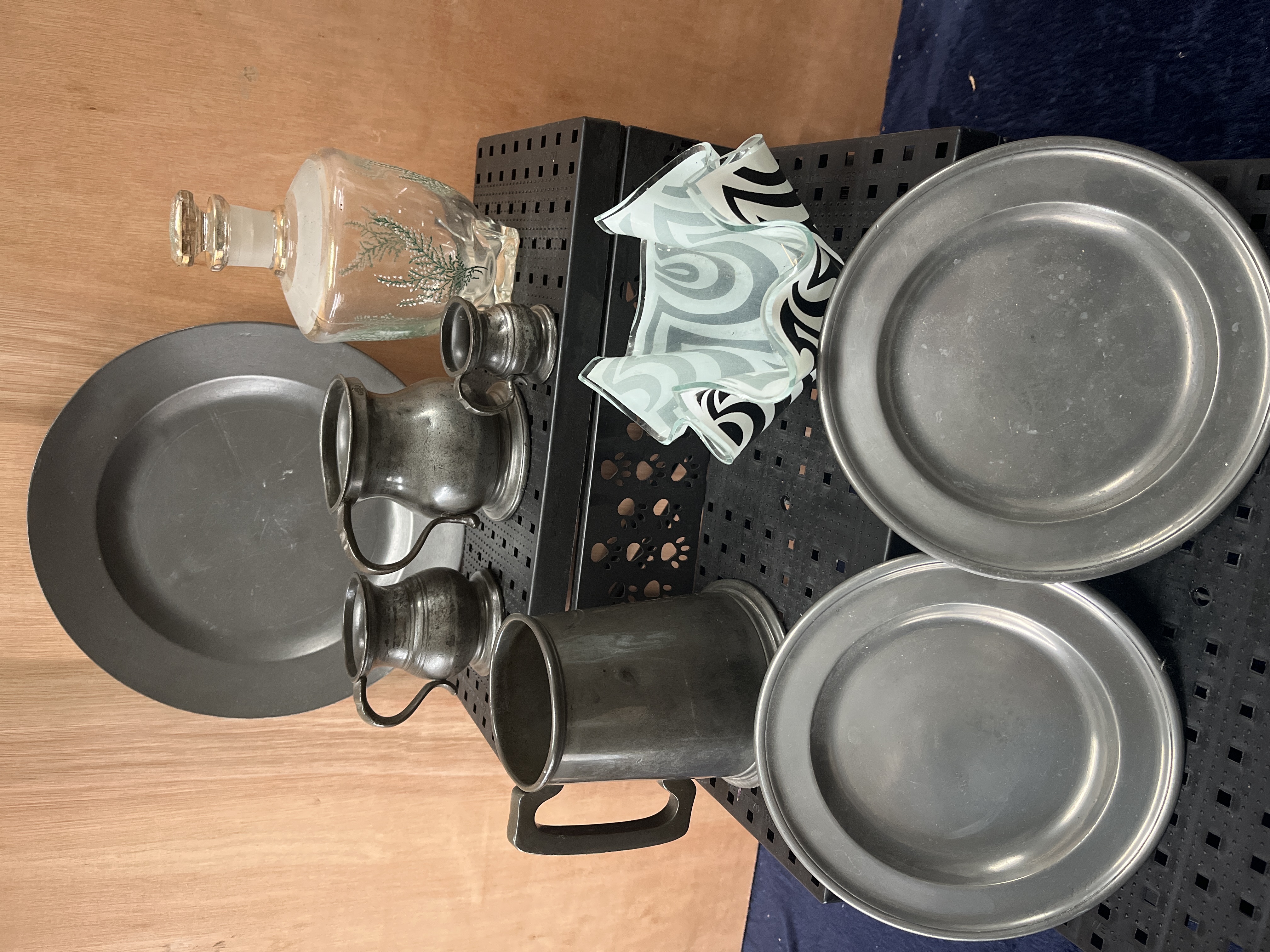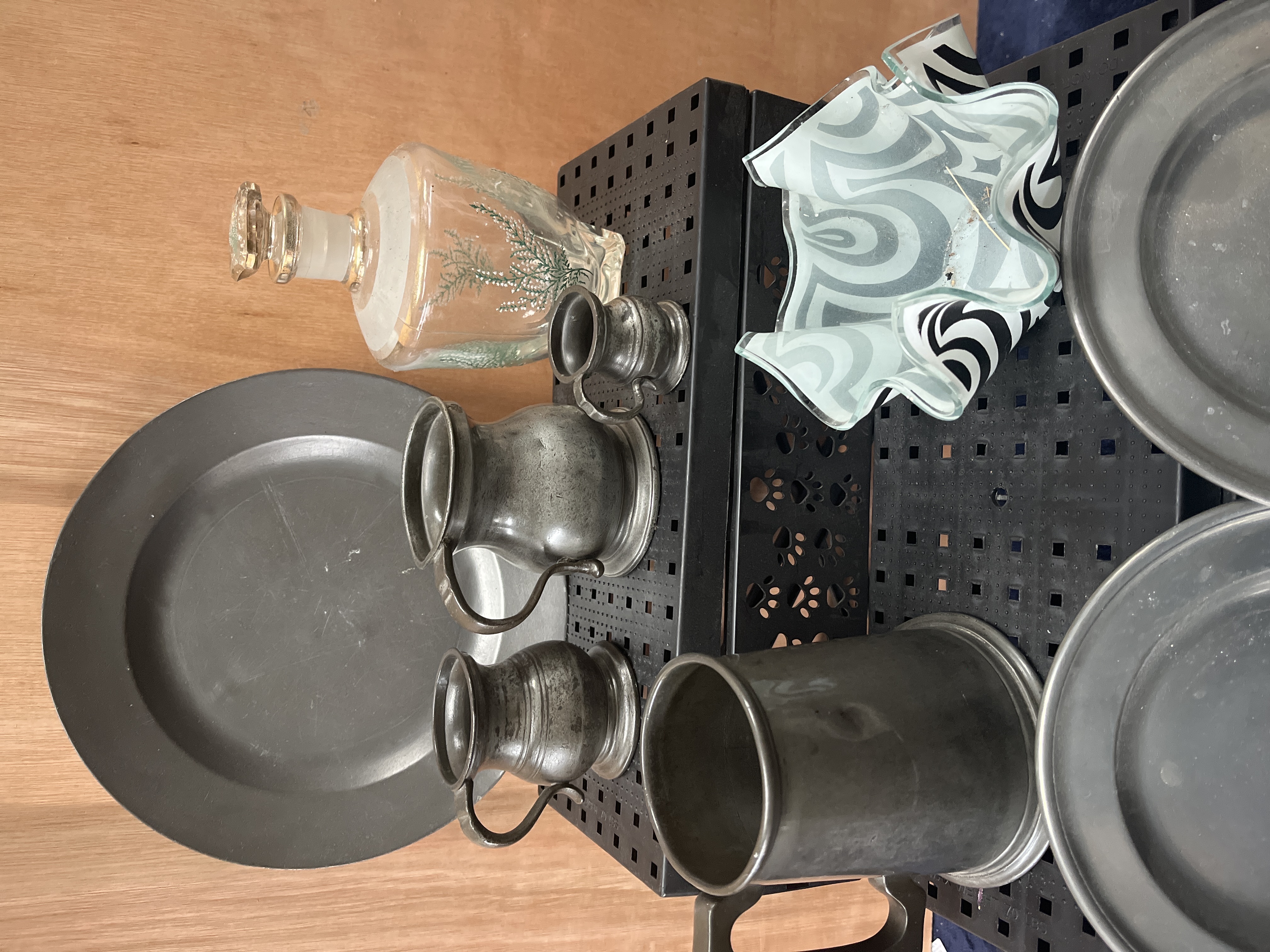 A collection of pewter tableware and decorative glassware. The pewter group comprises several plates in varied sizes, a large tankard, and multiple handled jugs of graduated proportions, all featuring a matte gray finish. The glassware includes a clear glass decanter with a faceted stopper, featuring a botanical design in gold and green, alongside an art glass bowl with a fluted, wavy rim and a black and white swirling pattern.