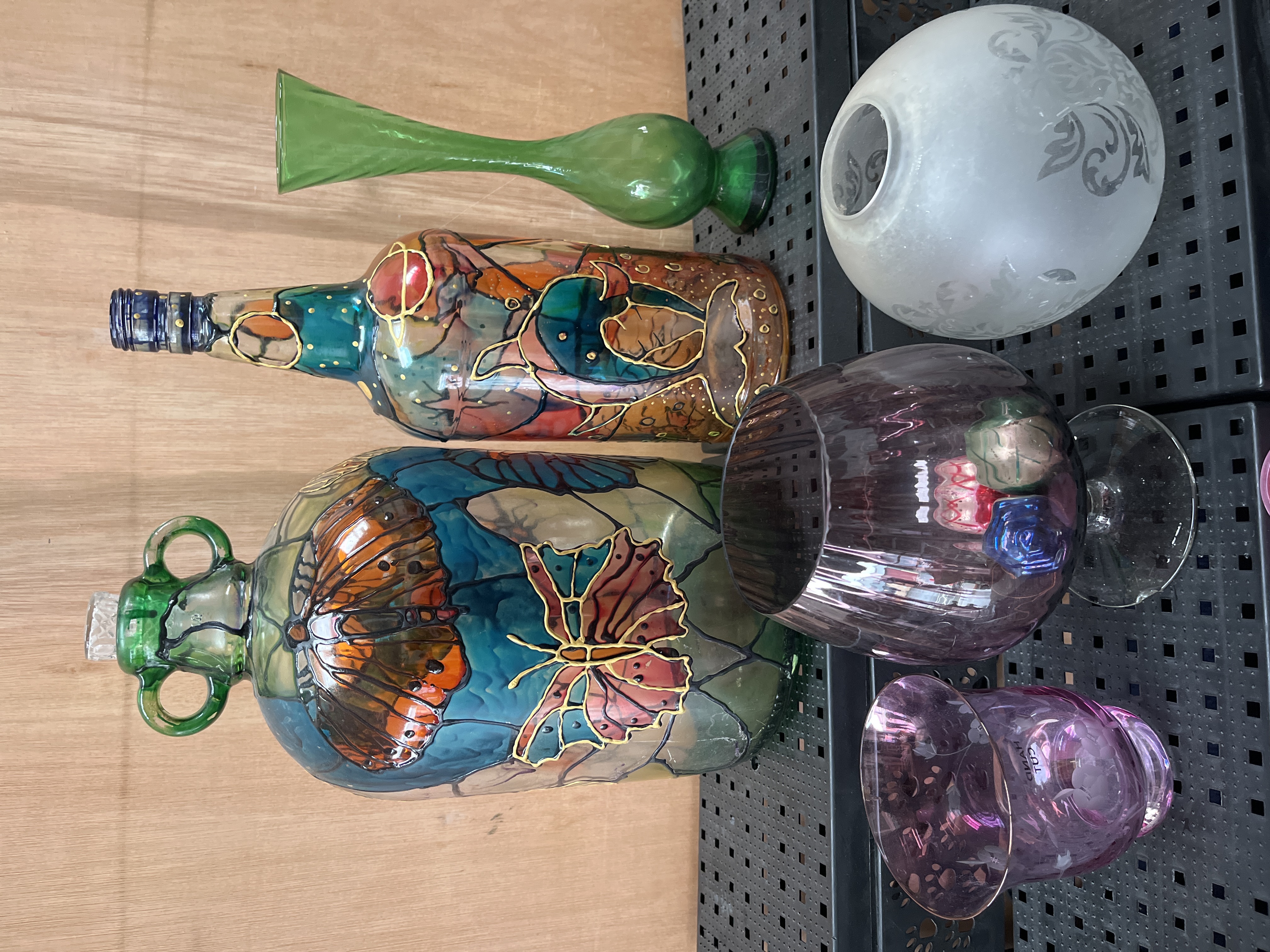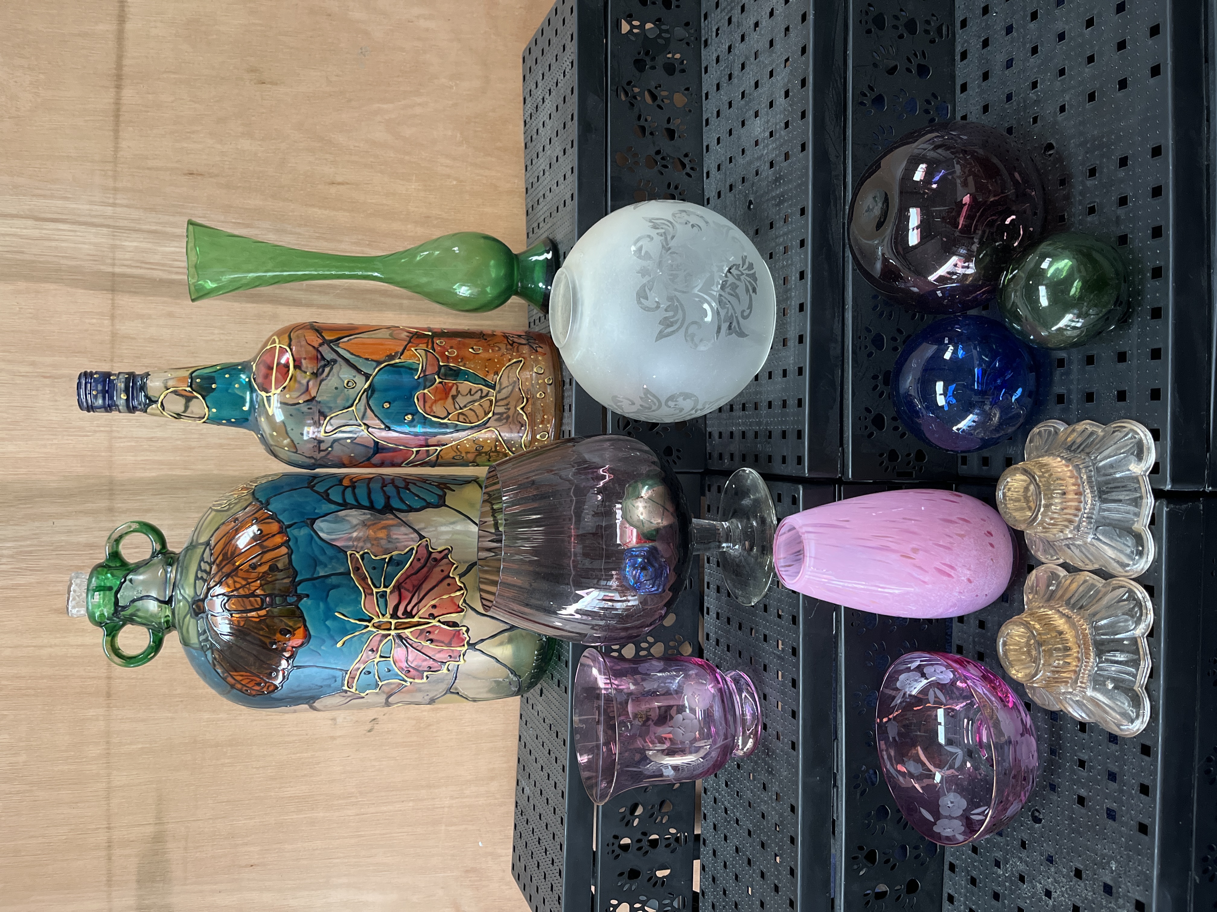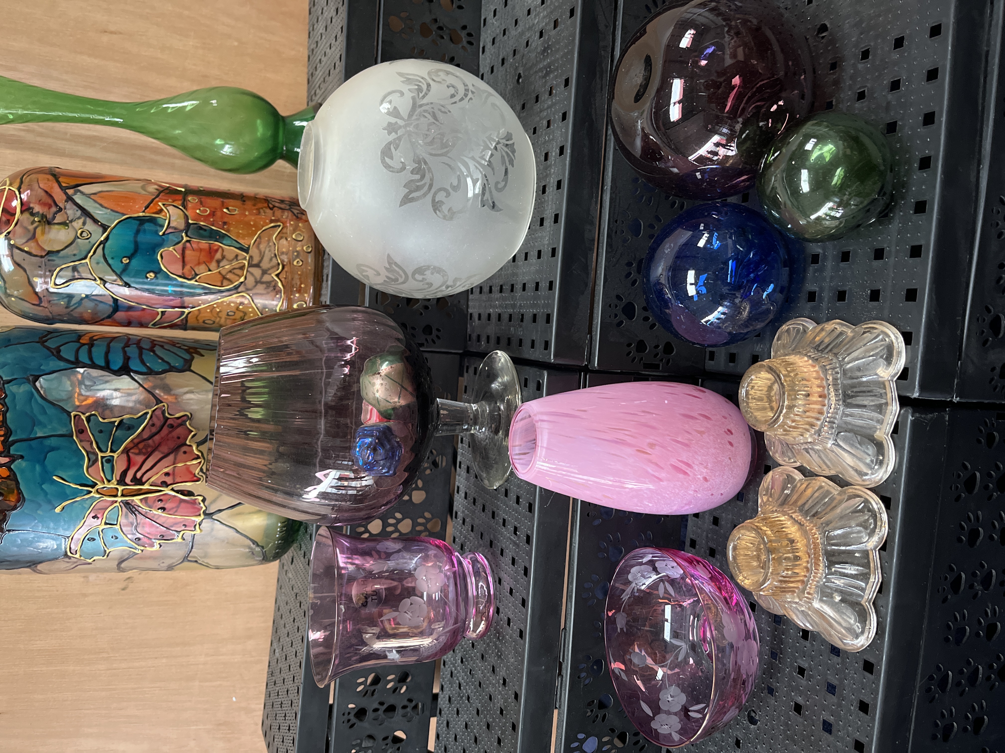 A collection of assorted decorative glassware featuring various vessels and ornamental objects. The group includes a frosted glass globe shade with acid-etched scrolling foliate patterns, consistent with Victorian or Art Nouveau replacement lighting fixtures. Also present are two large glass bottles, including a handled carboy and a wine-bottle form, both featuring hand-painted leaded-style motifs of butterflies and aquatic life. Other items include a tall slender green glass bud vase, a large dark-purple tinted glass footed vessel, and a pink speckled vase. The lot is further comprised of amethyst glass pieces with etched floral designs, including a bowl and a votive, several solid glass spheres in blue, green, and deep purple, and a pair of clear pressed glass candle holders.