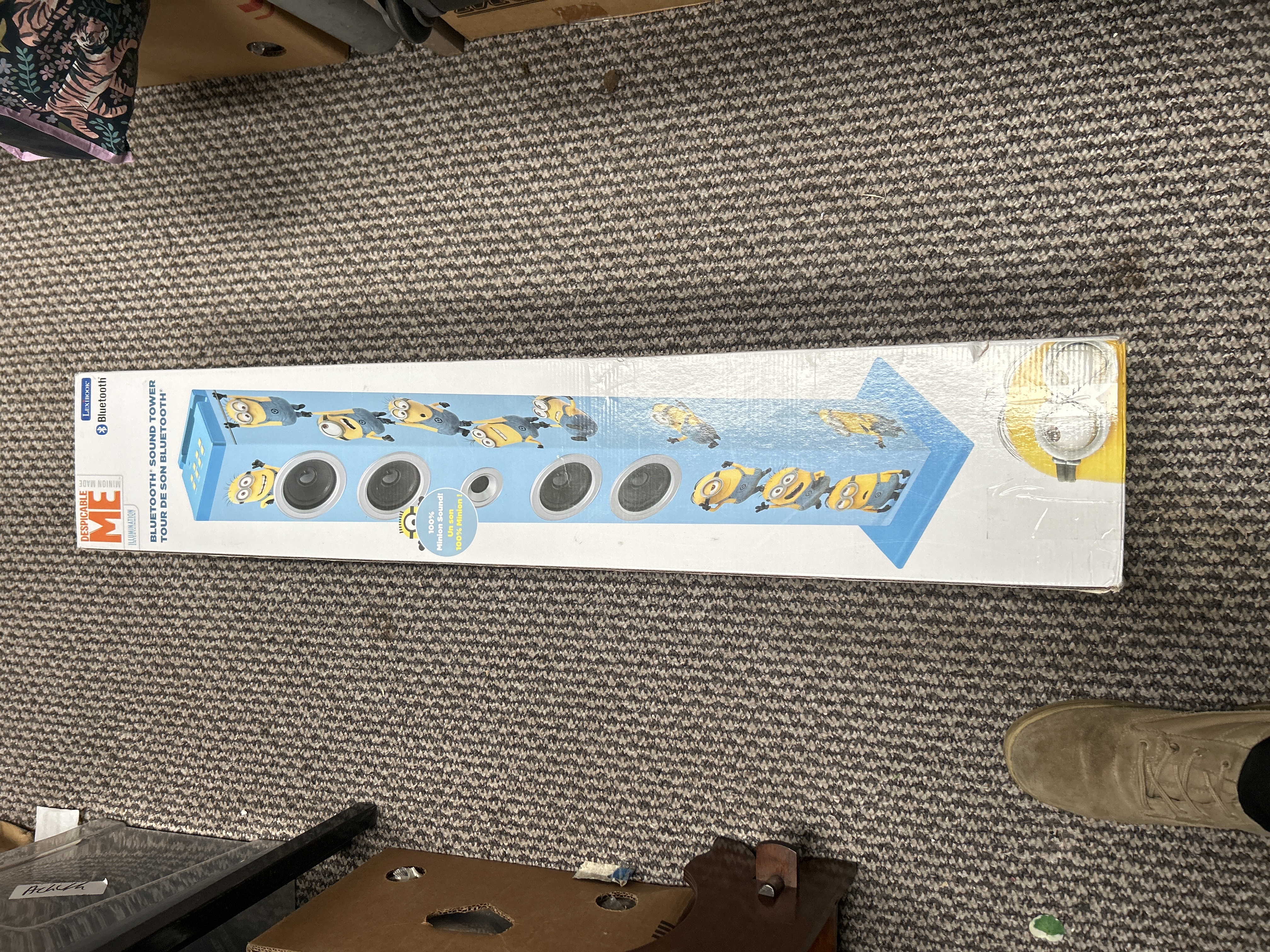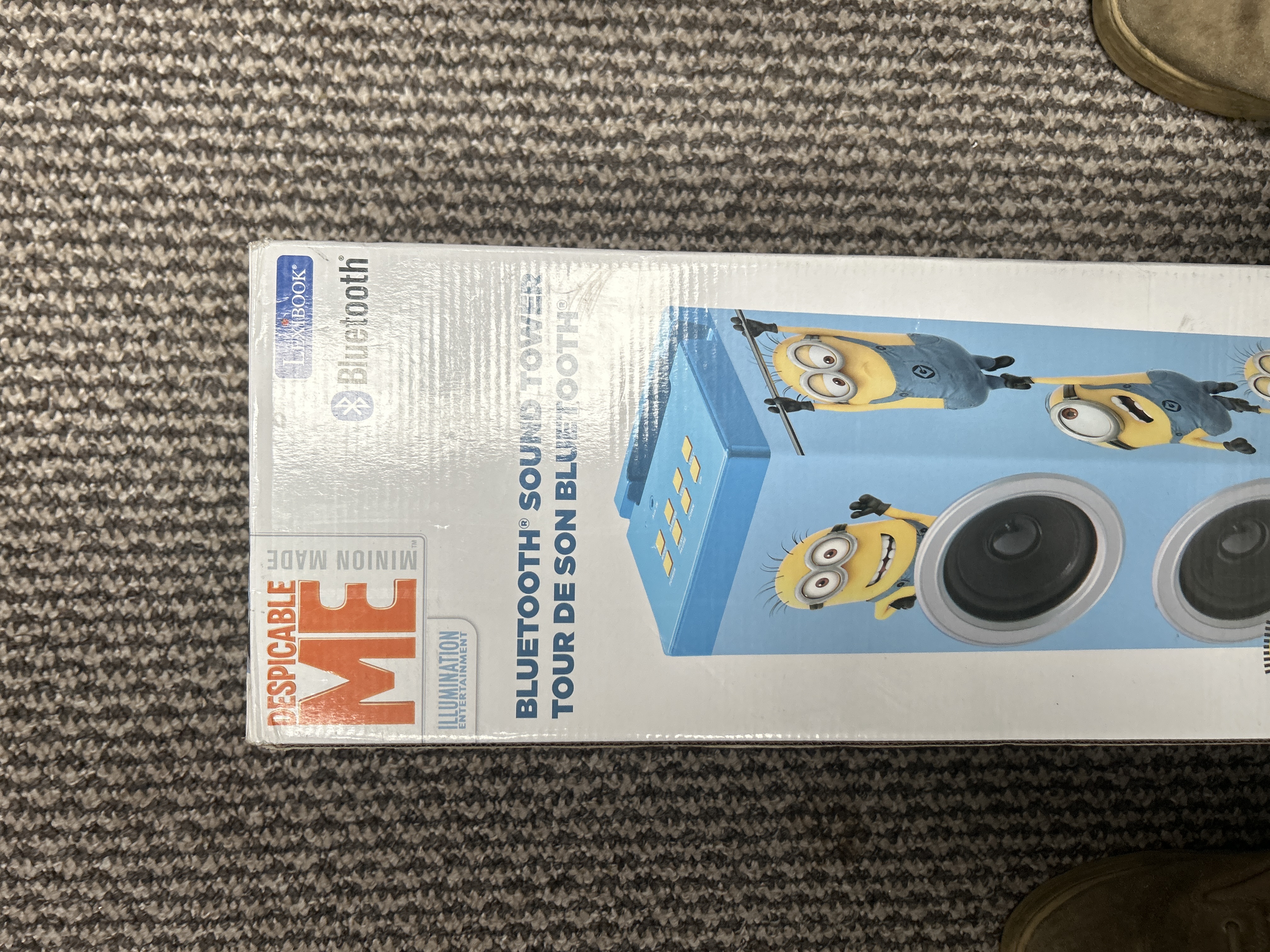 A Lexibook Despicable Me Minions Bluetooth sound tower. This electronic device is presented in its original rectangular cardboard retail packaging featuring blue graphics and illustrations of Minion characters from the Illumination Entertainment franchise. The box includes bilingual text in English and French reading Bluetooth Sound Tower and Tour de son Bluetooth. The packaging displays official logos for Lexibook, Bluetooth, and Illumination Entertainment. The unit is designed with integrated speakers and luminous light-up features as indicated by the packaging and market consensus.