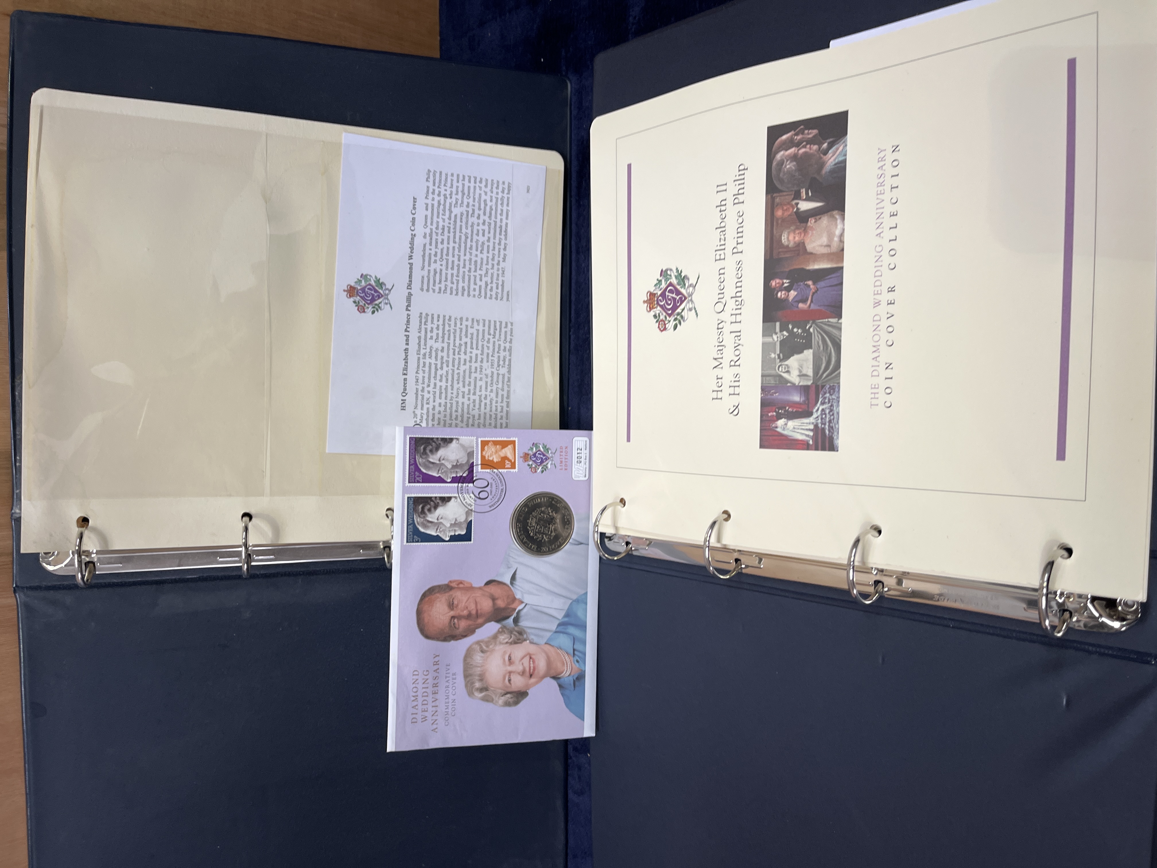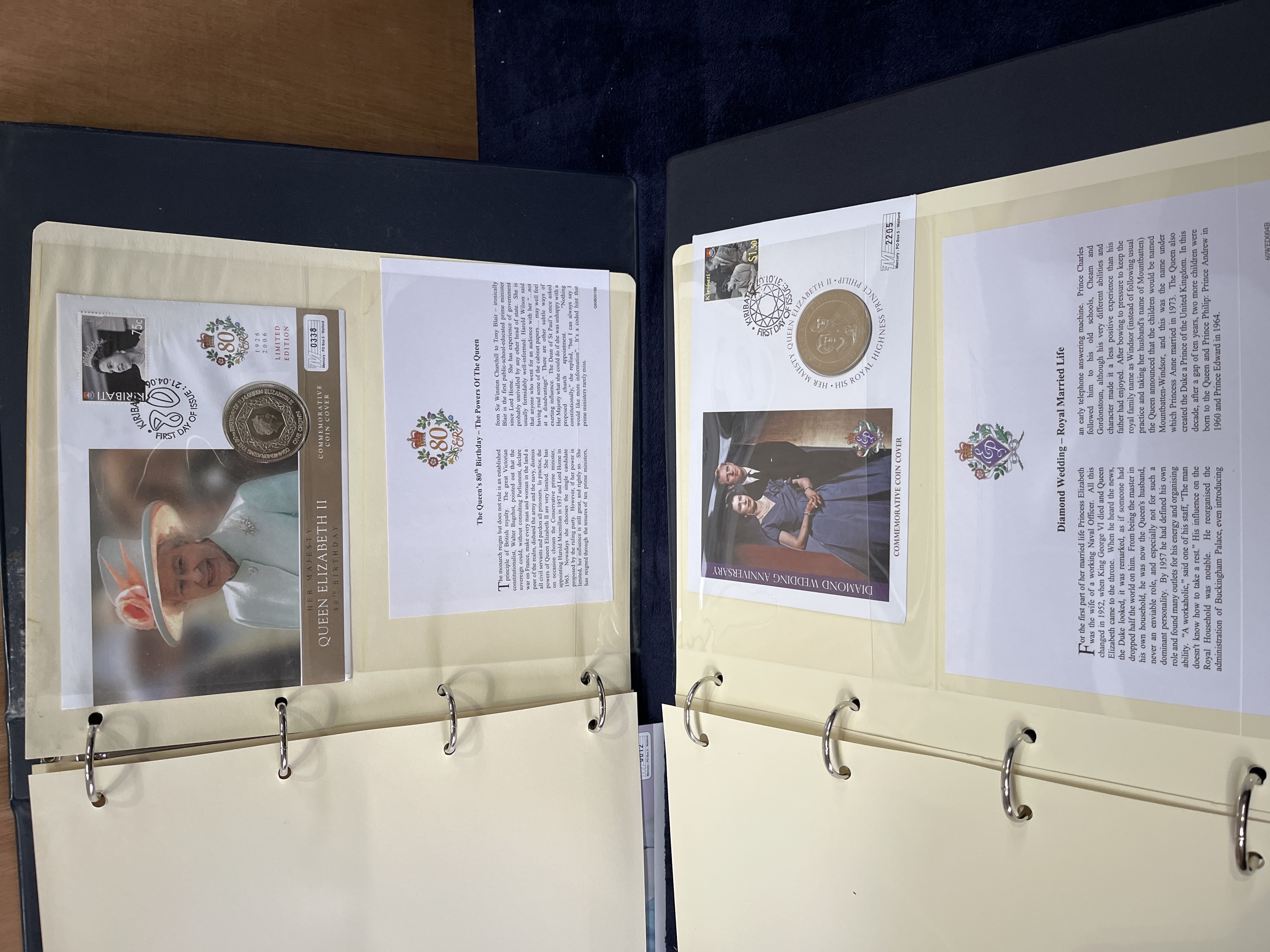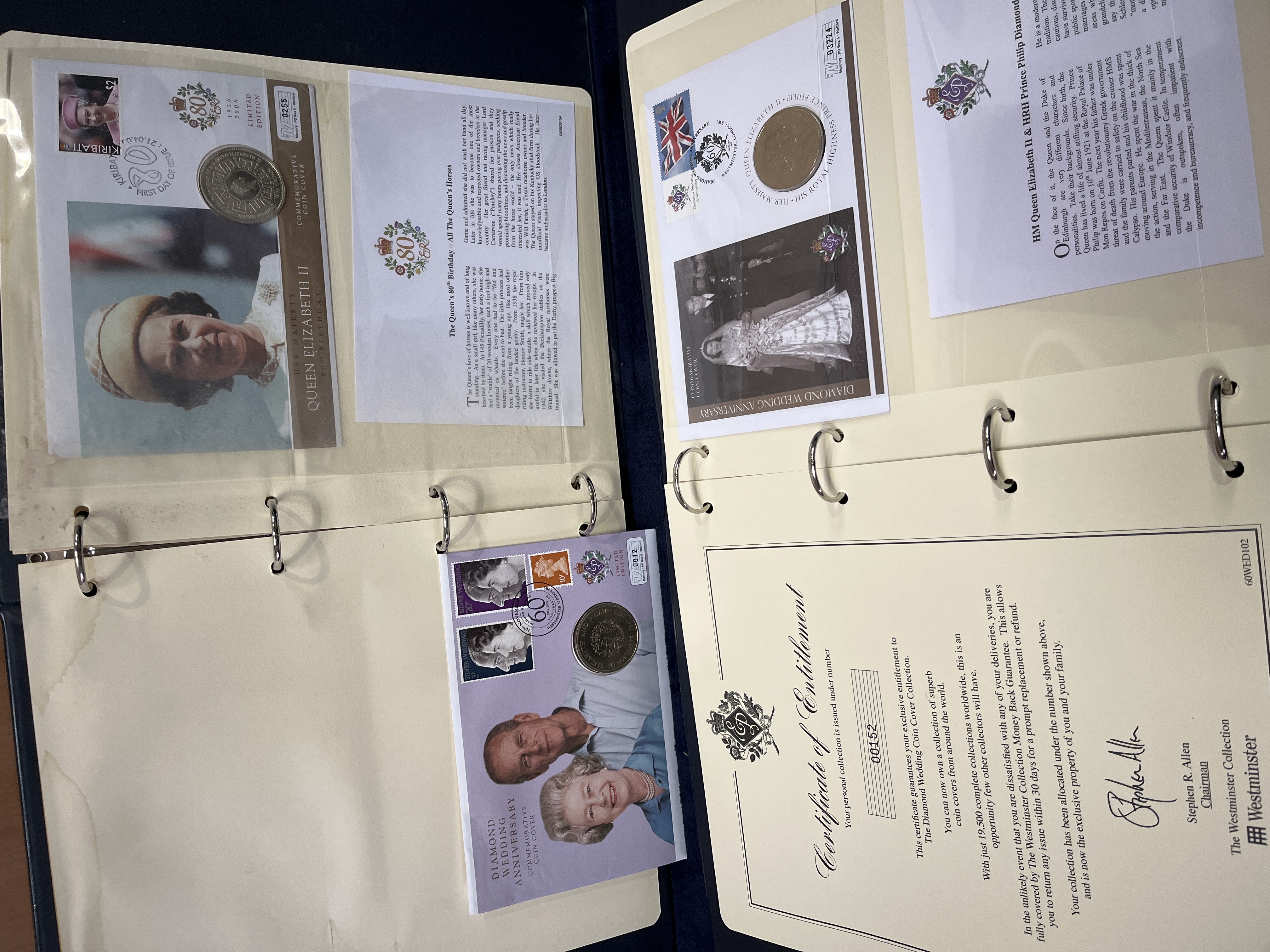 A collection of British Royal commemorative philatelic and numismatic covers issued by The Westminster Collection. The assembly primarily commemorates the 80th Birthday of Queen Elizabeth II in 2006 and the Diamond Wedding Anniversary of Queen Elizabeth II and Prince Philip in 2007. The items are housed within two dark blue multi-ring binders. Each commemorative cover features postage stamps with corresponding first-day-of-issue postmarks, an inset commemorative coin, and related photographic imagery. The collection includes descriptive informational inserts and a Certificate of Entitlement with serial number 00152. The coins featured include various commemorative issues such as one crown pieces and international currency.