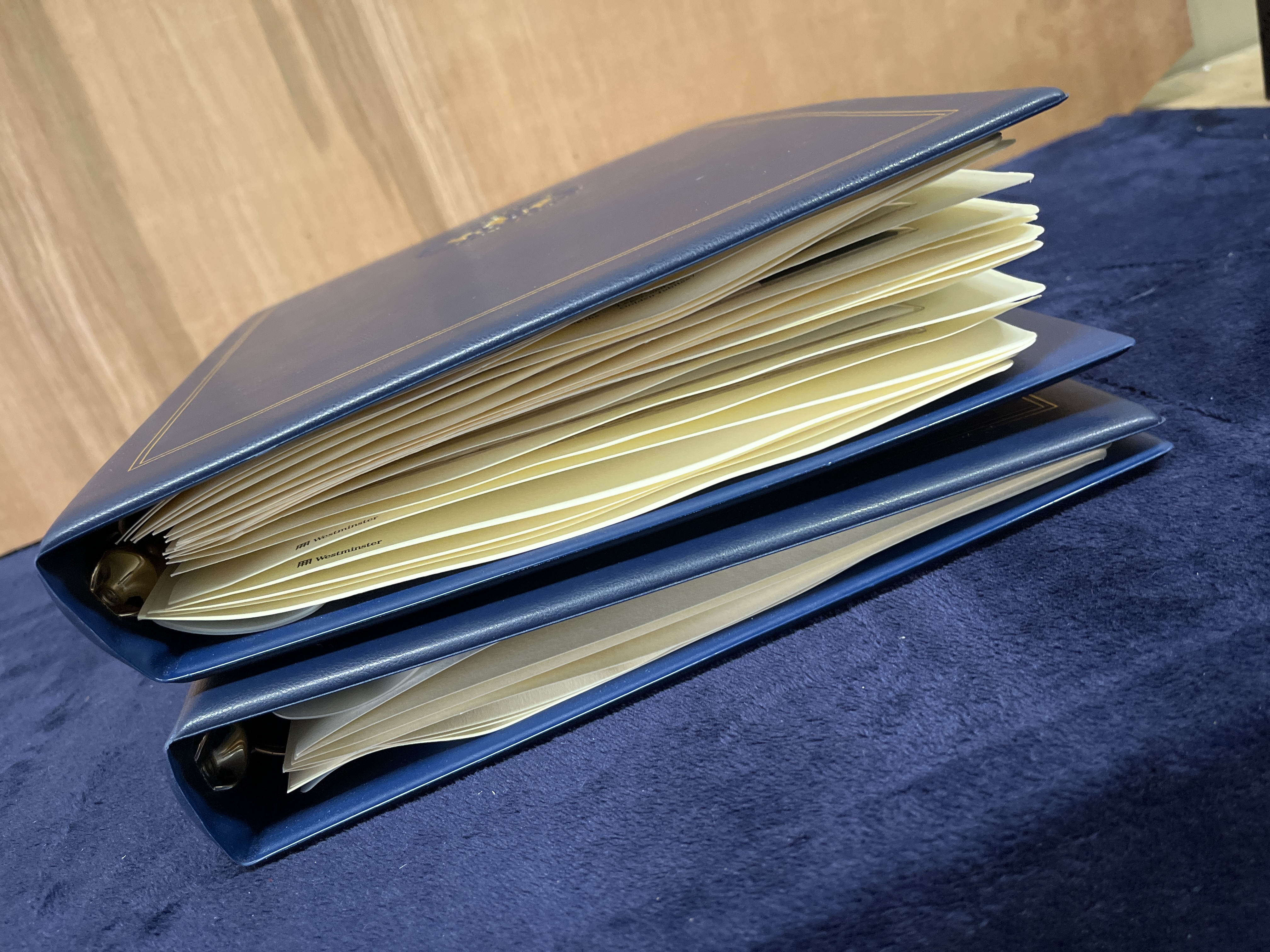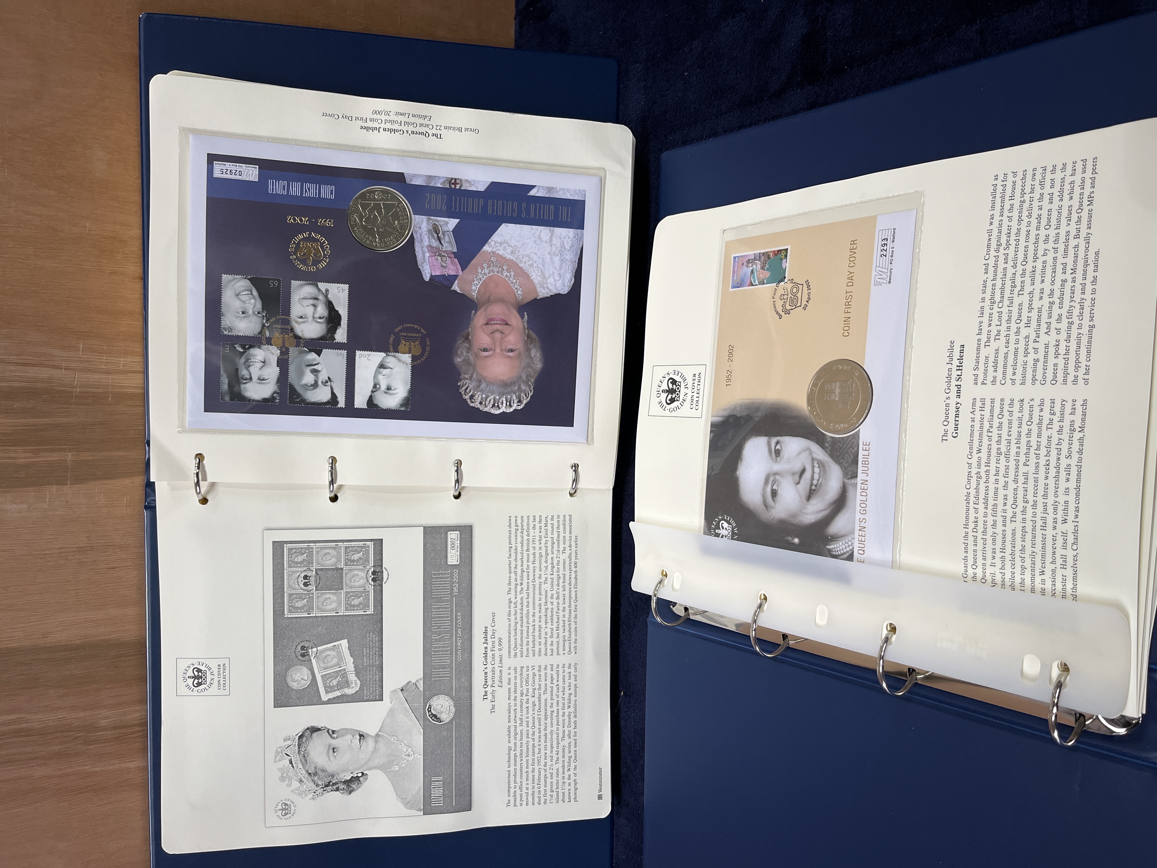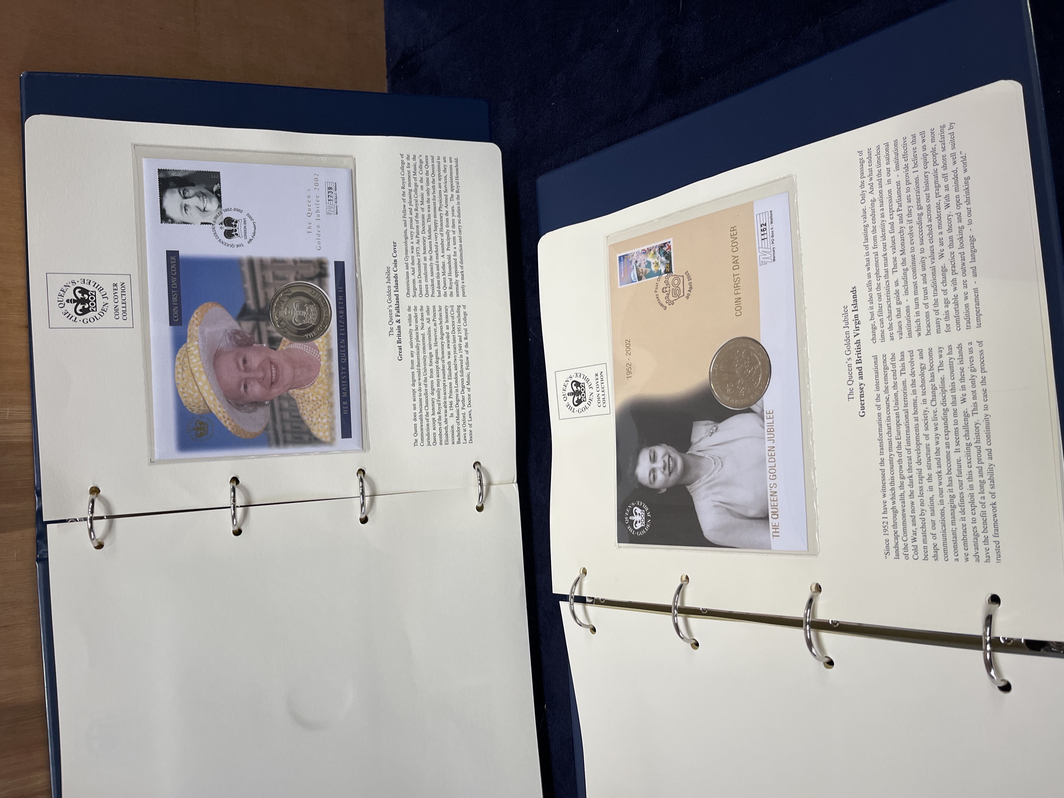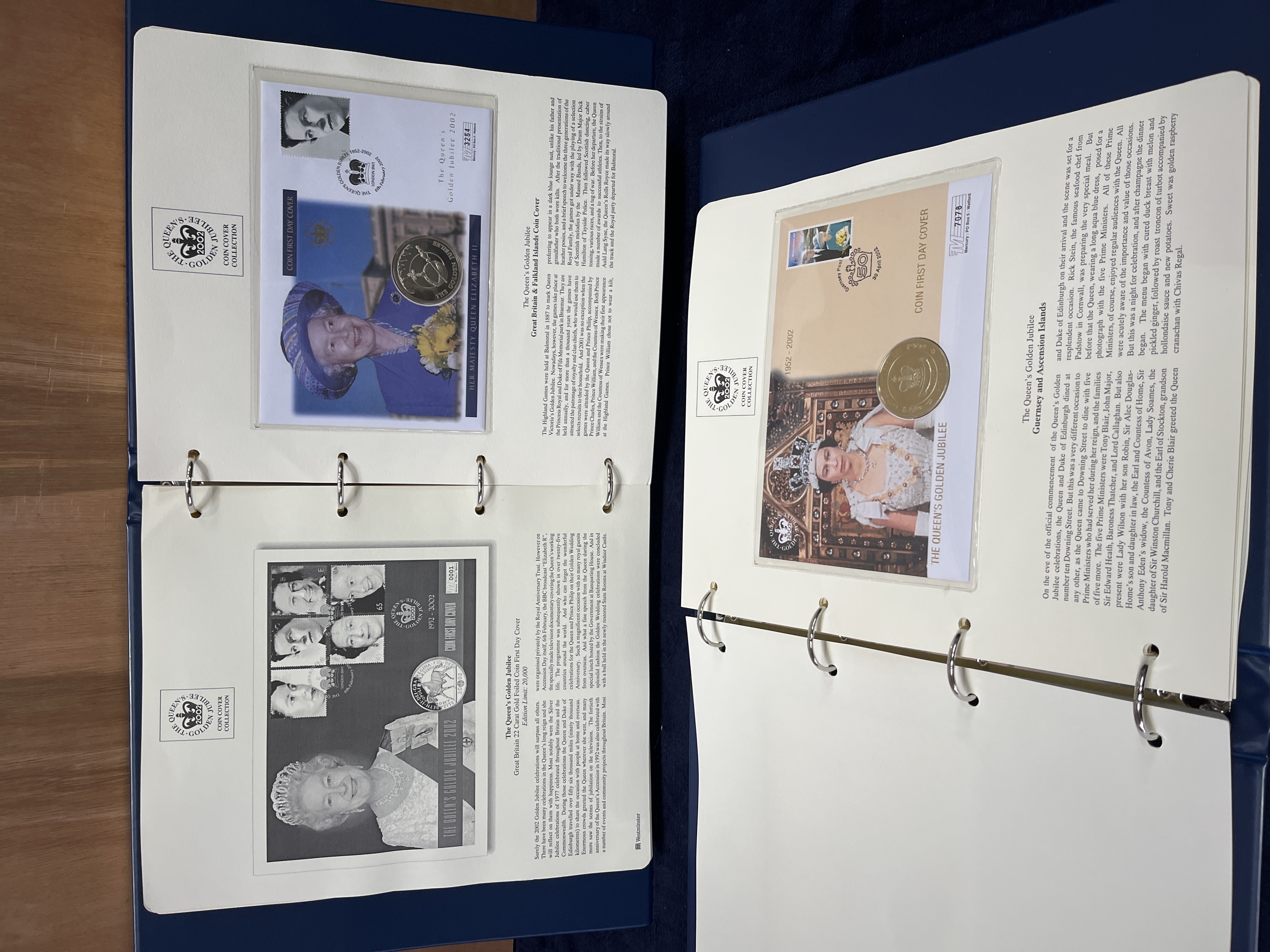 A collection of philatelic and numismatic commemorative items titled The Queen’s Golden Jubilee Coin Cover Collection, published by Westminster. This collection commemorates the 50-year reign of Queen Elizabeth II (1952-2002). The items are housed in blue ring-binders featuring gold-foil accents. Each page contains a first day cover with various postage stamps and an inset circular metal medallion or coin. The collection includes covers from various Commonwealth countries and territories, including Great Britain, Guernsey, the Falkland Islands, St. Helena, and the British Virgin Islands. Each envelope is individually numbered and stored within a protective plastic sleeve. The covers are accompanied by detailed informational text regarding the history and geography of the issuing territories. Visible inscriptions include The Queen’s Golden Jubilee, 1952-2002, Westminster, and 22 Carat Gold Foiled Coin First Day Cover.