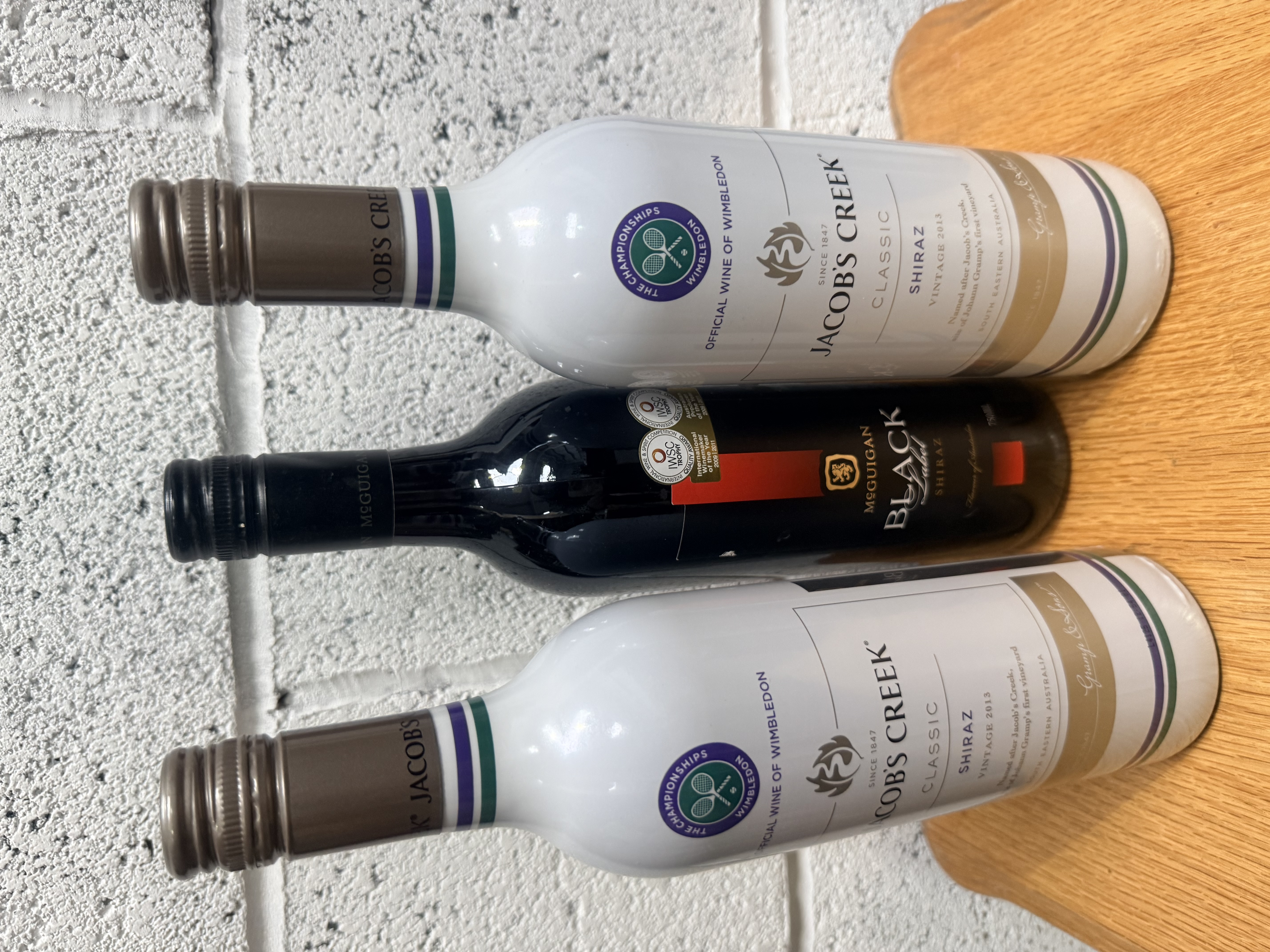 A group of three bottles of Australian Shiraz red wine. The lot includes two bottles of Jacob’s Creek Classic Shiraz, 2013 vintage, from South Eastern Australia. These bottles are labeled as the Official Wine of Wimbledon and feature the official championship logo. The third bottle is a McGuigan Black Label Shiraz, which displays several international wine competition award stickers on the label. All bottles are sealed with original screw-top closures and have their original labels and capsules.