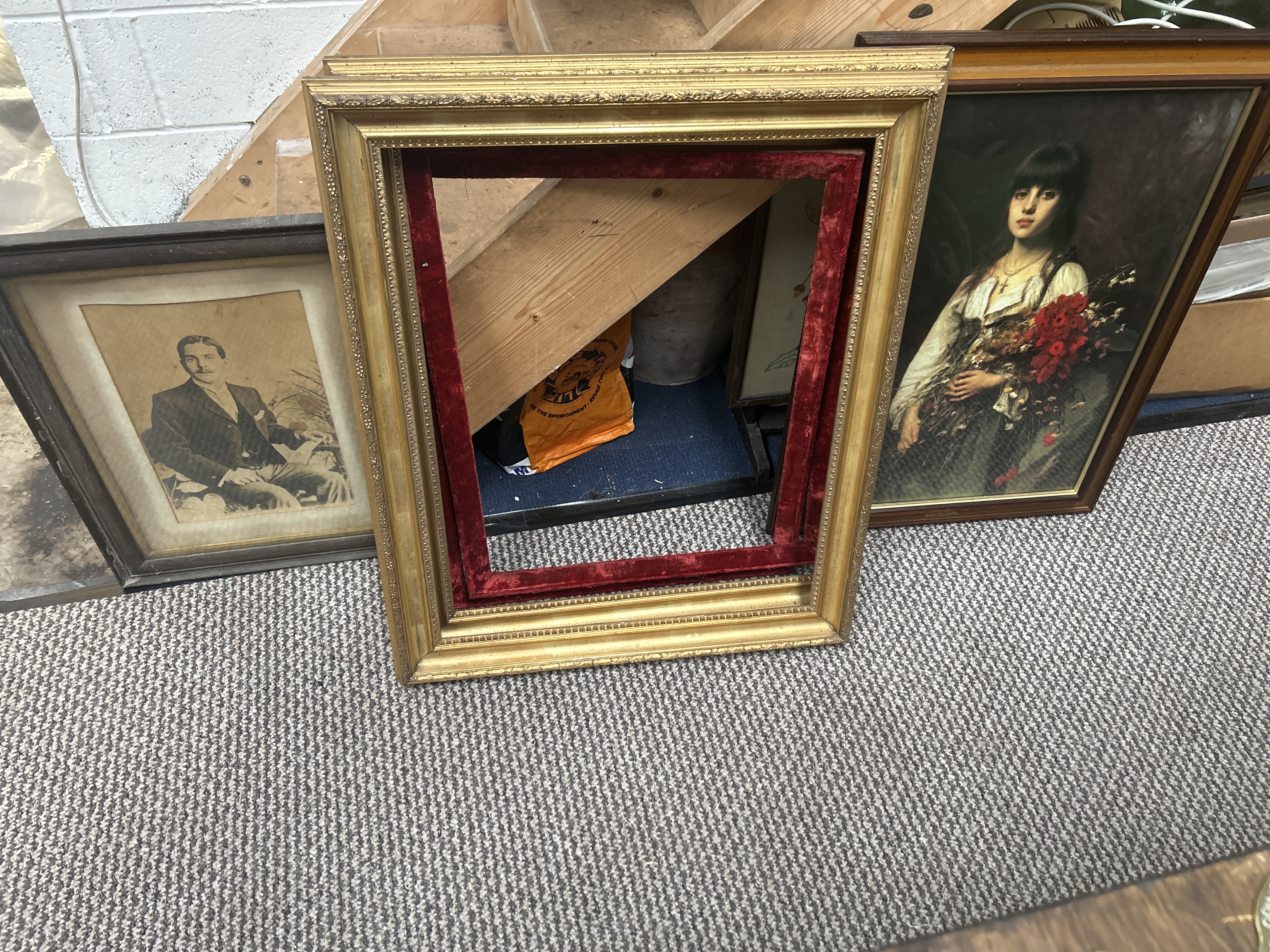 This lot comprises three framed items of varying styles. The primary piece is a Baroque style gilded frame featuring molded decorative detailing and a red velvet-lined interior slip. Accompanying this is a vintage-style photographic print of a gentleman in formal attire, presented in a dark wood frame with a light-toned mat. The third item is a framed artistic depiction of a woman with dark hair holding a bouquet of red flowers, housed in a polished dark wood frame with a thin gilded inner border. The items reflect late 19th and early 20th-century decorative styles.