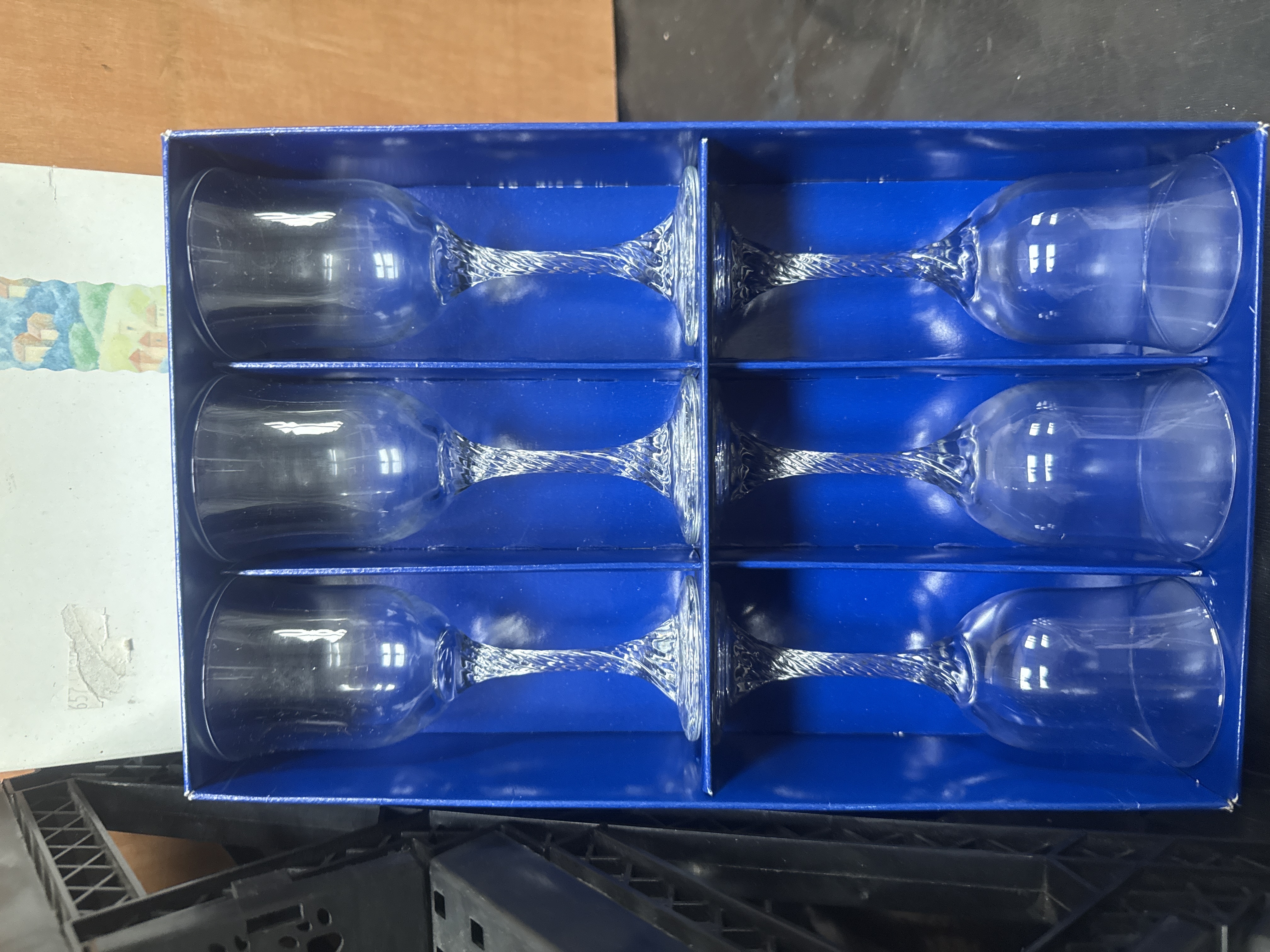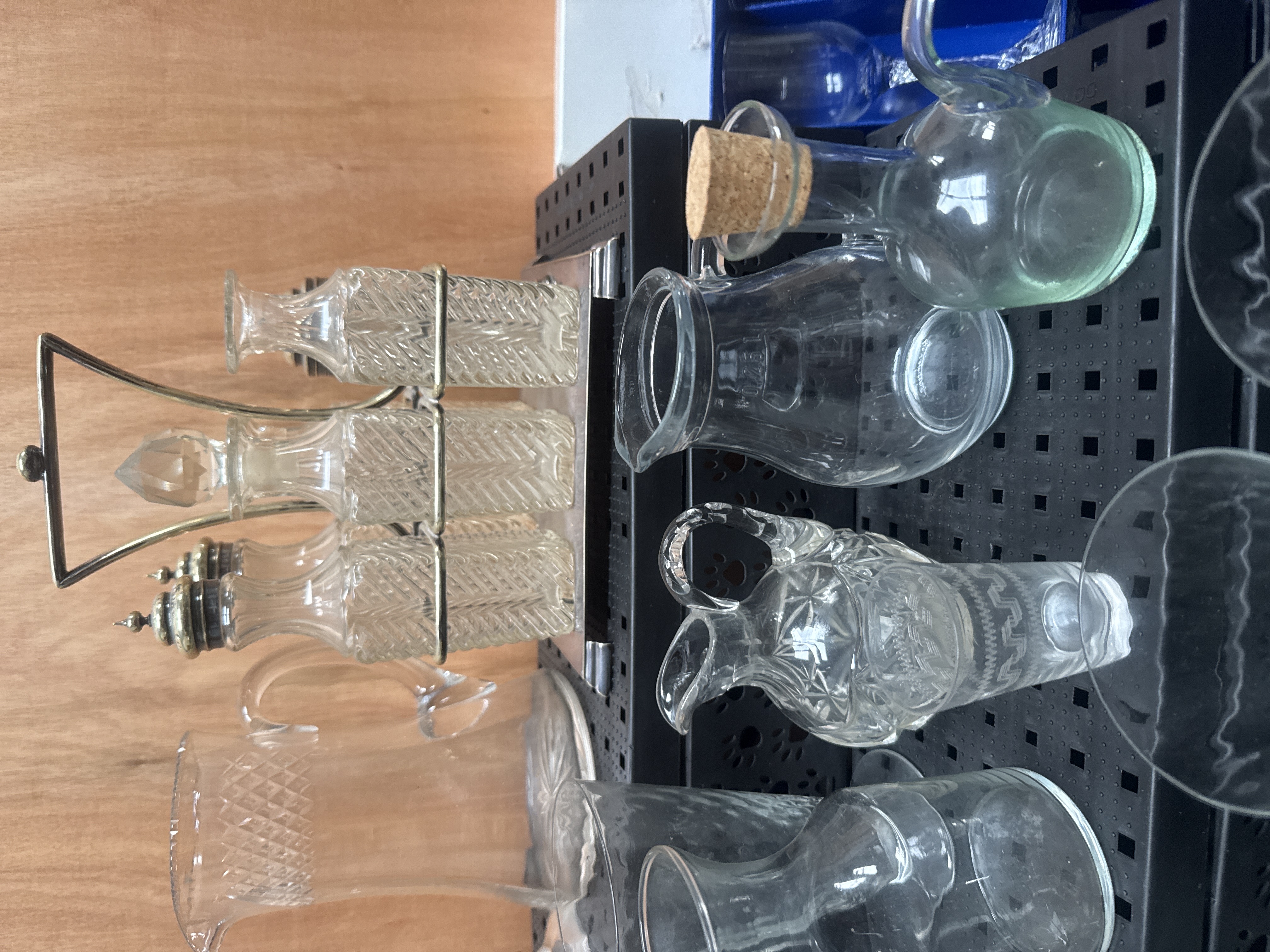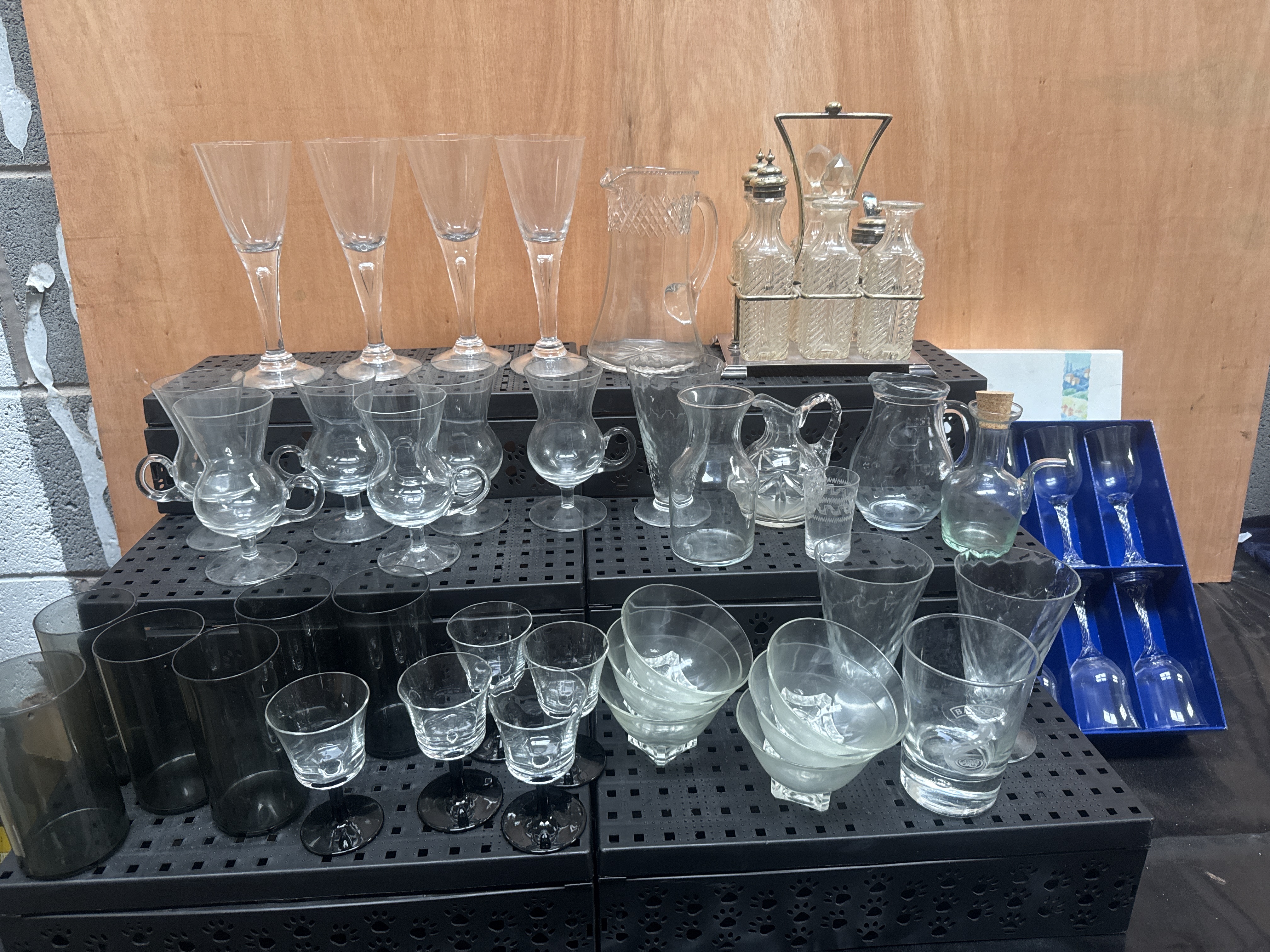 A diverse collection of domestic glassware comprising various forms for dining and beverage service. The group includes several tall conical flutes and a set of stemmed wine glasses featuring decorative twisted stems, presented in a blue box. Also included are multiple Irish coffee mugs with integrated handles and a variety of pitchers and carafes, notably a large cut-glass jug and a smaller carafe marked 0.25 L. The assortment further contains clear and smoky gray tumblers, several small liqueur glasses with black-tinted stems, and multiple stacked dessert bowls. A metal-framed cruet set with cut-glass bottles is also present. The pieces are primarily constructed of clear glass, with some examples displaying cut-glass motifs or tinted accents.