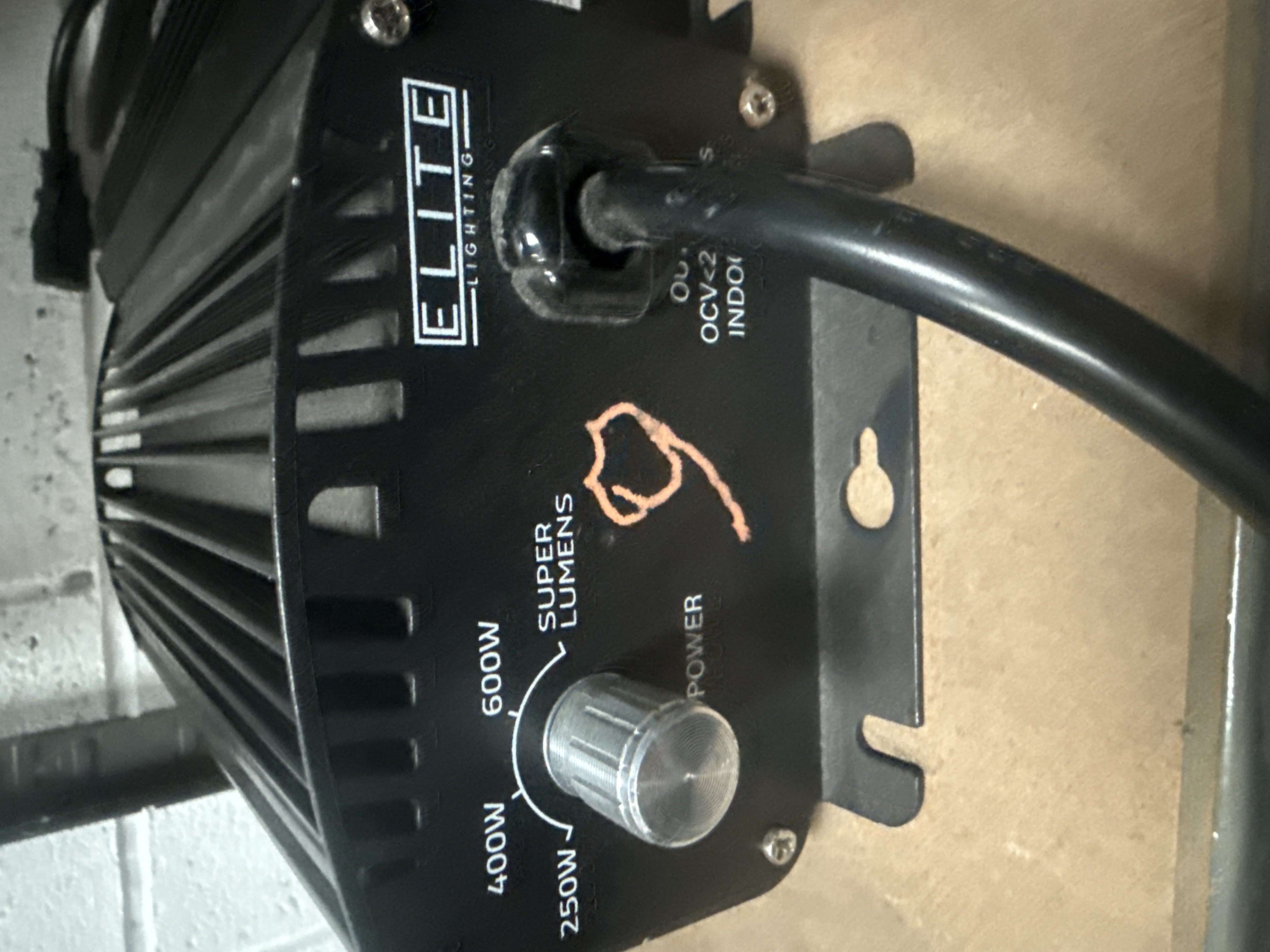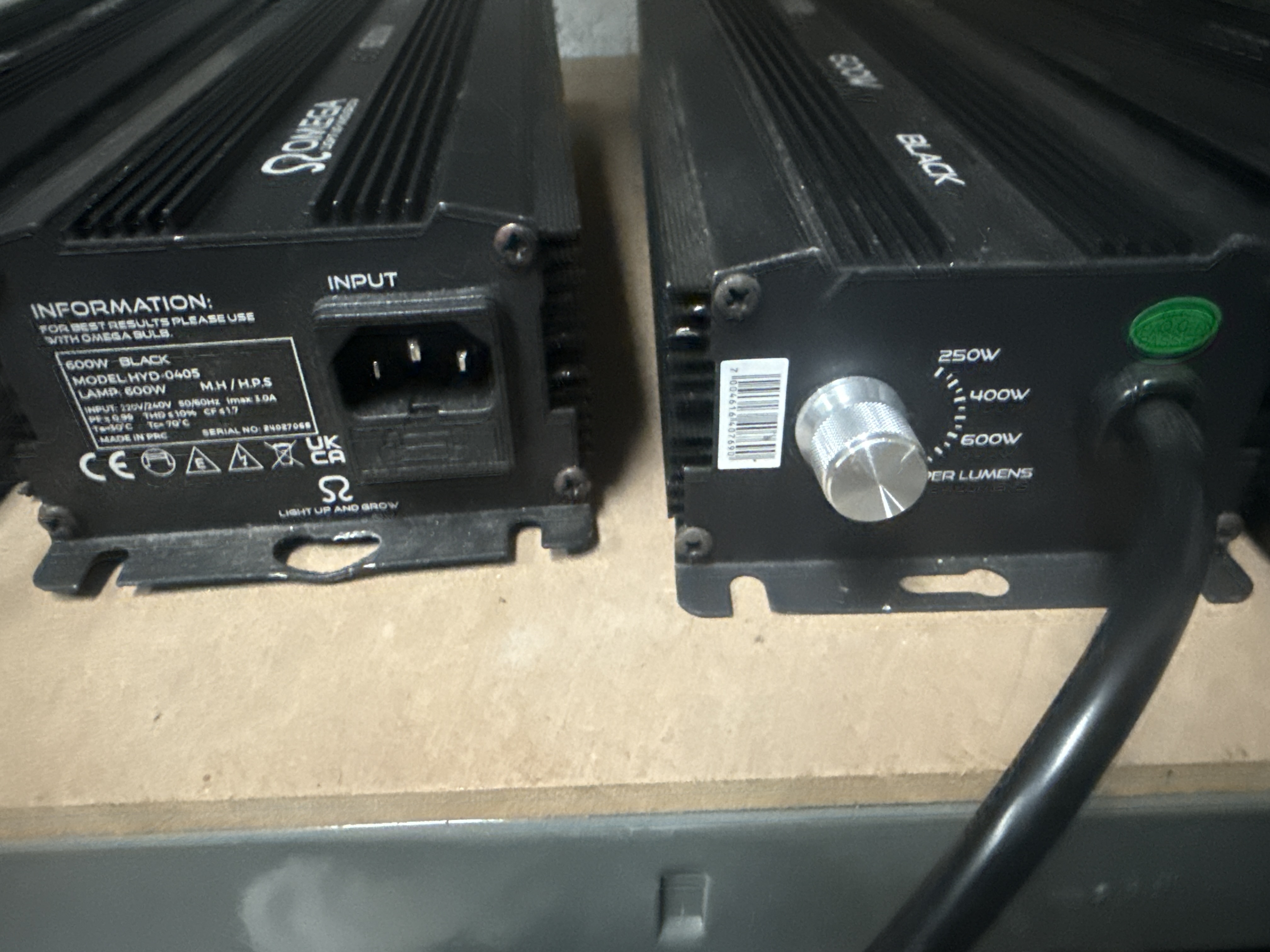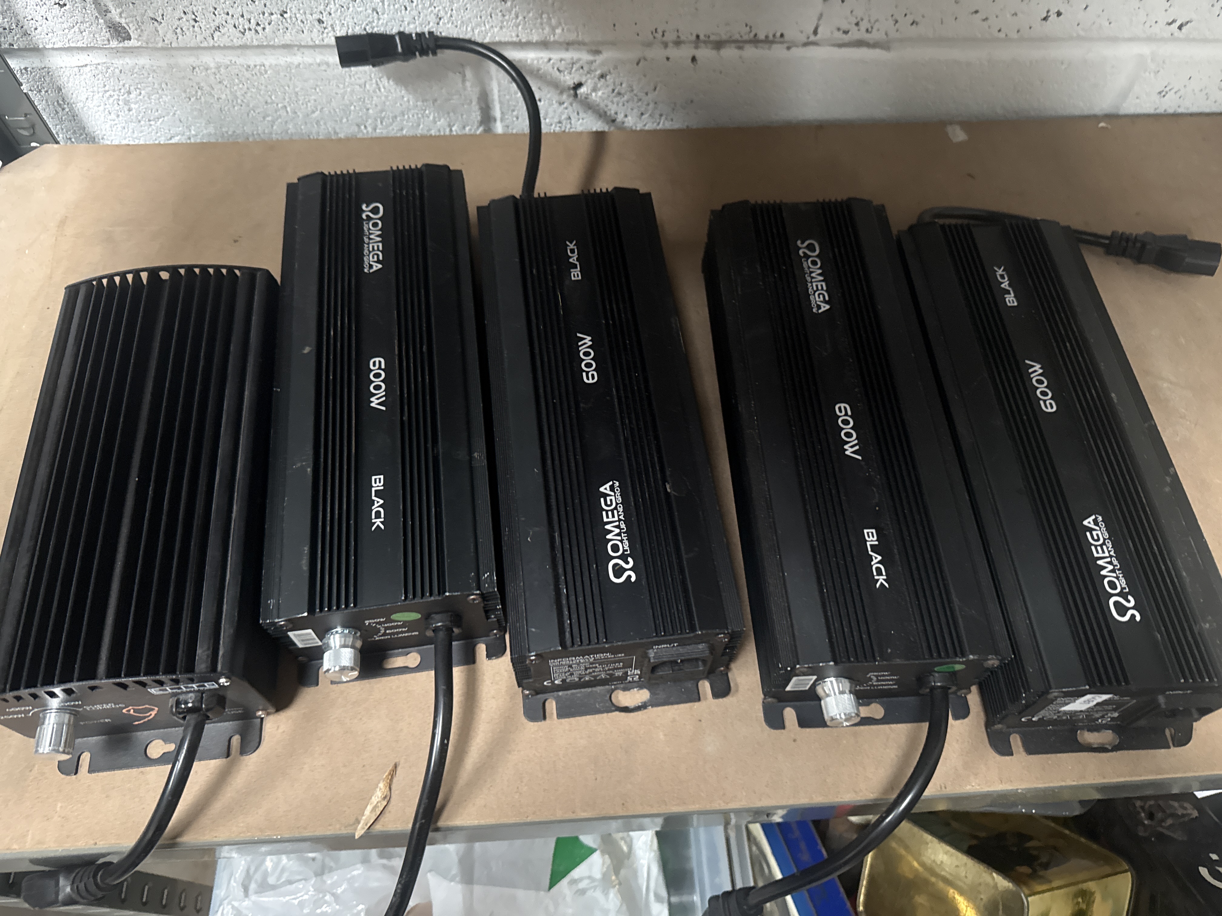 A group of five digital dimmable ballasts for horticultural use, including four units manufactured by Omega Lighting and one unit by Elite Lighting. The ballasts are constructed with black-anodized aluminum heat-sink housings and feature integrated mounting brackets. These units are designed for compatibility with 600W Metal Halide (MH) and High-Pressure Sodium (HPS) lamps. Each unit is equipped with a control panel featuring a rotary dial for adjustable wattage settings at 250W, 400W, 600W, and a Super Lumens boost mode. Visible markings on the Omega units include Omega Light Up and Grow, 600W Black, and model number HYD-0405. The fifth unit is labeled Elite Lighting. The units include integrated power cabling and standard IEC input ports.