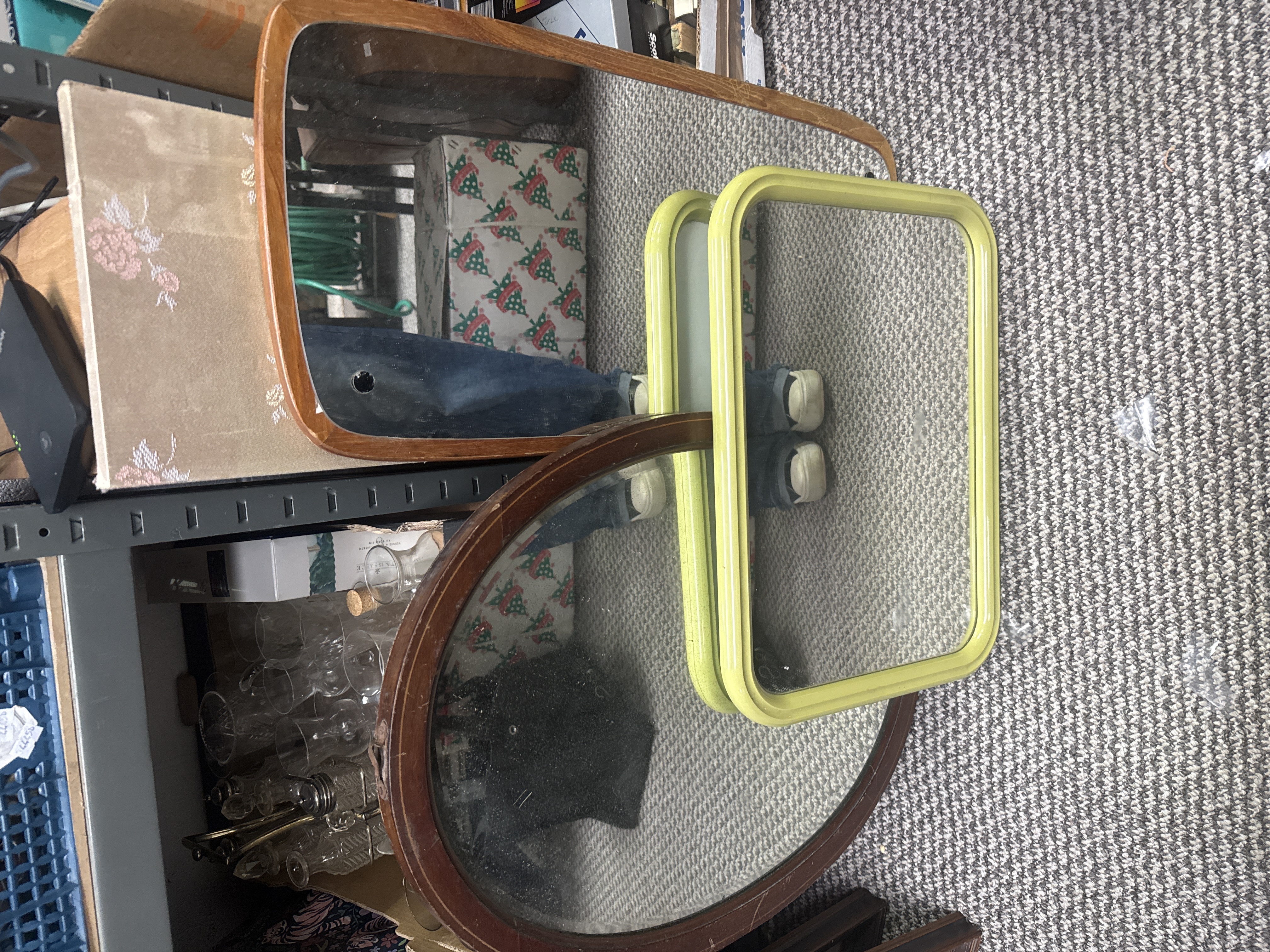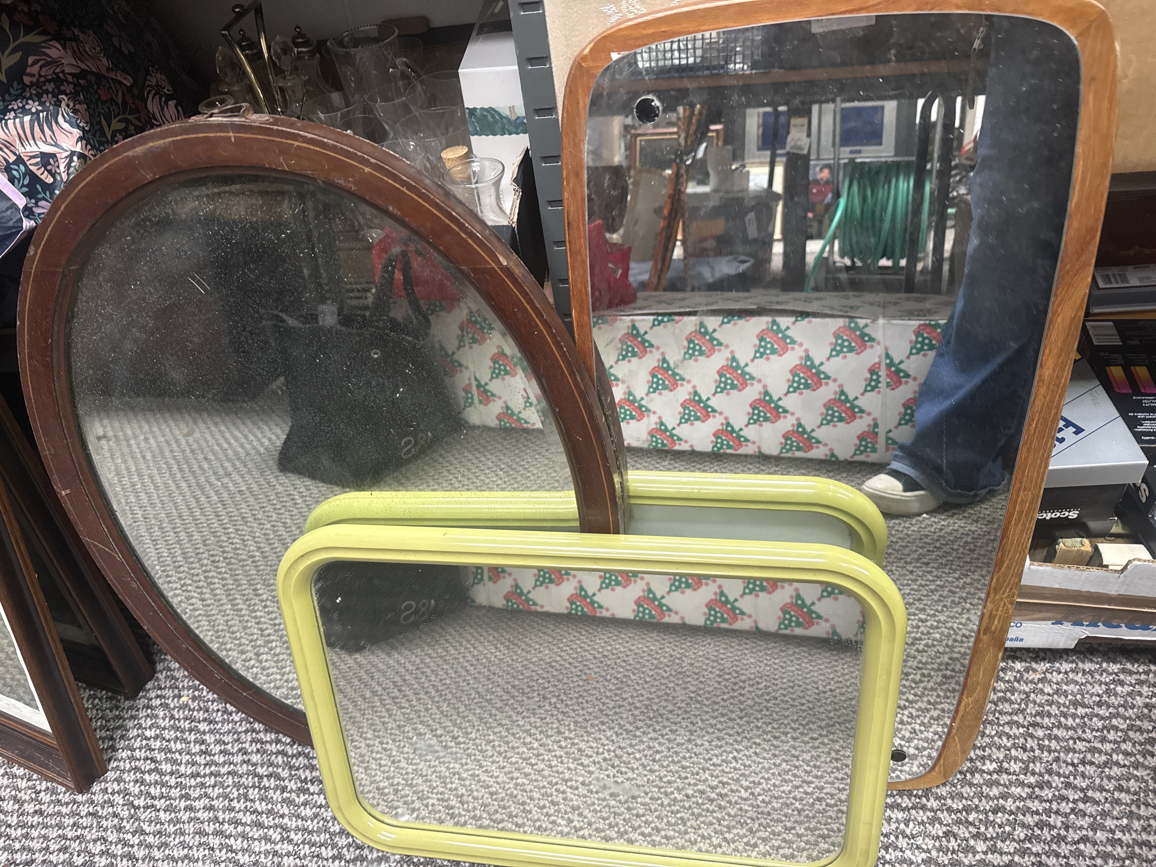 An assortment of wall mirrors in various styles and sizes. The group includes an oval mirror set in a dark-toned wood frame and a large rectangular mirror with rounded corners in a light-toned wood frame. Also included are several smaller rectangular mirrors featuring rounded corners and lime green frames, likely constructed of plastic or painted metal. The collection exhibits a combination of traditional and mid-century modern design elements. No manufacturer labels or markings are present.