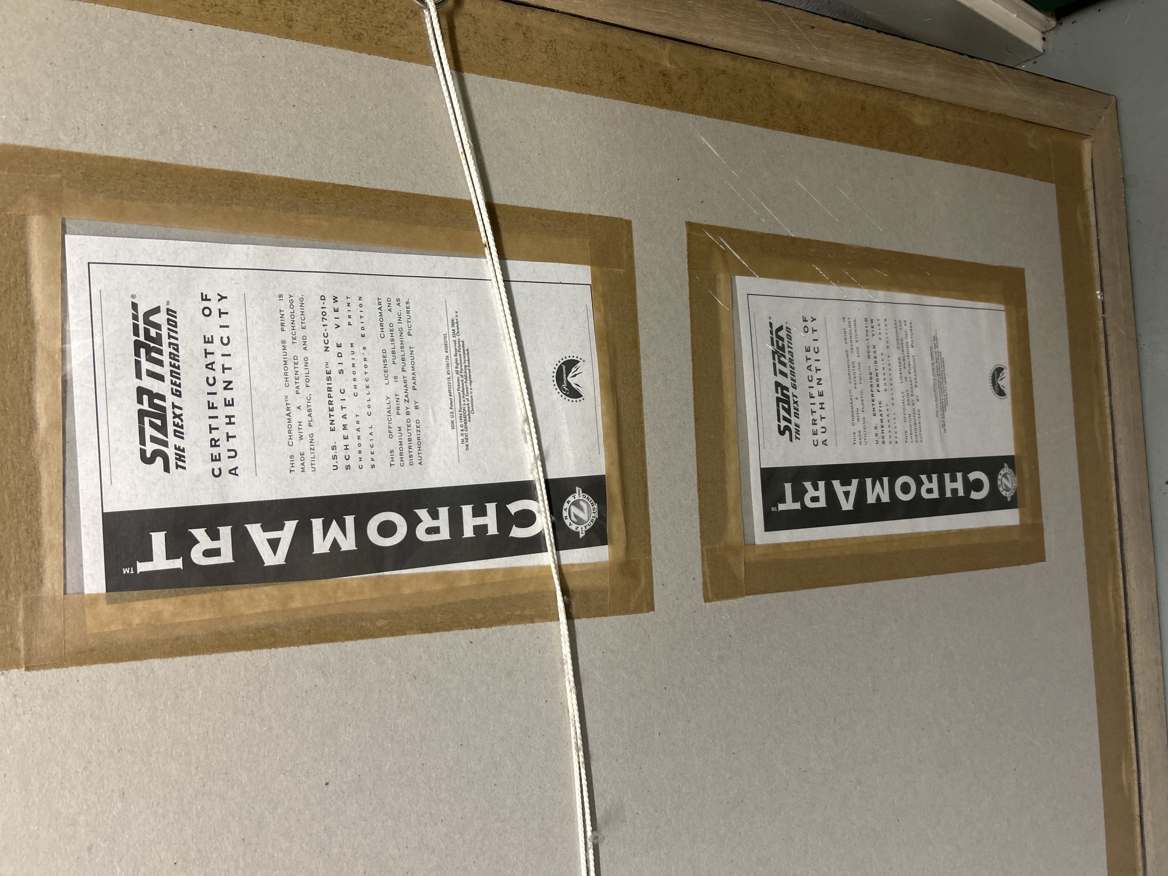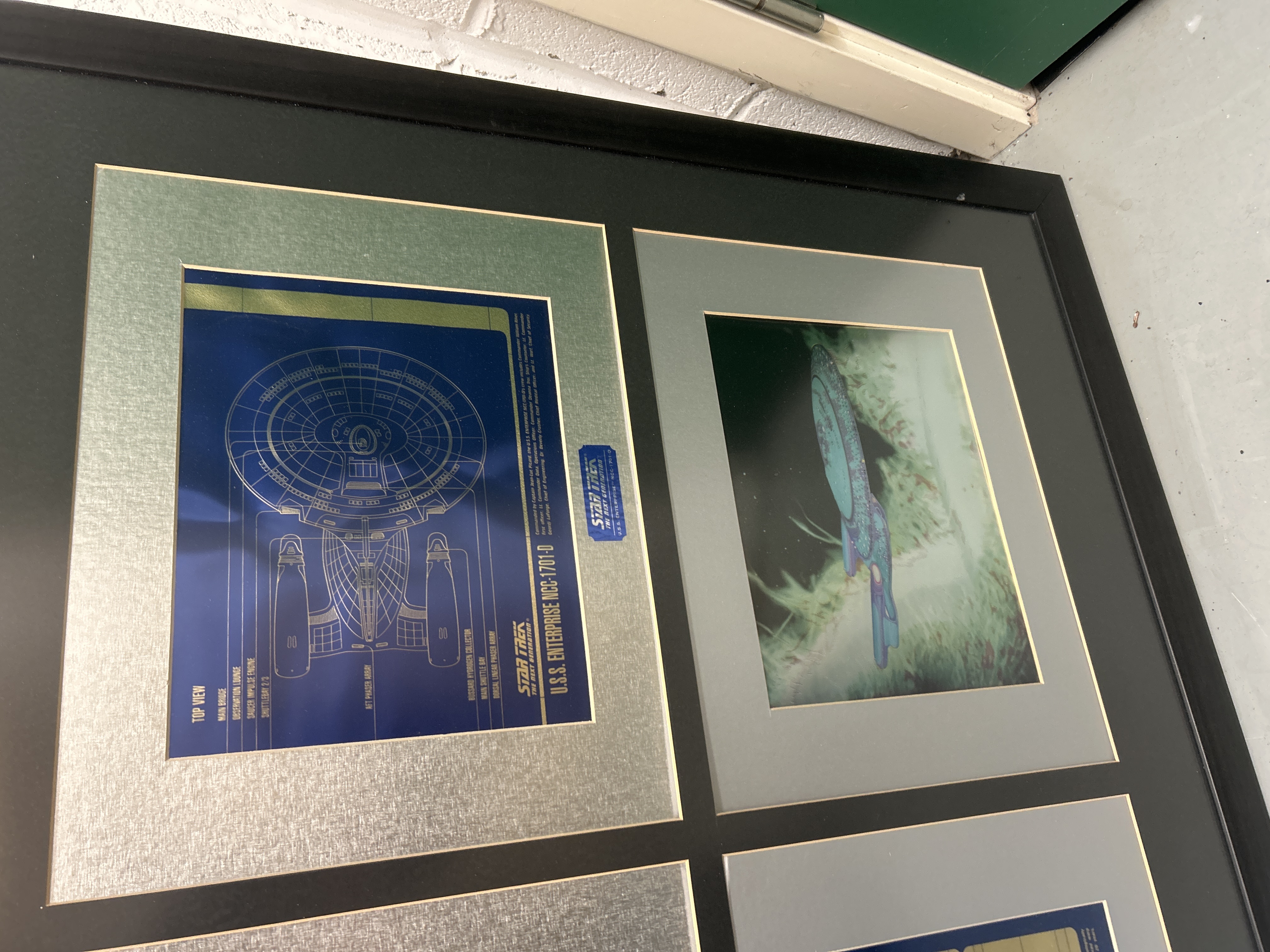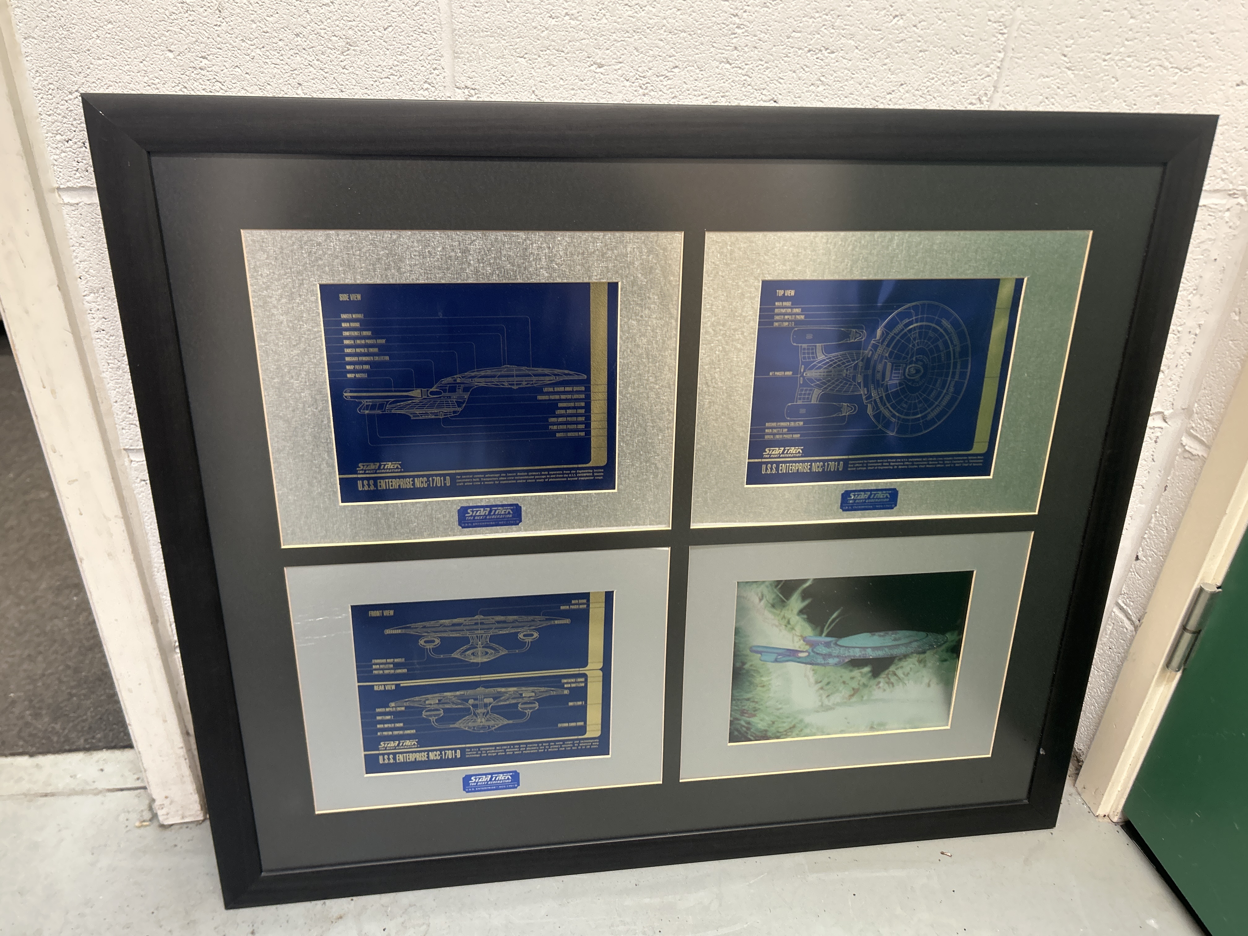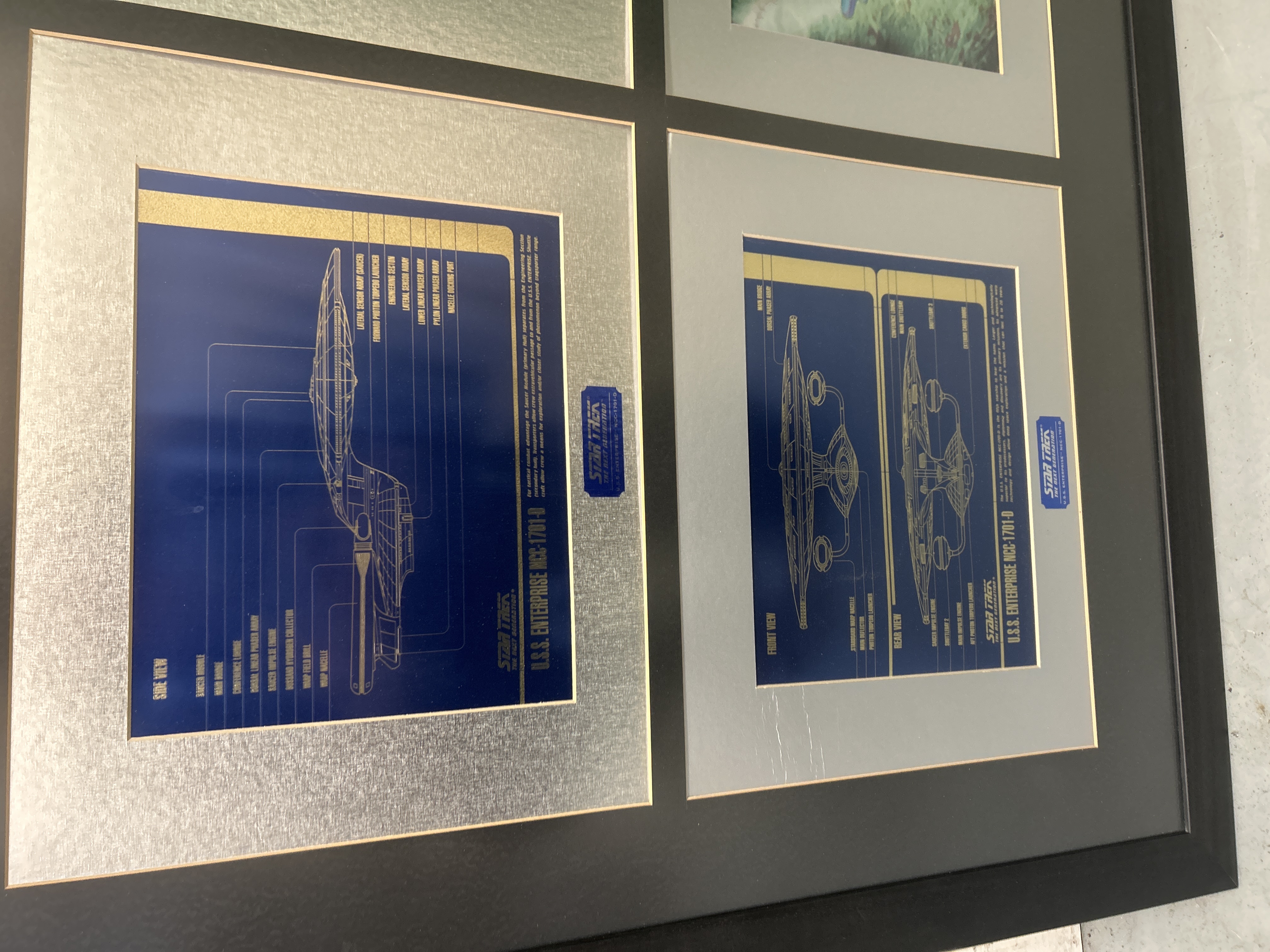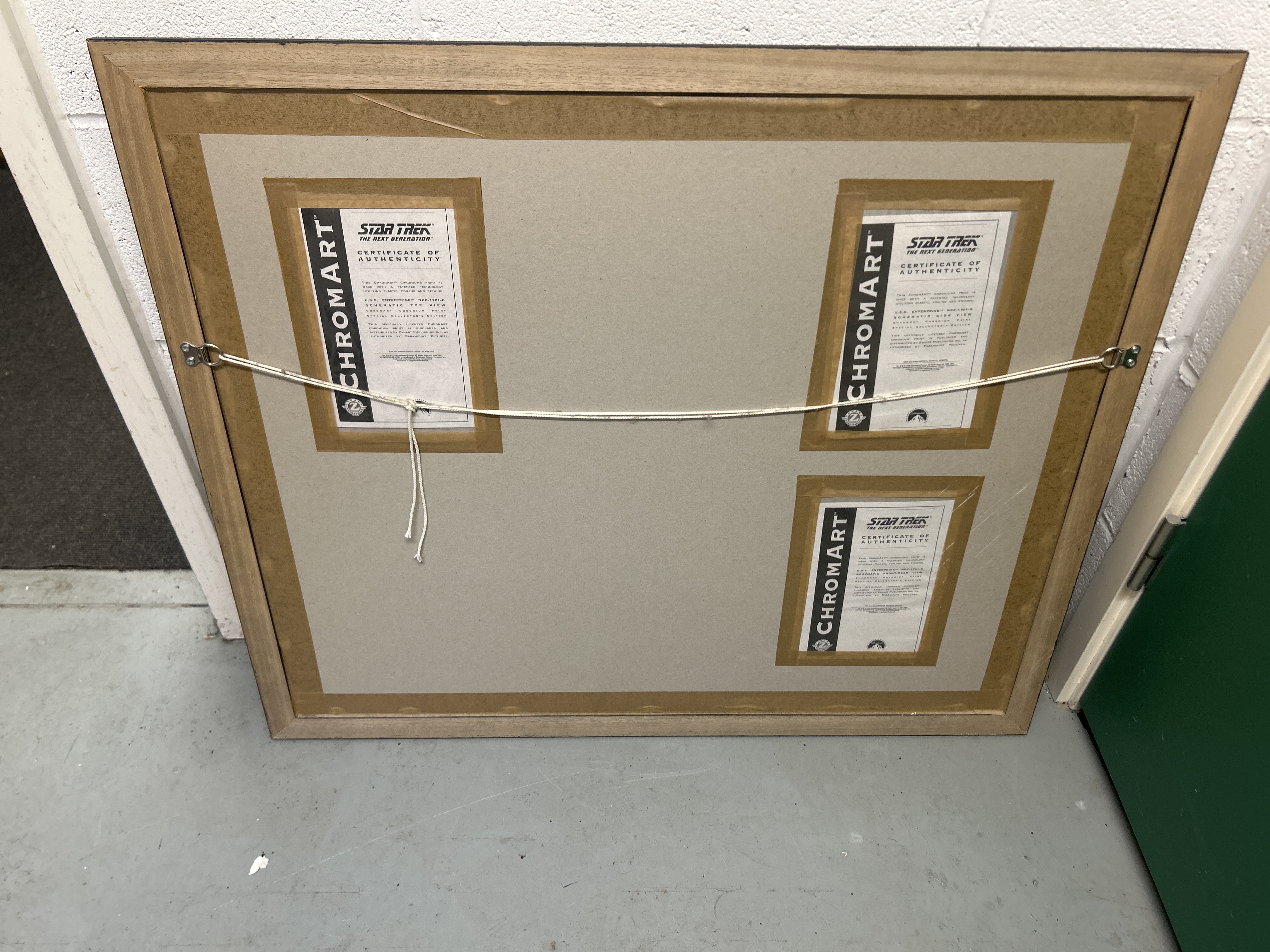 A collection of Star Trek: The Next Generation Special Collector’s Edition Chromart prints by Zanart Publishing Inc., dated 1994. The set features chromium prints produced using foiling and etching techniques. The subjects include technical schematics of the U.S.S. Enterprise NCC-1701-D, showing side, top, front, and rear elevations, alongside a pictorial depiction of the starship. The prints are housed in a 36 x 30″ multi-aperture black frame with textured silver-tone matting. The reverse of the frame retains original Certificates of Authenticity from Zanart Publishing Inc., confirming the pieces as officially licensed Paramount Pictures releases.