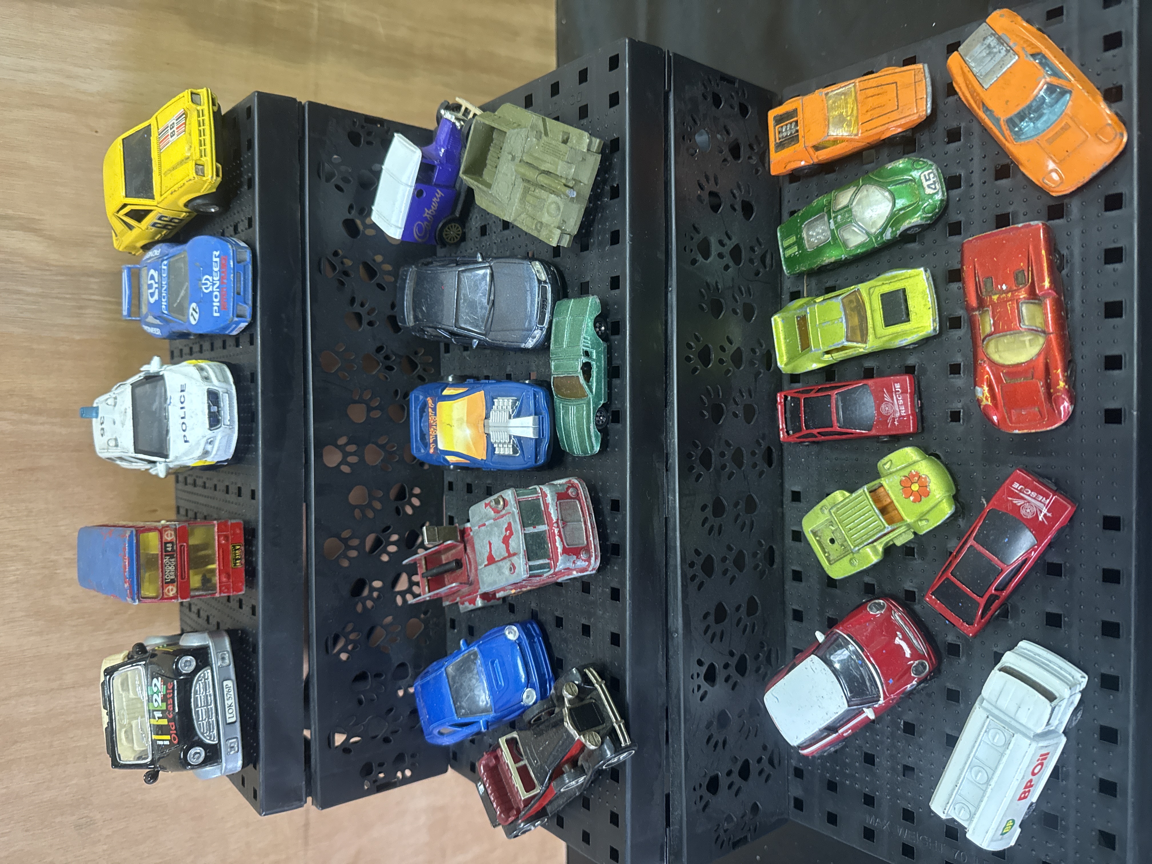 A collection of 23 assorted die-cast toy vehicles featuring a variety of makes, models, and styles. The assembly includes sports cars, a double-decker bus, emergency response vehicles, and utility trucks. The models are constructed from die-cast metal and plastic, finished in a range of colors and liveries. Visible markings and branding include PIONEER, POLICE, LONDON BRIDGE, Cadbury’s, RESCUE, and BP Oil. The group contains models from manufacturers such as Hot Wheels and Maisto. The items are presented on black plastic tiered display stands.