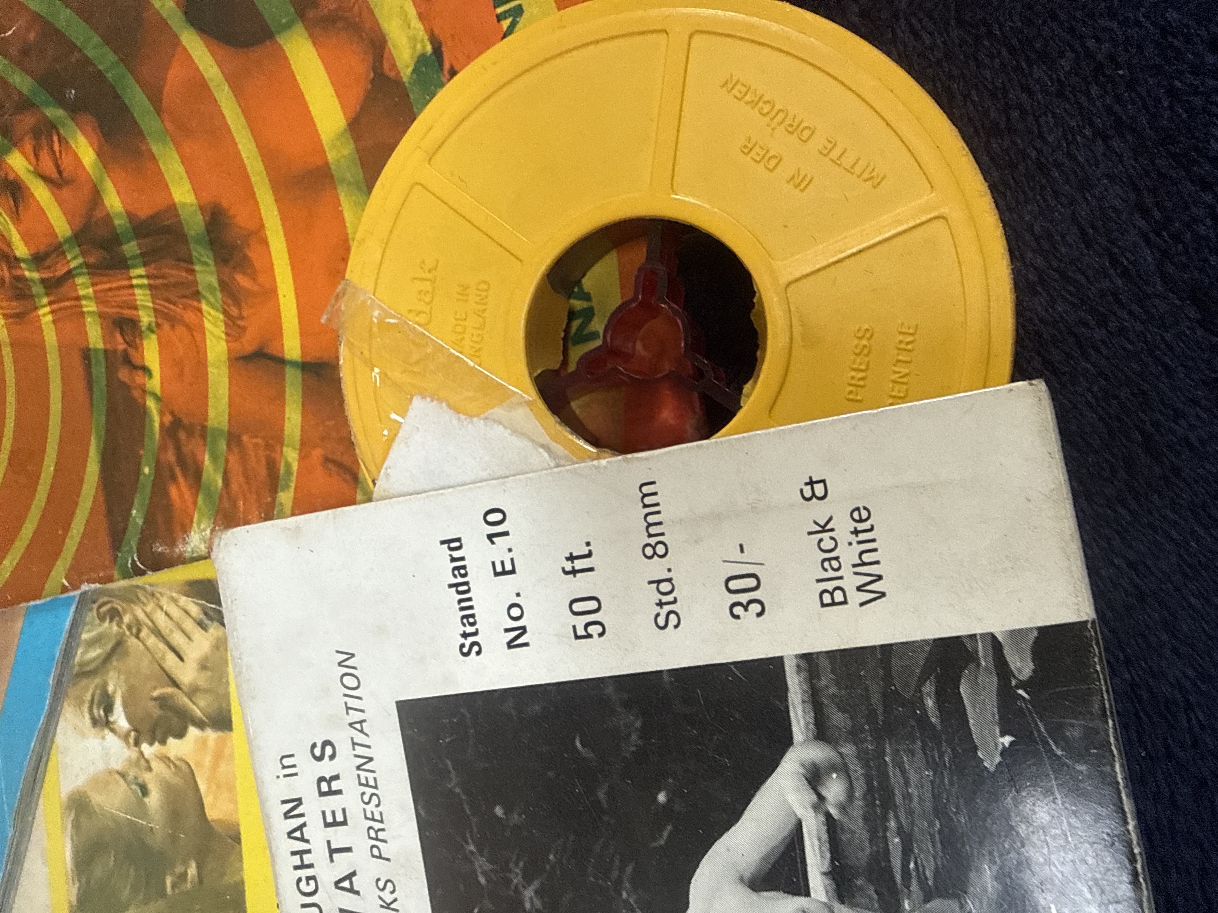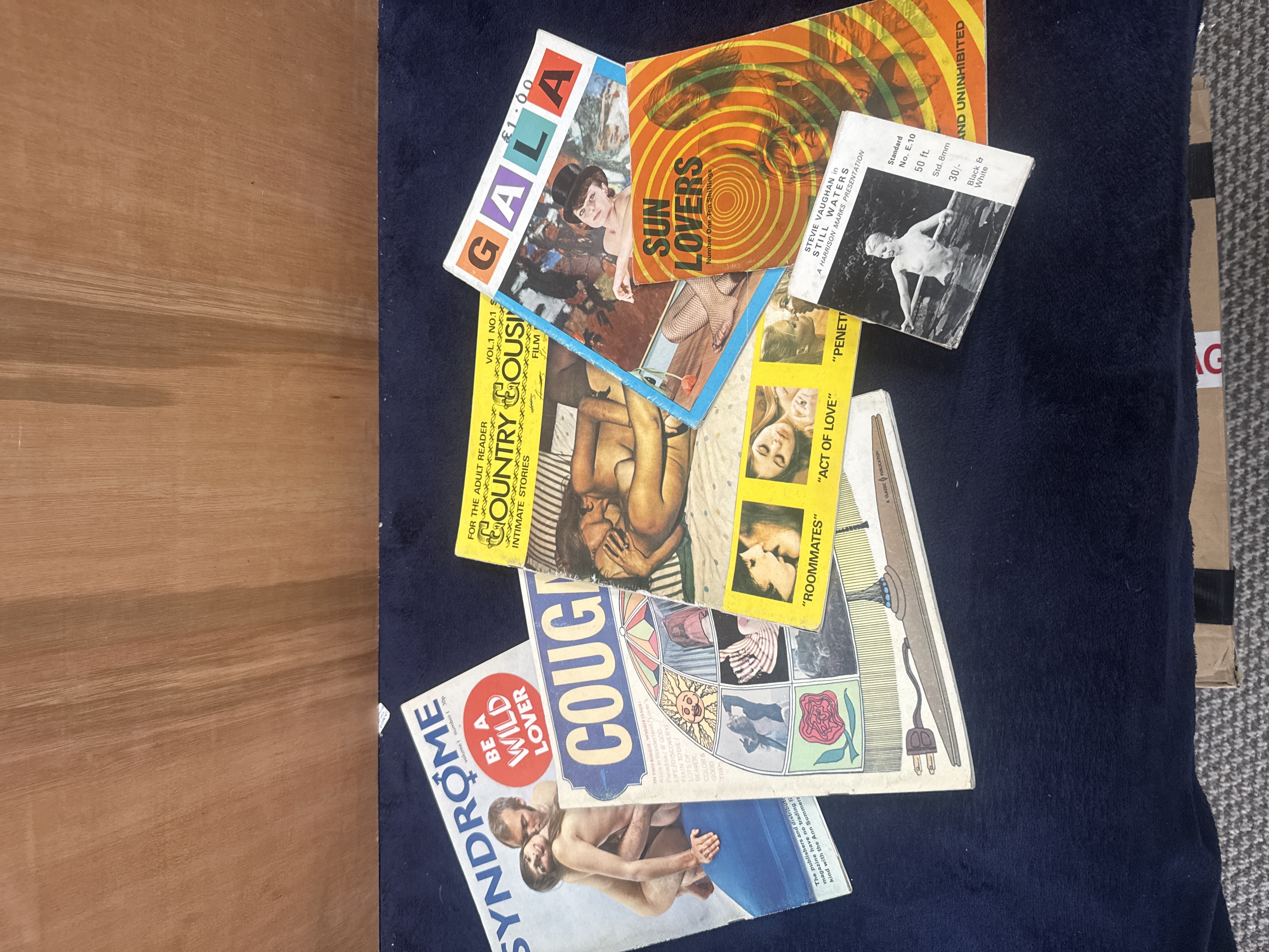 This collection comprises several vintage adult-interest magazines and a mid-20th-century 8mm film reel. Notable magazine titles include Gala, Sun Lovers, Country Cousin (Vol. 1, No. 1), Syndrome (Vol. 1, No. 1), and Cougar, featuring covers typical of the 1960s and 1970s. Also included is a Harrison Marks presentation film titled Stevie Vaughan in Still Waters, consisting of a 50-foot, black-and-white standard 8mm film on a yellow Kodak plastic reel with its original pictorial slipcase.