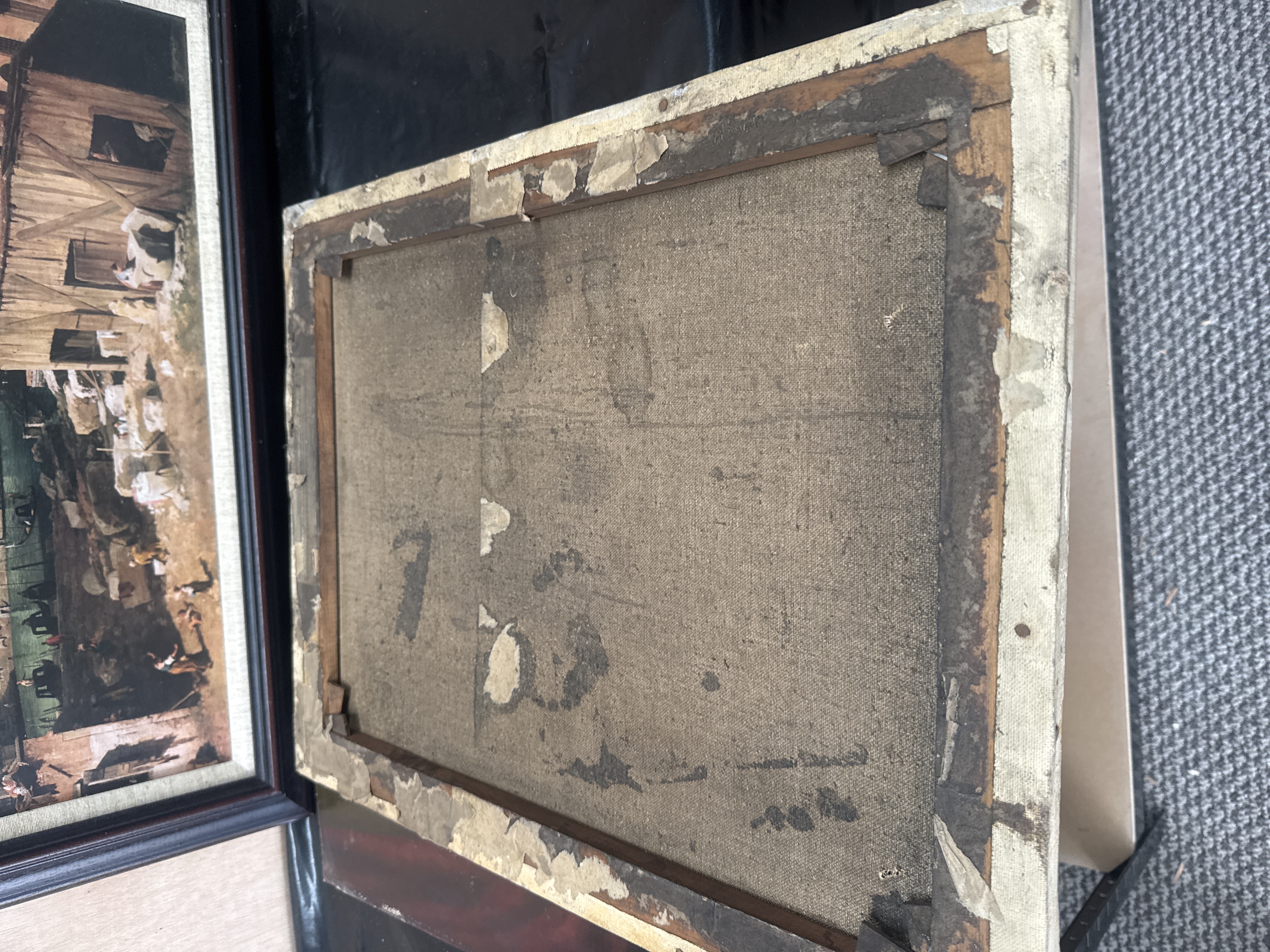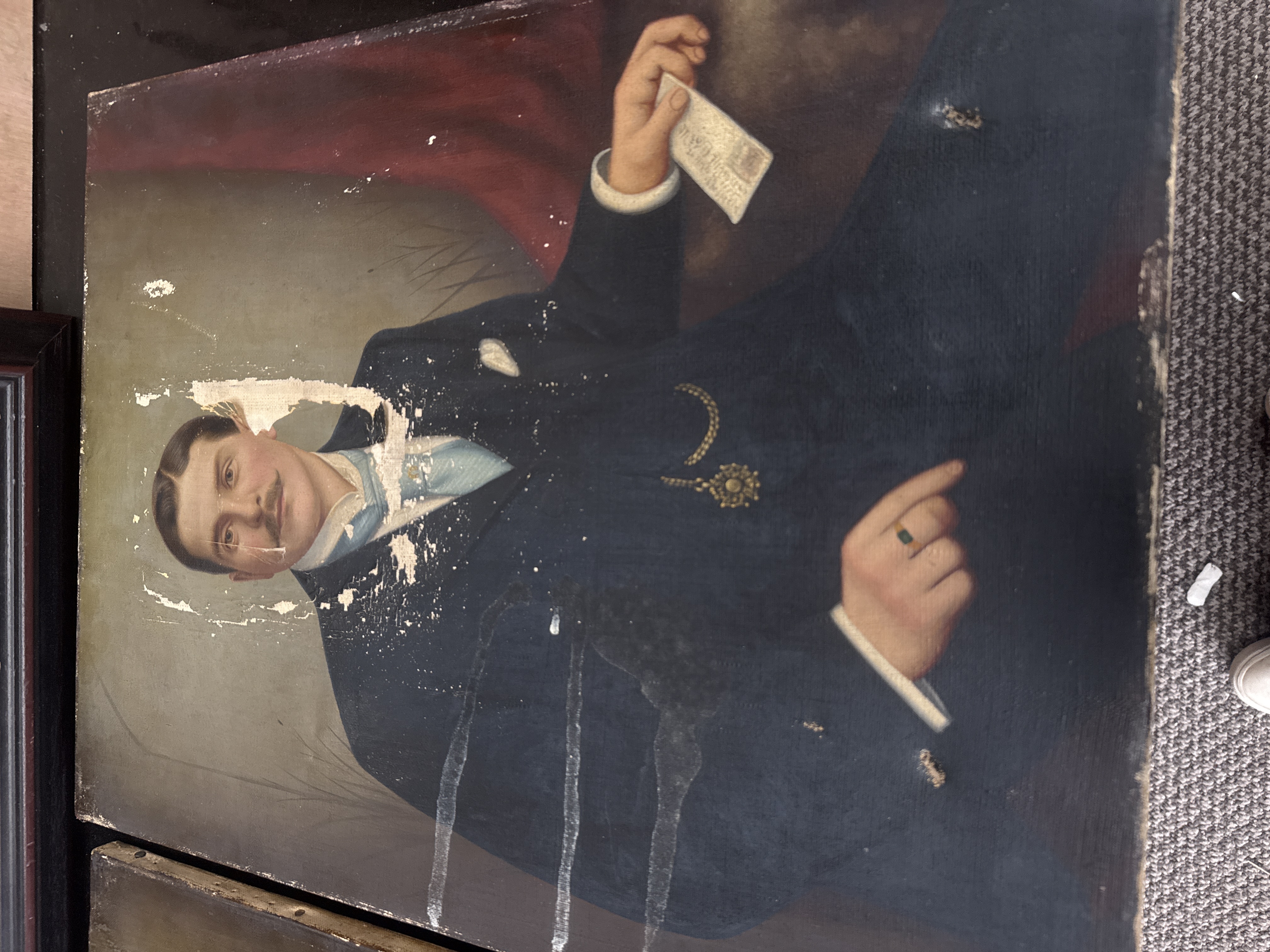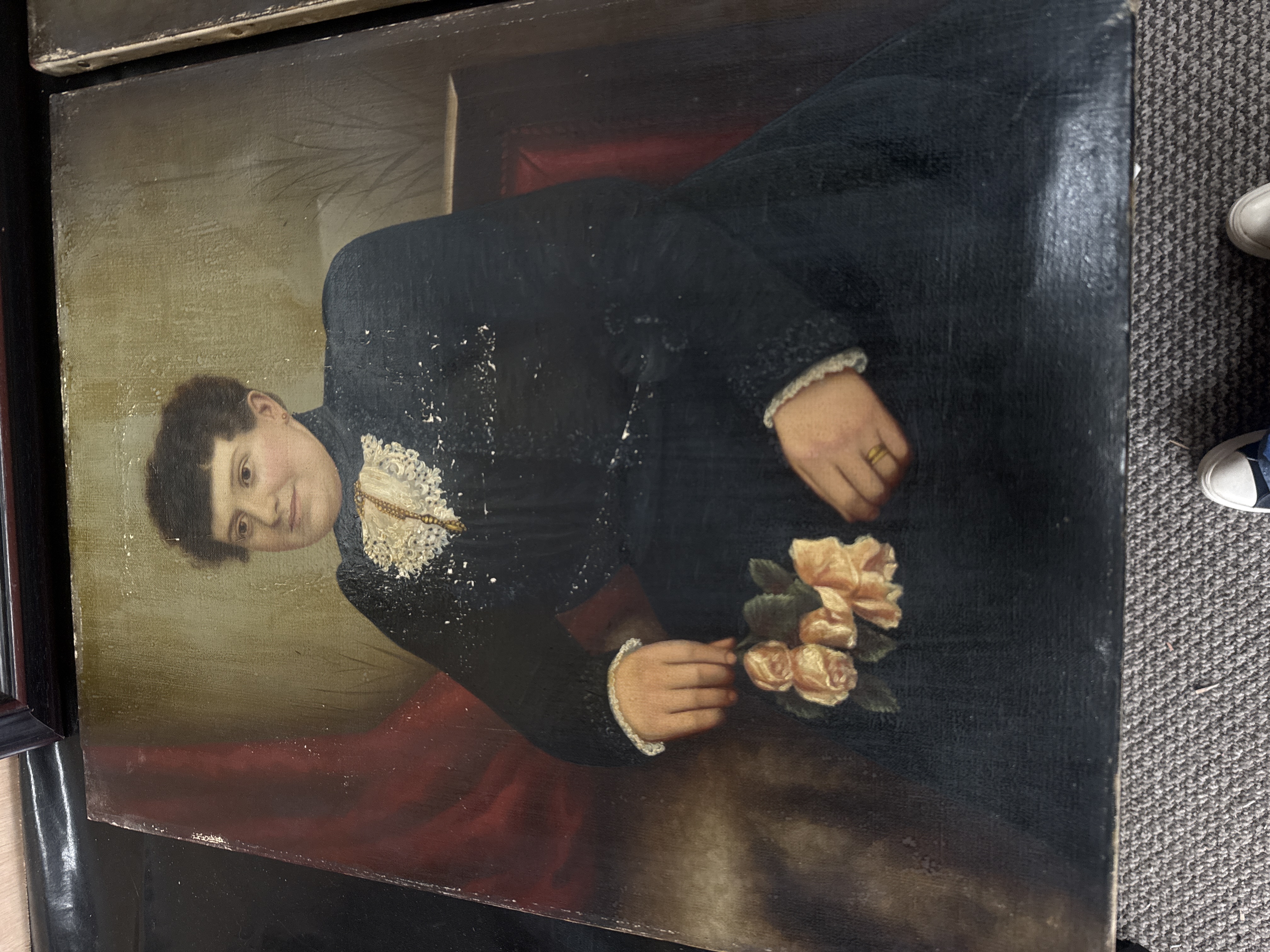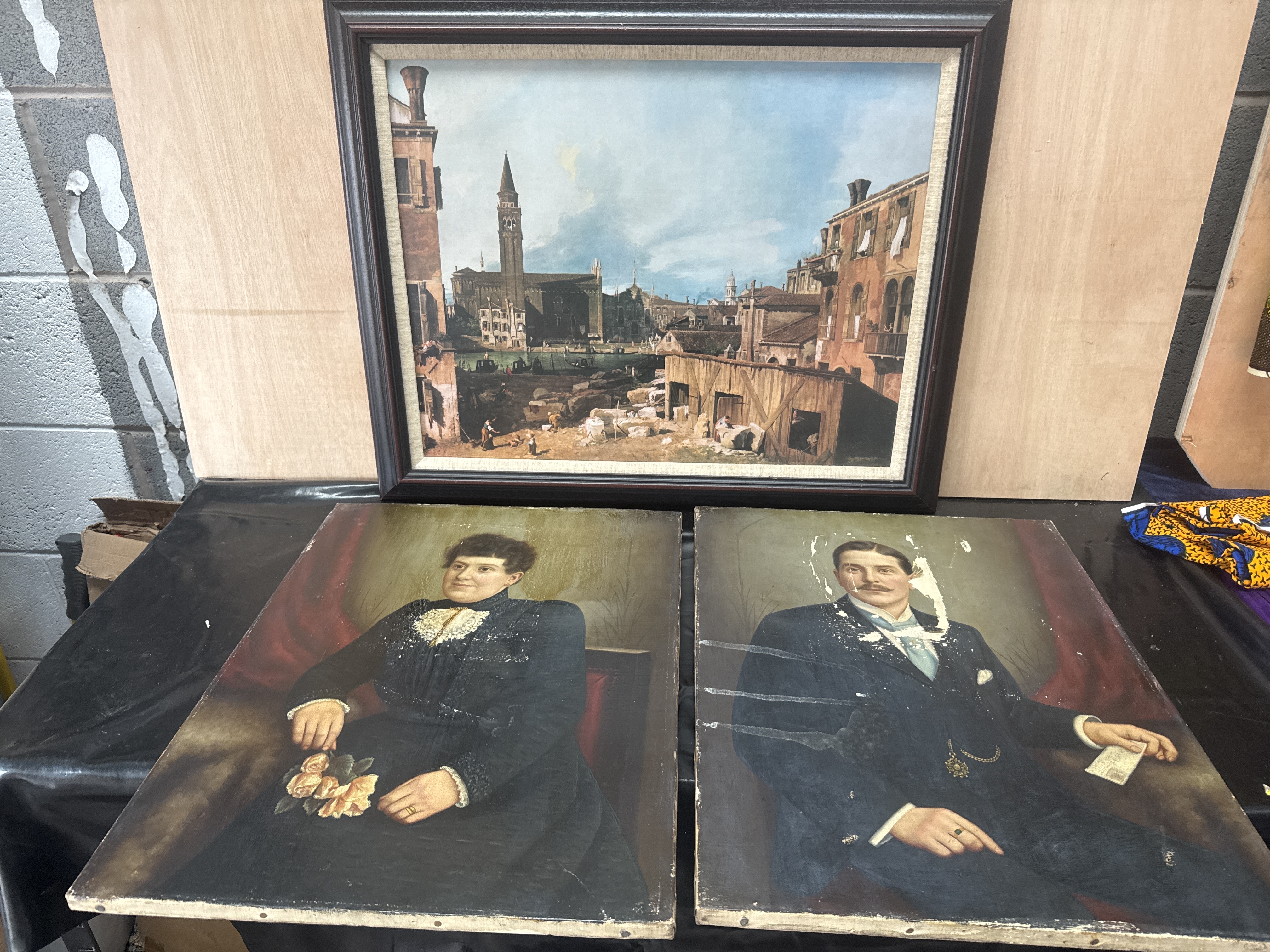 This lot consists of three paintings. The largest 28 X 33 inch piece is a framed landscape painting depicting a bustling European cityscape with architectural landmarks and figures, presented in a dark wood-finish frame with a light-colored inner liner. The remaining two items are a pair of unframed oil on canvas portraits dating to the late 19th or early 20th century. One portrait depicts a male subject in a formal suit holding a card, while the other depicts a female subject in a dark dress with a lace collar holding yellow roses. The canvases are mounted on aged wooden stretcher bars with darkened fabric and indistinct markings on the reverse.