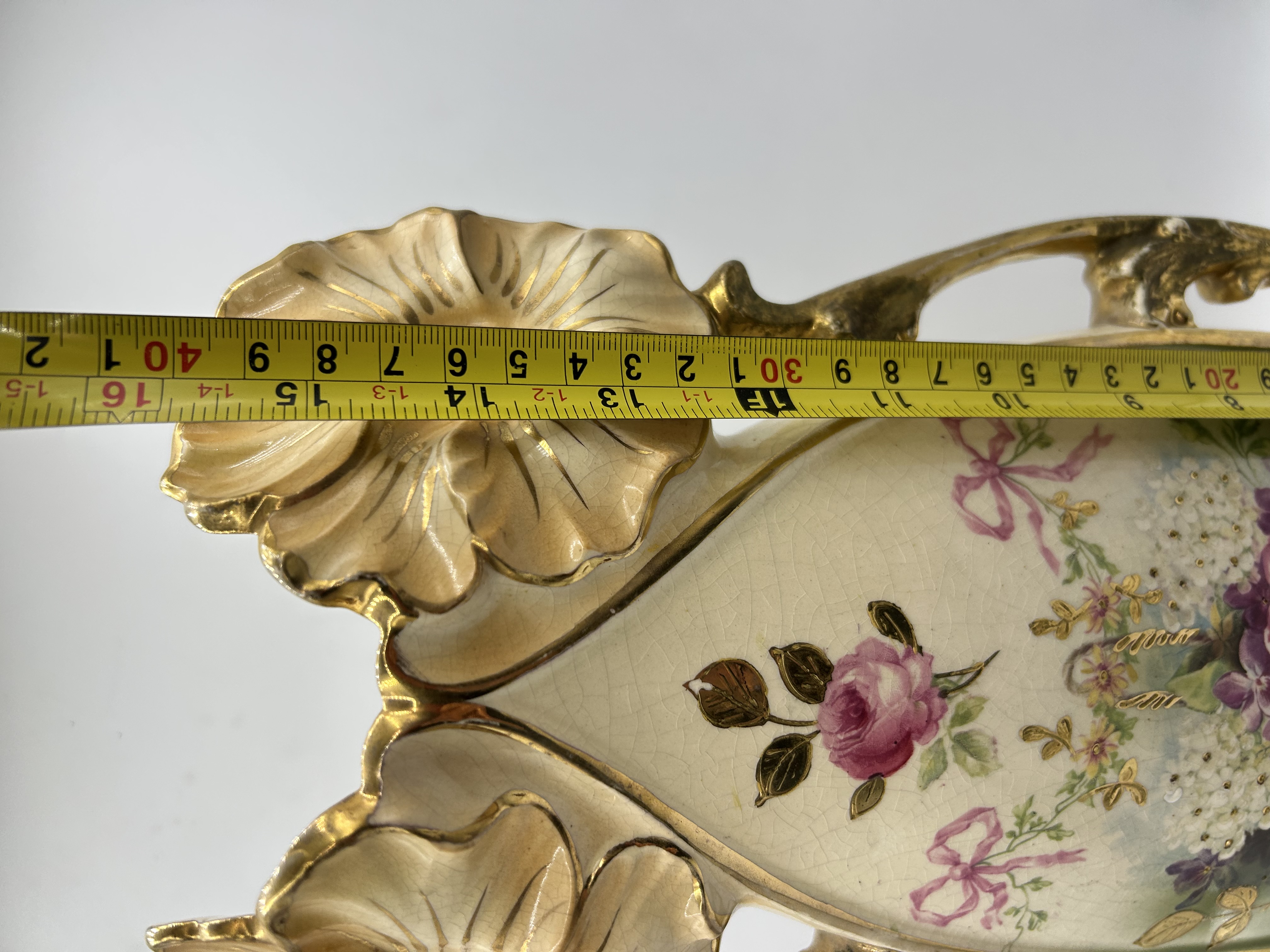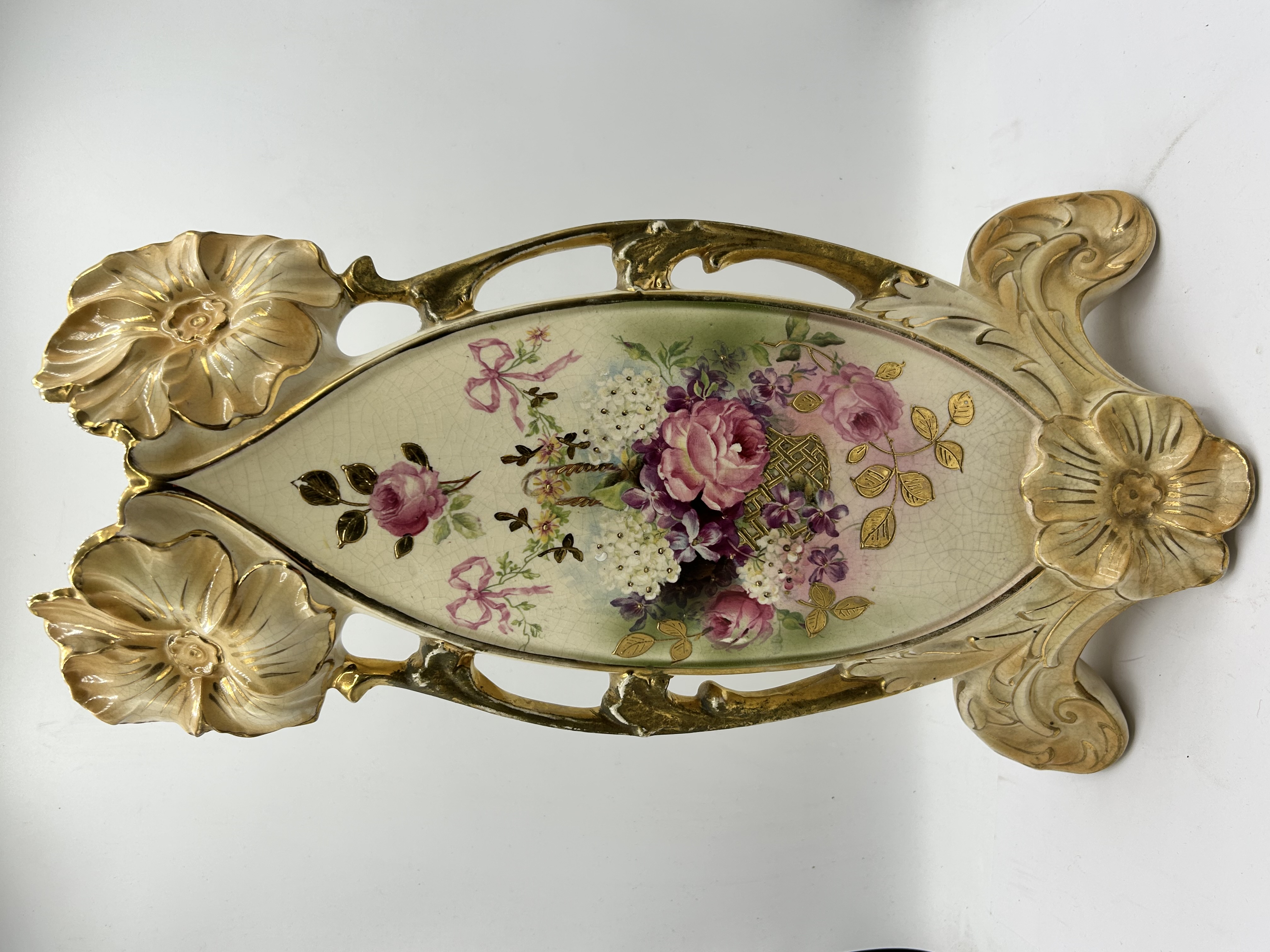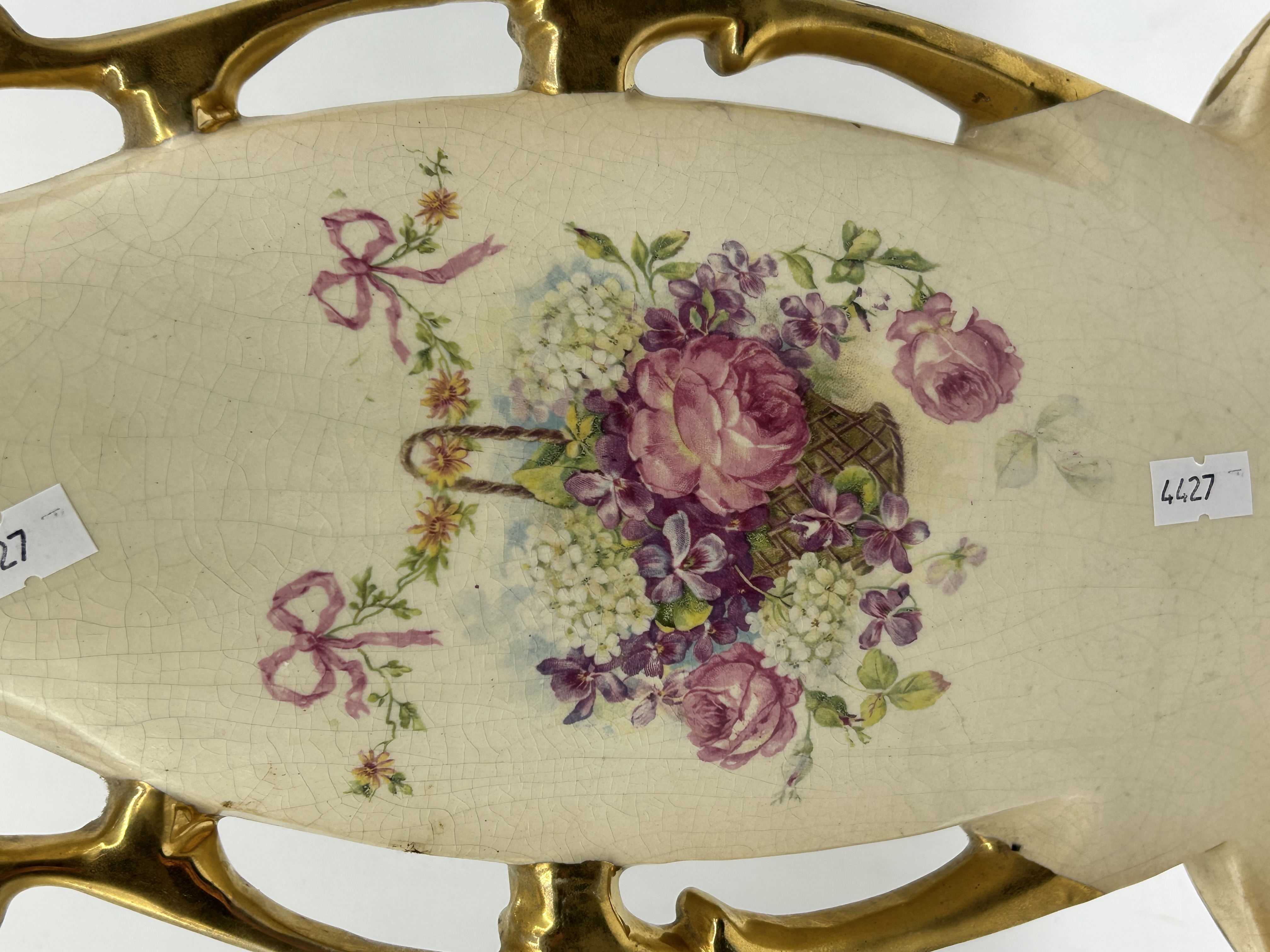 An RS Prussia porcelain celery dish of elongated boat-shaped form. The piece features elaborate pierced scrolled handles and foliate accents highlighted with gold-tone gilding. The central panel is decorated with a polychrome floral motif depicting pink roses, violets, and white blossoms arranged in a basket and adorned with pink ribbons. The cream-toned glaze is finished with a hand-painted gold number 779 on the underside.
