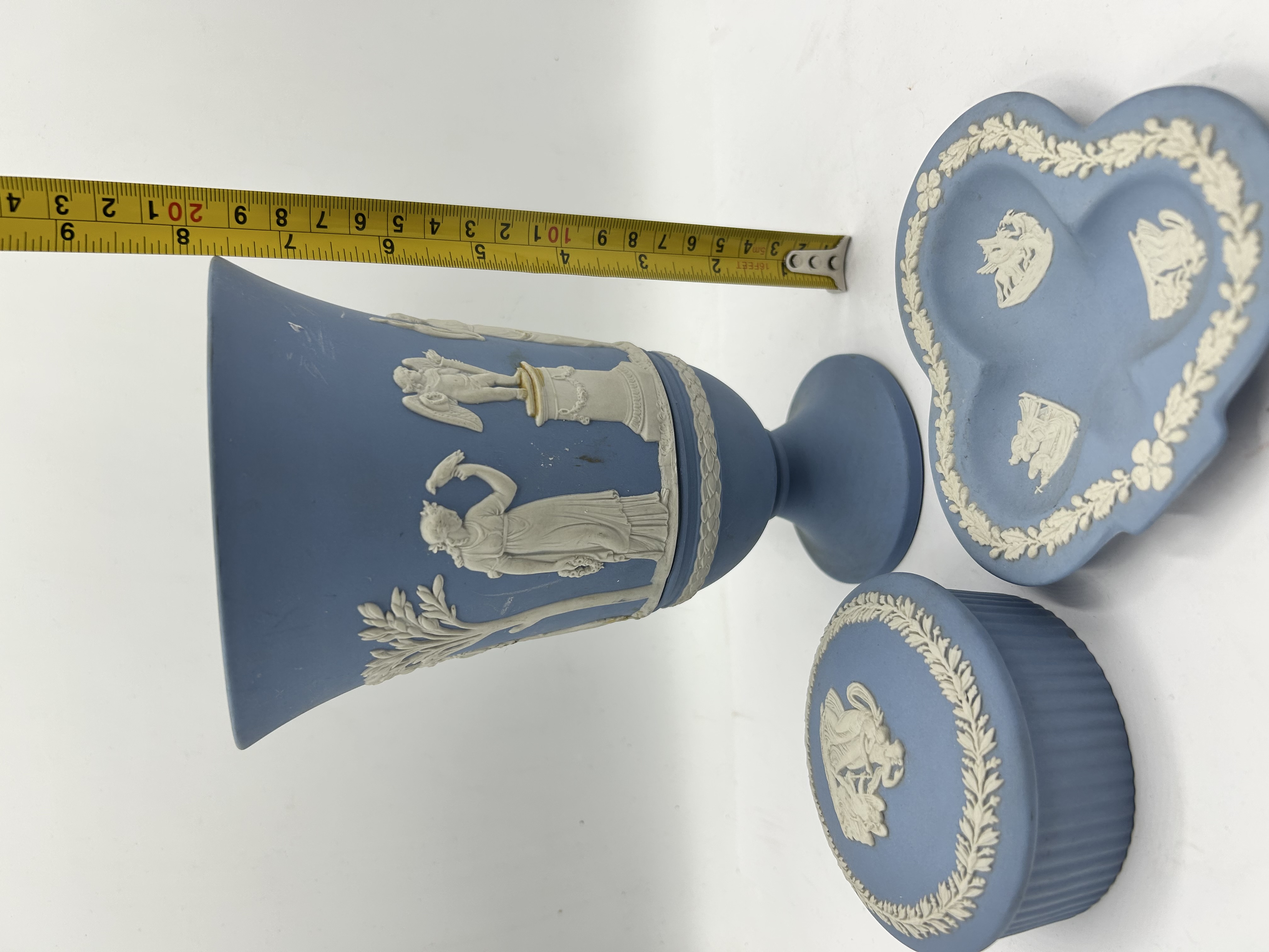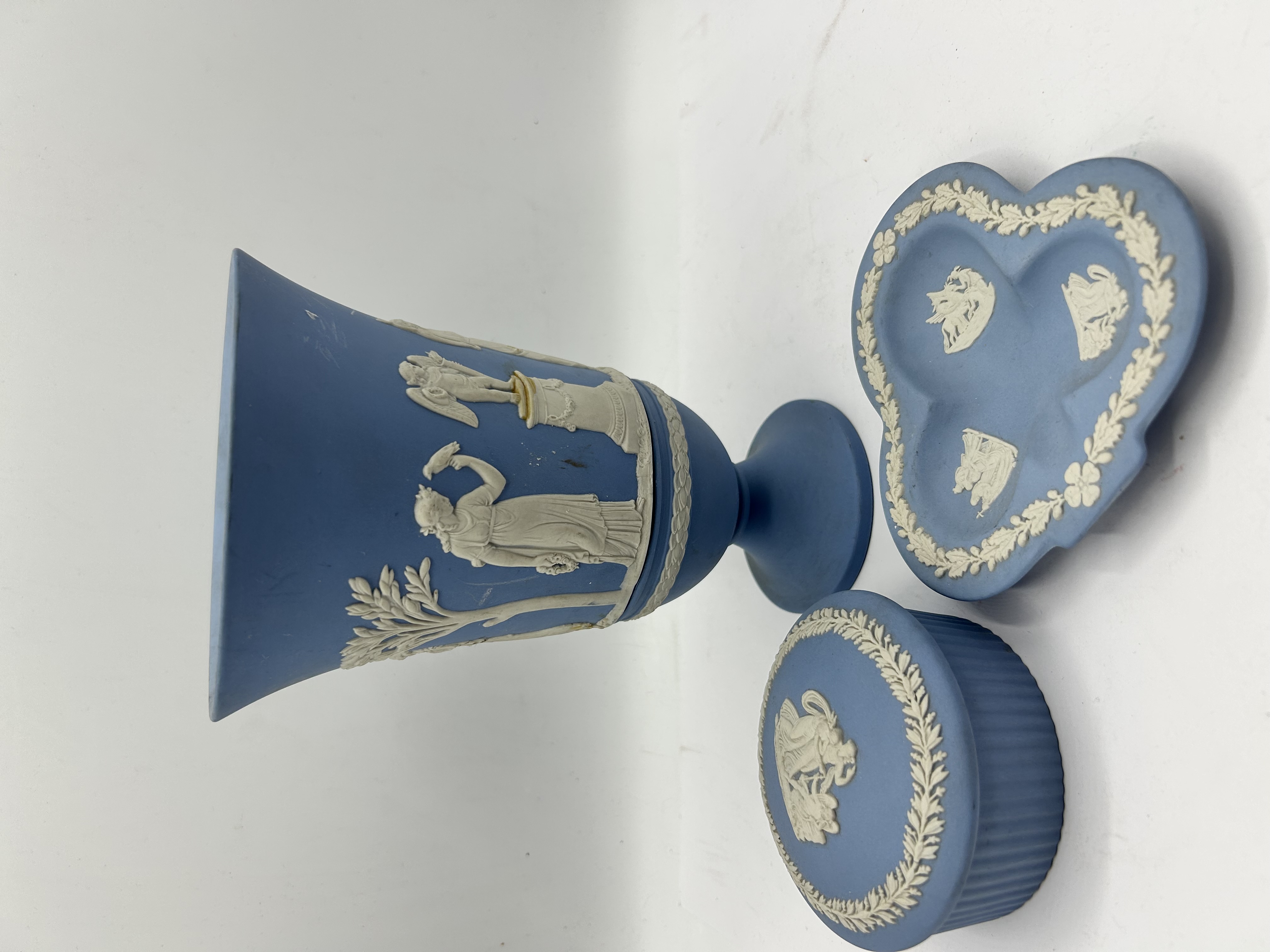 A trio of Wedgwood blue jasperware items featuring classical white bas-relief decoration. The group consists of a footed urn-form vase depicting various mythological and neoclassical figures, a trefoil-shaped dish with a scalloped laurel leaf border, and a small circular lidded box with a fluted base. Each piece is crafted in a matte blue stoneware. The urn features a flared rim and a pedestal base accented with a laurel leaf band. The lidded box and dish display similar neoclassical motifs and foliate borders characteristic of the maker.