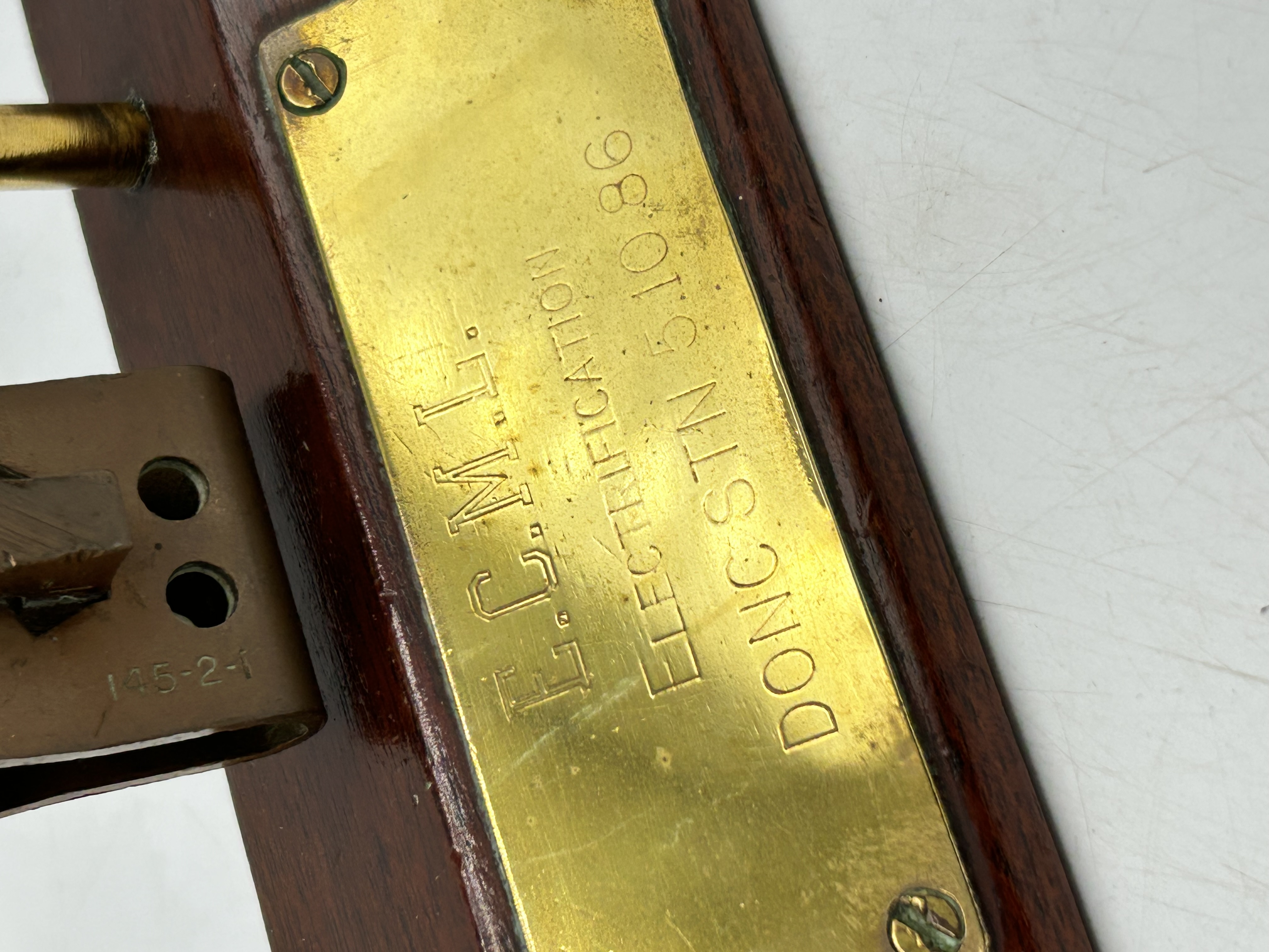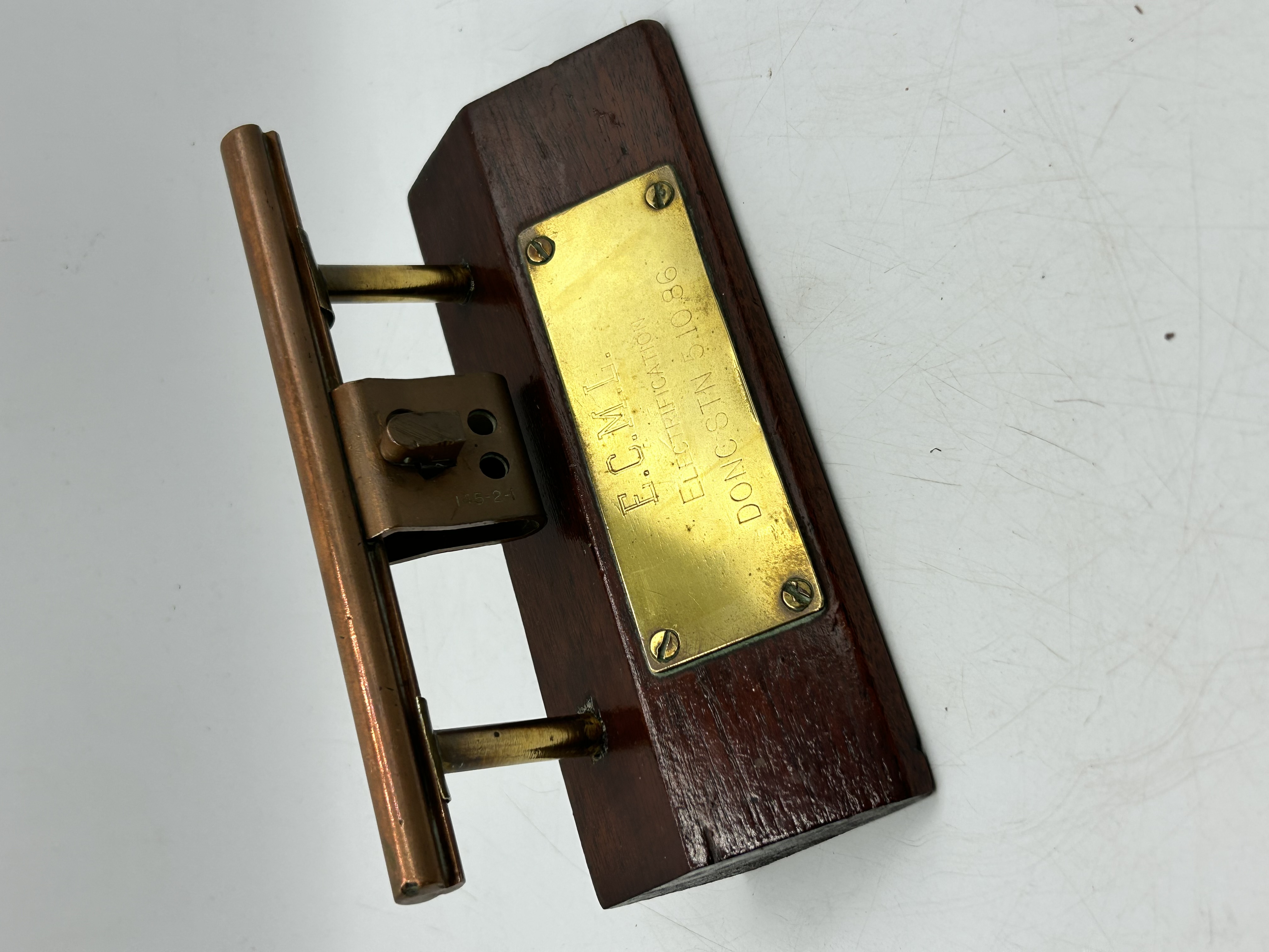 A commemorative railway presentation plaque dated 1986, featuring a section of industrial electrical equipment mounted on a dark polished wooden base. The component appears to be a section of overhead line equipment or a pantograph part, constructed from copper-alloy and brass. An engraved brass plate is attached to the wooden base and reads E.C.M.L. ELECTRIFICATION DONG STN 5.10.86. A metallic component is stamped with the mark 145-2-1.
