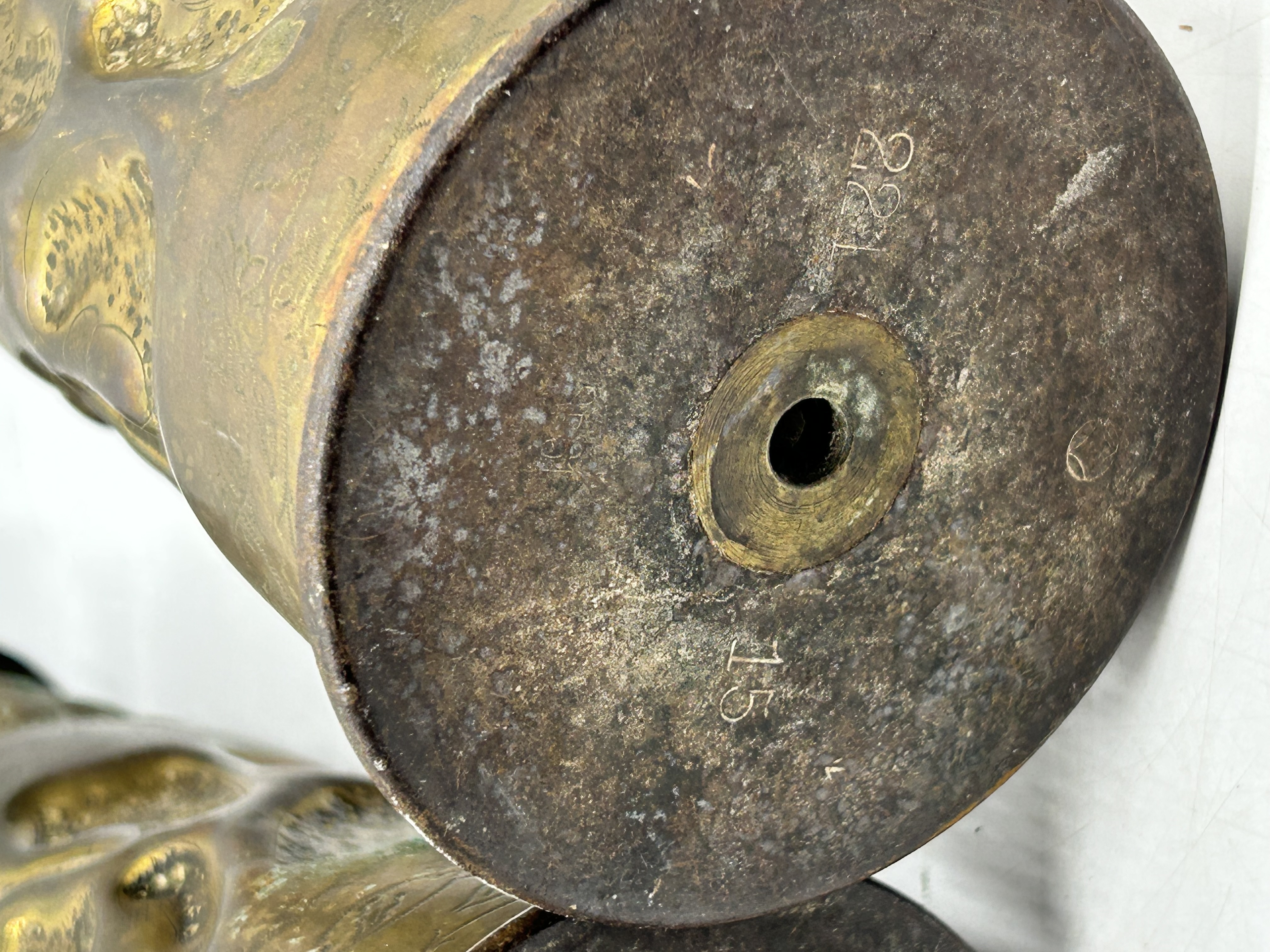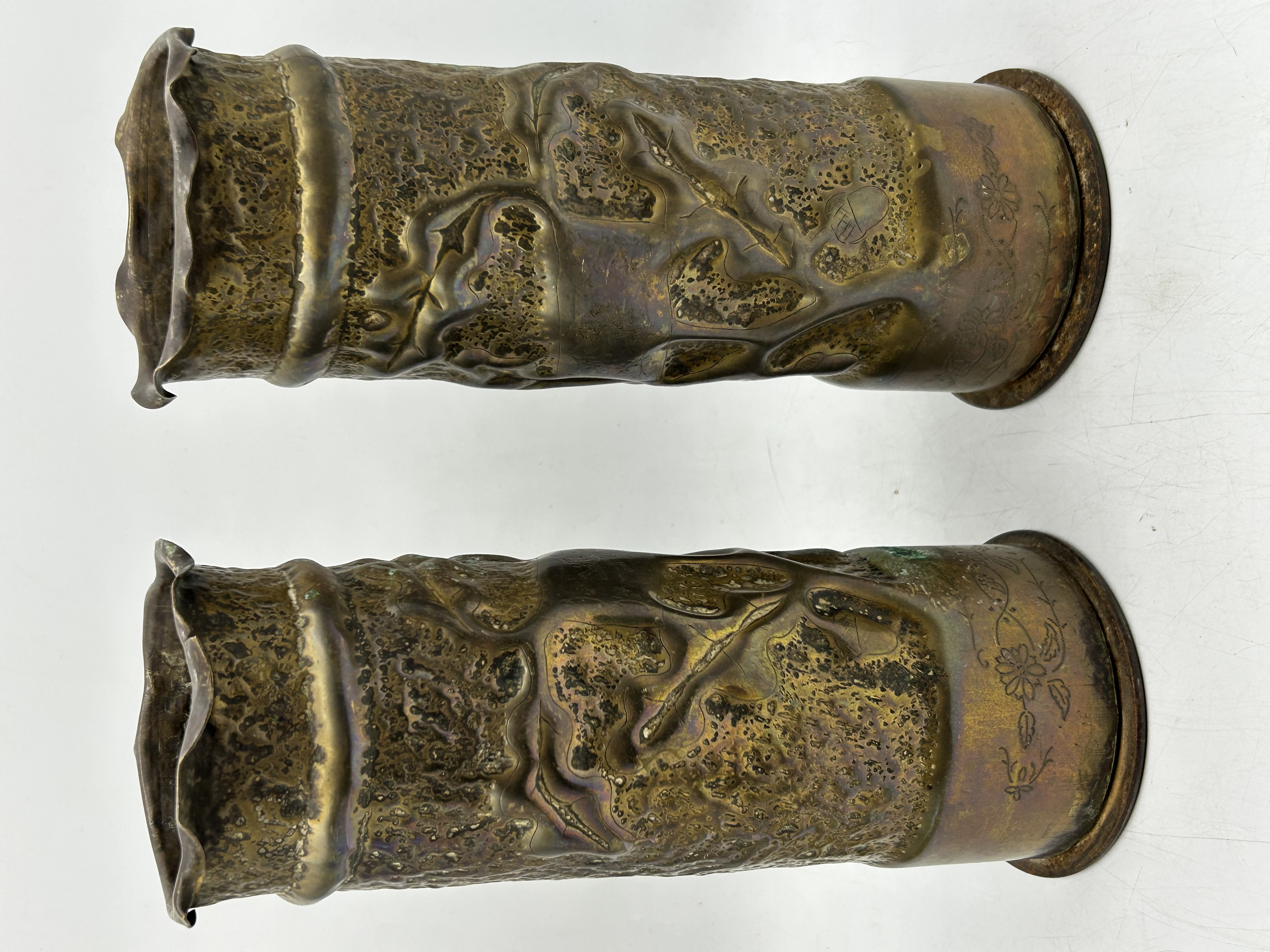 A pair of World War I era trench art vases crafted from repurposed brass artillery shell casings. Each cylindrical vessel features an Art Nouveau-influenced design with hammered, repousse-style organic foliage and etched floral motifs above a circular base. The upper rims are decoratively flared and scalloped. Stamped markings on the bases include the numbers 15 and 122, along with small circular insignias.