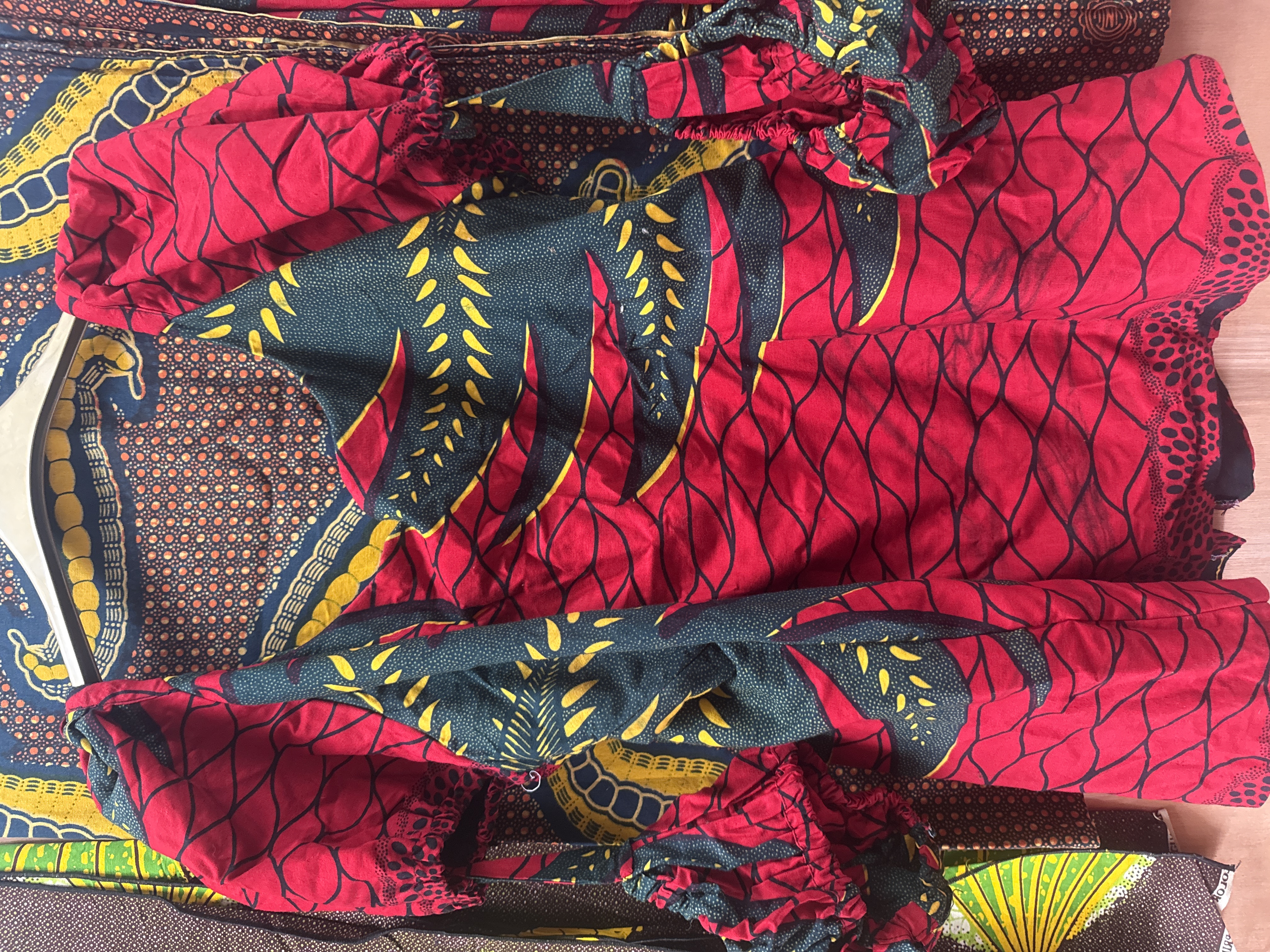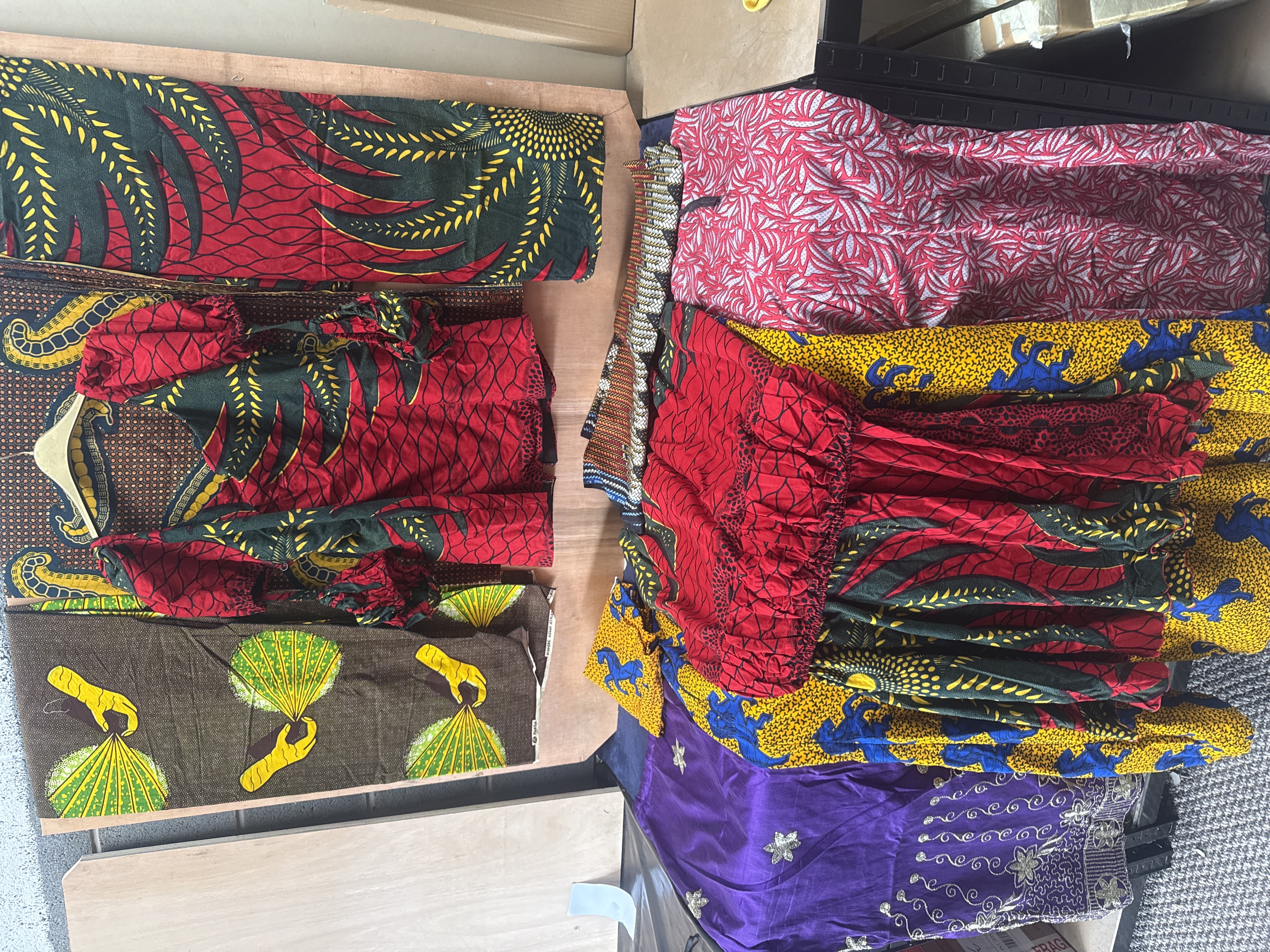 An assortment of garments and textiles featuring multicolored graphic patterns in the style of African wax prints. The collection includes one full outfit comprising a red and green patterned top with gathered, ruffled sleeves and a matching skirt. Also present are several skirts and multiple lengths of fabric featuring stylized botanical, fan, and animal motifs in hues of red, yellow, green, and blue. One length of purple fabric is decorated with silver-toned embroidered floral motifs and a decorative border. The materials are primarily cotton or cotton blends. Some fabric selvedges show partial printed markings including the words VERITABLE WAX. The patterns and construction are consistent with Ankara and Dashiki style apparel.