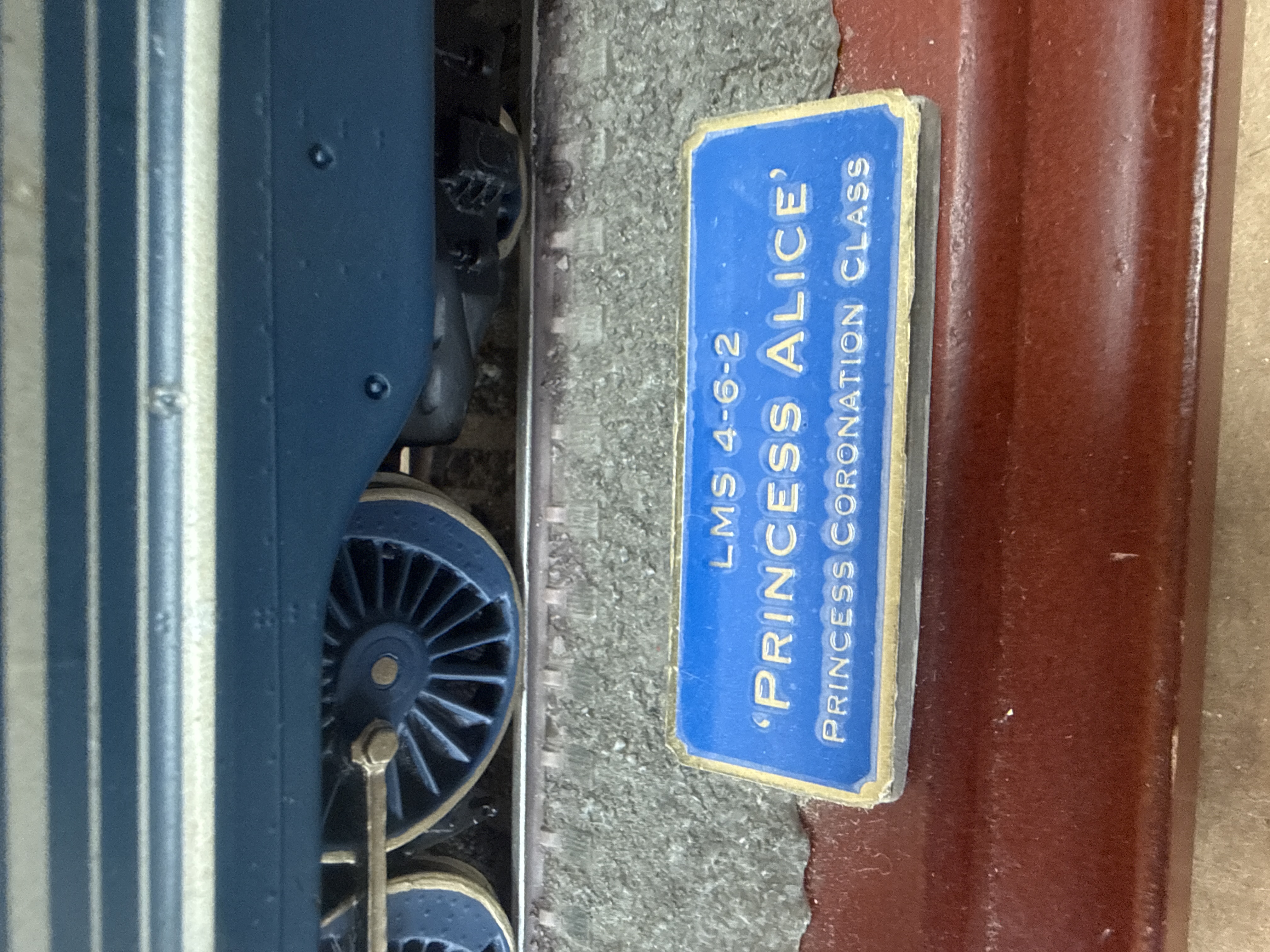 A Hornby static display model of a London, Midland and Scottish Railway (LMS) Princess Coronation Class 4-6-2 steam locomotive and tender, identified as No. 6223 Princess Alice. The model is finished in a blue streamlined livery with silver-tone horizontal striping. It features Princess Alice nameplates on the locomotive casing, the number 6223 on the cab sides, and L M S lettering on the tender sides. The locomotive and tender are mounted on a section of rail with a simulated ballast bed, which is secured to a 15 inch polished wood rectangular base. A blue and gold-tone descriptive plaque is fixed to the front of the base, reading LMS 4-6-2 PRINCESS ALICE PRINCESS CORONATION CLASS. The lot includes a cardboard shipping container.