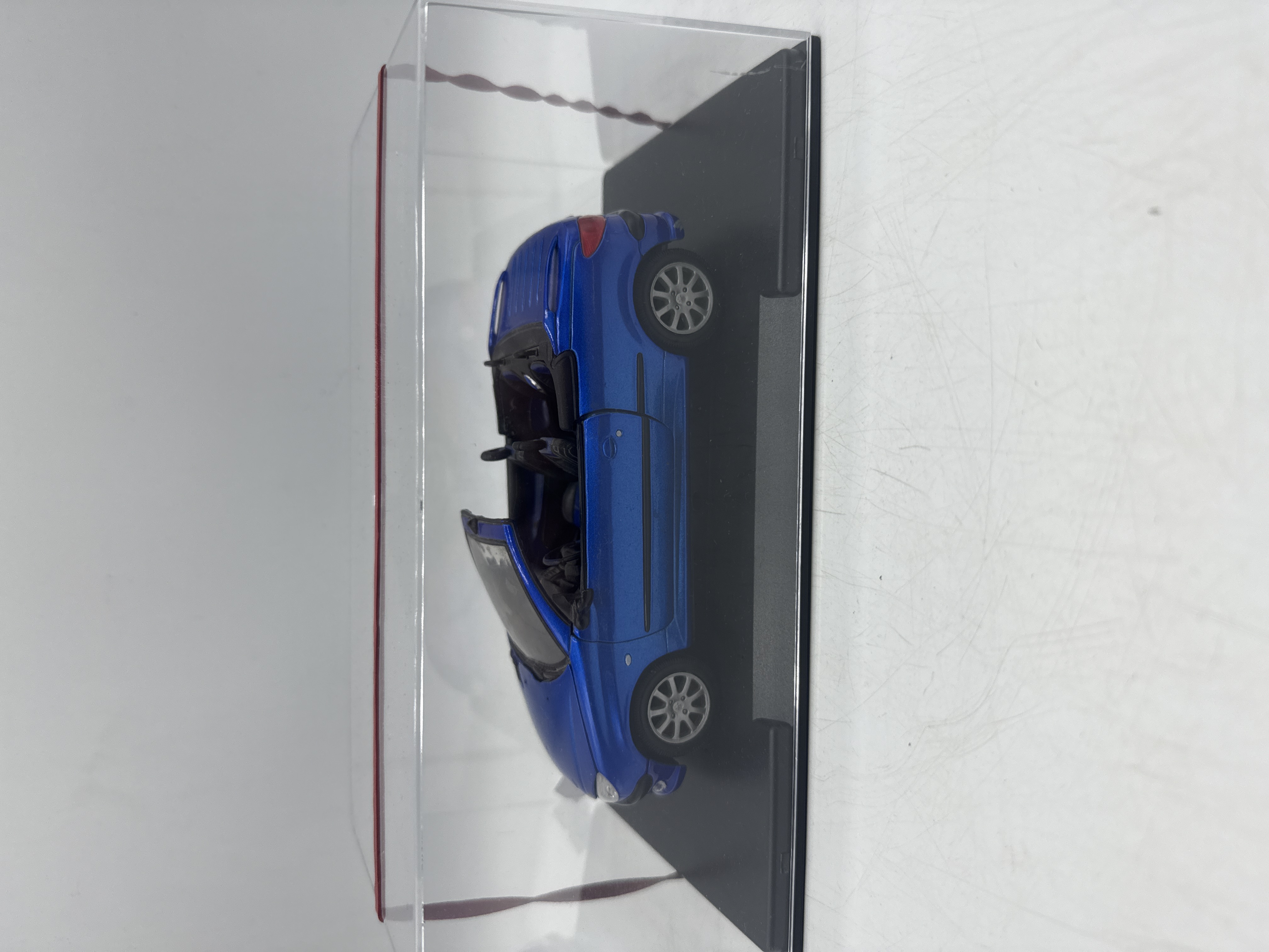A die-cast scale model of a Peugeot 206 CC convertible finished in metallic blue paintwork. The model features a detailed black interior with integrated roll hoops and a visible Peugeot lion emblem on the front grille. The vehicle is mounted on a black plinth and housed within a clear rectangular acrylic display case.