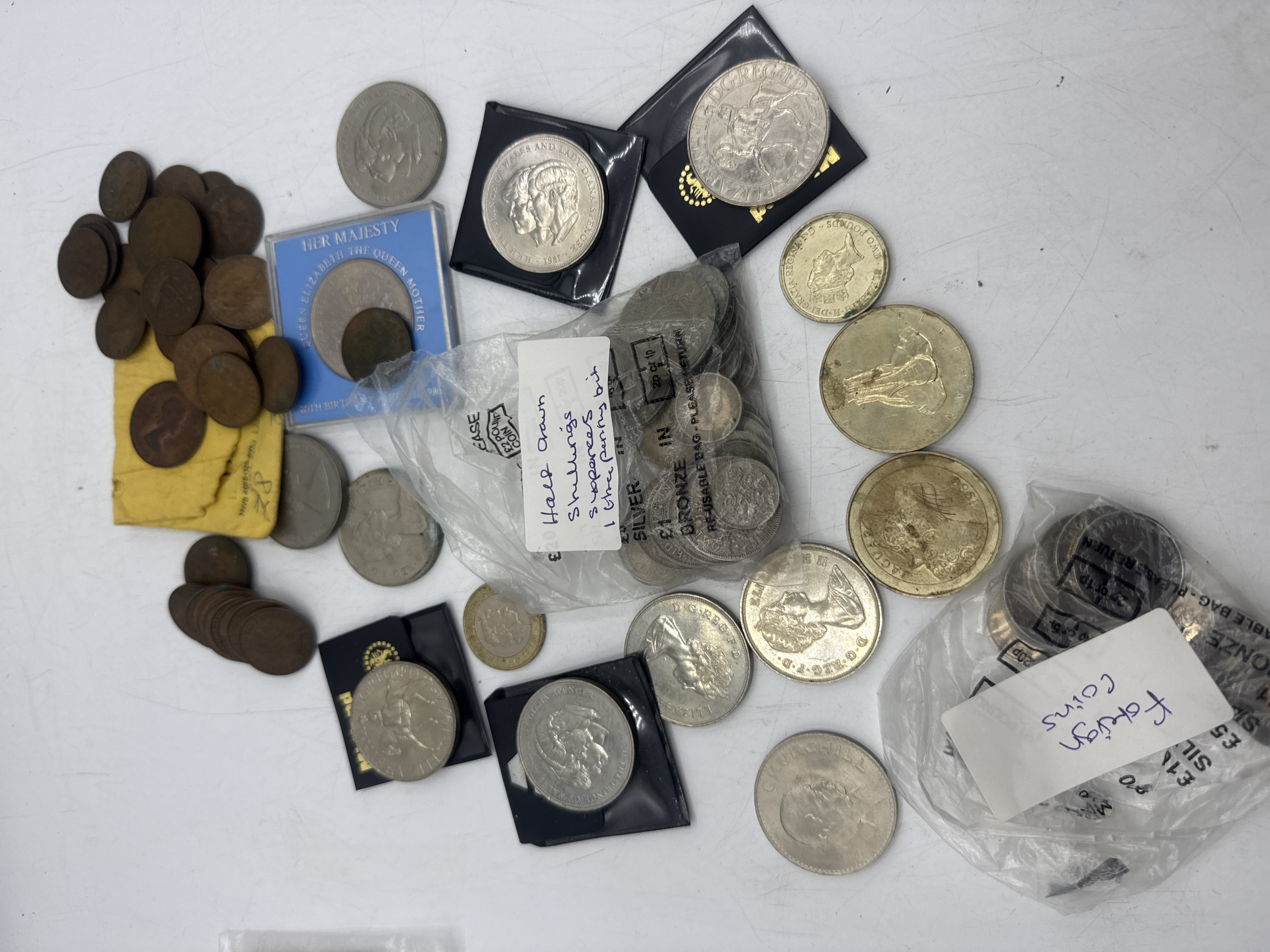 A collection of British and international coinage, featuring various 20th-century commemorative issues and circulated denominations. The group includes several commemorative crowns, notably the 1965 Winston Churchill issue and the 1981 Royal Wedding issue for the Prince of Wales and Lady Diana Spencer. Also present is a Queen Elizabeth the Queen Mother 80th birthday commemorative crown housed in a blue presentation folder. The lot contains loose cupro-nickel and bronze coins alongside two bagged groups with handwritten labels identifying them as Half Crowns, Shillings, Sixpences, and a Threepenny bit, and a separate bag of Foreign Coins. Materials consist of cupro-nickel, bronze, and copper.