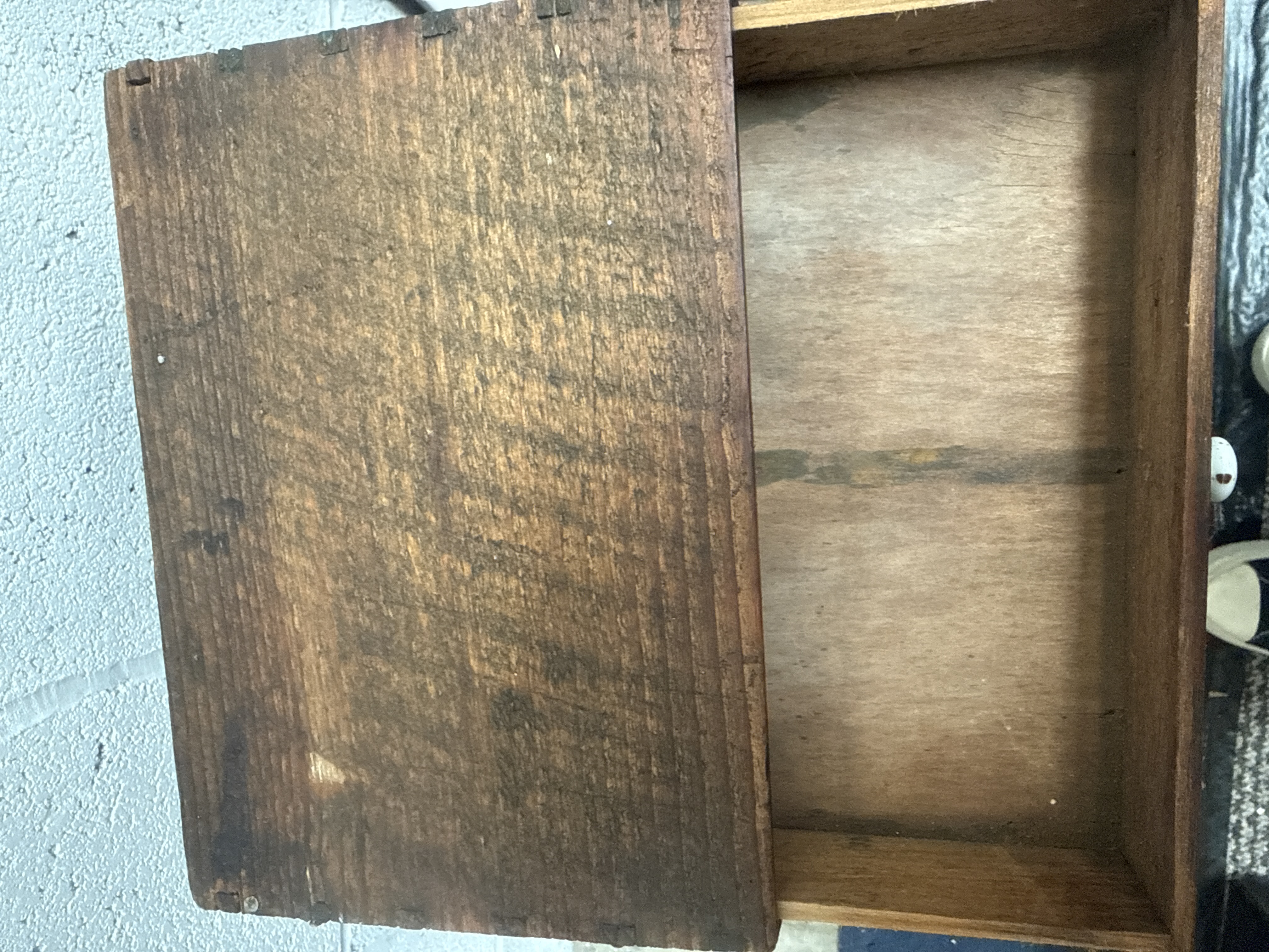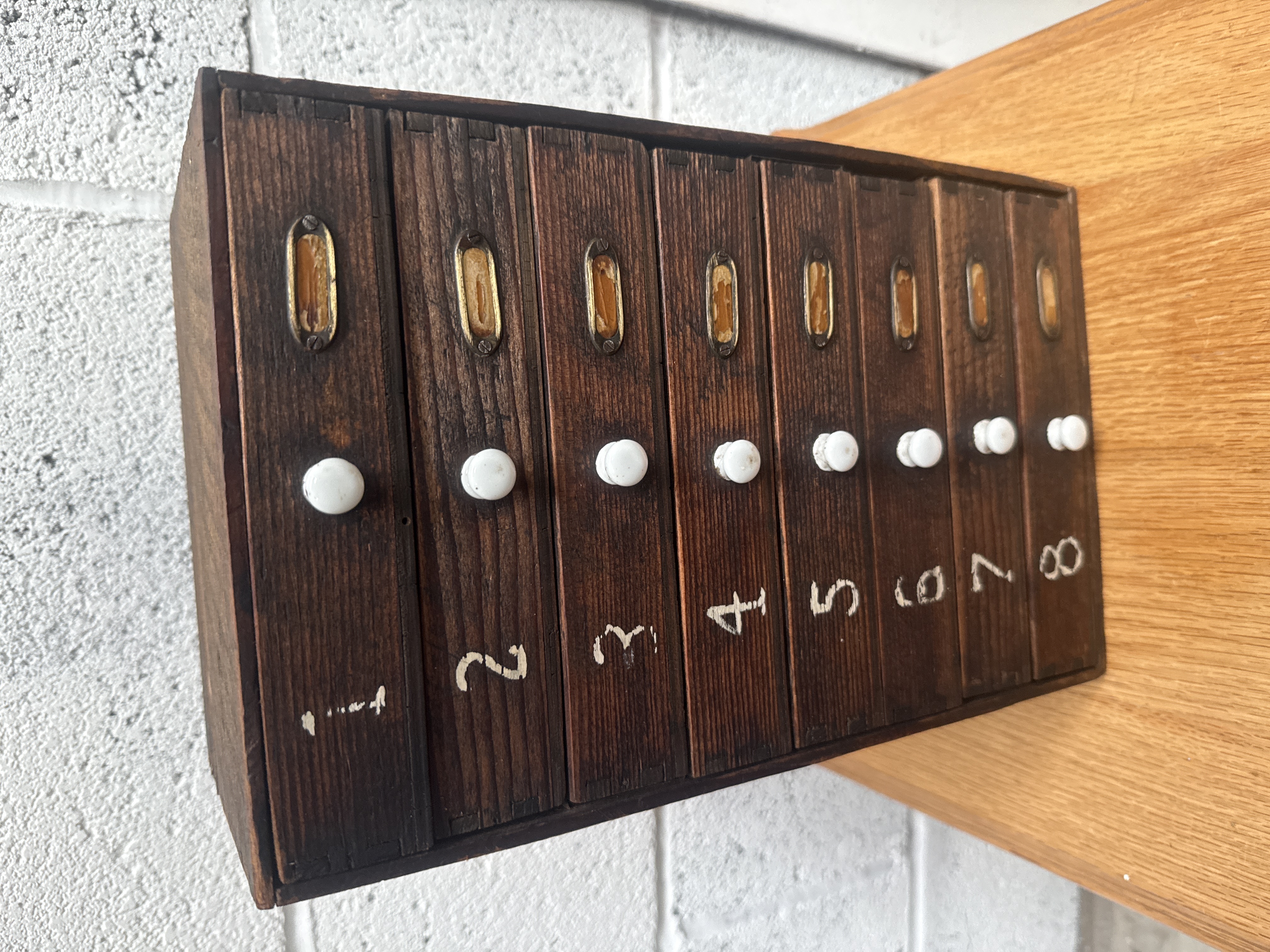 A vintage dark-stained wooden multi-drawer storage cabinet, featuring eight narrow vertical drawers. The piece is constructed with visible finger joints and features raw wood drawer interiors, suggesting a utilitarian or workshop origin. Each drawer front is fitted with a white ceramic pull knob and a brass-toned metal label holder, with some retaining aged inserts. The drawers are marked with hand-painted white numerals from one to eight. The design is consistent with traditional spice or apothecary cabinetry.