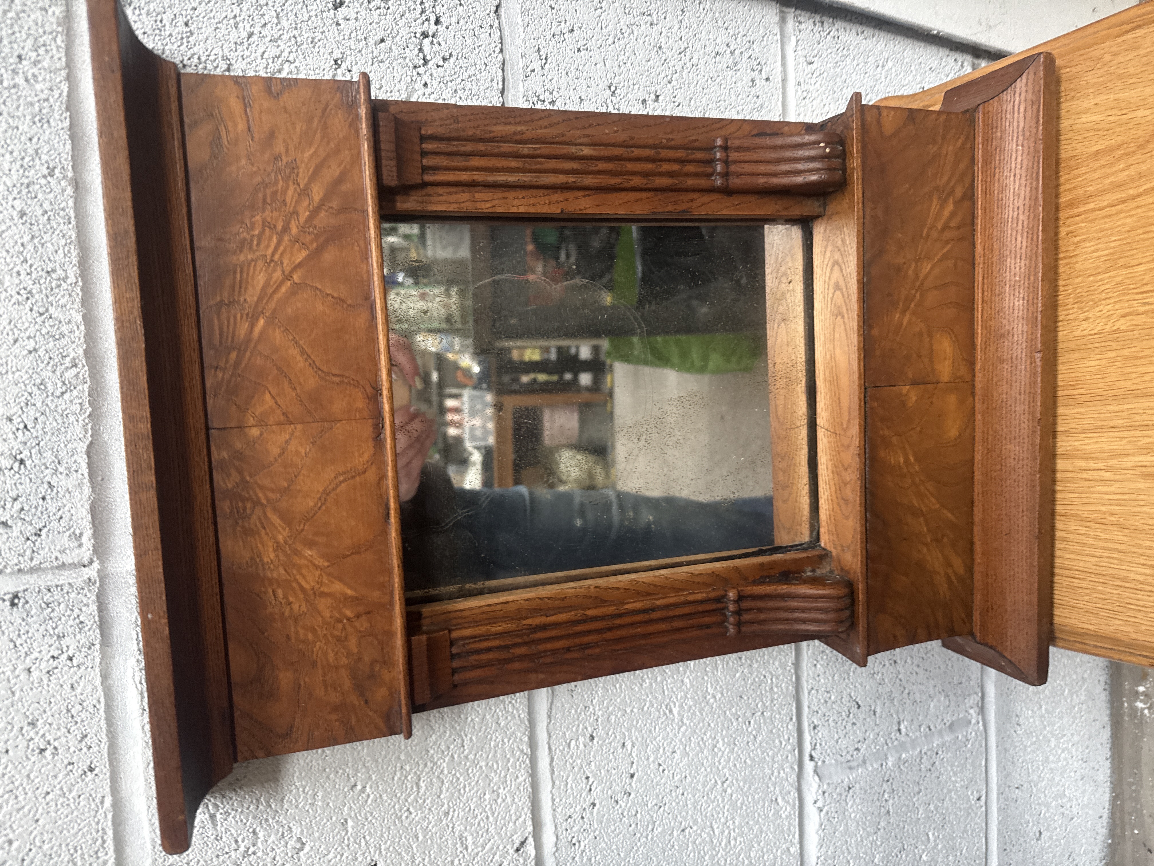 A French Art Deco oak shaving cabinet mirror, dating to the early 20th century. The architectural frame is constructed from quarter-sawn oak and features a central rectangular mirror plate. The design is characterised by wide, flat flanking panels and horizontal reeded mouldings at the top and bottom, punctuated by rounded decorative end blocks.