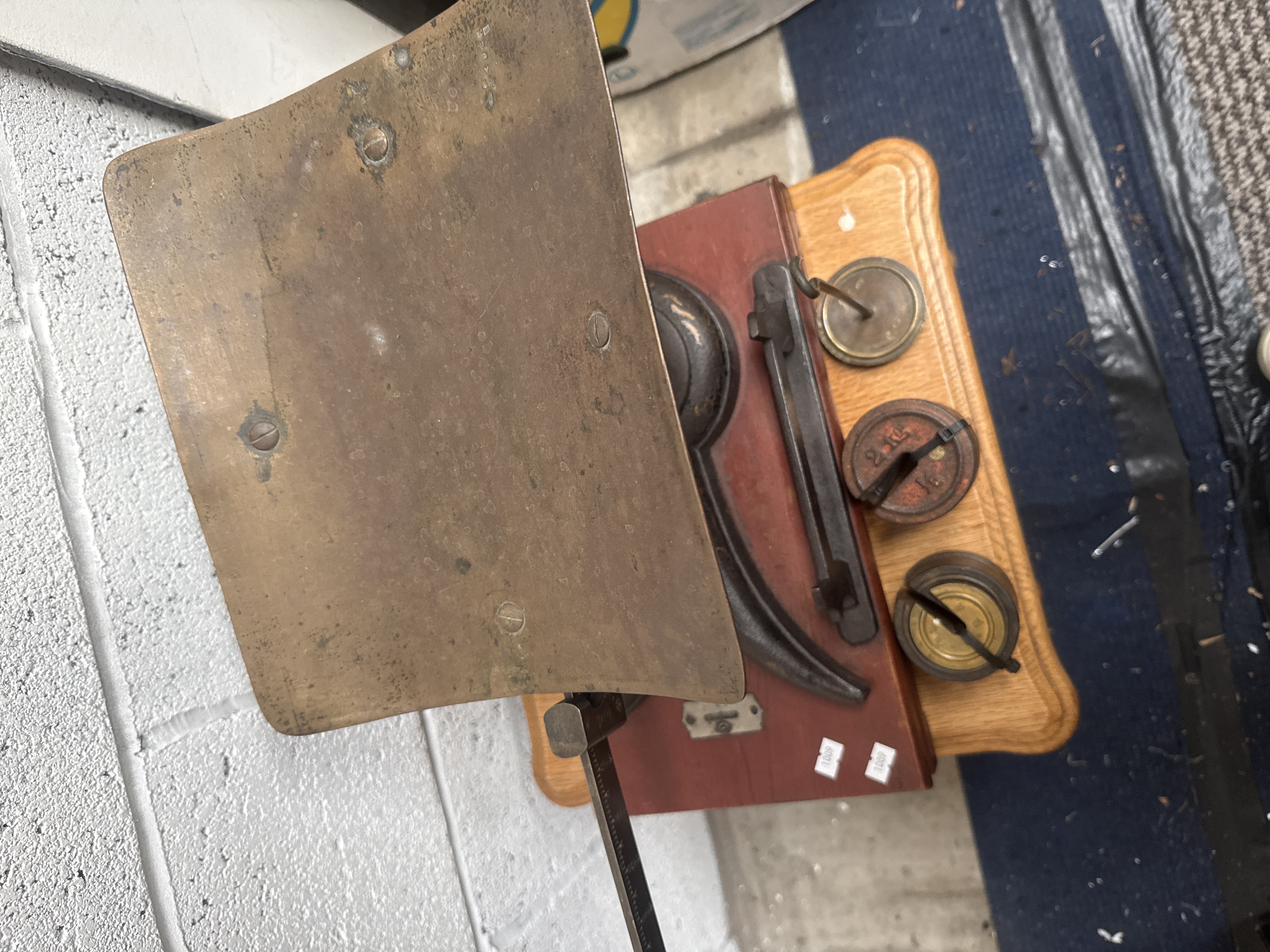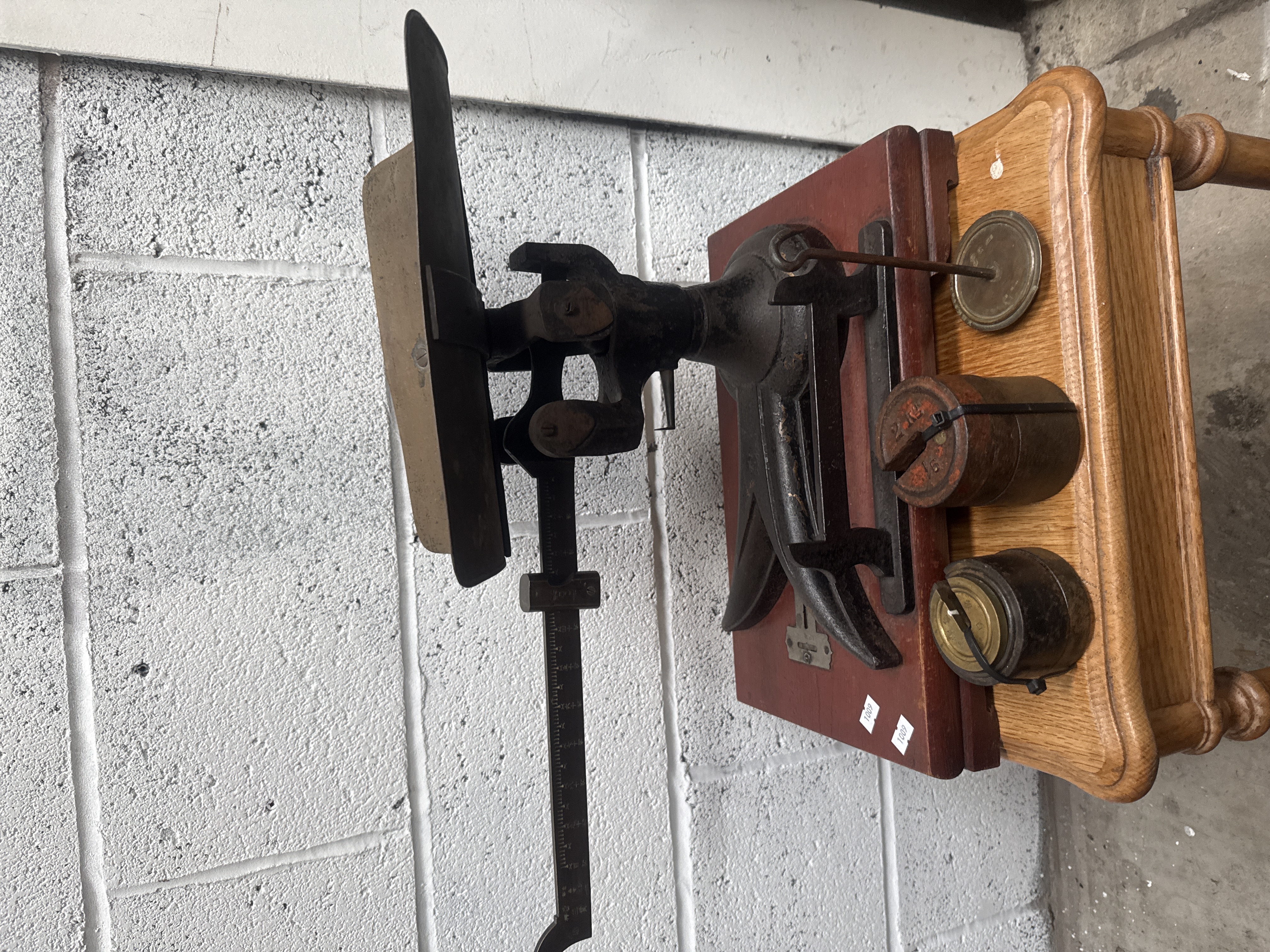 An antique balance scale by S. Mordan and Co., London. The apparatus is constructed with a black-painted cast iron mechanism mounted on a two-tiered wooden base, featuring a shaped light wood top and a rectangular dark-stained lower platform. The scale includes a rectangular brass weighing platform and a vertical graduated beam for measurement. Accompanying the scale is a collection of weights, with markings including 2 kg visible on one.