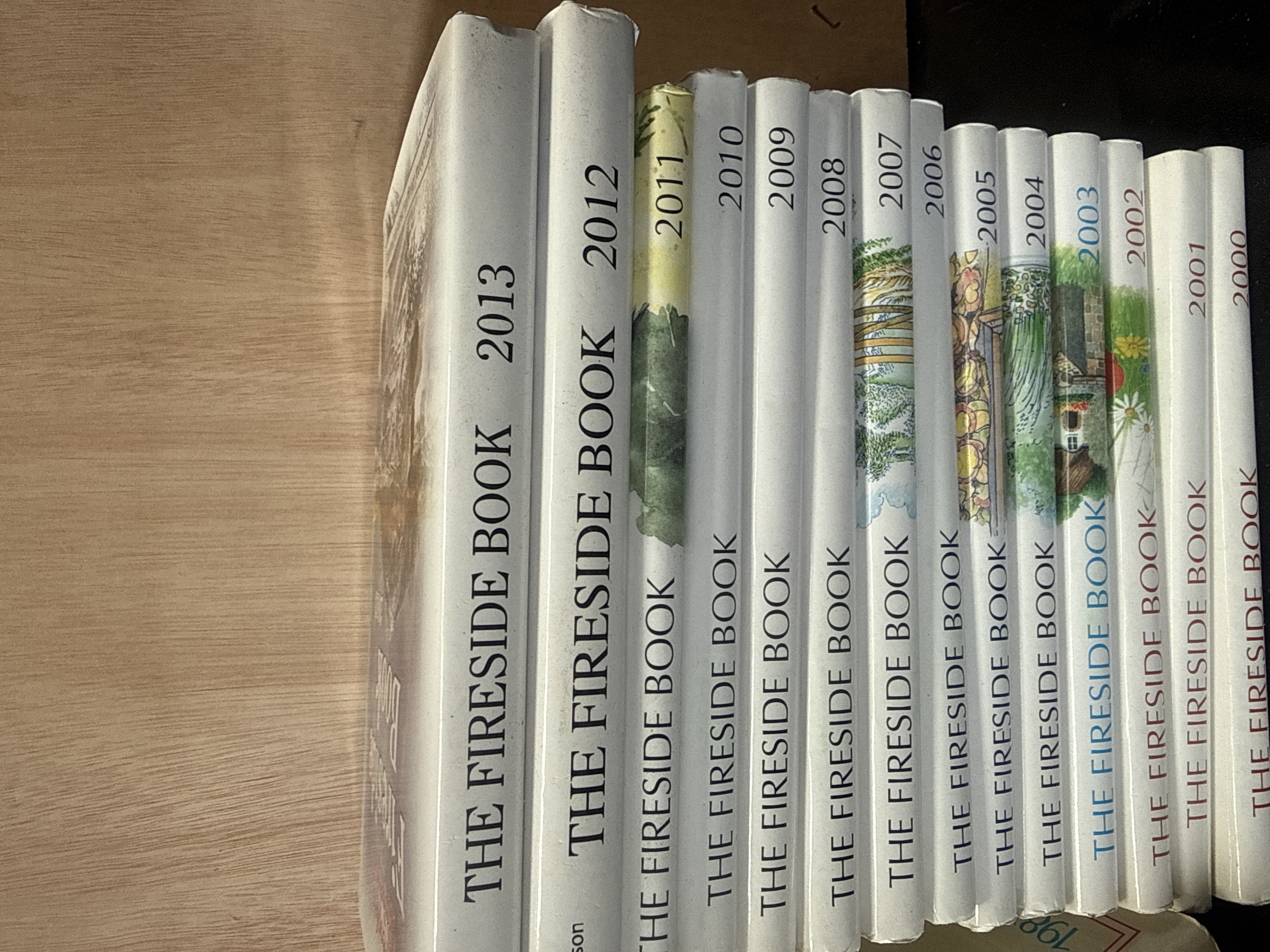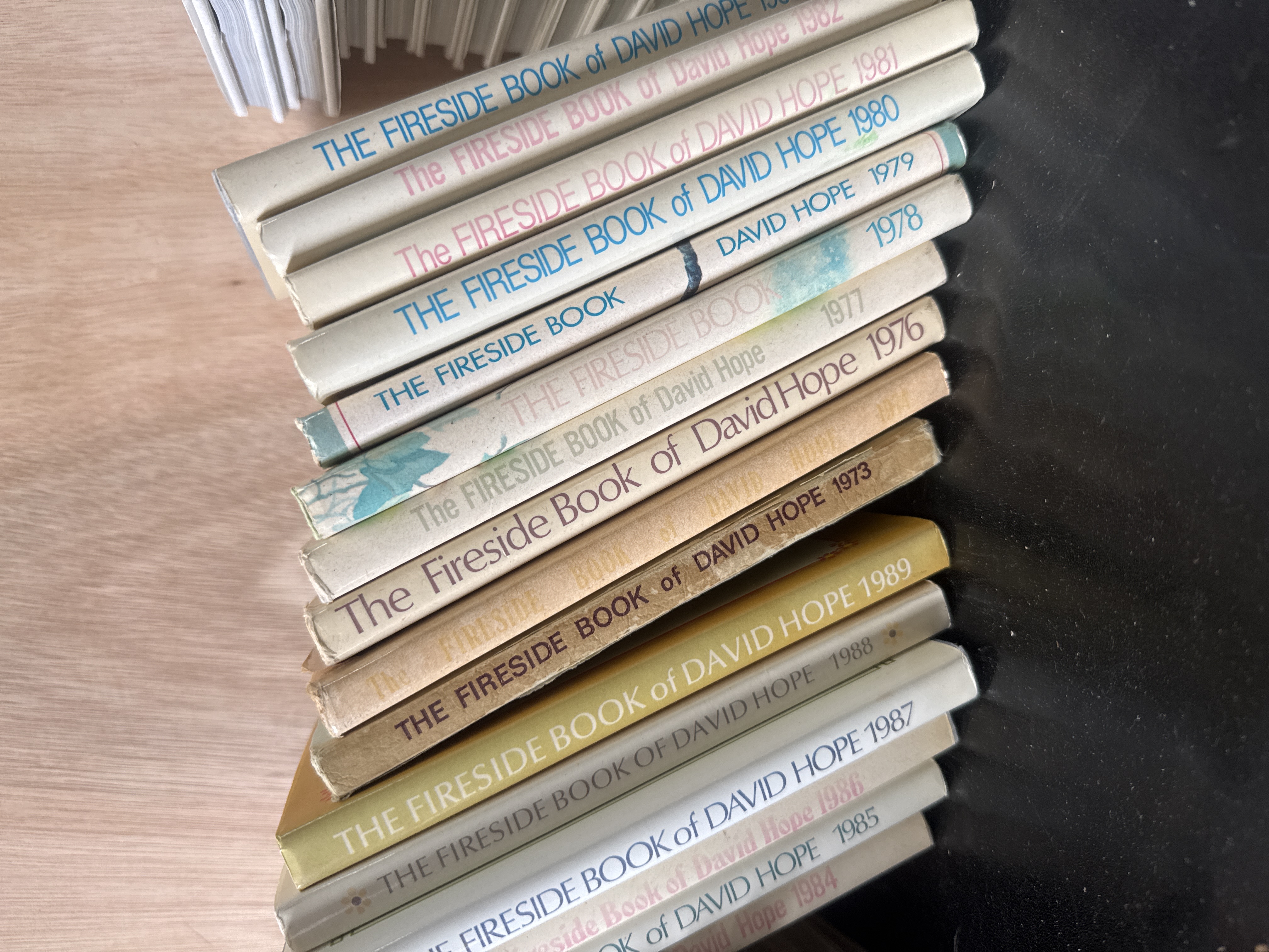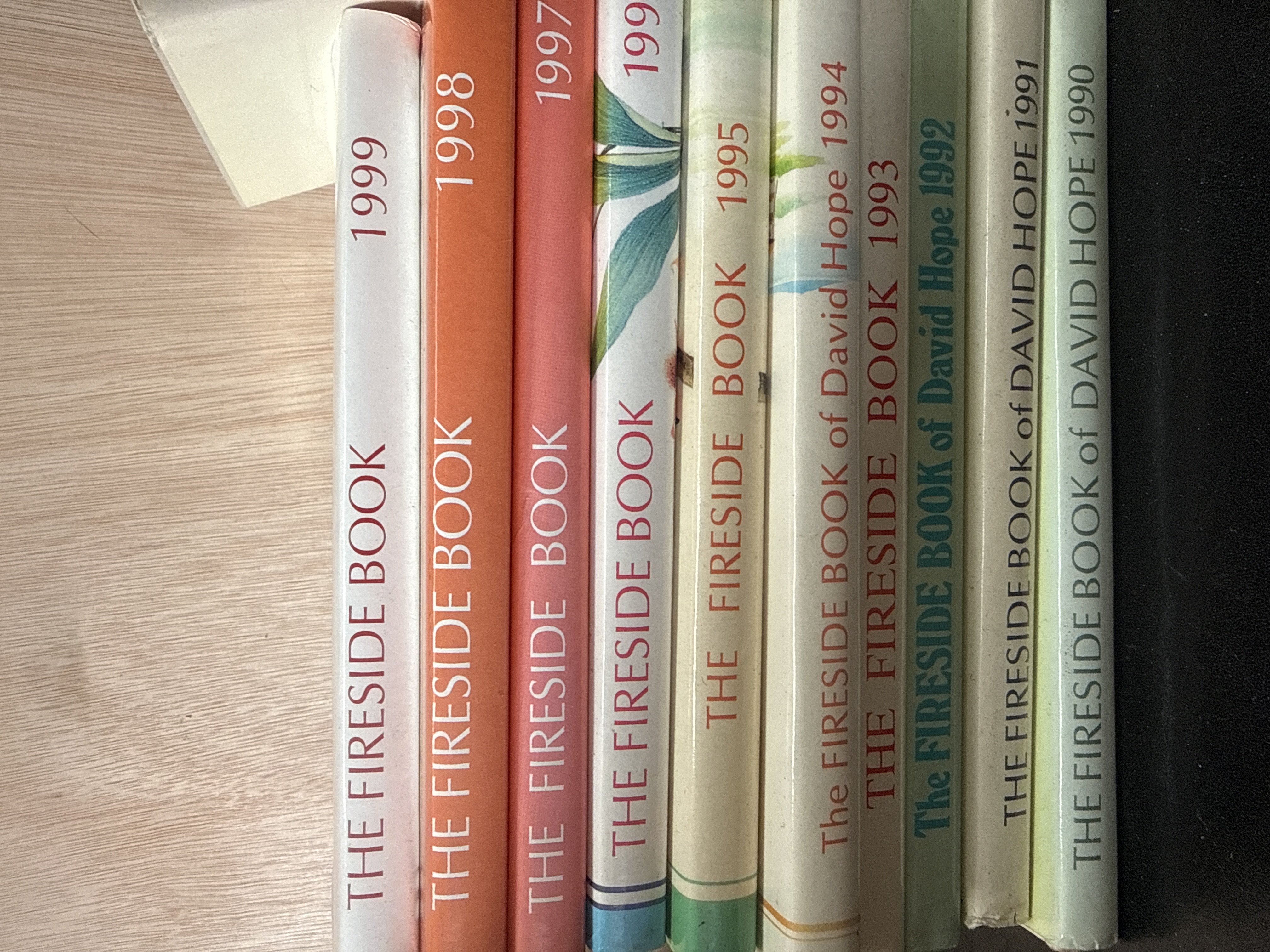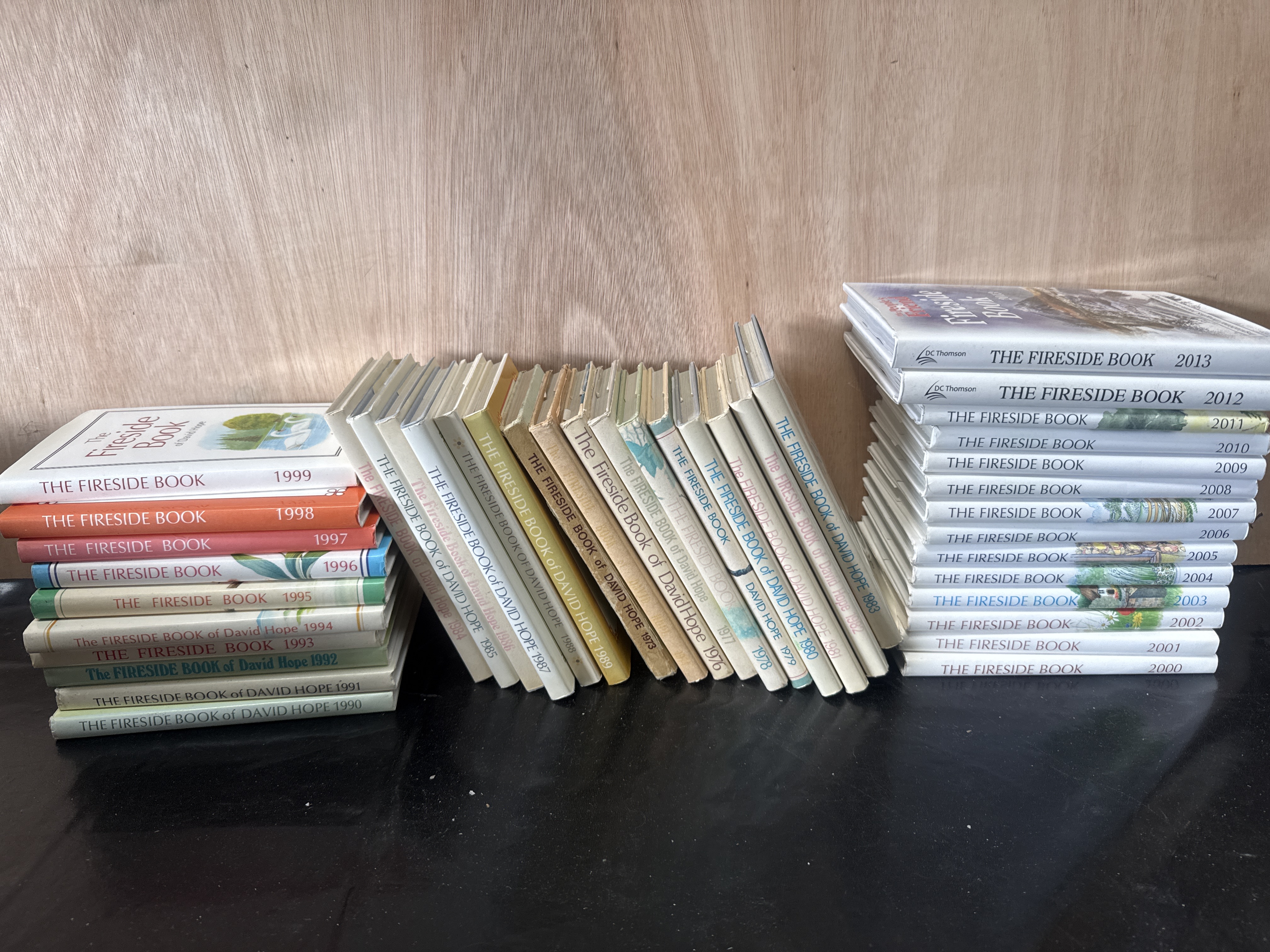 A collection of annual volumes titled The Fireside Book and The Fireside Book of David Hope, published by D.C. Thomson. The group contains a sequence of editions with publication dates spanning from 1973 to 2013. These volumes are primarily slim hardcovers or stiff card-bound books, each featuring a titled spine with the specific year of issue. The books are illustrated and contain a compilation of poetry, prose, and artwork. The earlier editions from the 1970s and 1980s feature varied spine colours including tan, cream, and blue, while the later editions from the 1990s onwards show a more standardised white or brightly coloured spine design.