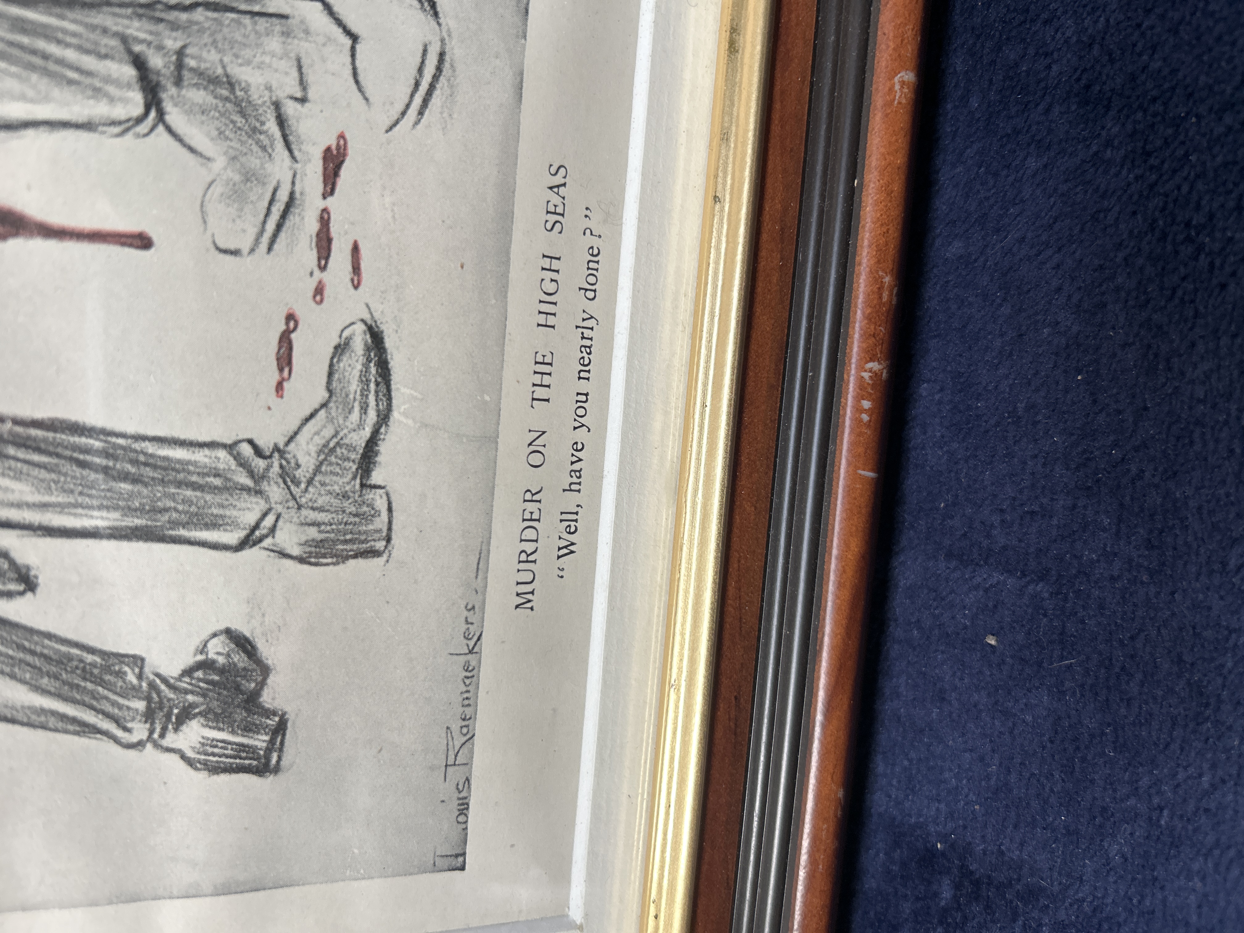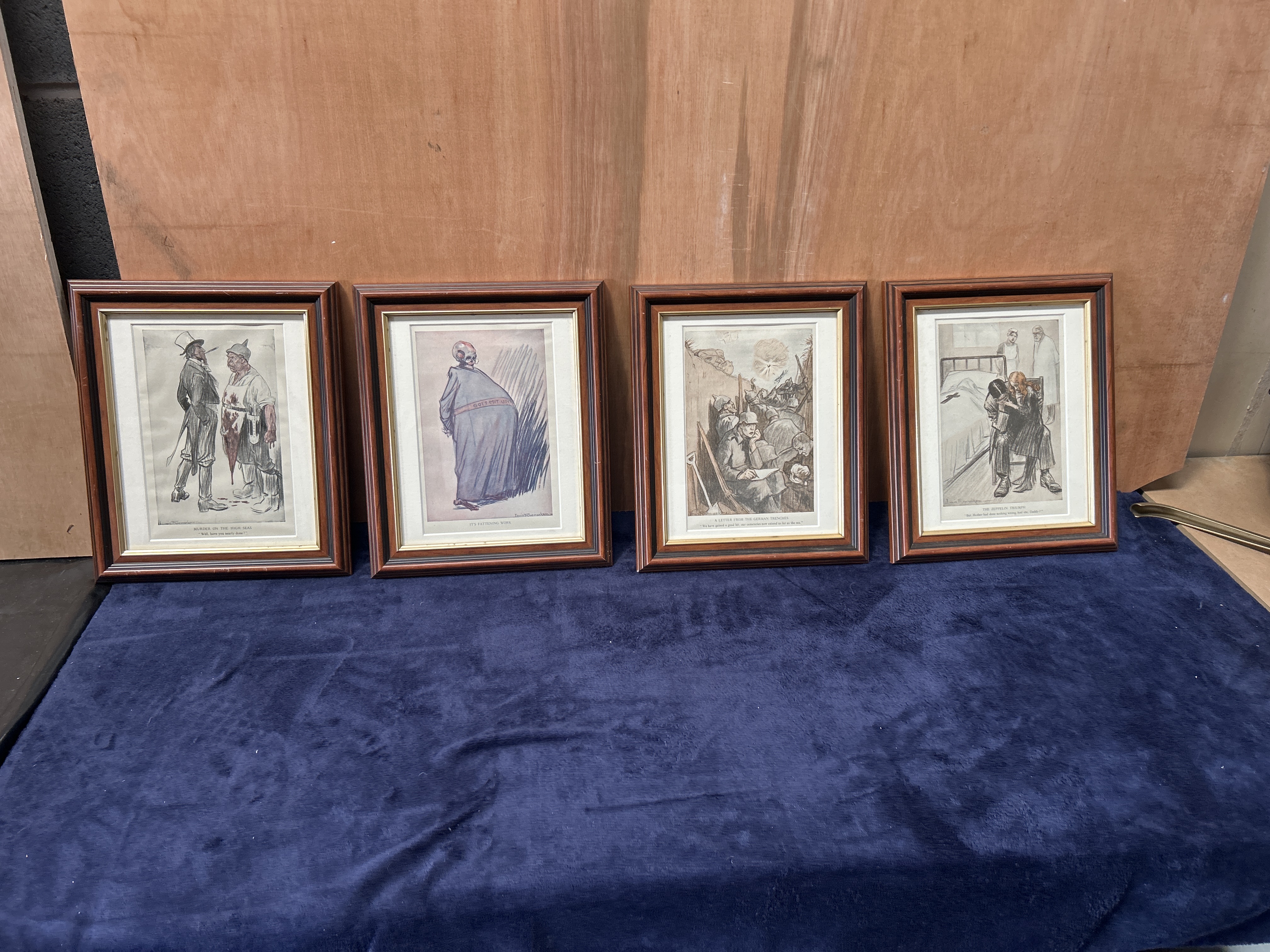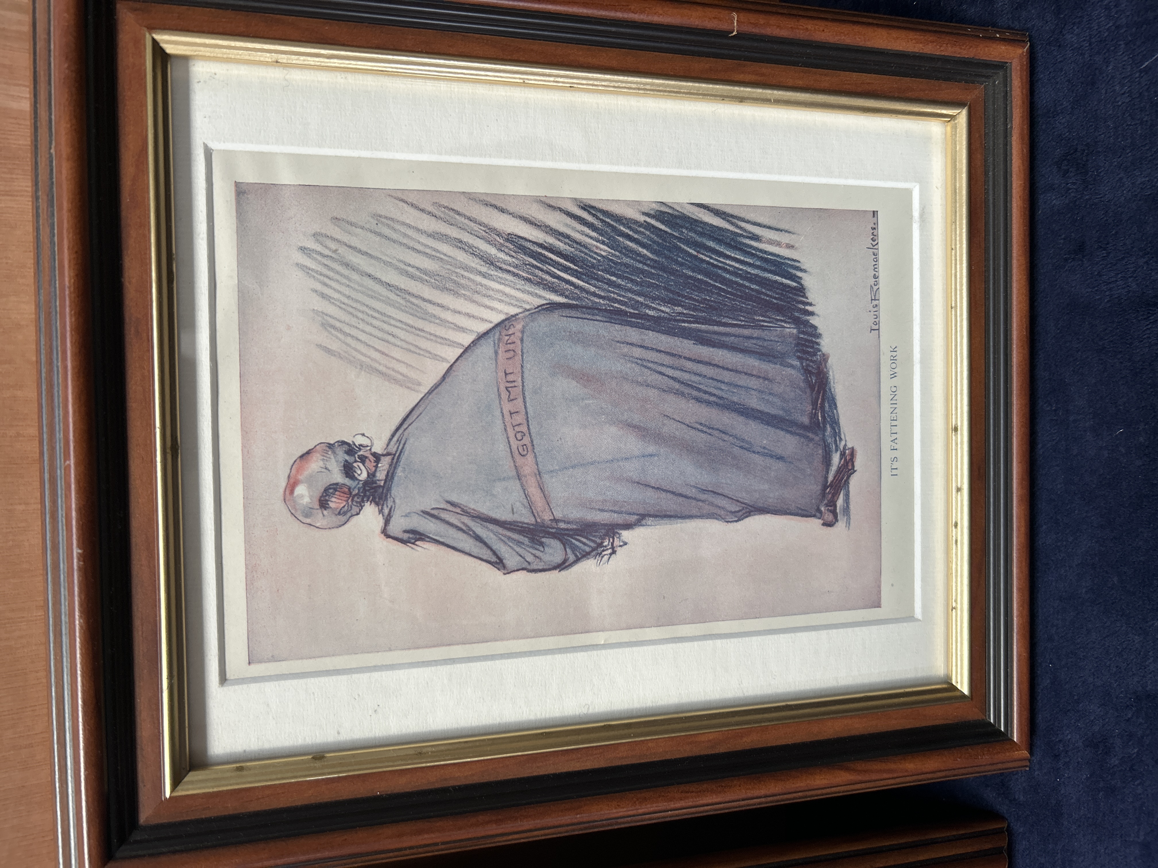 A collection of satirical prints by the Dutch artist Louis Raemaekers, depicting various scenes and propaganda themes from the First World War. The collection includes works with printed titles and captions such as Murder on the High Seas, It is Fattening Work, A Letter from the German Trenches, and The Zeppelin Triumph. One illustration features a skeletal figure wearing a belt inscribed with the German phrase Gott Mit Uns. Each piece bears a printed signature from the artist. The prints are presented in matching dark wood frames with gilt accents and cream-coloured mats.