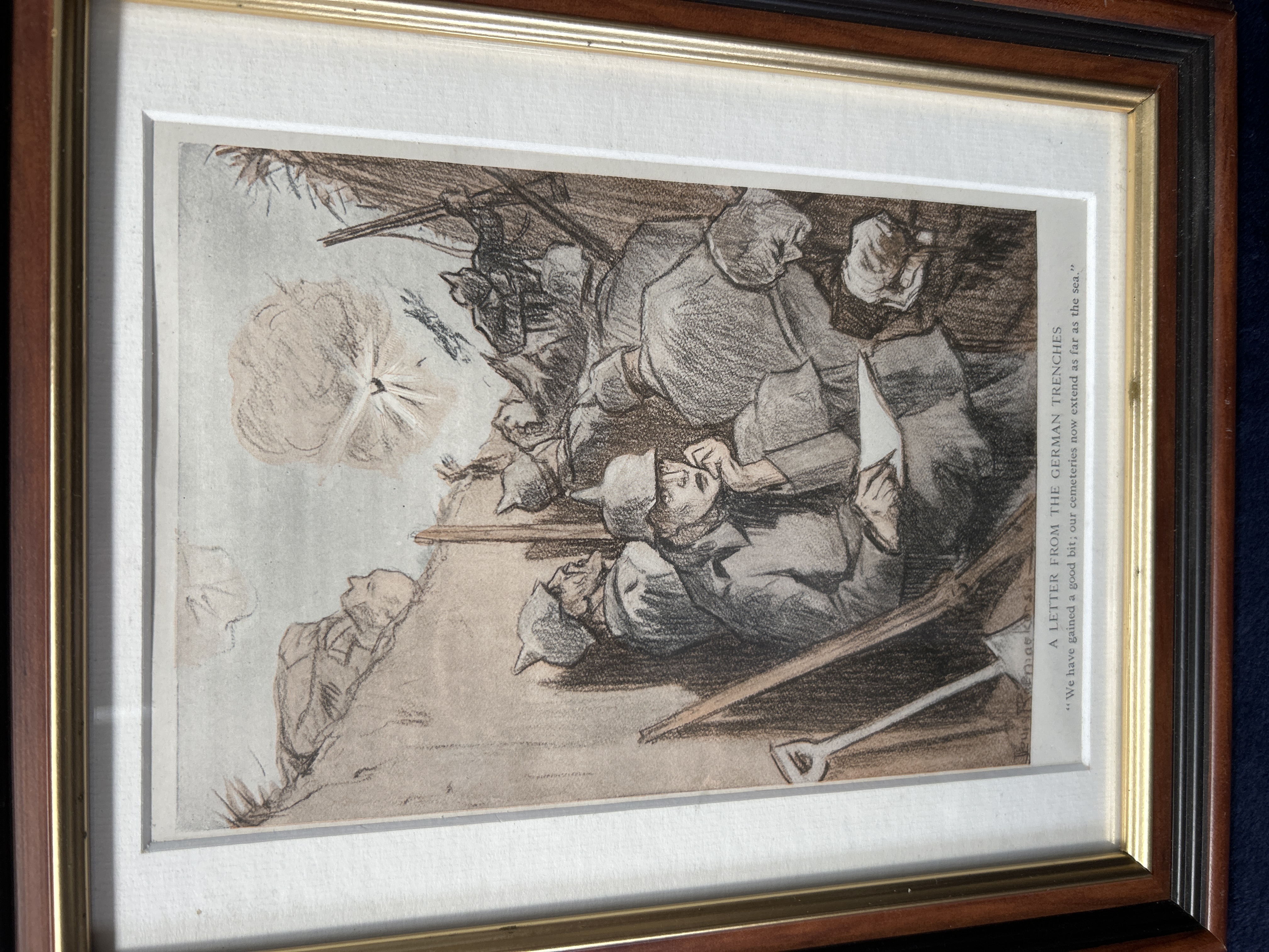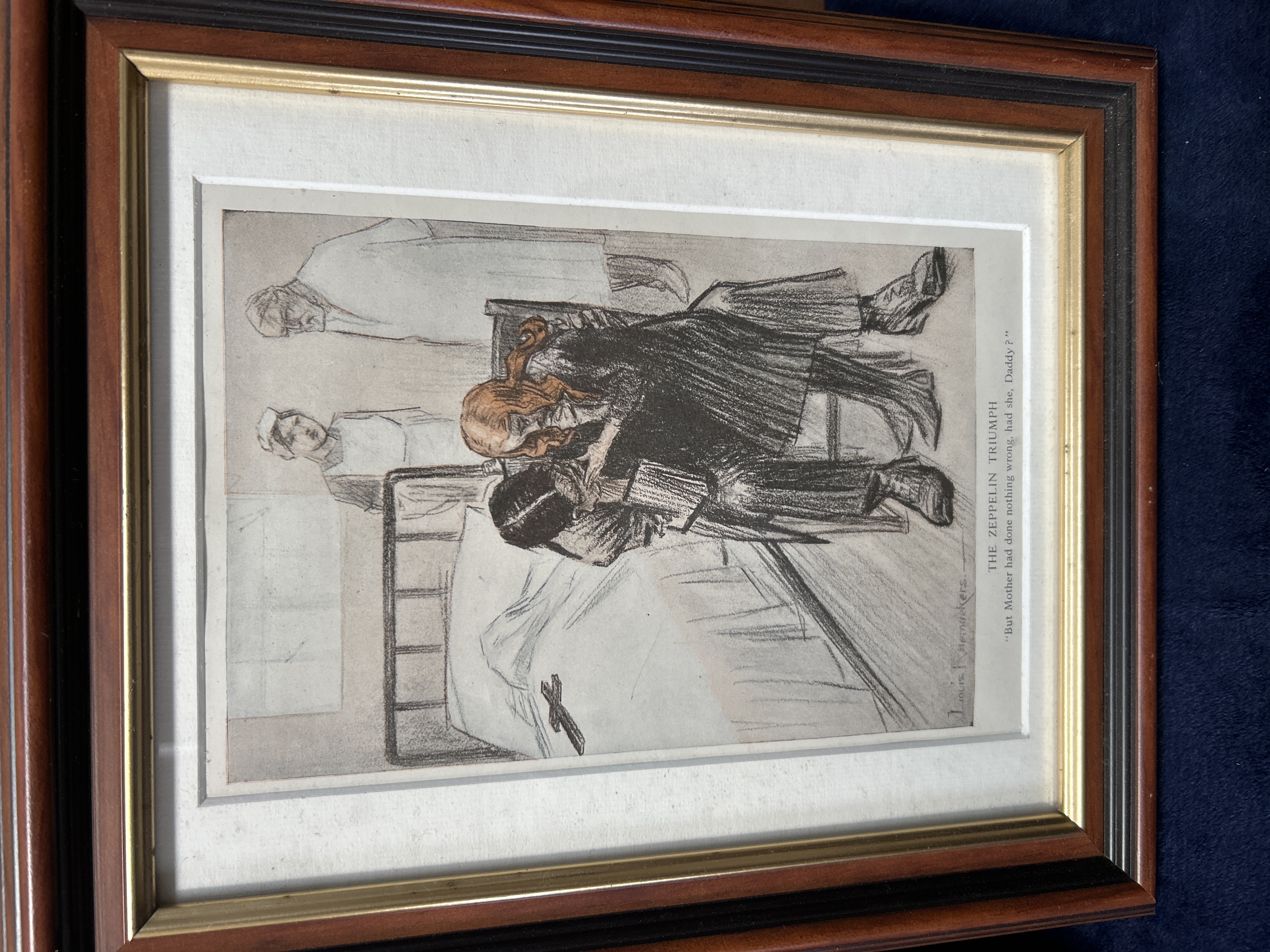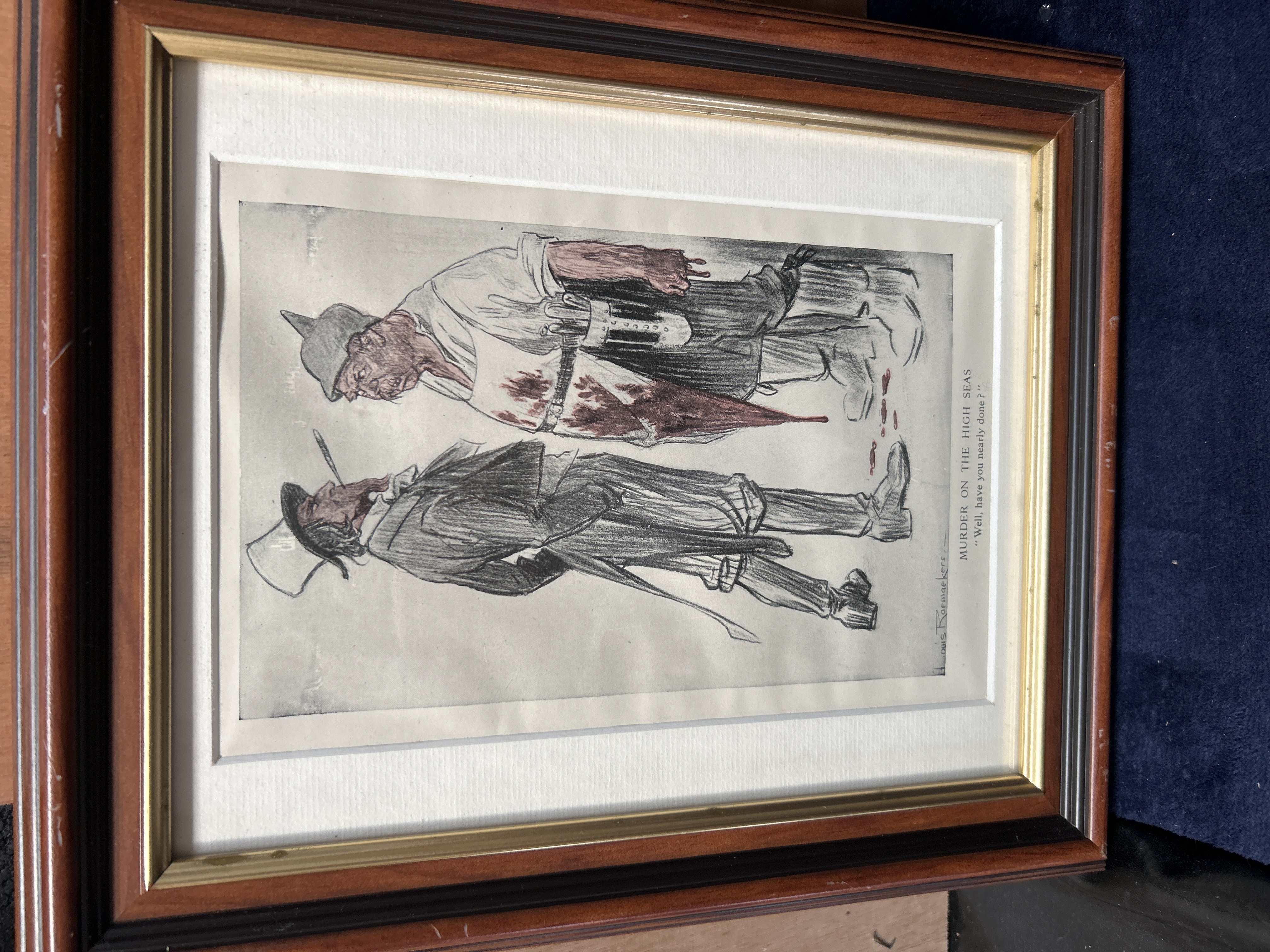 A collection of satirical prints by the Dutch artist Louis Raemaekers, depicting various scenes and propaganda themes from the First World War. The collection includes works with printed titles and captions such as Murder on the High Seas, It is Fattening Work, A Letter from the German Trenches, and The Zeppelin Triumph. One illustration features a skeletal figure wearing a belt inscribed with the German phrase Gott Mit Uns. Each piece bears a printed signature from the artist. The prints are presented in matching dark wood frames with gilt accents and cream-coloured mats.