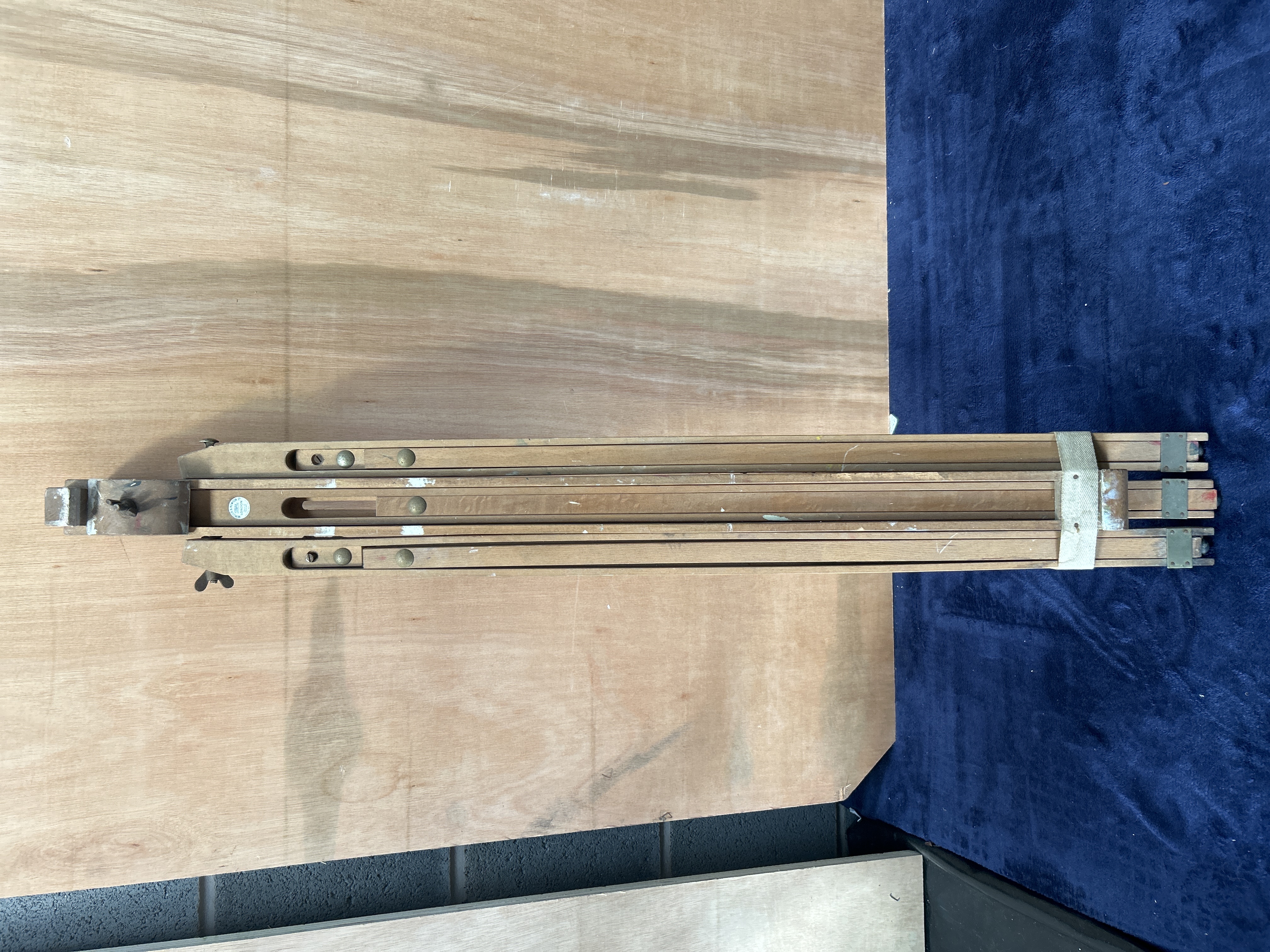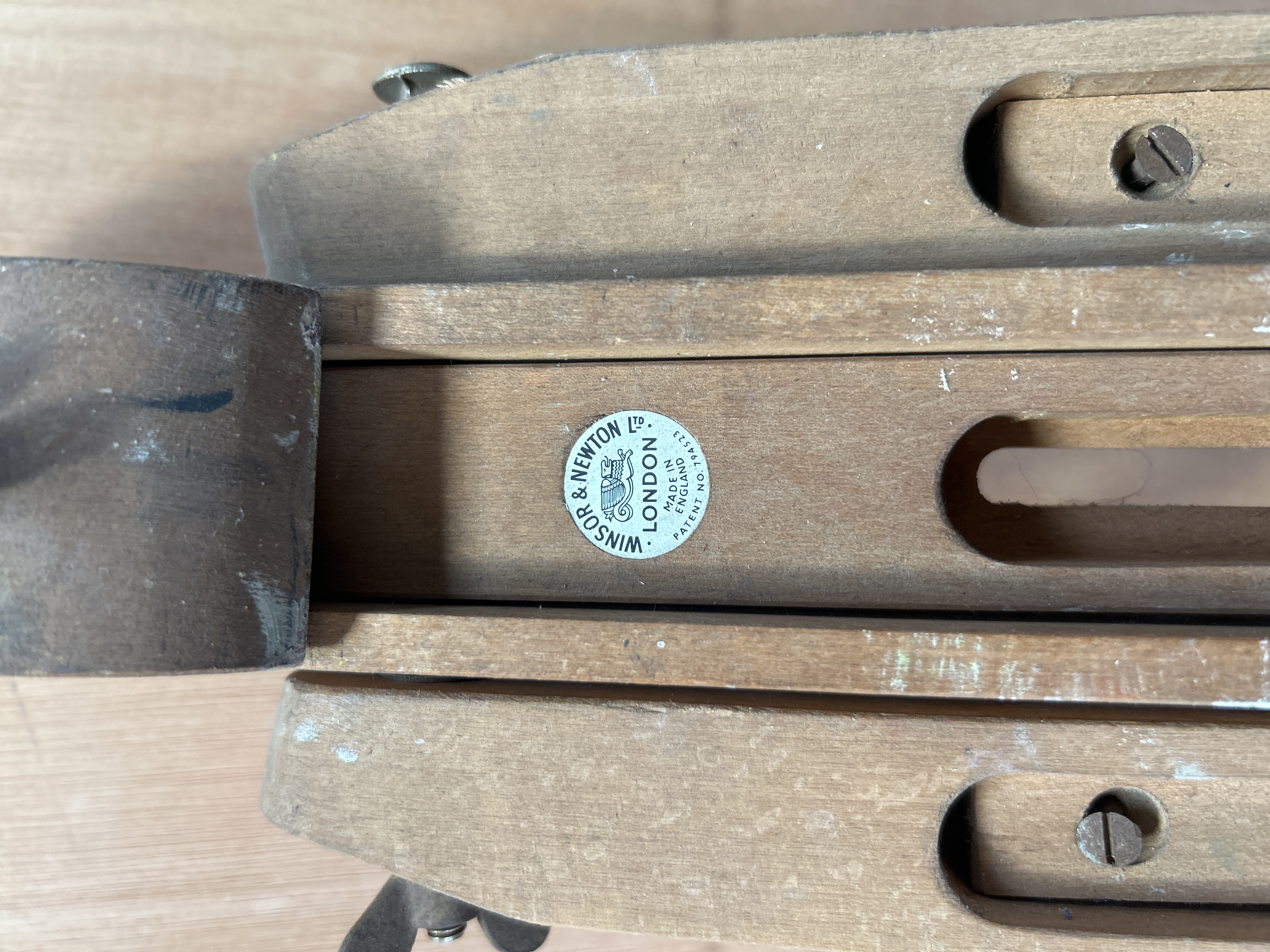 A vintage folding wooden artist’s field tripod manufactured by Winsor & Newton Ltd., London. The piece is constructed from light-coloured hardwood and features a telescoping three-leg design characteristic of mid-20th-century portable studio equipment. The unit incorporates metal hardware including wingnuts and rivets, and is secured for transport by a canvas binding strap. A circular manufacturer’s label is affixed to the frame, identifying the maker and including the text MADE IN ENGLAND and PATENT NO. 794523.