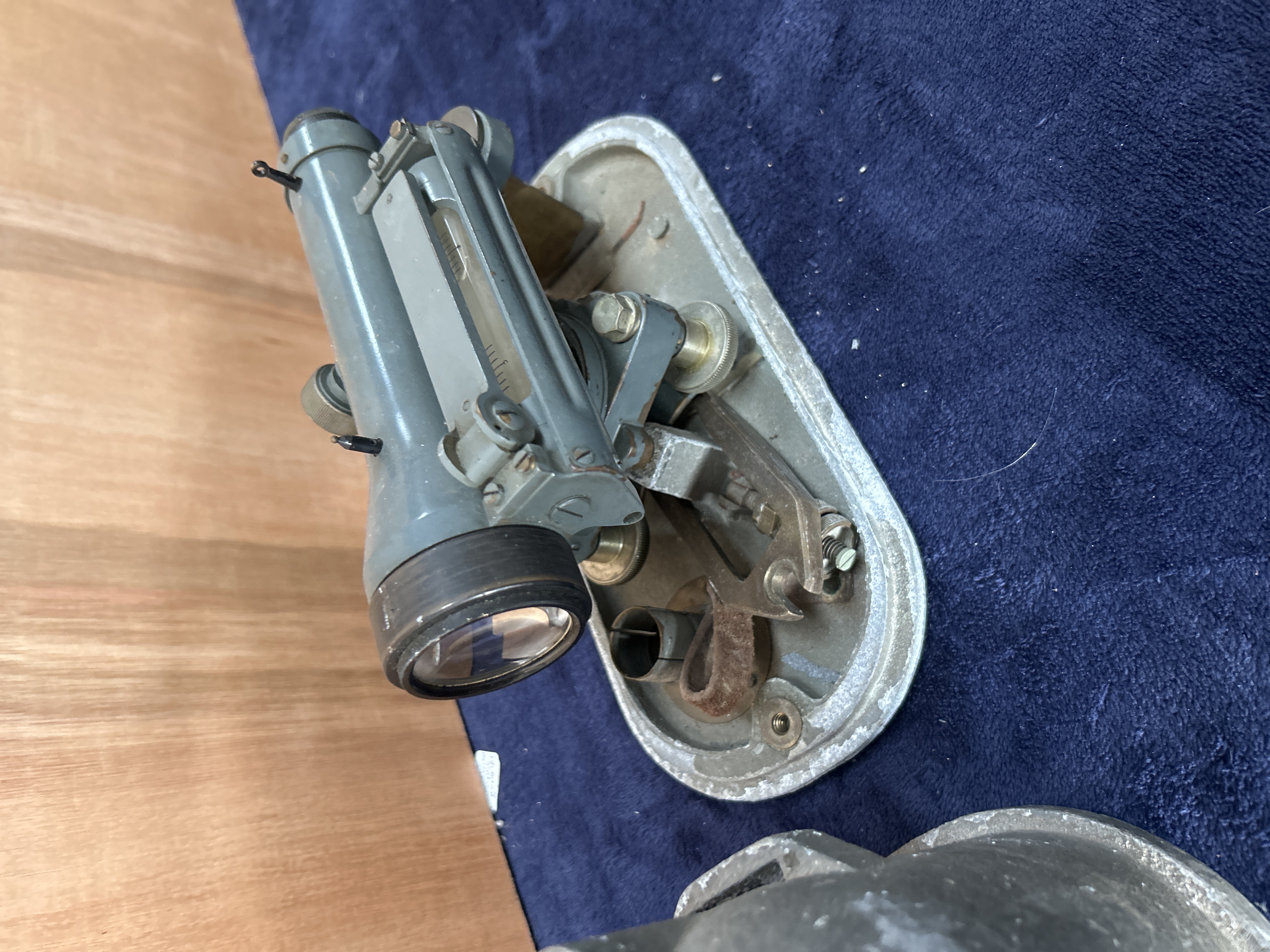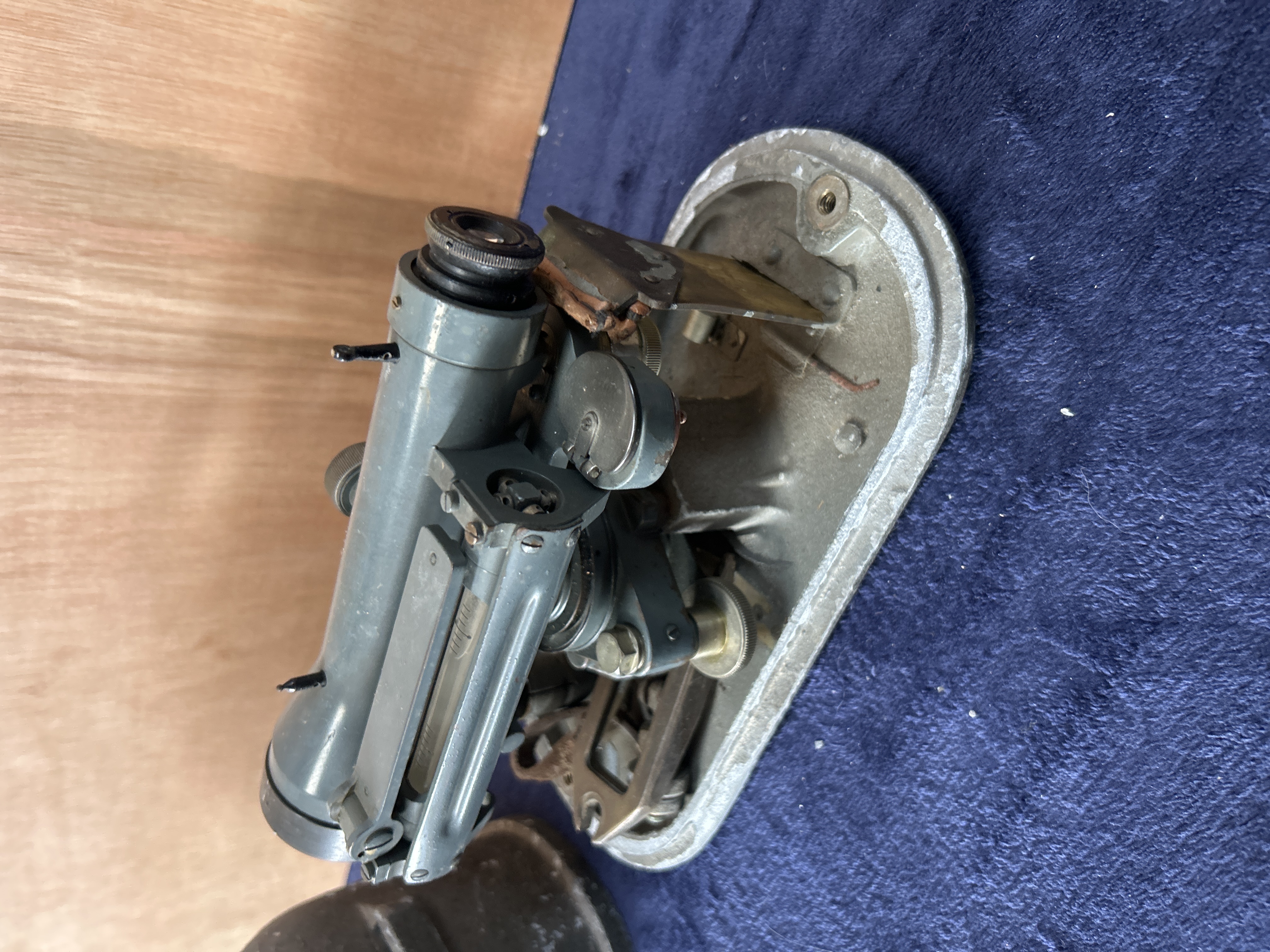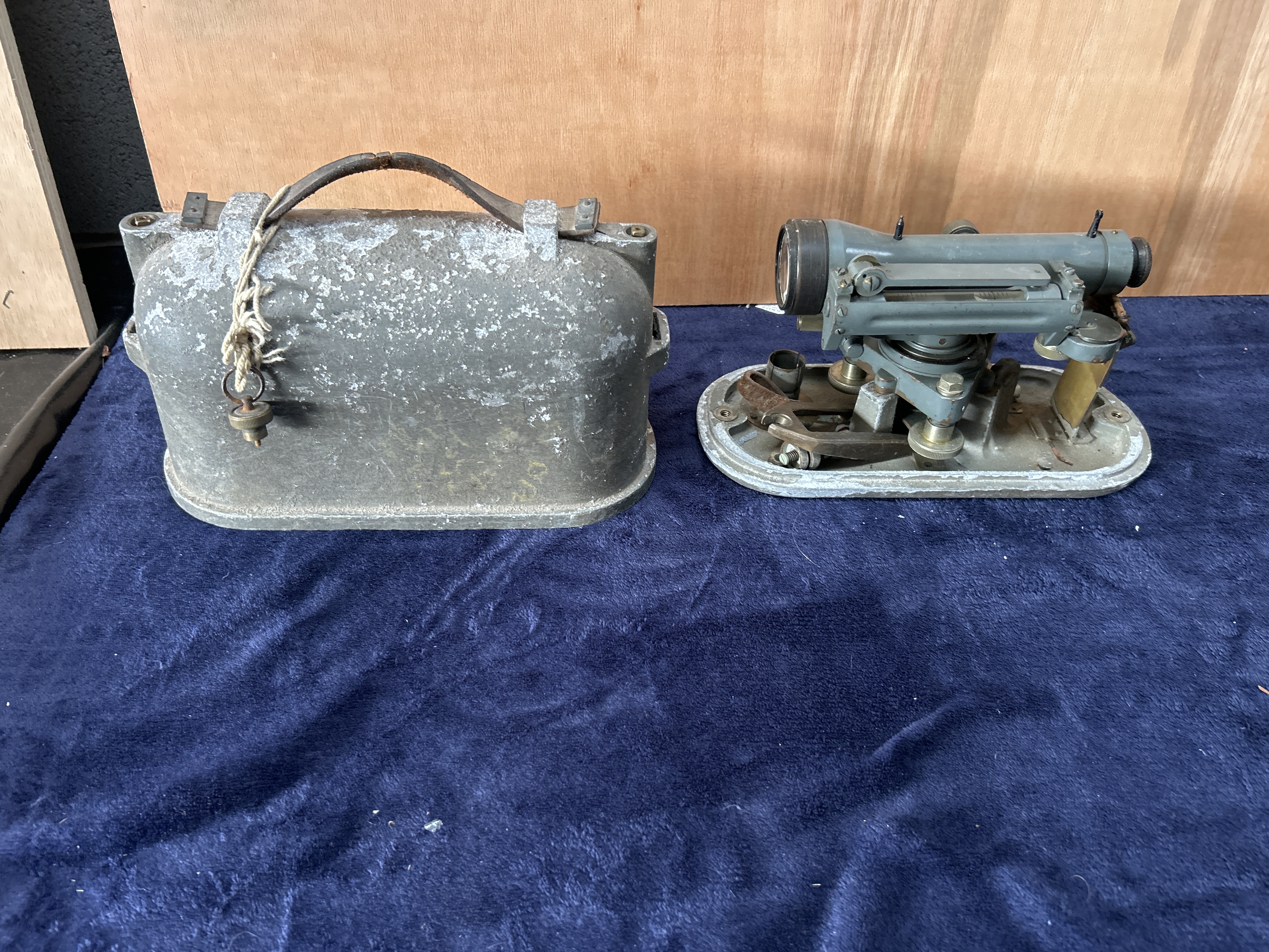 A vintage surveyors level by Cooke, Troughton & Simms Ltd. of York, England. The instrument features a grey-painted metal body with integrated spirit levels, adjustable brass knobs, and glass optics. It is mounted upon a corresponding metal base plate. The body is inscribed with the maker name, location, patent number 242468, and serial number S036555. The lot includes a heavy-duty cast metal carrying case fitted with a leather top handle and an attached plumb bob.
