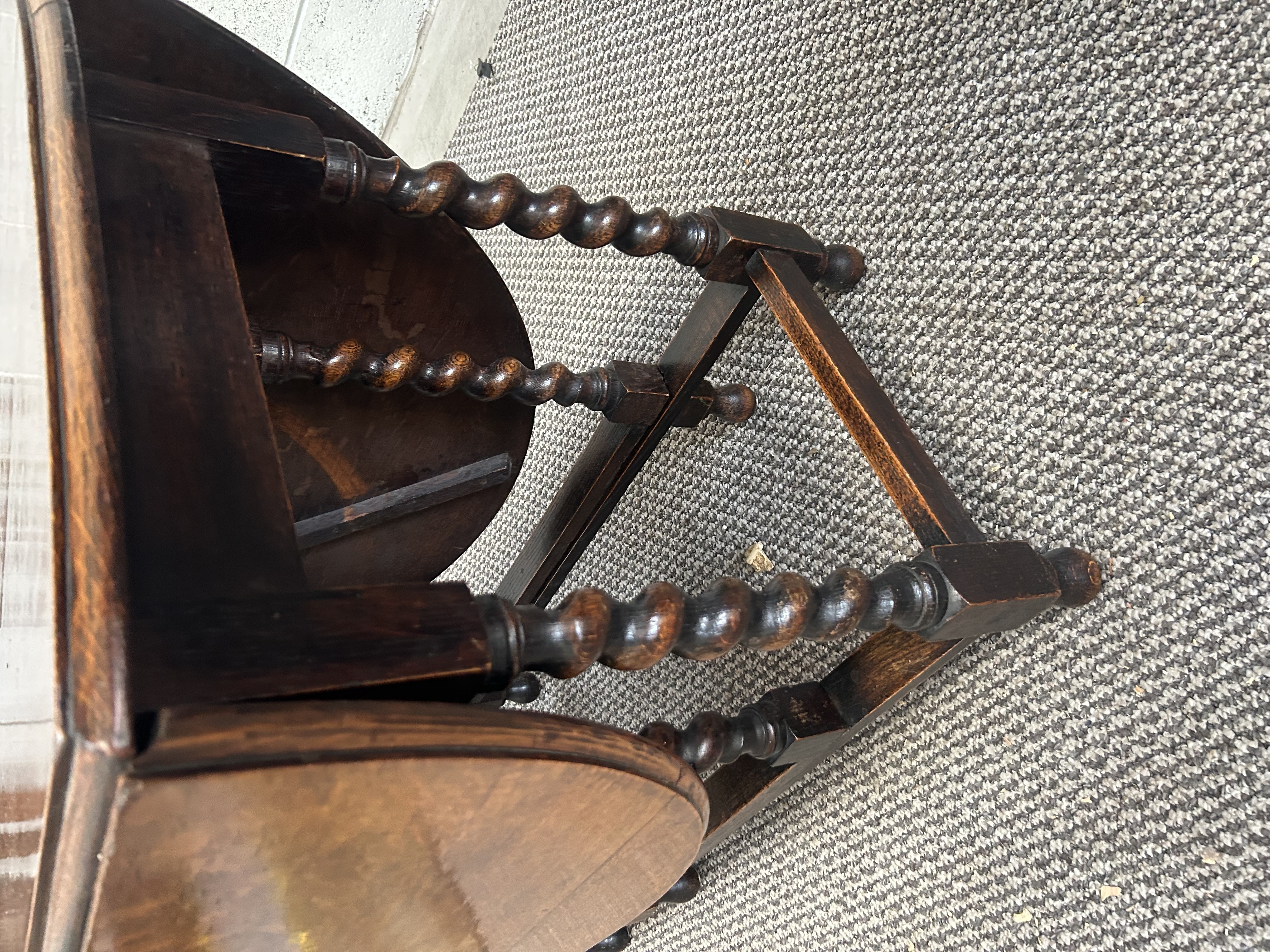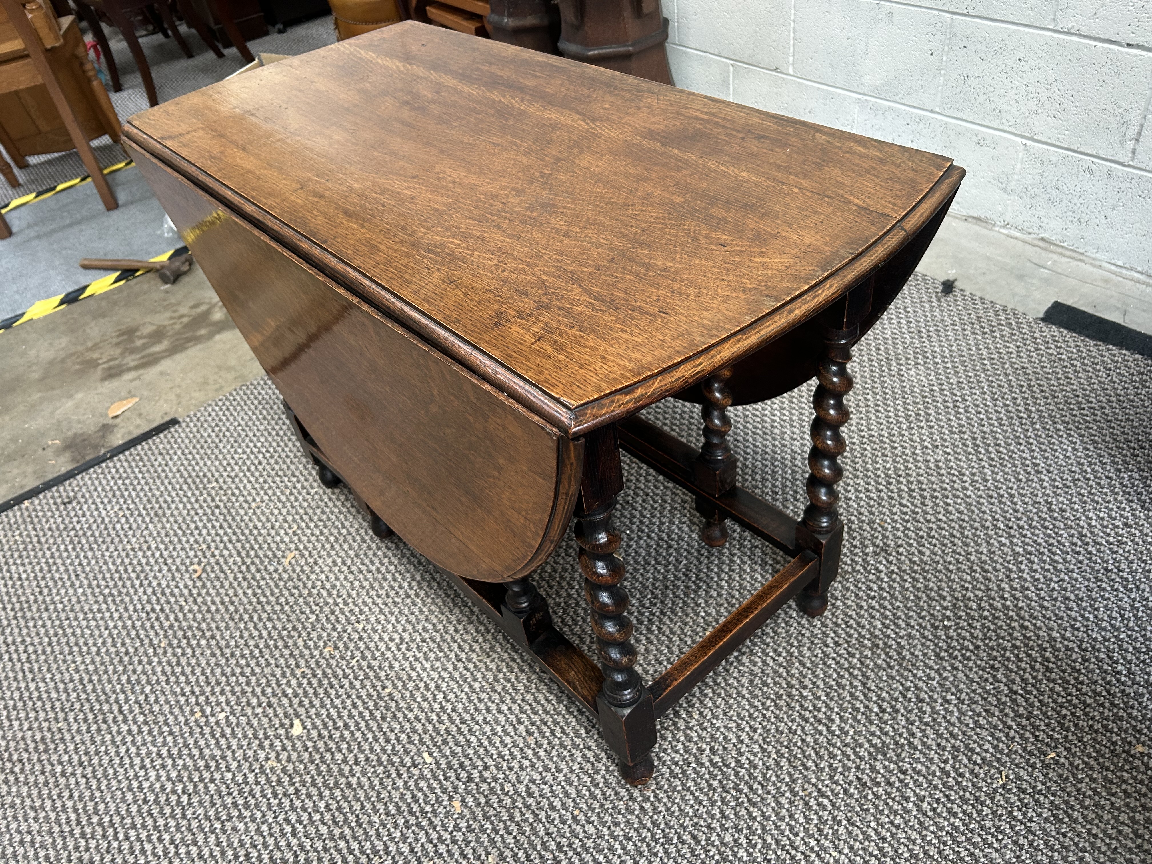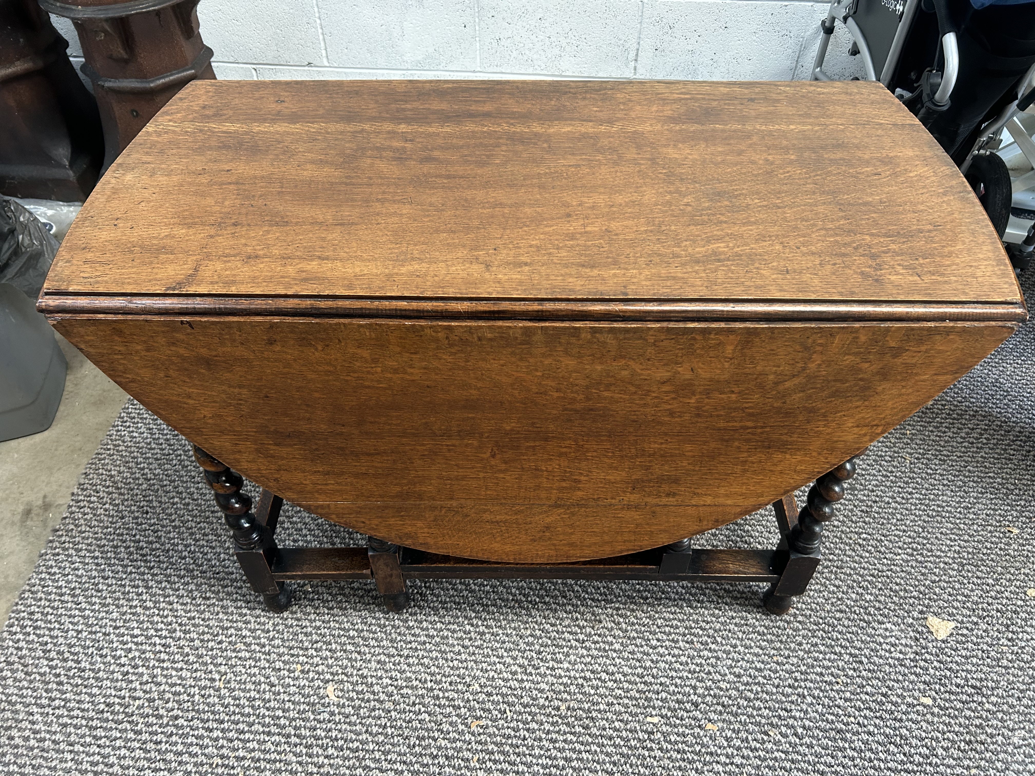This oak gate leg dining table is constructed in the late 17th-century style. It features a rectangular center section flanked by two semi-circular drop leaves that form an oval top when fully extended. The table is supported by six barley-twist turned legs joined by rectangular stretchers. Two of the legs function as swinging gates to support the leaves. The piece exhibits a prominent wood grain under a medium to dark oak finish.