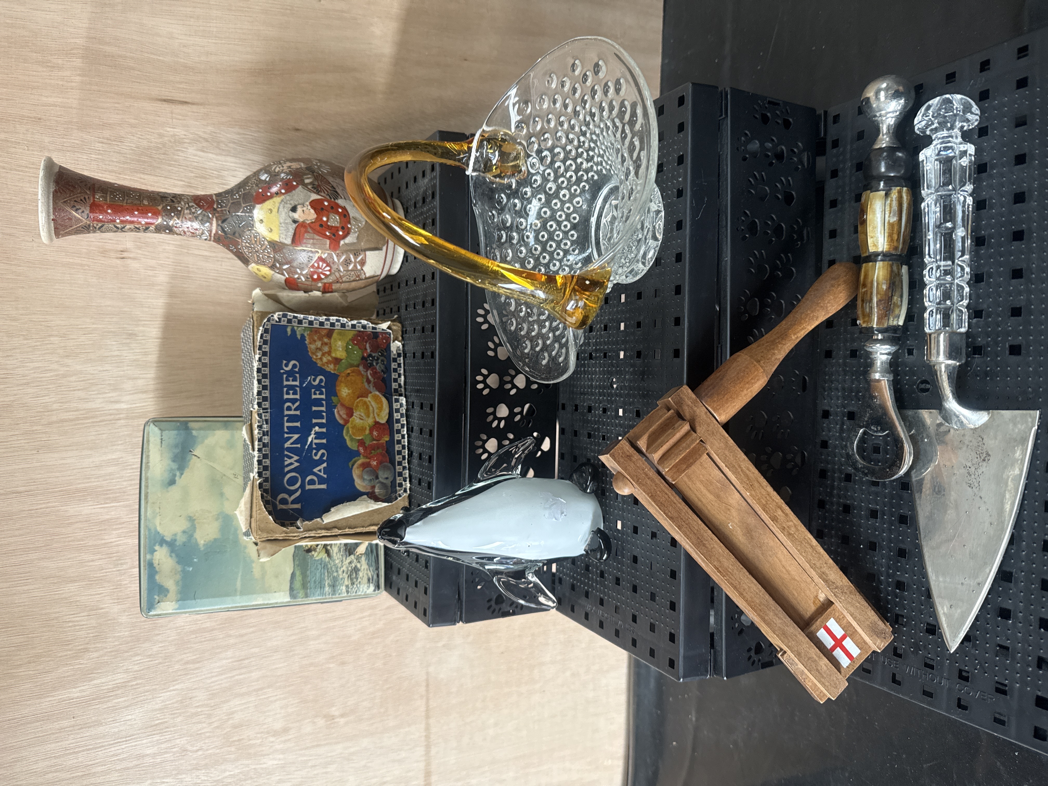 A collection of miscellaneous decorative objects and vintage collectibles. The group is highlighted by a Lorenzi Milano bottle opener featuring a bamboo root handle and stainless steel hardware. The lot also includes a Japanese Satsuma-style porcelain vase decorated with traditional figures and gilt detailing, a clear glass hobnail basket with an amber-toned glass handle, and a light blue and black art glass penguin figurine. Further items include a wooden hand-held rattle with an applied St George’s Cross decal, a silver-tone metal cake server with a faceted moulded glass handle, a vintage Rowntree’s Pastilles cardboard box, and a rectangular metal tin featuring a printed landscape scene. Materials include ceramic, art glass, pressed glass, wood, metal, cardboard, and tin.