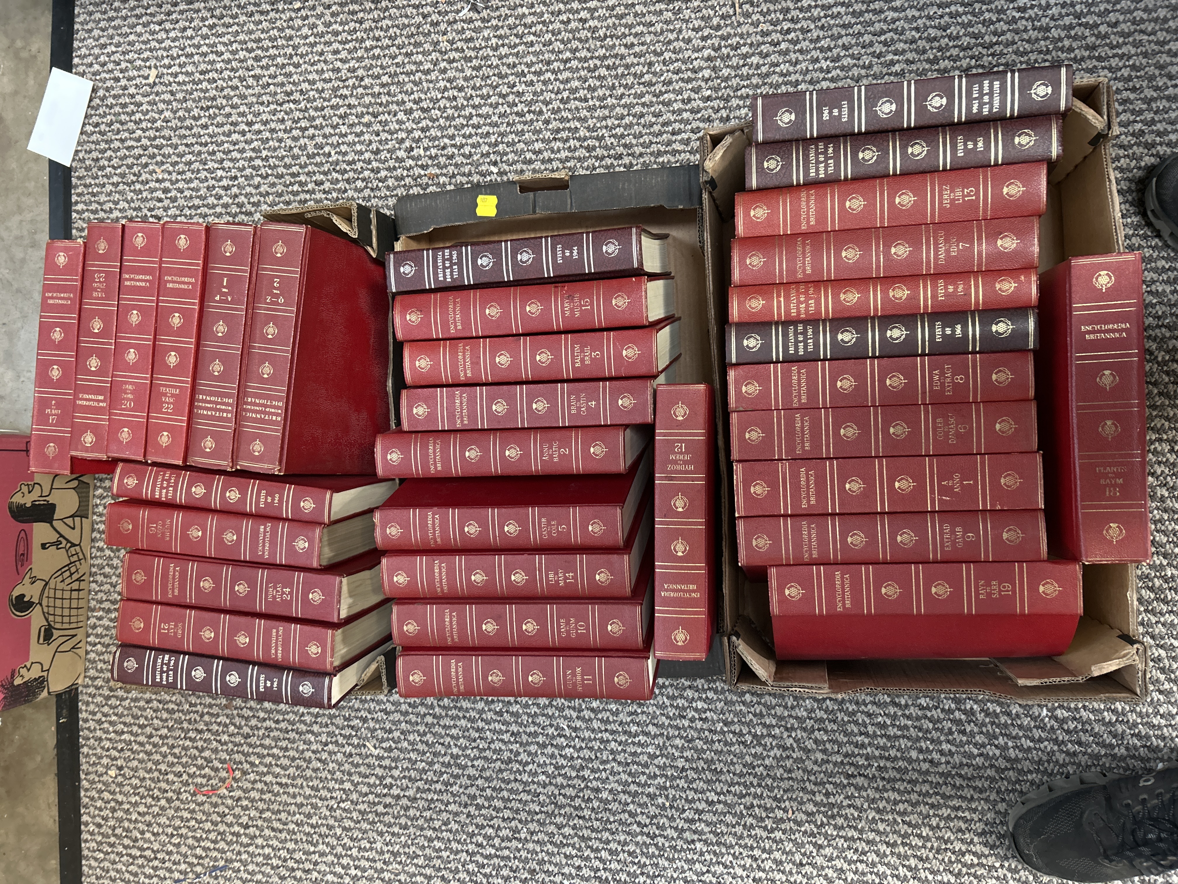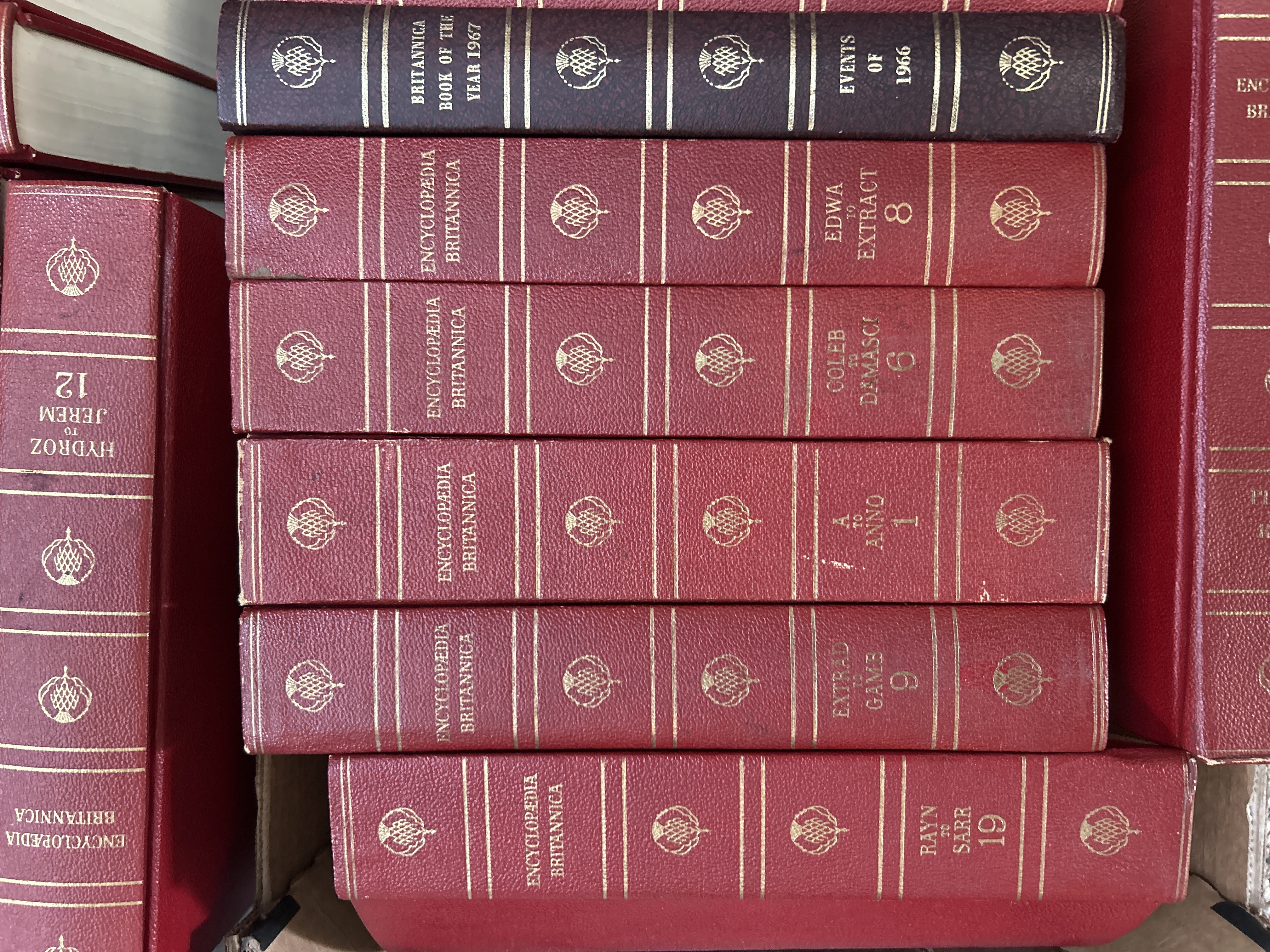A collection of vintage reference volumes published by Encyclopaedia Britannica, primarily dating from the 1960s. The group comprises multiple volumes of the main encyclopaedia set, two volumes of the Britannica World Language Dictionary, and several Britannica Book of the Year editions covering the years 1962 through 1967. The books are bound in red and maroon textured covers, featuring decorative gold-gilt lettering and thistle emblems to the spines.