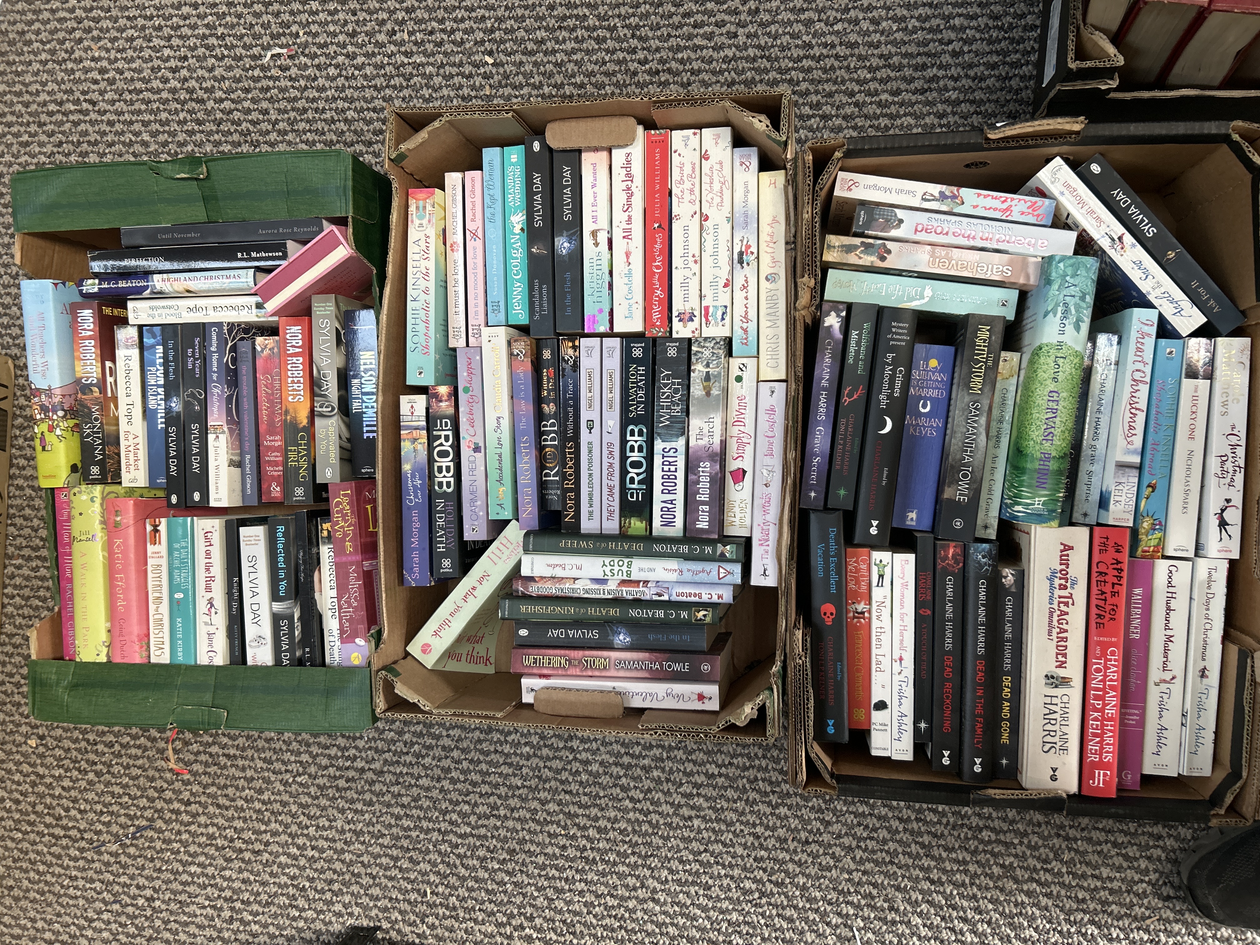 A collection of contemporary mass-market paperback books housed in three cardboard storage boxes. The lot comprises a variety of modern fiction genres, primarily focusing on romance, mystery, and thriller titles. Featured authors include Nora Roberts, J.D. Robb, Sylvia Day, Charlaine Harris, Sophie Kinsella, Nicholas Sparks, and M.C. Beaton. Notable series represented within the collection include the Aurora Teagarden mysteries by Charlaine Harris and the In Death series by J.D. Robb. The volumes are predominantly standard paperback editions from various publishers.