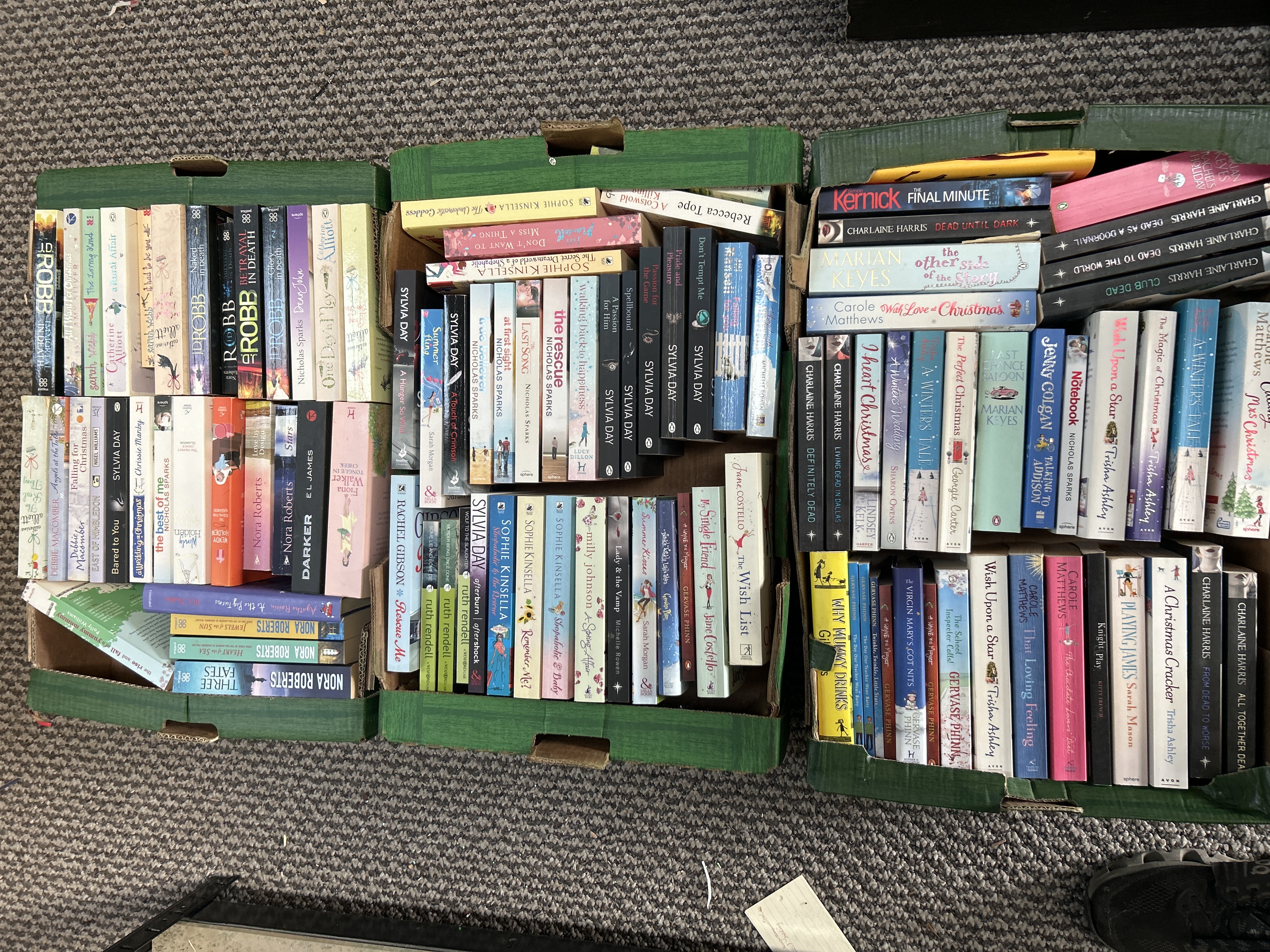 A large collection of mass-market paperback books, primarily within the romance, mystery, and thriller genres. The selection includes works by numerous popular authors such as J.D. Robb, Nora Roberts, Sylvia Day, Sophie Kinsella, Nicholas Sparks, Charlaine Harris, Marian Keyes, Ruth Rendell, and Jenny Colgan. The books are primarily 21st-century editions and are housed in three green plastic crates. The lot consists of standard paperback publications with printed softcovers.