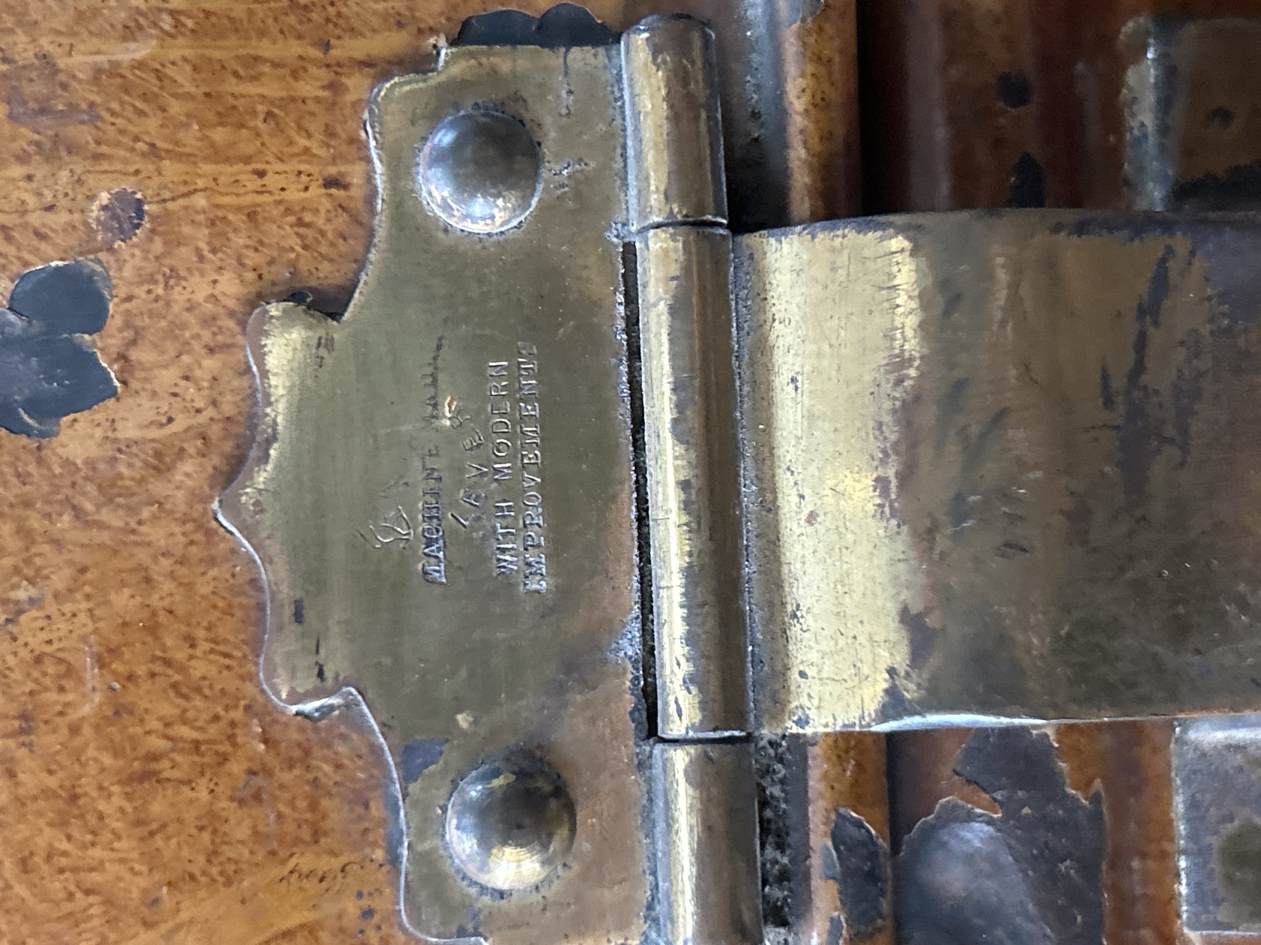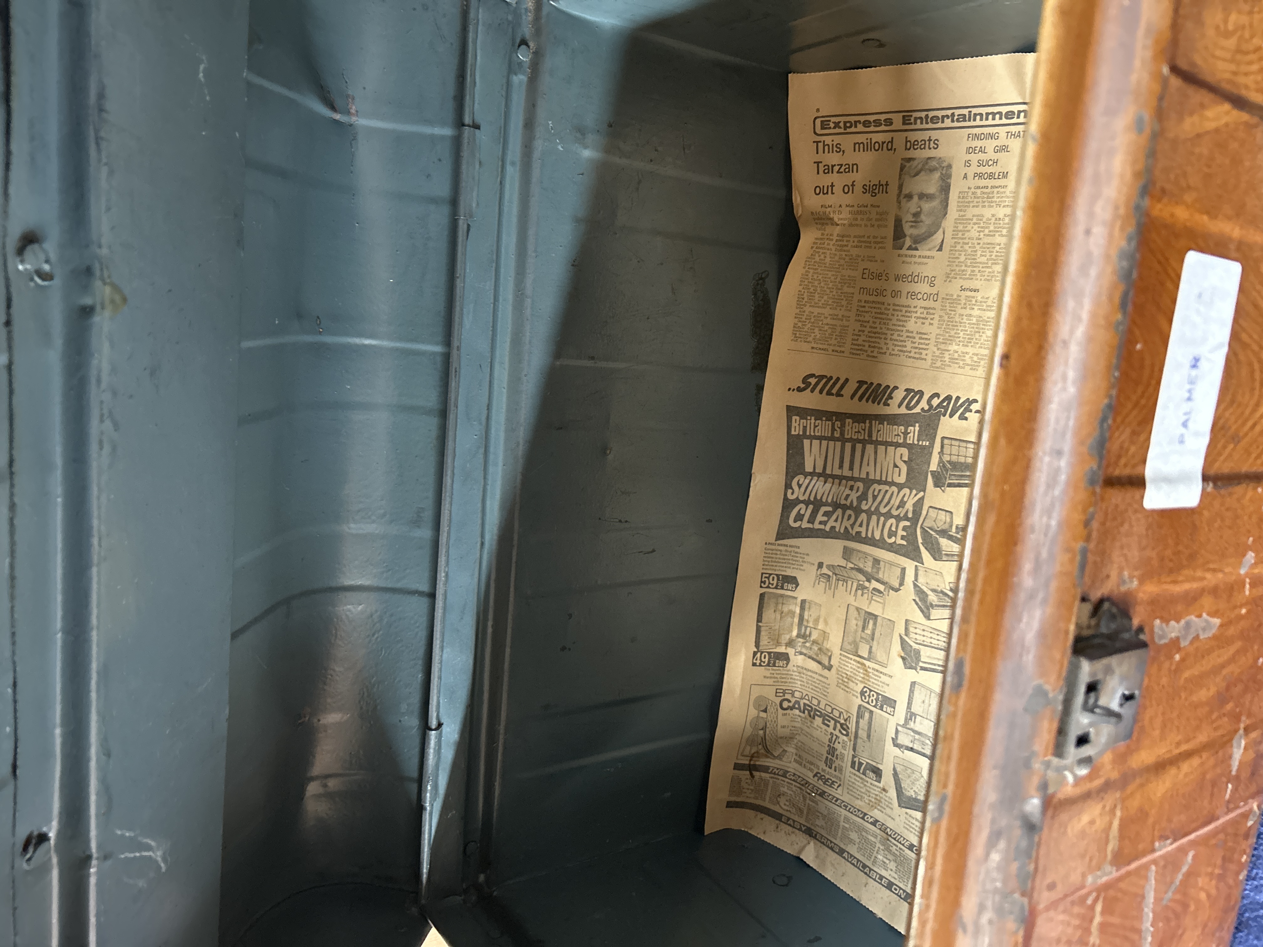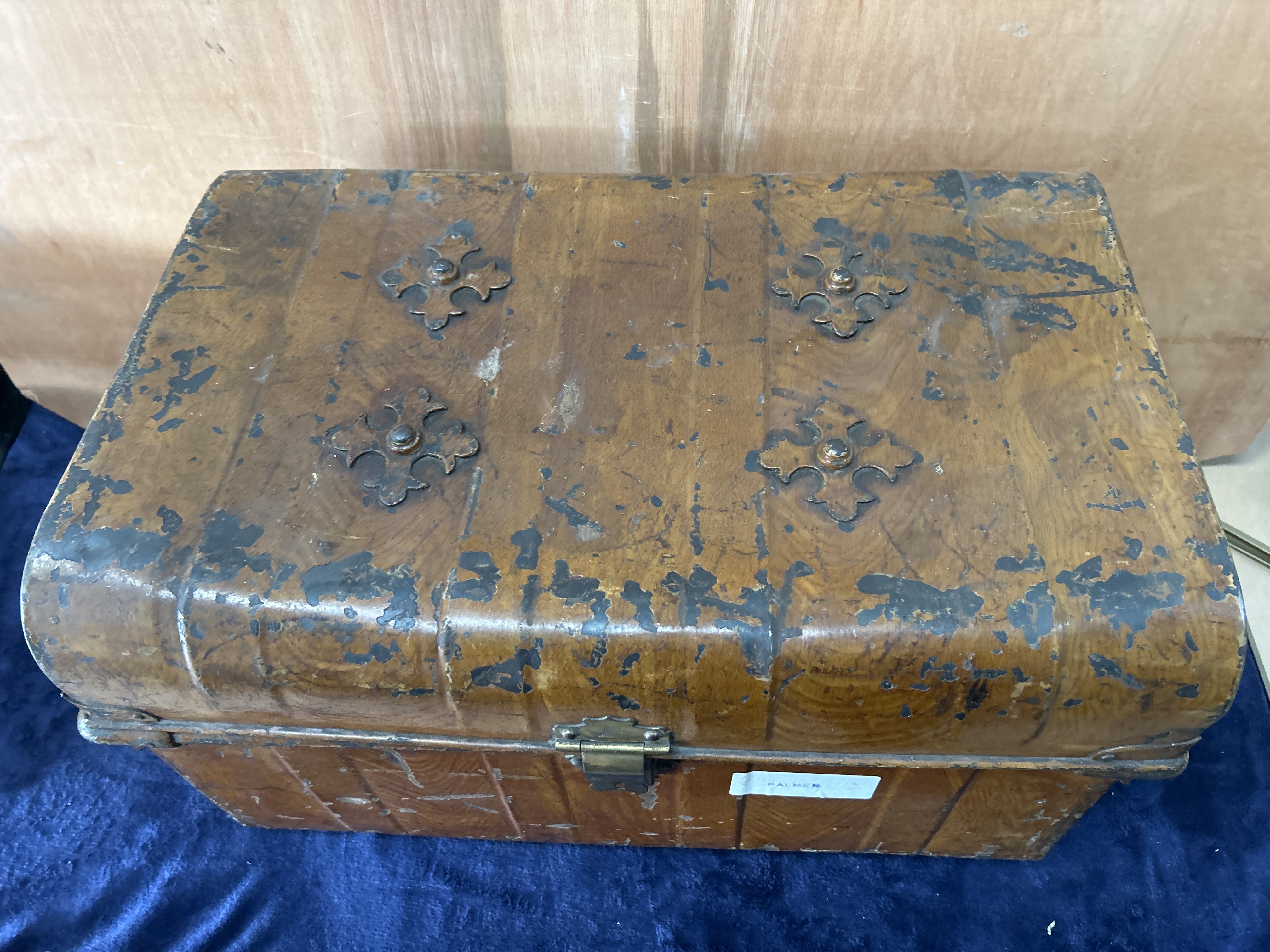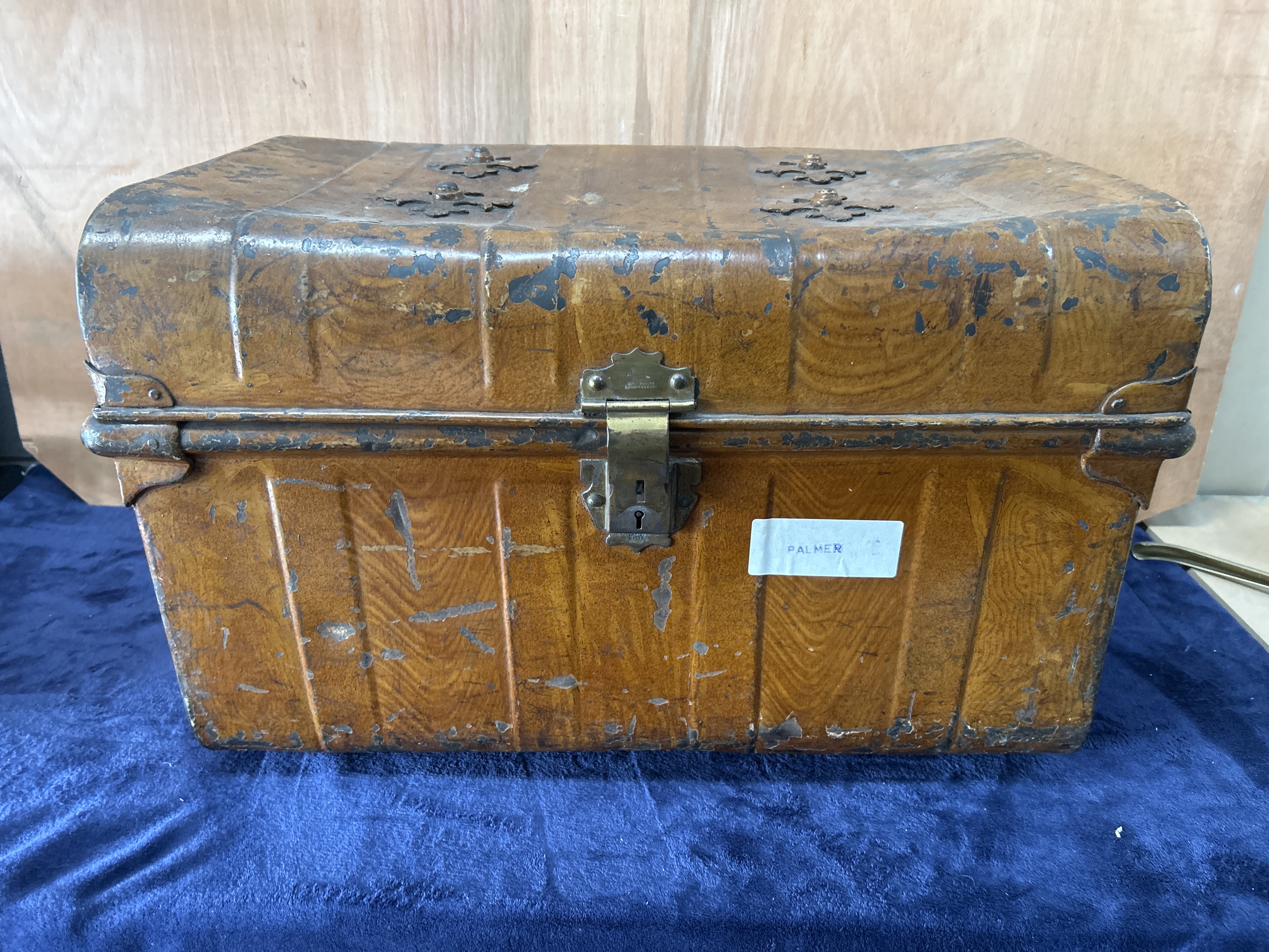 An antique dome-top steamer trunk constructed from metal with a painted faux-wood grain exterior finish. The lid is decorated with four applied metal quatrefoil bosses. The front features a central brass-toned locking hasp stamped MACHINE MADE LEVERS WITH MODERN IMPROVEMENTS. A small white paper label marked PALMER is adhered to the front right. The interior is finished in a solid greyish-blue tone and contains a vintage newspaper fragment from the Express Entertainment section. This vintage travel chest incorporates the provided dimensions of 24 x 15 x 14 inches.