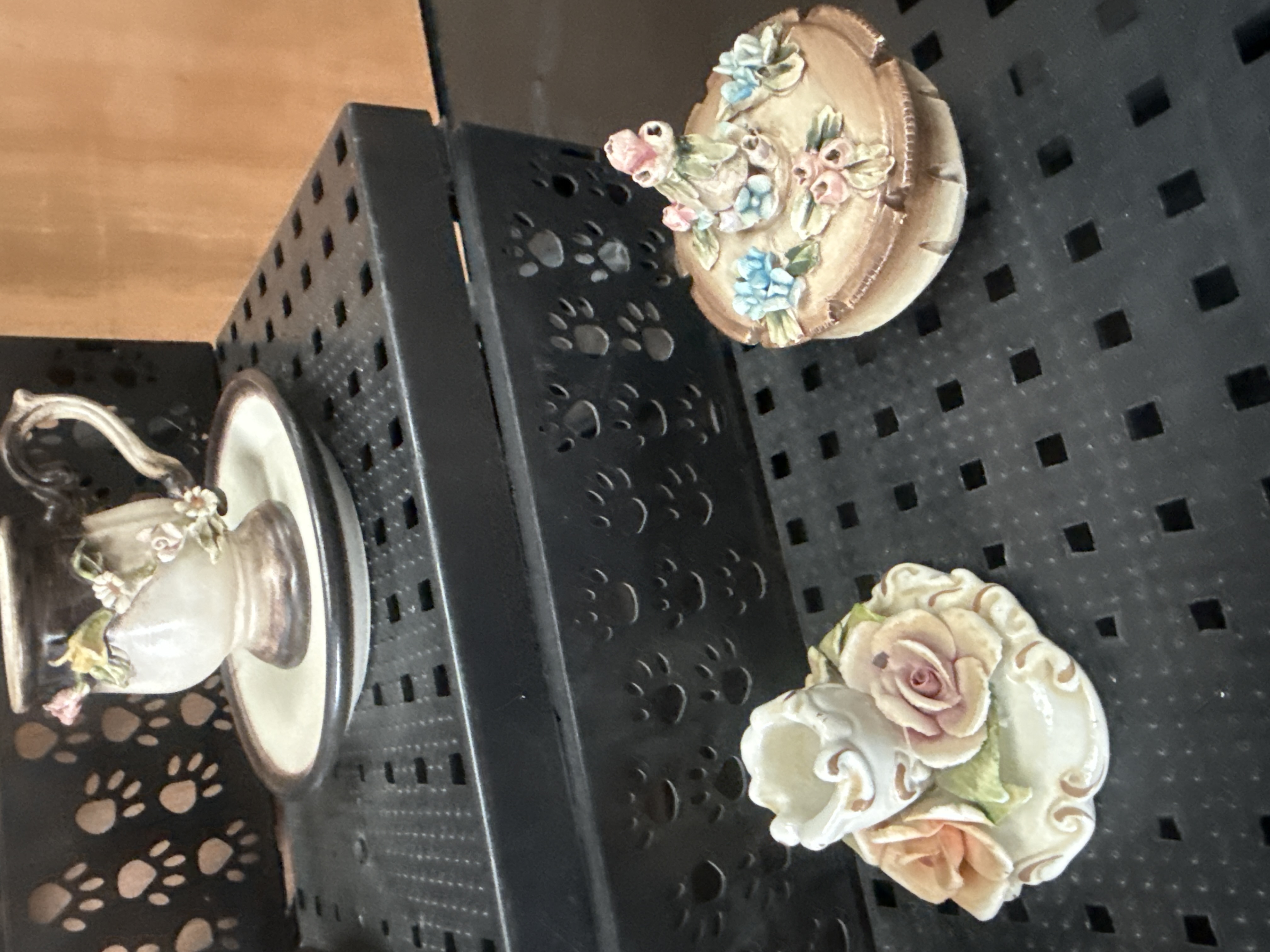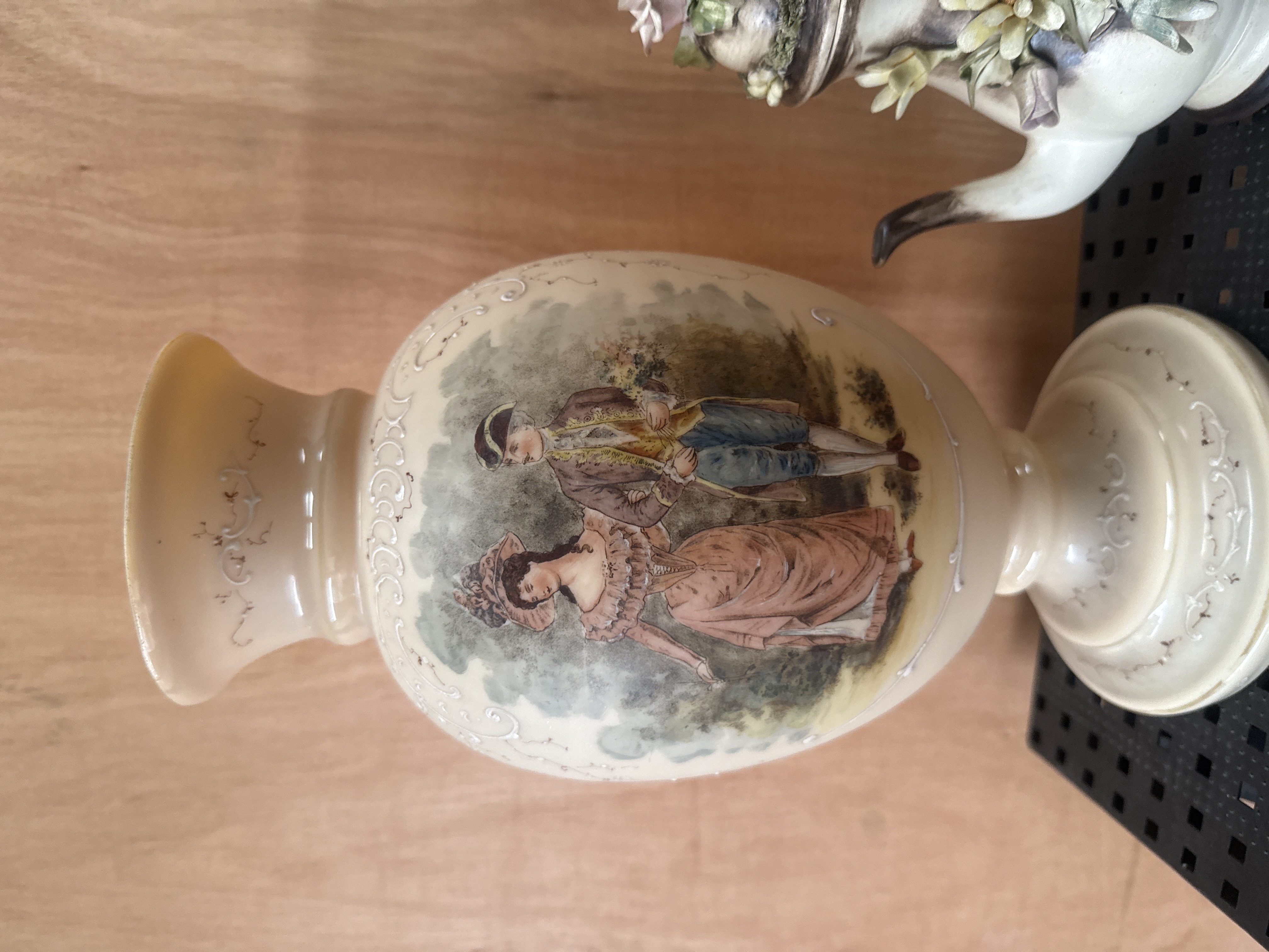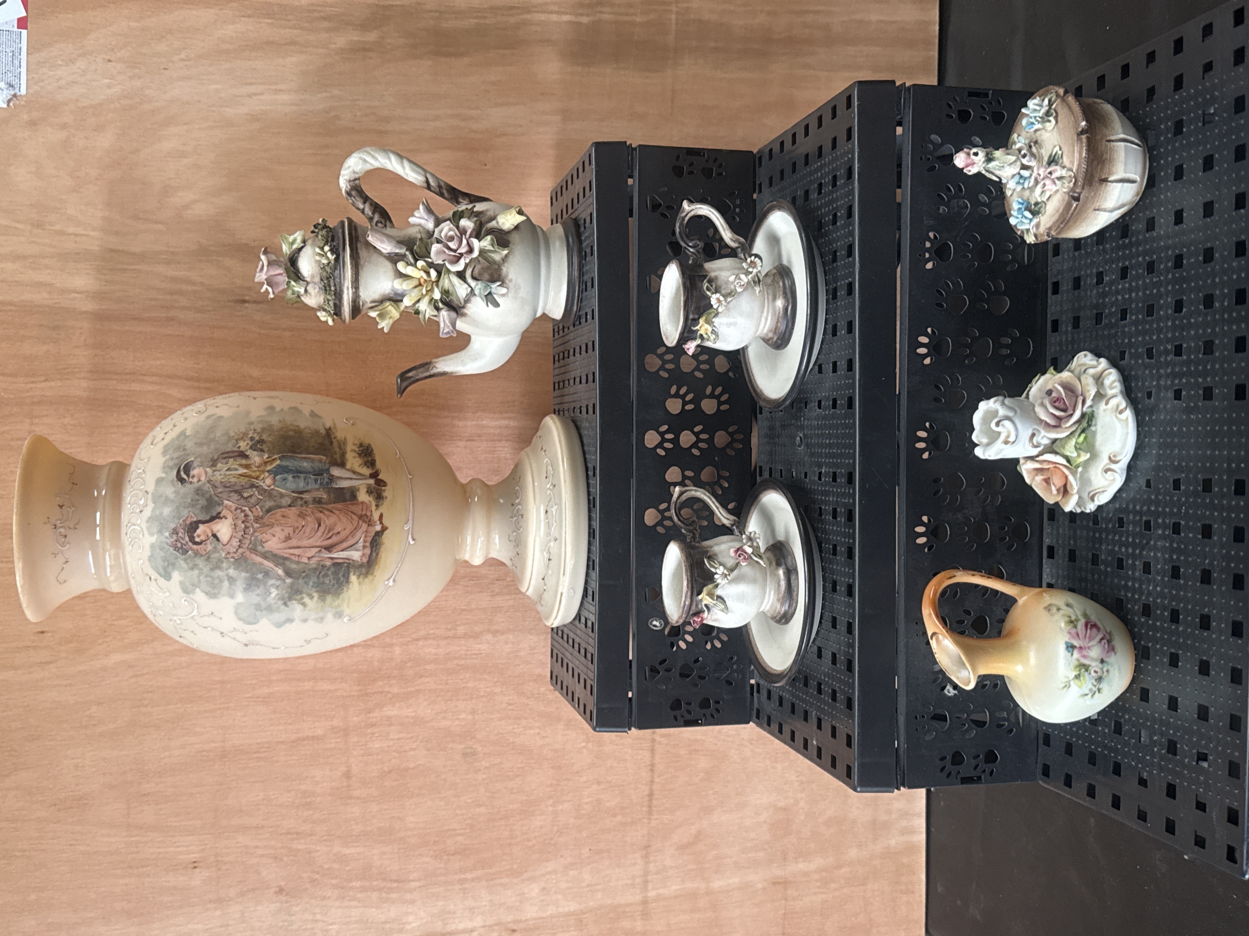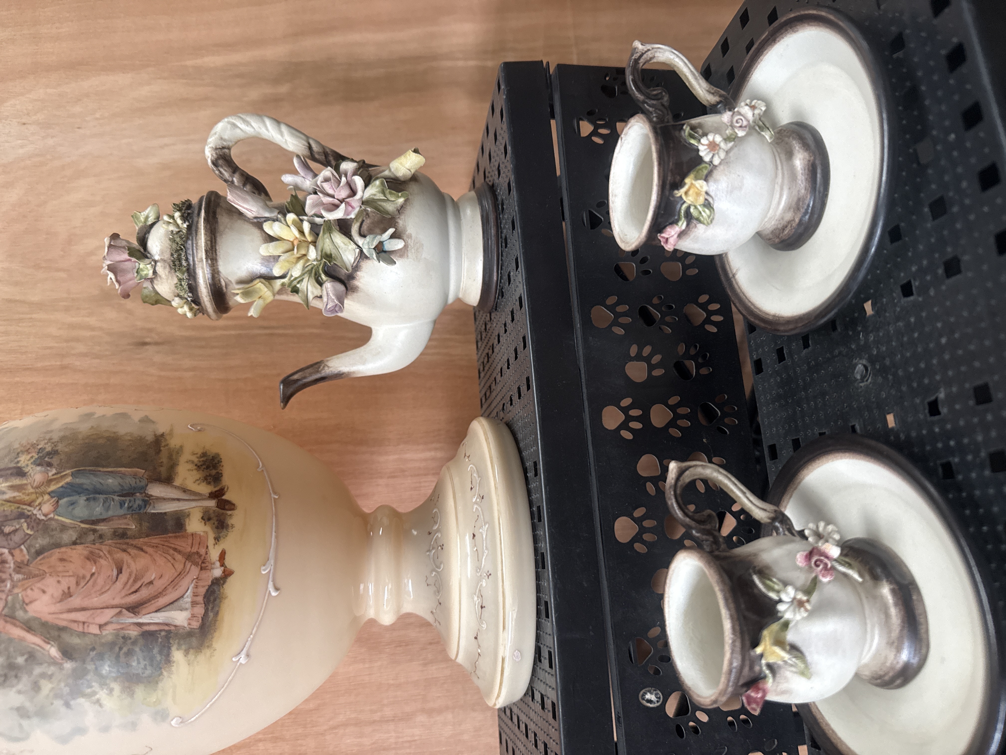 This collection consists of various decorative glazed ceramics, primarily in the Capodimonte style. The group includes a tea service featuring a teapot with a scrolled handle, demitasse cups, and saucers, all ornamented with intricate three-dimensional applied ceramic flowers and foliage with metallic-tone glaze accents. Also included is a large ovoid pedestal vase displaying a transfer-printed scene of a couple in 18th-century dress, accented with raised white slip scrollwork. The assortment is completed by a lidded floral dish and a small pitcher with rose decoration. The items exhibit a variety of finishes, including matte, gloss, and luster glazes.