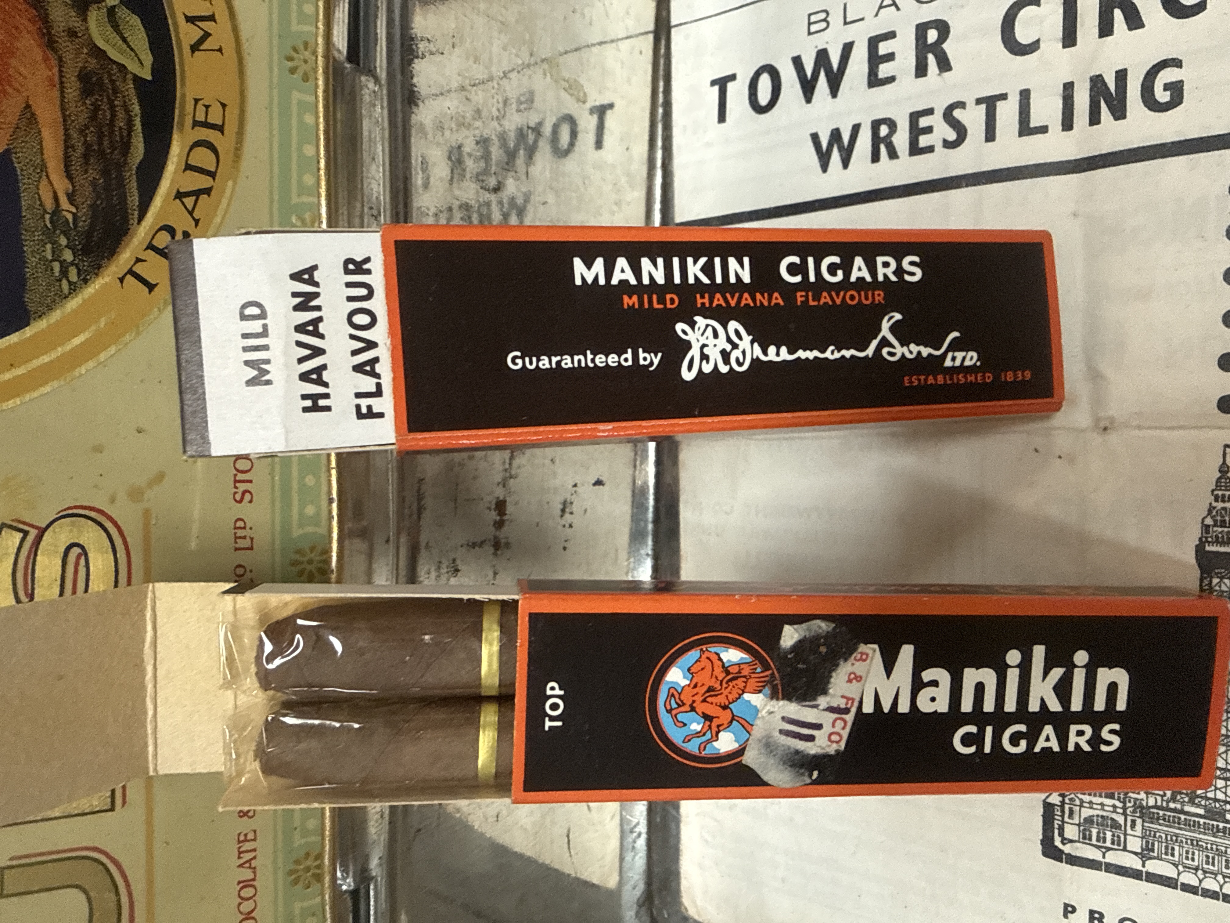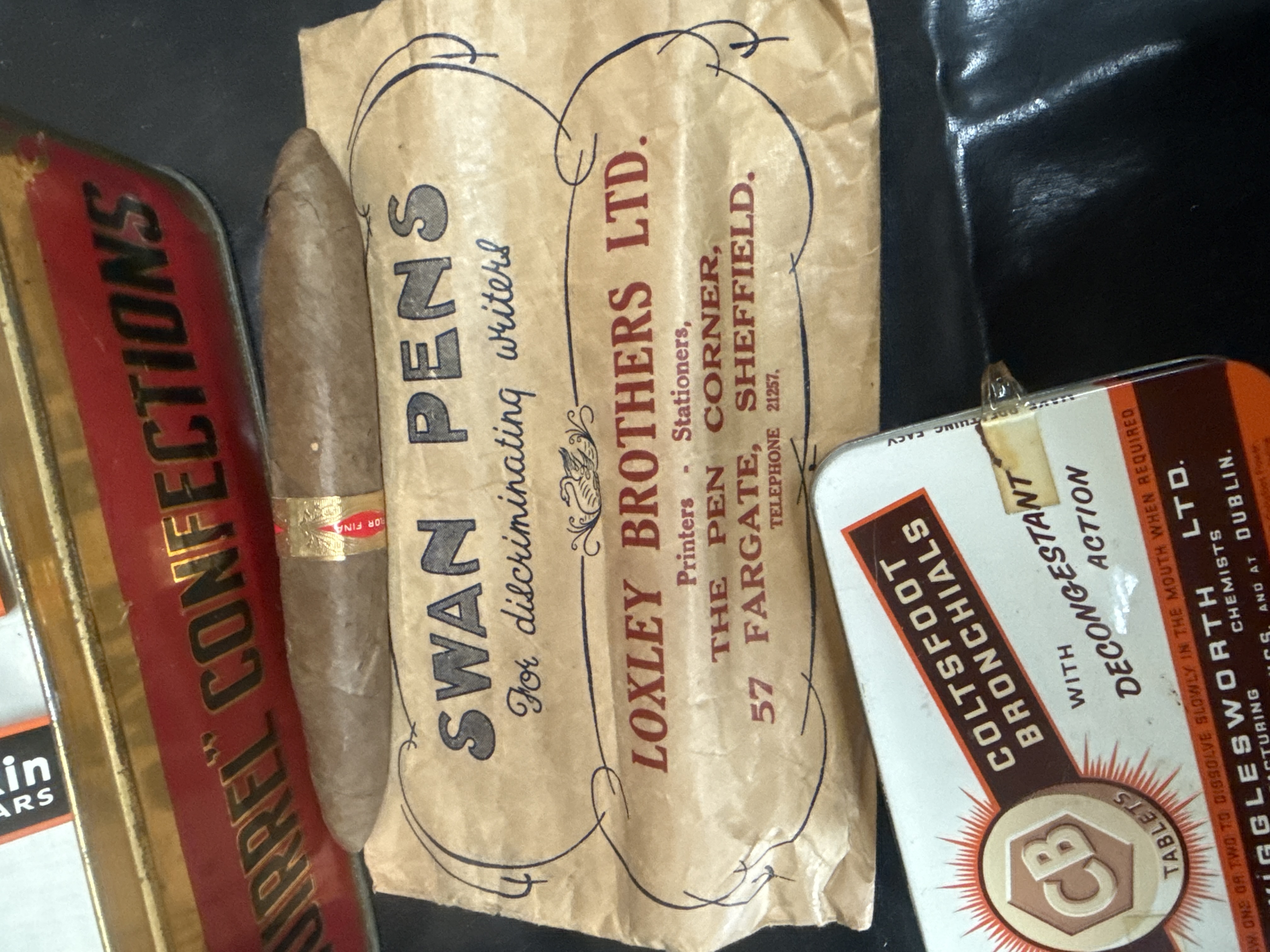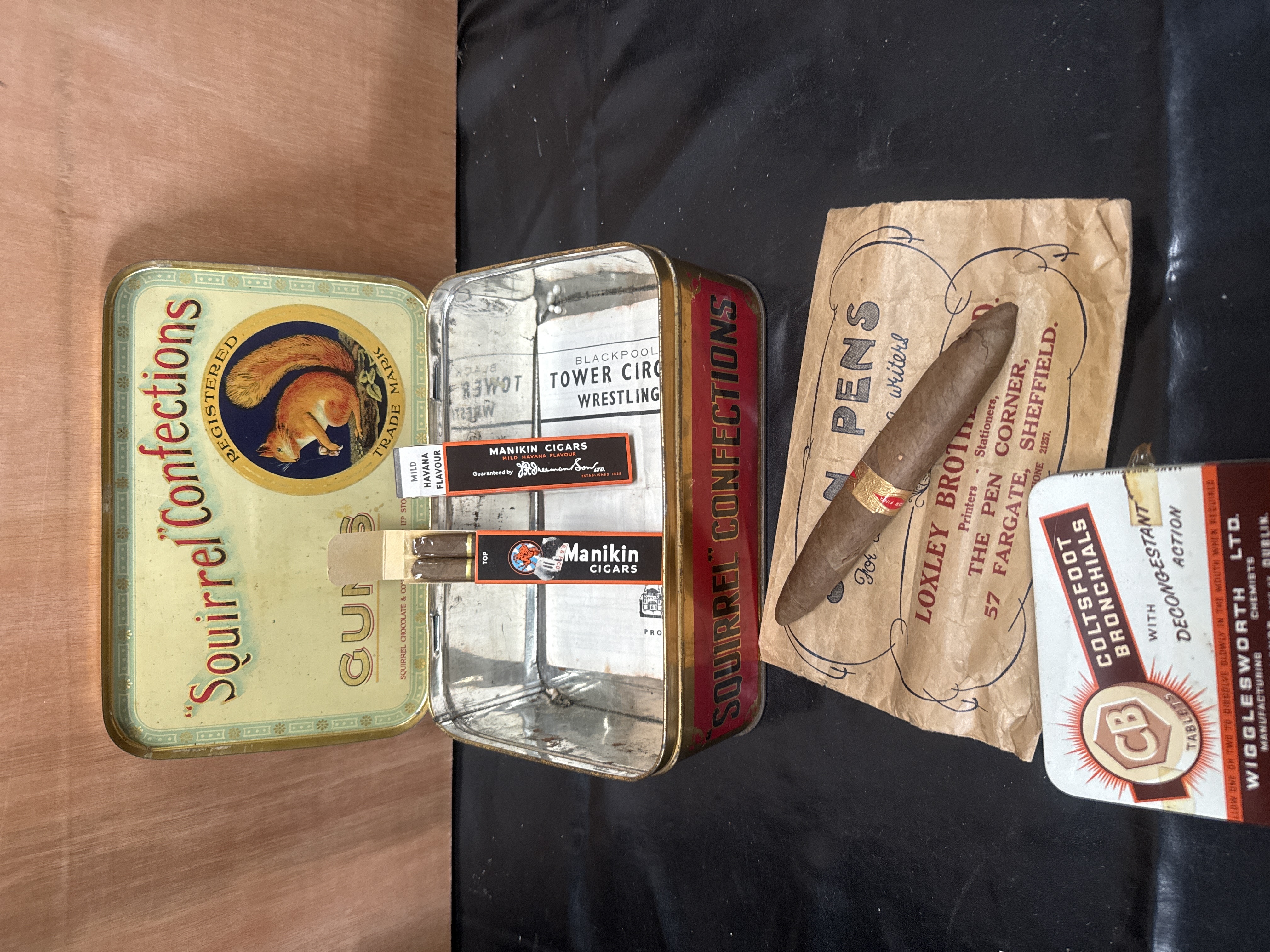 An assortment of vintage advertising items and tobacciana comprising lithographed metal tins, cigars, and printed ephemera. The collection includes a Squirrel Brand Confections lithographed metal tin, circa 1930s, featuring a squirrel illustration on the lid and containing a Blackpool Tower Circus Wrestling promotional insert. A smaller lithographed metal tin for Coltsfoot Bronchials by Wigglesworth Ltd. of Dublin is also present. The tobacciana consists of several Manikin Cigars by J.R. Freeman and Son Ltd., some in original orange and black cardboard sleeves, and a single torpedo-shaped cigar with a red and gold Flor Fina band. Ephemera includes a vintage paper bag from Loxley Brothers Ltd. of Sheffield, advertising Swan Pens.