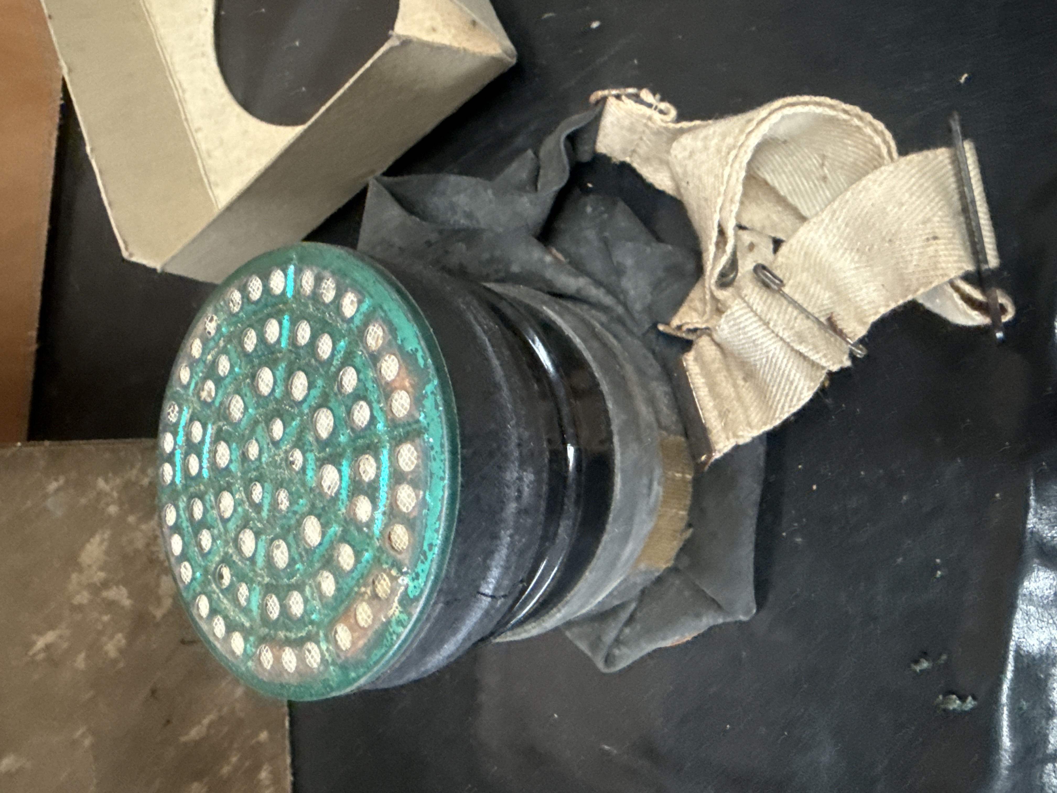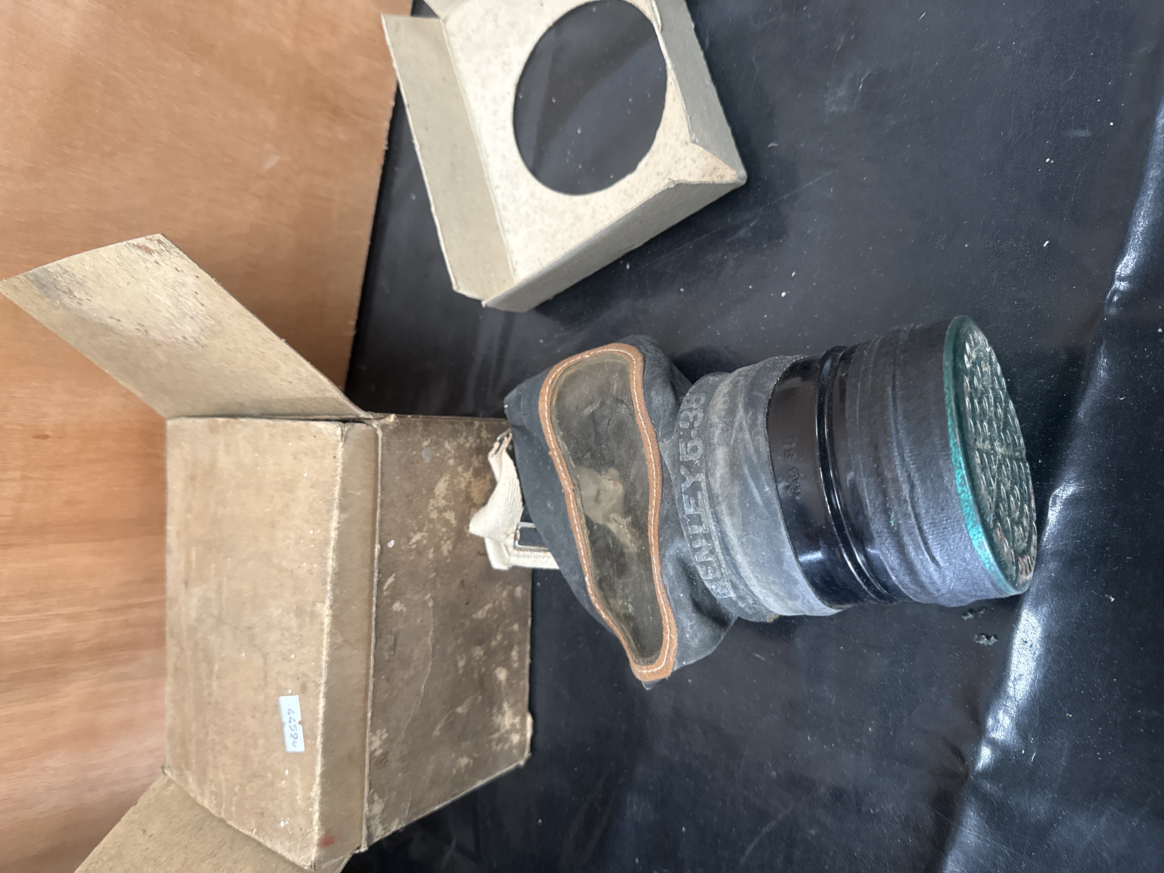 A British World War II civilian respirator manufactured by Henley. The gas mask is constructed with a dark rubber facepiece and features large clear eyepieces finished with stitched brown trim. The rubber neck of the mask is stamped with the marking LEY 6-38, signifying a manufacturing date of June 1938. The unit is fitted with a black cylindrical filter canister that has a perforated metal face. It retains its original adjustable canvas webbing head straps. The respirator is accompanied by its original two-part cardboard storage box, which includes a small identification label on the exterior.