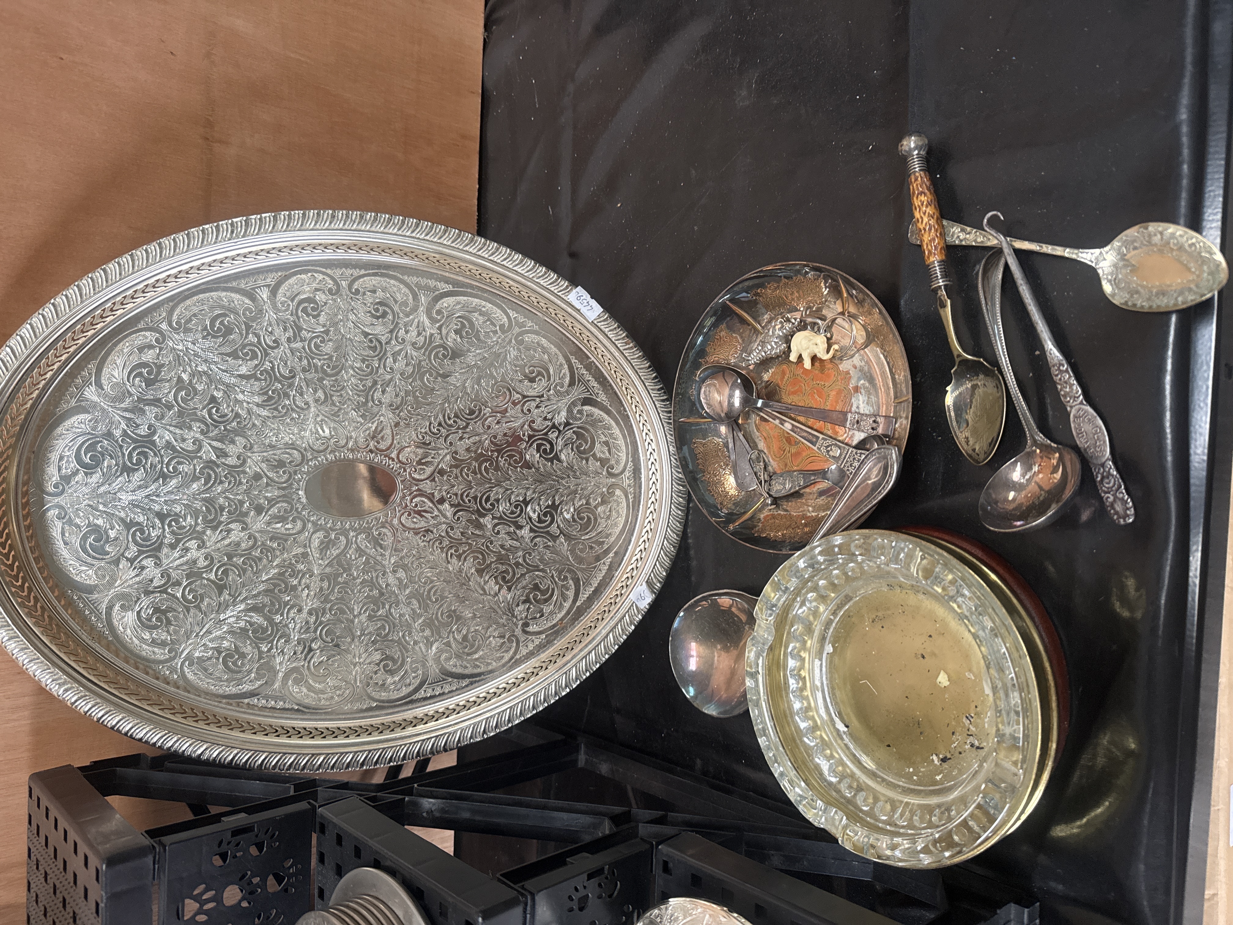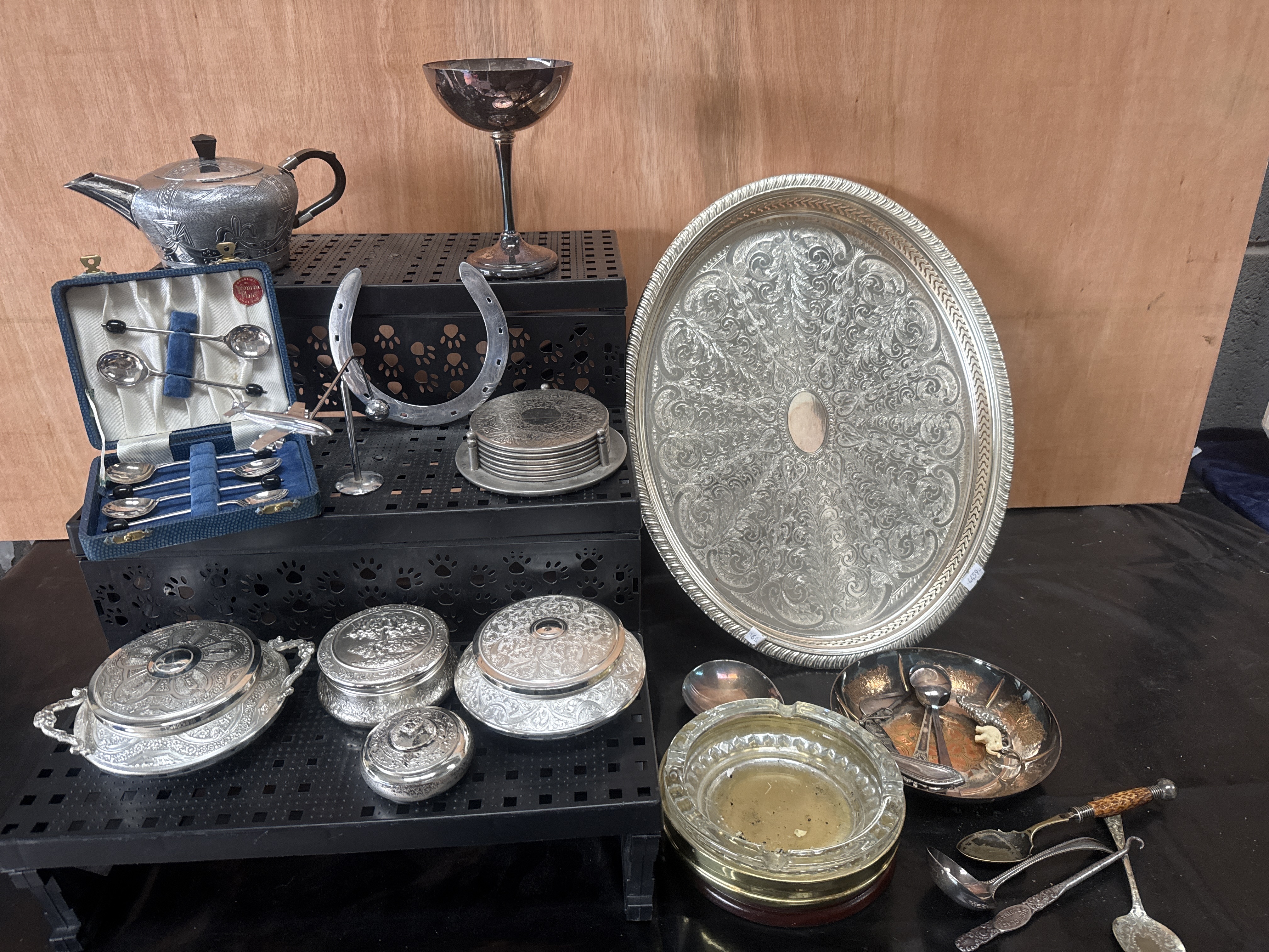 A collection of silver plated and metal tablewares and decorative objects. The group is centered by a large oval silver plated tray featuring intricate foliate chasing to the well, a central unengraved cartouche, and a gadrooned border. Accompanying the tray is a coordinating teapot with chased decoration and a black handle and finial. The lot includes several circular lidded containers with embossed motifs, a tall stemmed goblet, and a set of coasters in a matching holder. A blue-lined presentation case contains a set of small spoons labeled Gibsons Plate. Additional items include a decorative horseshoe, a small model airplane on a stand, a glass ashtray with a metal rim, a small shallow dish, and various loose spoons, including one with a textured handle.