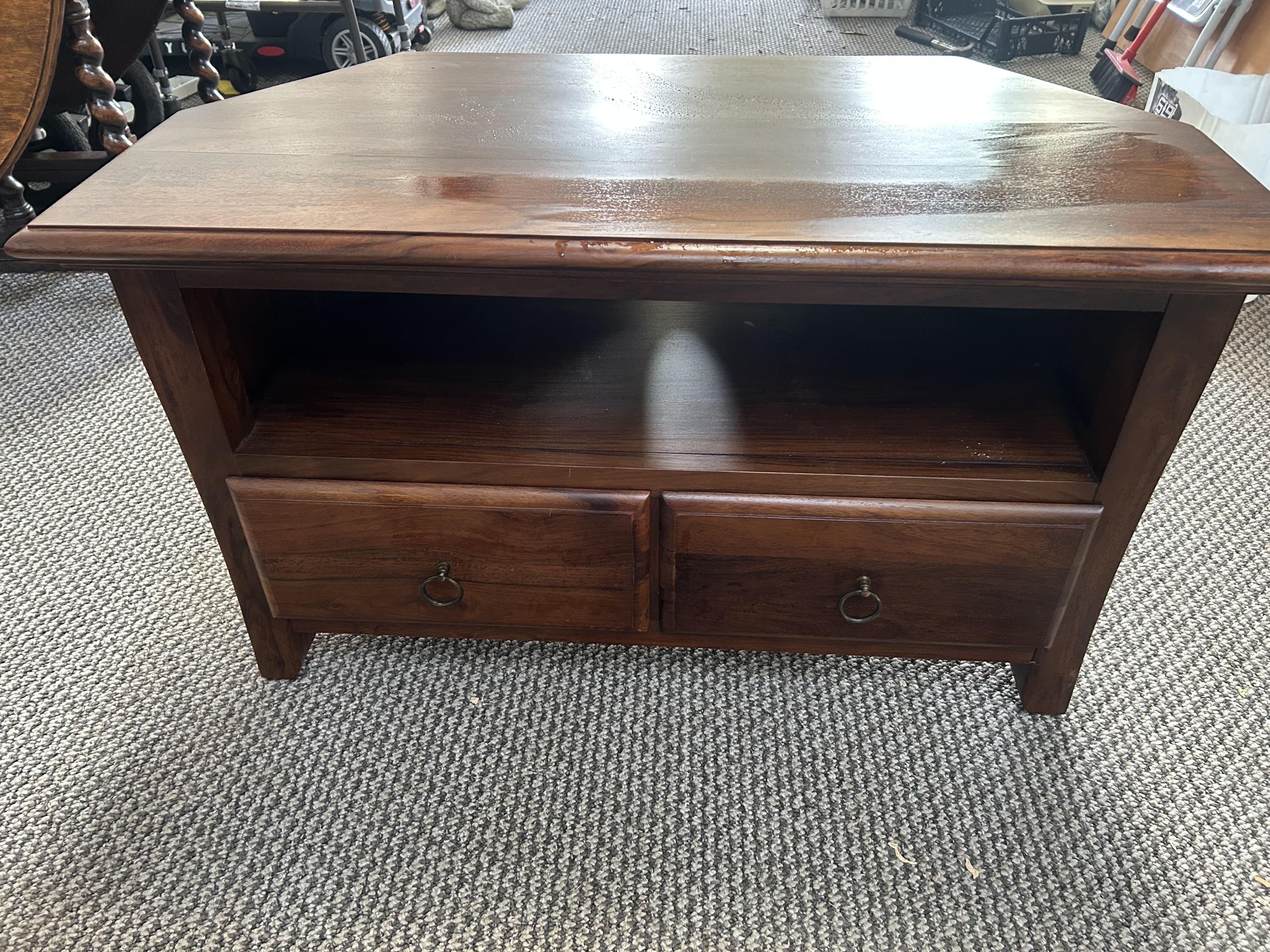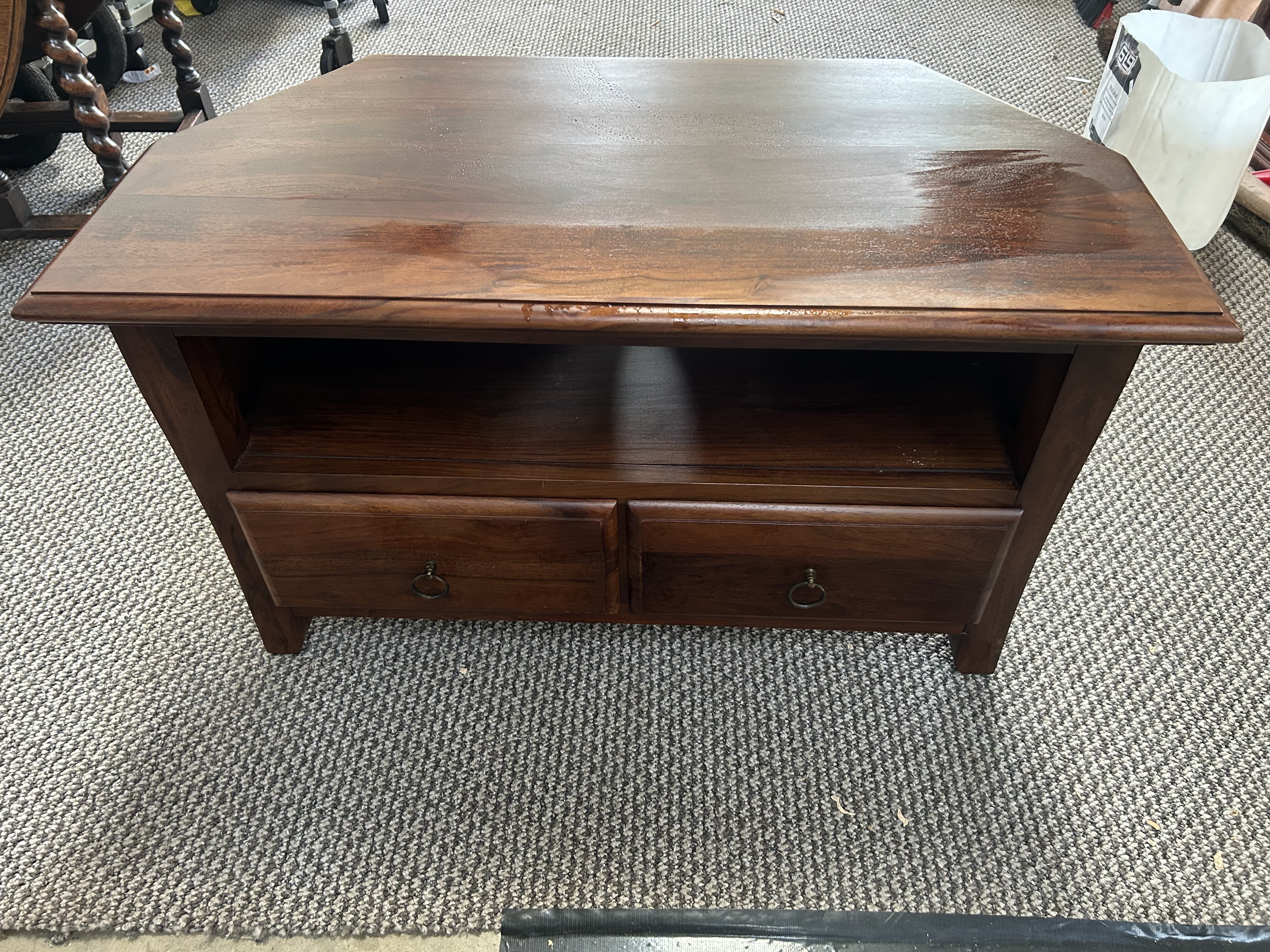A contemporary corner entertainment unit constructed from stained hardwood with a mahogany finish. The piece features a clipped-corner top with a molded edge, situated above a full-width open media shelf. The lower section contains two drawers, each fitted with a circular metal ring pull handle. The unit is raised on four short, tapered block feet.