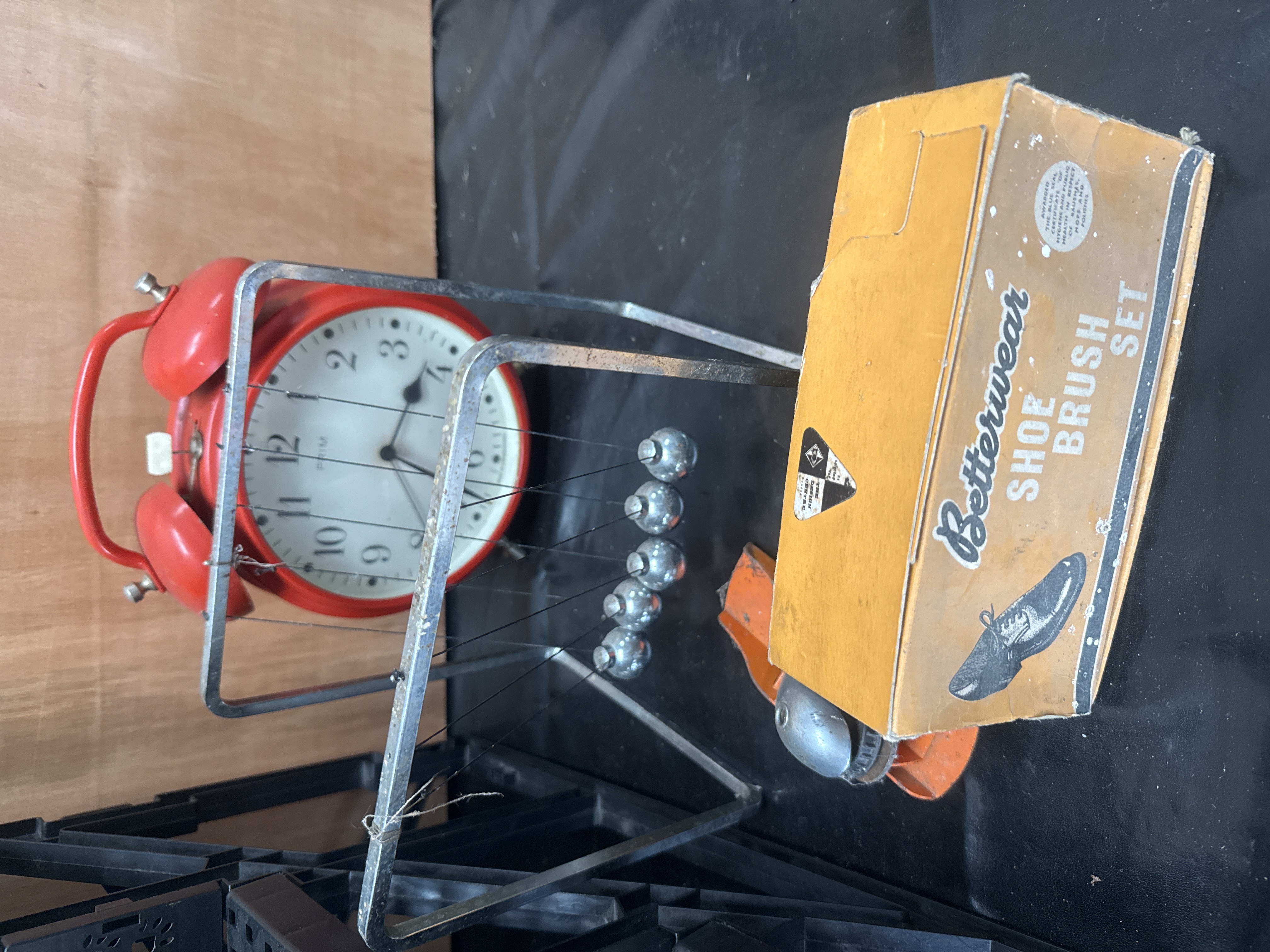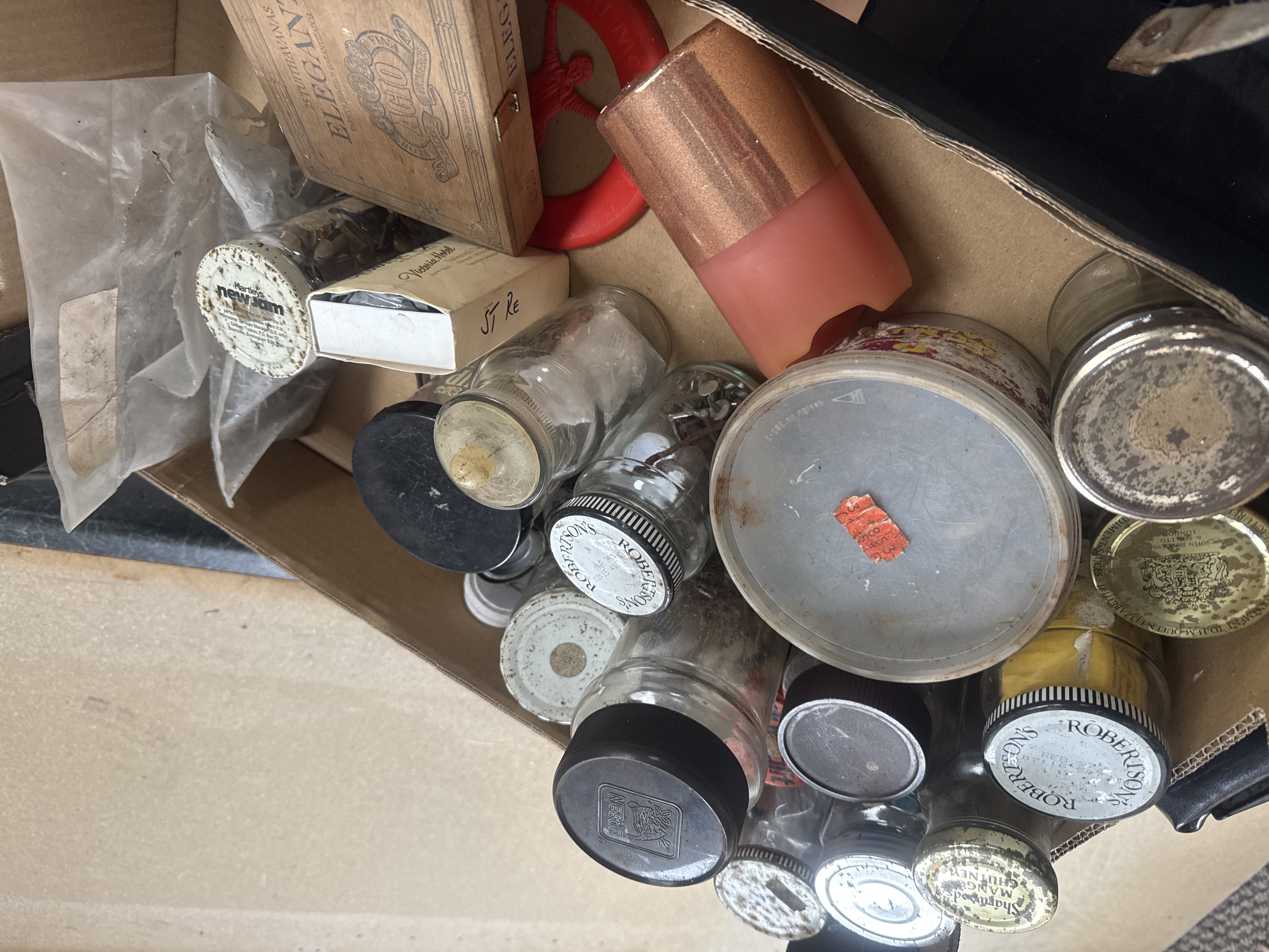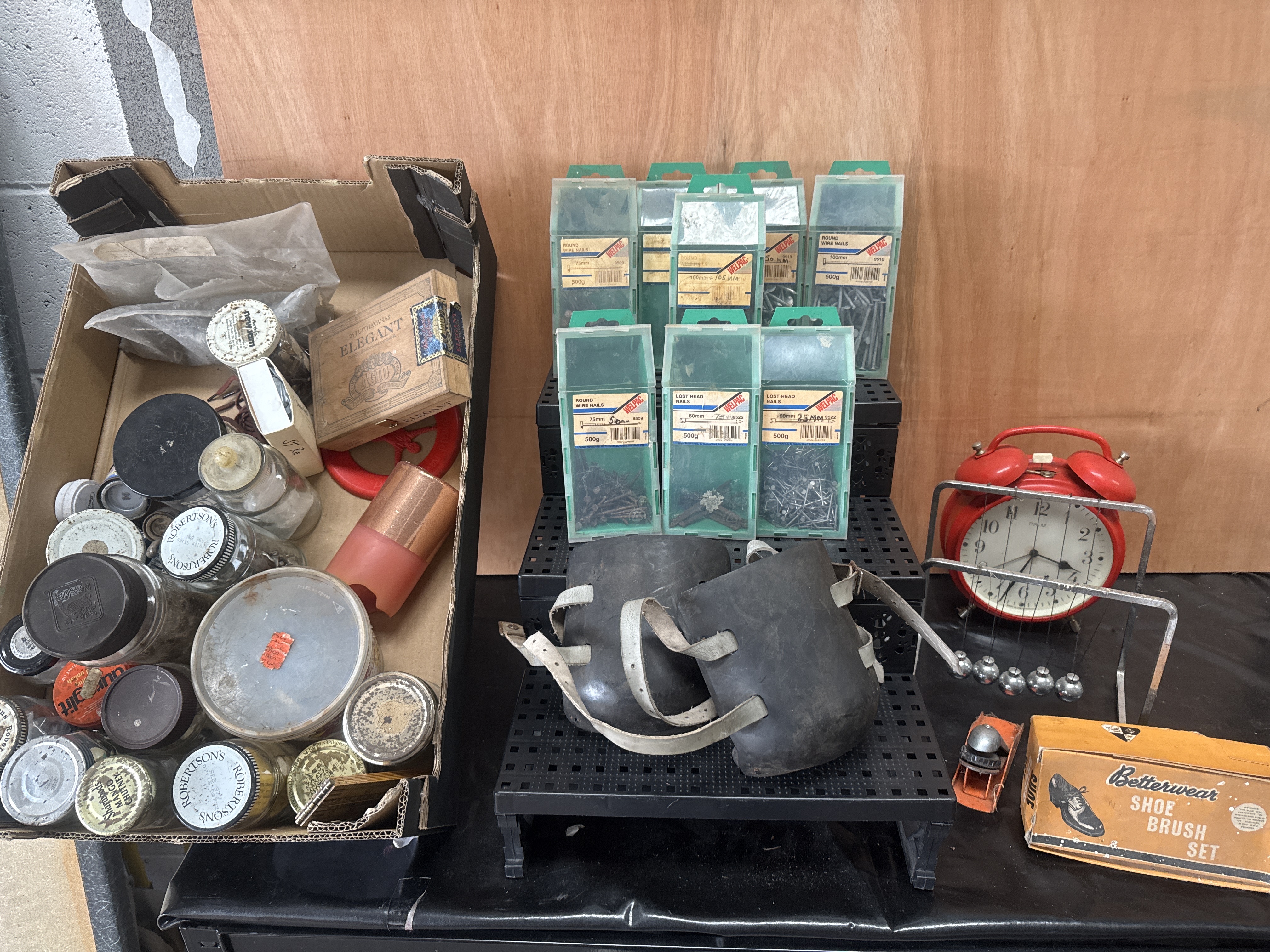 A group of various household and workshop items. Included are multiple glass preserves and spice jars with branded metal lids, featuring labels from Robertson’s, Nestlé, Hartley’s, and Sharwood’s. The lot contains an Agio ‘Elegant’ cigar box for 25 Tuithavanas and a collection of Welpac brand steel nails in green plastic dispensers, including lost head and round wire types in various sizes. Workshop accessories include a pair of black rubber knee pads with white fabric fastening straps and spiked undersides. Household and desk items include a red Prim twin-bell alarm clock, a metal Newton’s Cradle desk toy, and a Betterwear shoe brush set in its original orange cardboard box. A small packaged bicycle bell is also present.