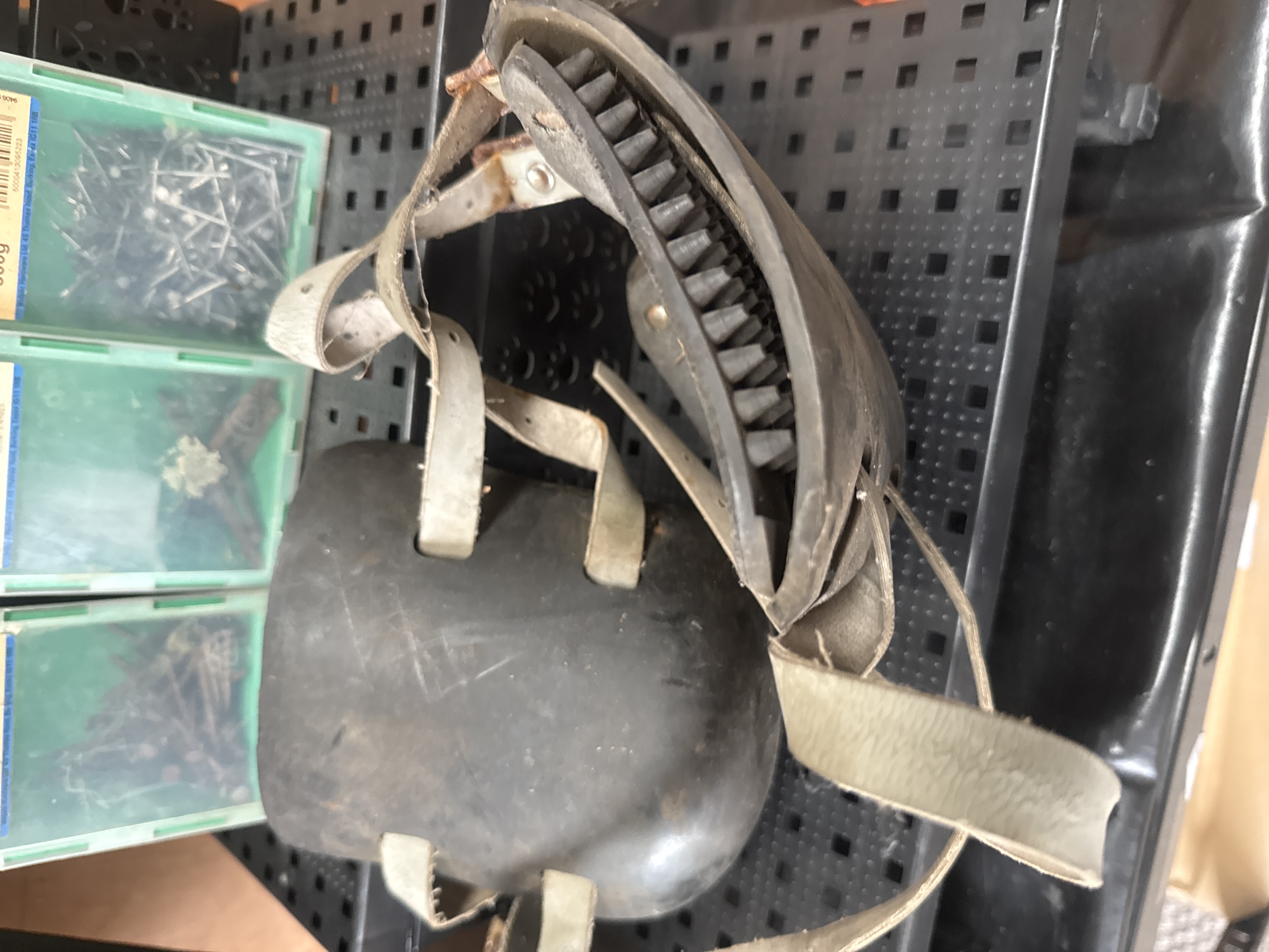 Items are in used, as-found condition. Visible surface wear, dust, and oxidation are present on metal components, particularly the jar lids and the Newton\'s Cradle frame. The cardboard boxes show edge wear, staining, and some tearing. Glass jars are empty and show internal residue. The knee pads show signs of use and surface scuffing.