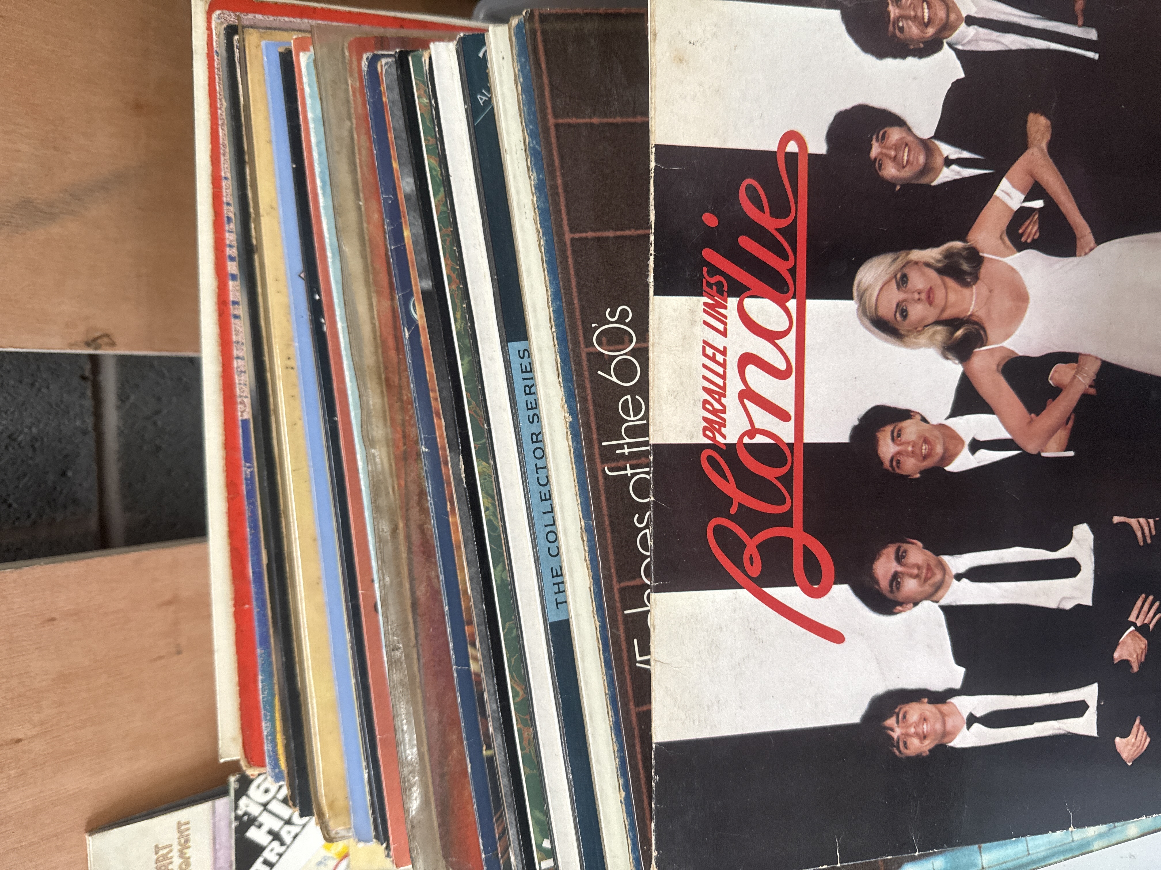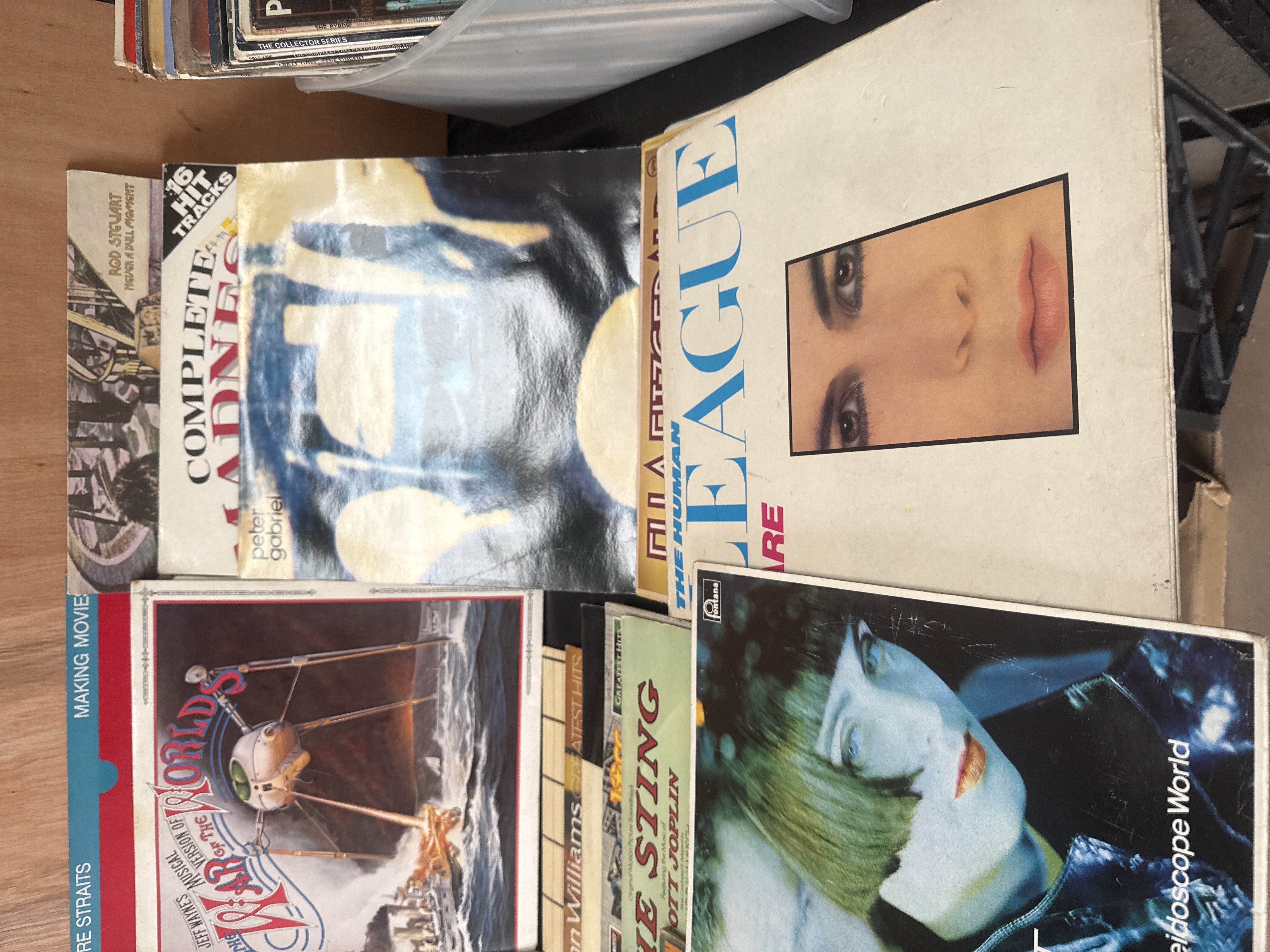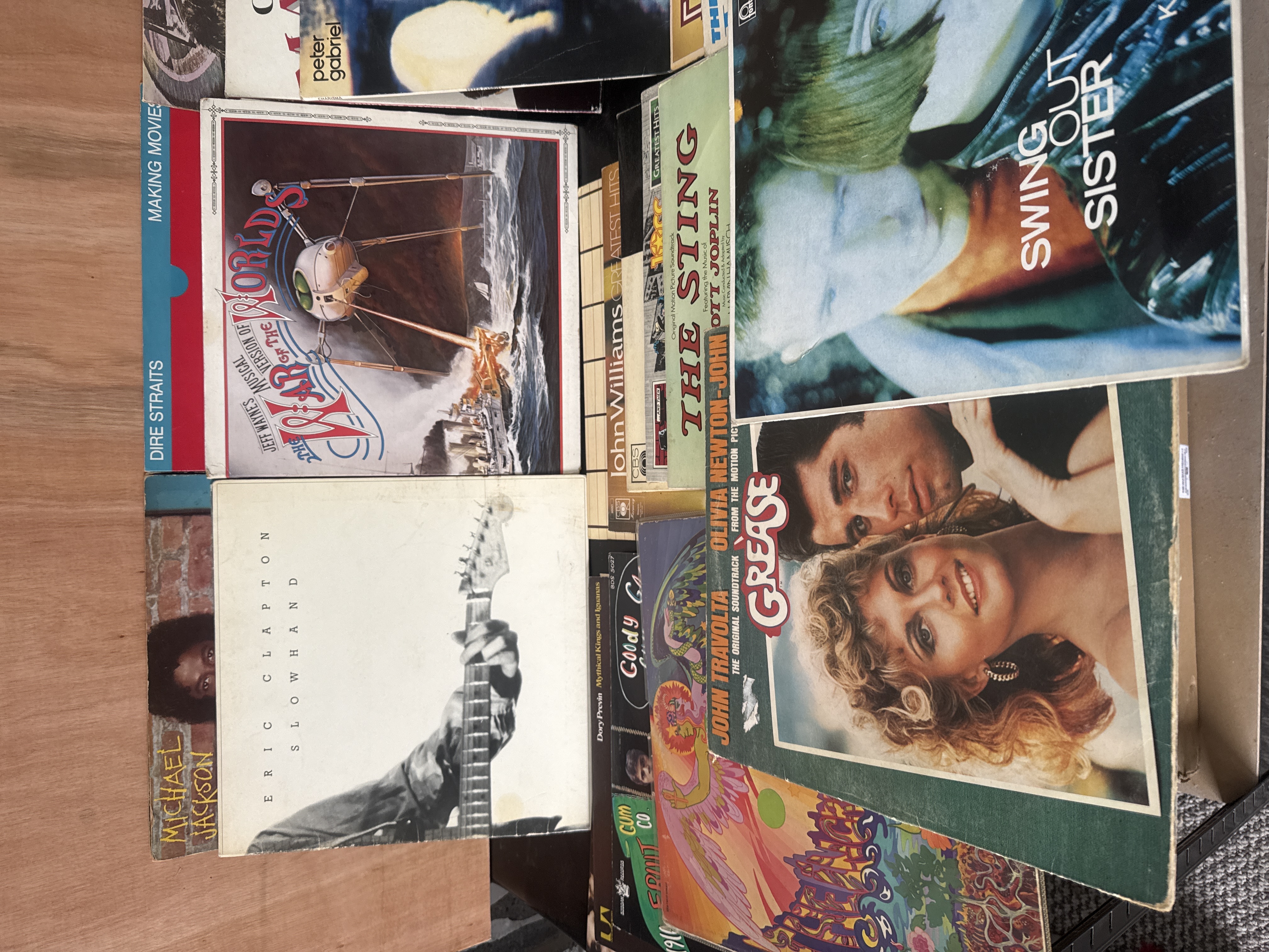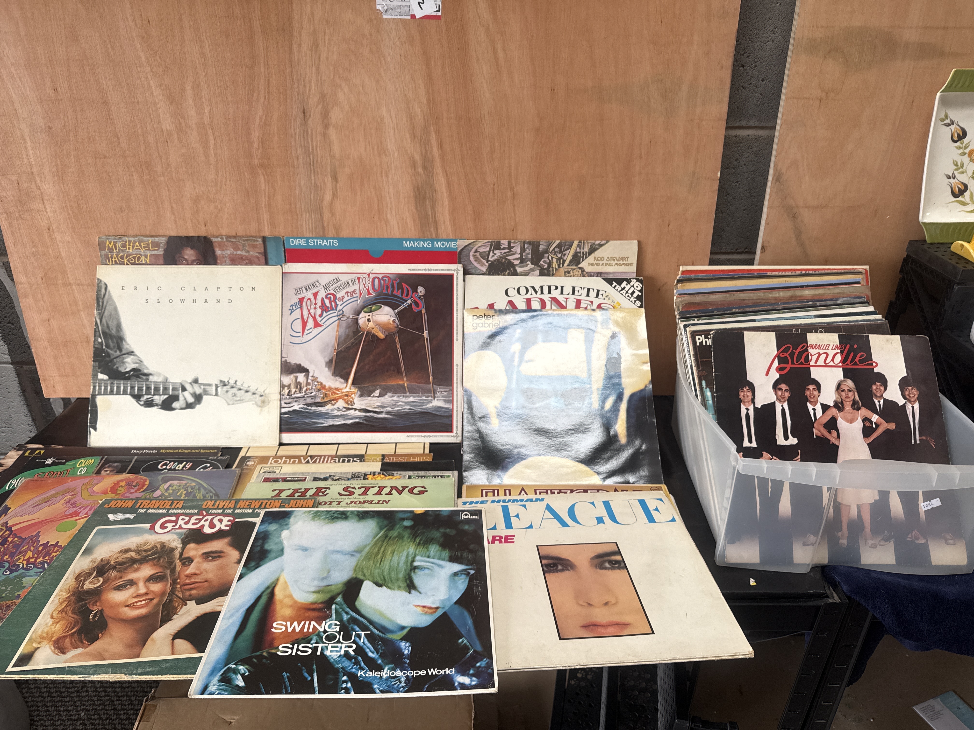 A group of vinyl LP records primarily featuring pop, rock, and soundtrack titles from the 1970s and 1980s. The collection includes artists and titles such as Blondie Parallel Lines, Eric Clapton Slowhand, Jeff Wayne’s Musical Version of The War of the Worlds, The Human League Dare, Swing Out Sister Kaleidoscope World, and the Grease original motion picture soundtrack. Other notable records include works by Peter Gabriel, Dire Straits, Michael Jackson, and Madness. The records are housed in original printed cardboard sleeves. Some items are contained within a translucent plastic storage bin.