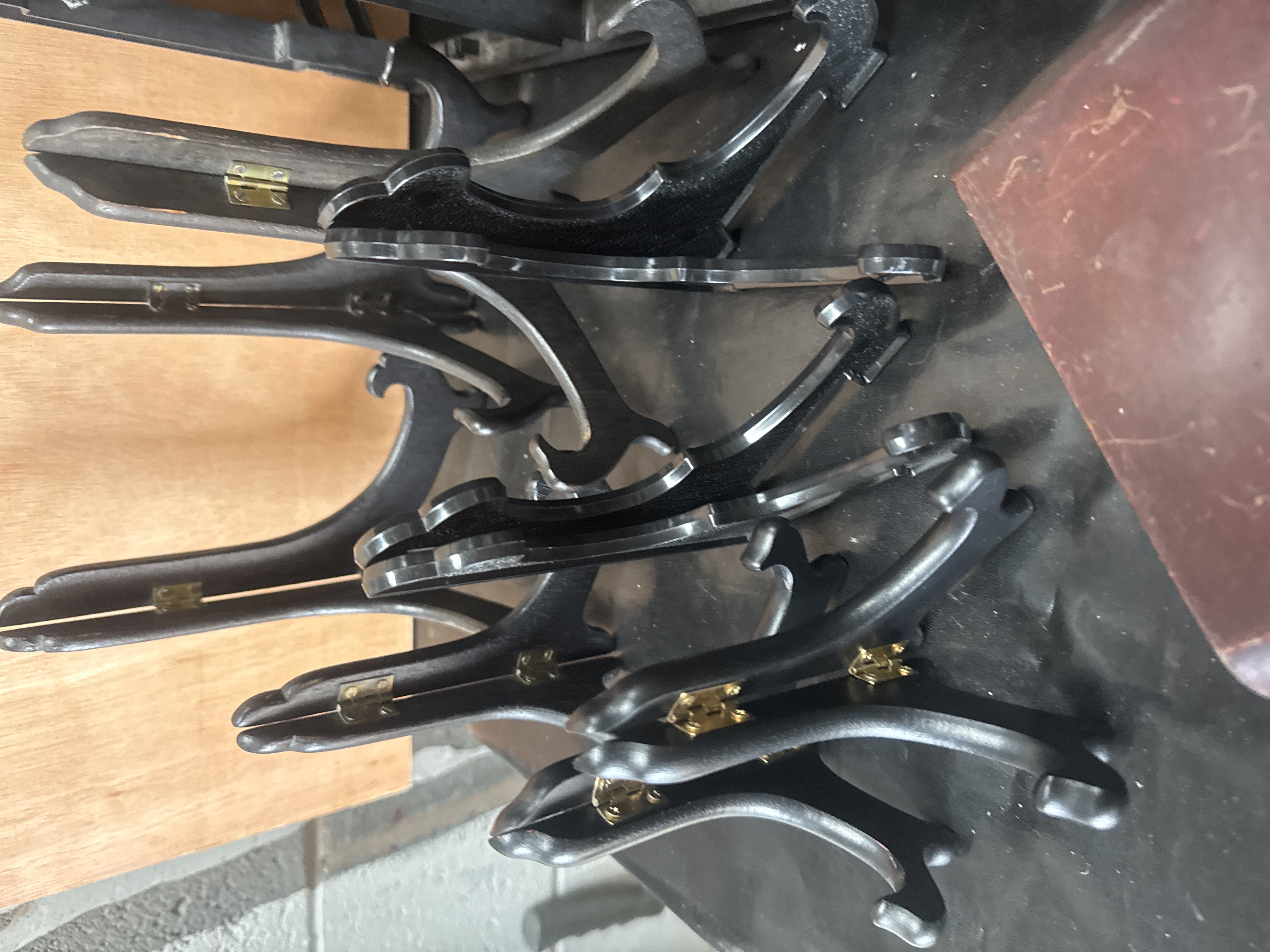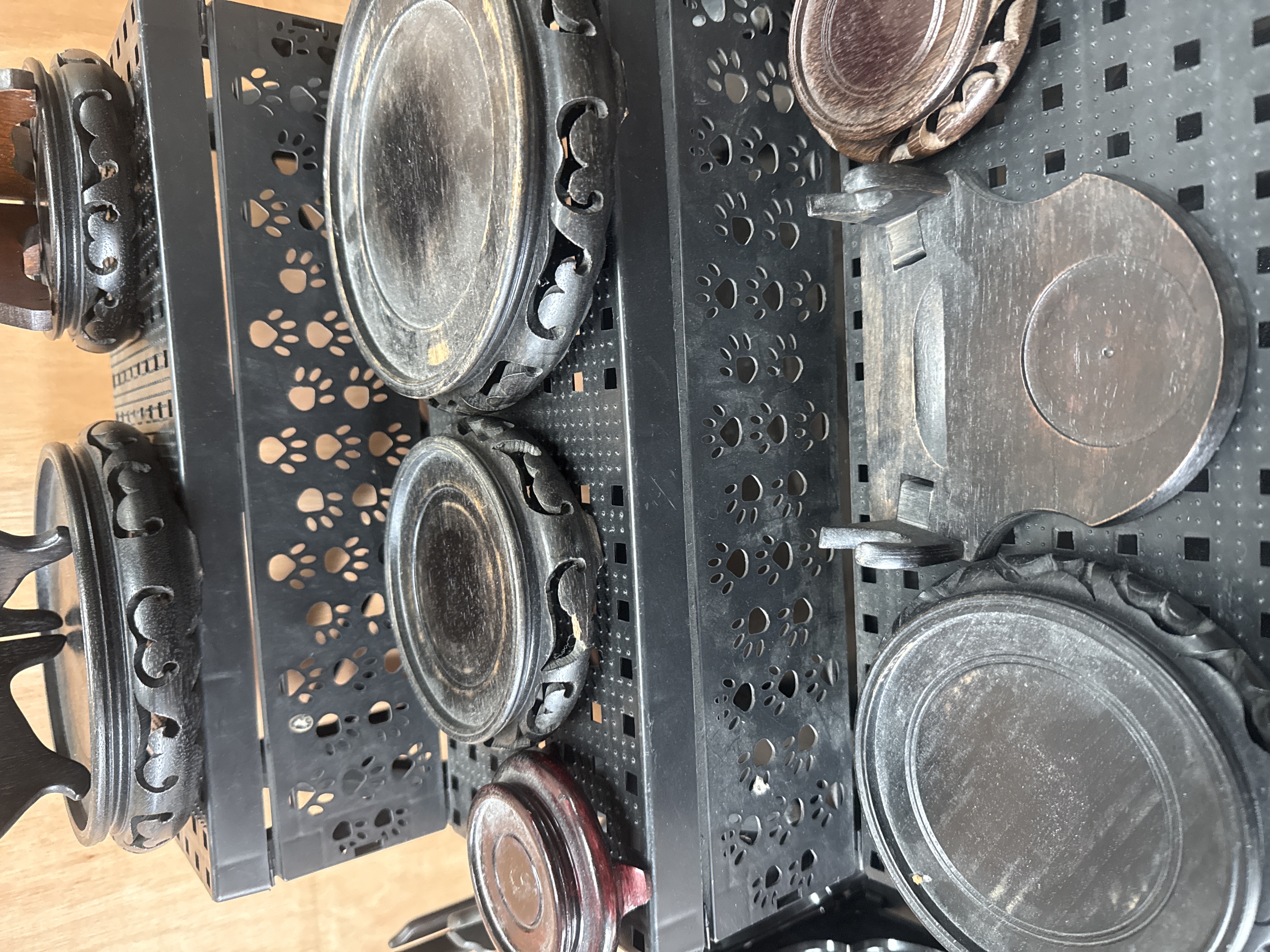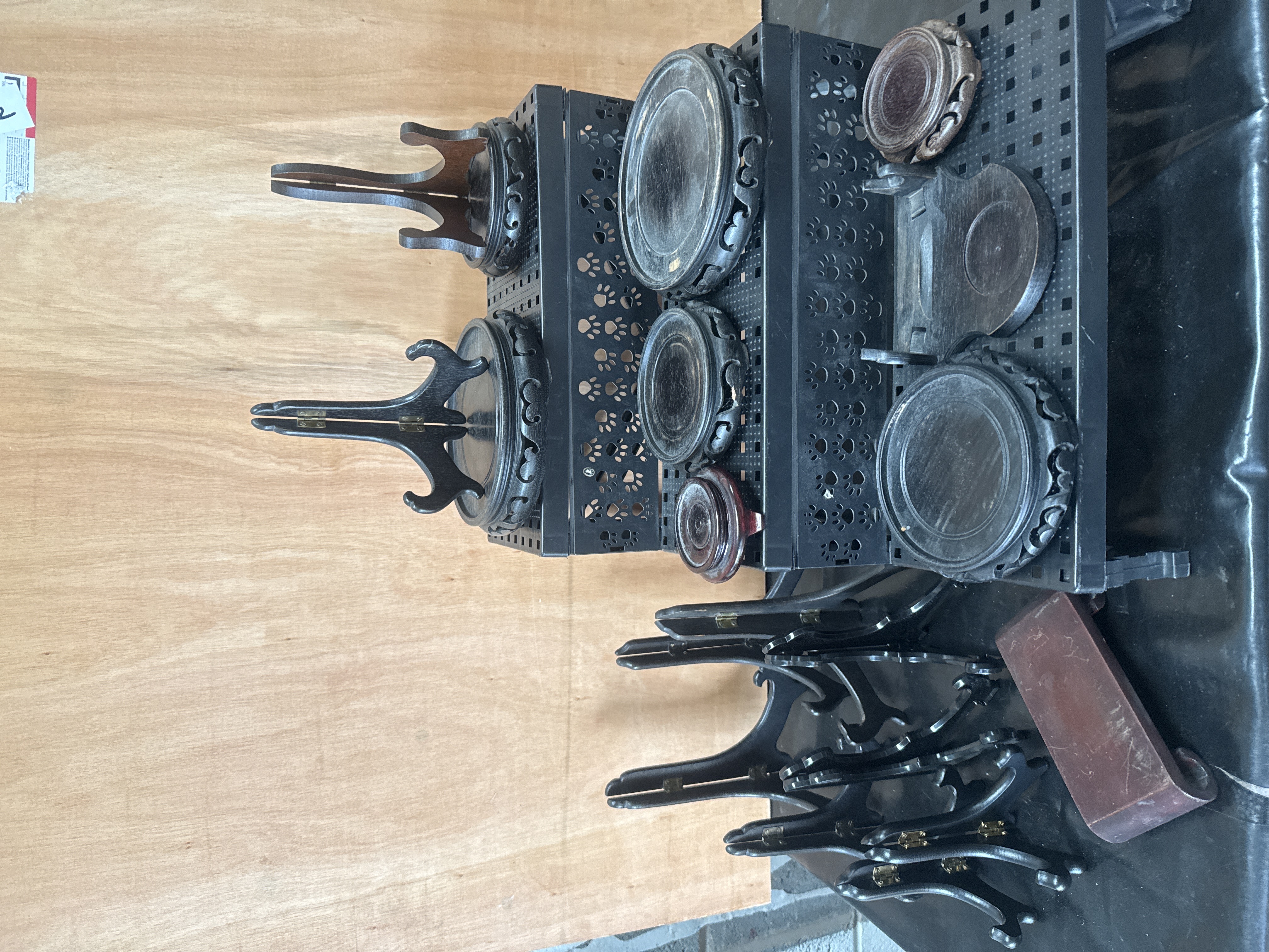 A collection of various wooden display stands designed for supporting vases, plates, and other decorative objects. The group comprises several circular vase stands featuring carved and pierced aprons in a traditional Oriental style. Additionally, the lot includes multiple hinged easel-style stands, primarily finished in a dark stain with brass-toned metal hardware. The items are constructed from various woods with finishes ranging from dark ebony tones to reddish-brown.