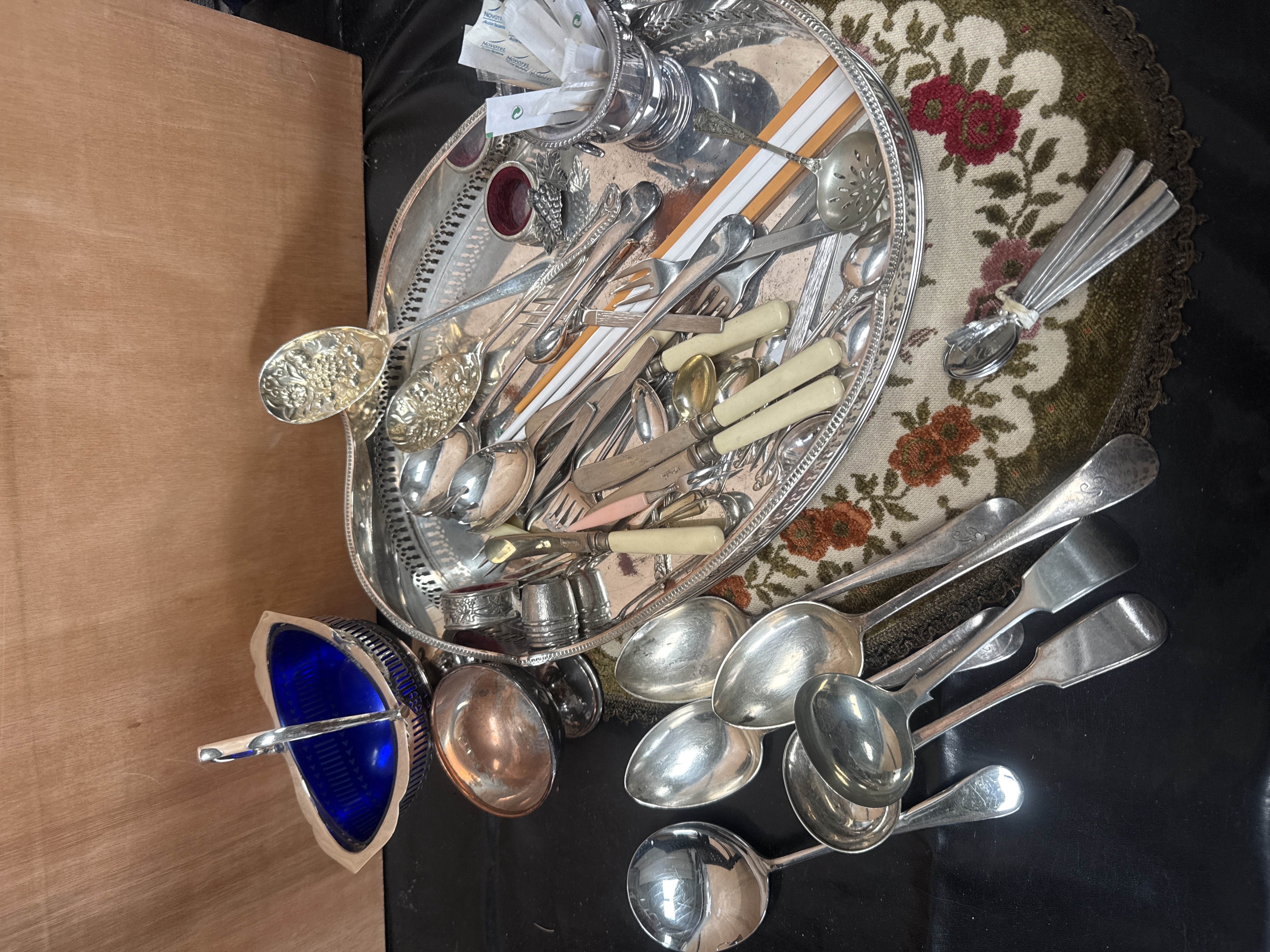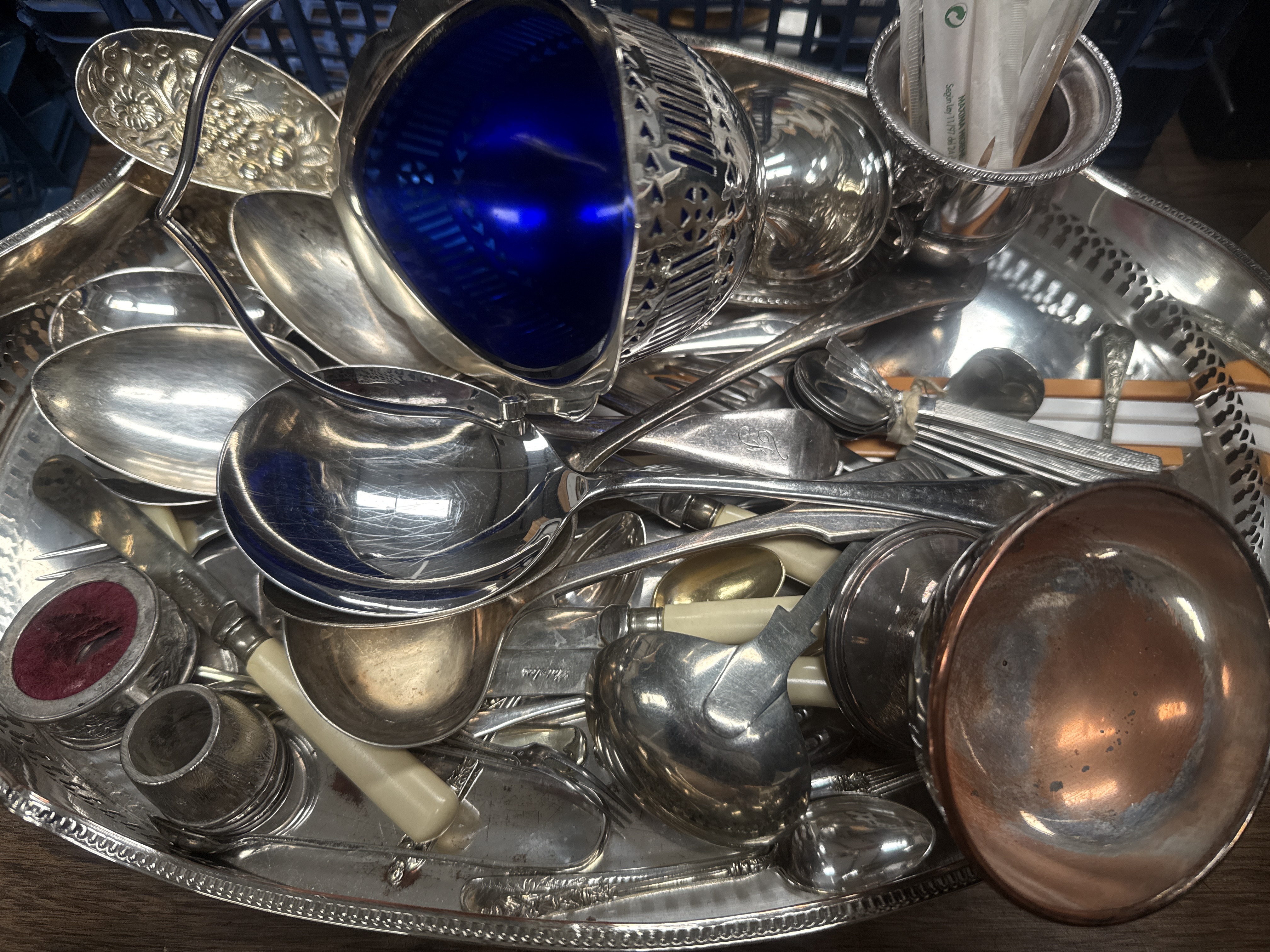 A collection of silver-plated and mixed-metal tableware and flatware presented on an oval silver-plated tray. The tray features a pierced gallery and a beaded rim. The flatware assortment includes various spoons such as large serving spoons, dessert spoons, and teaspoons, some of which feature engraved monograms. Also included are several forks and knives, including examples with cream-colored bone or synthetic handles. Notable hollowware items comprise a cobalt blue glass-lined condiment dish with a swing handle, multiple small metal cups or egg cups, one featuring a copper-toned interior, and a small red velvet-lined cellar. The collection encompasses several styles ranging from ornate embossed floral patterns to classic plain designs.