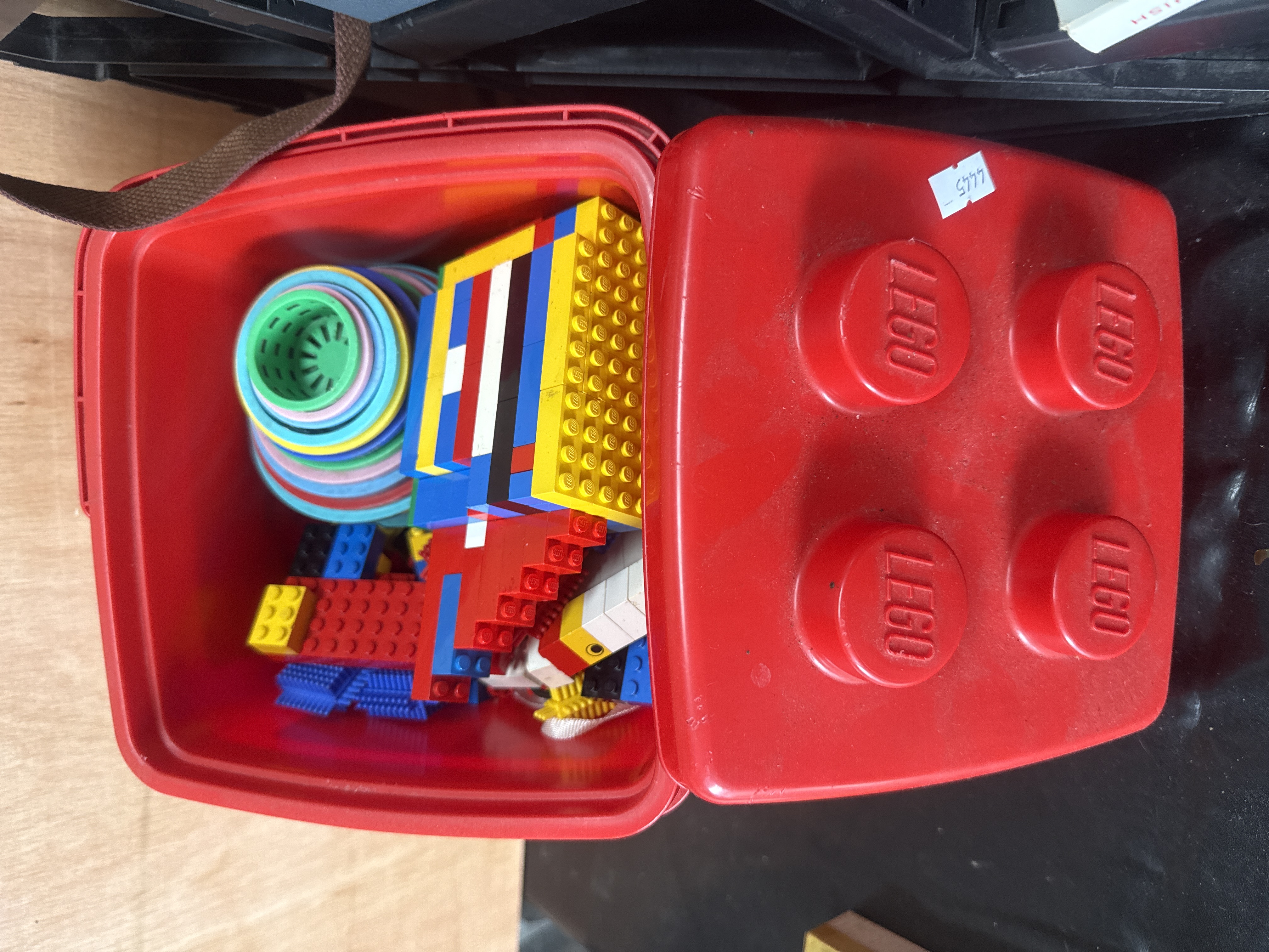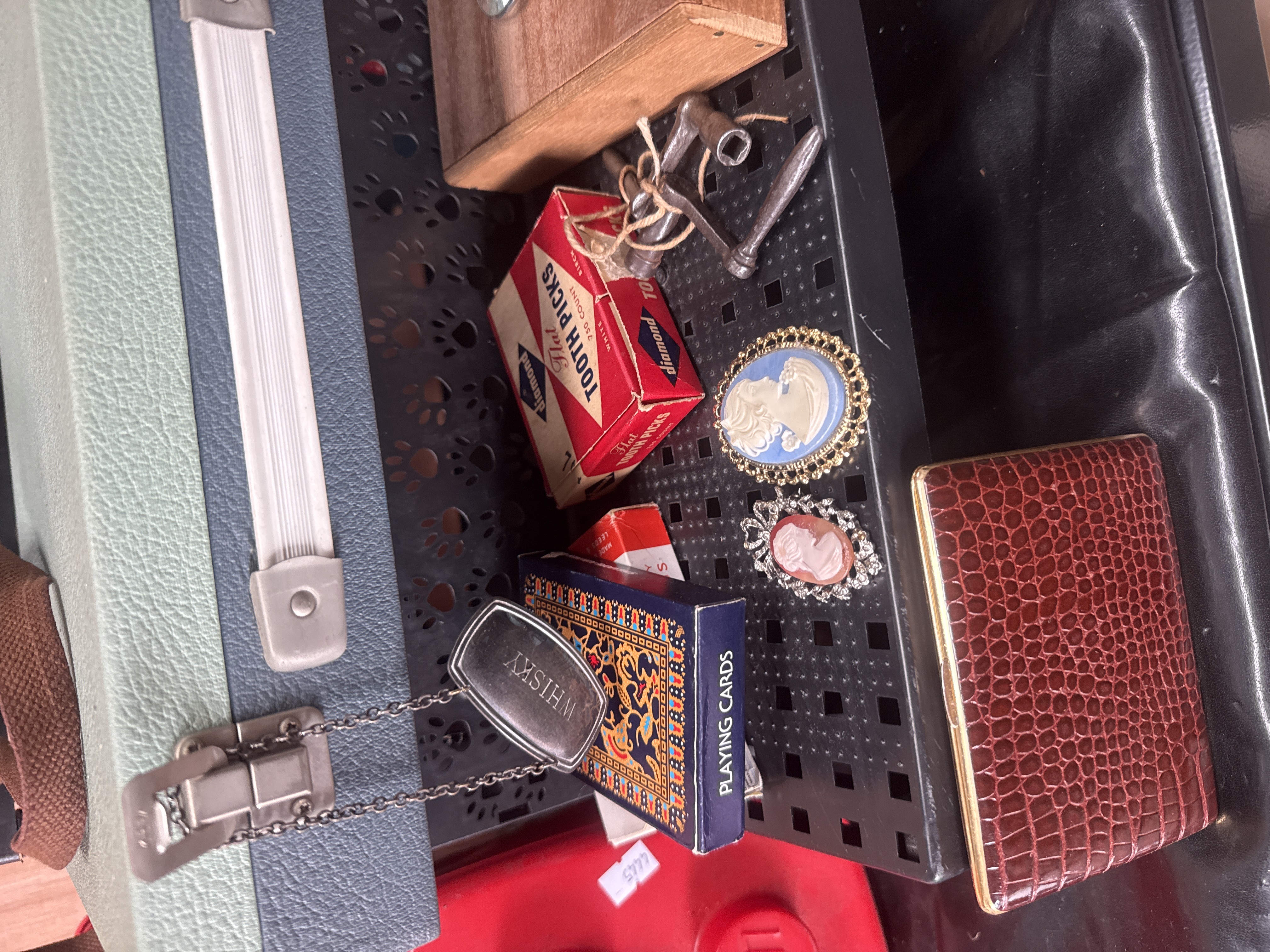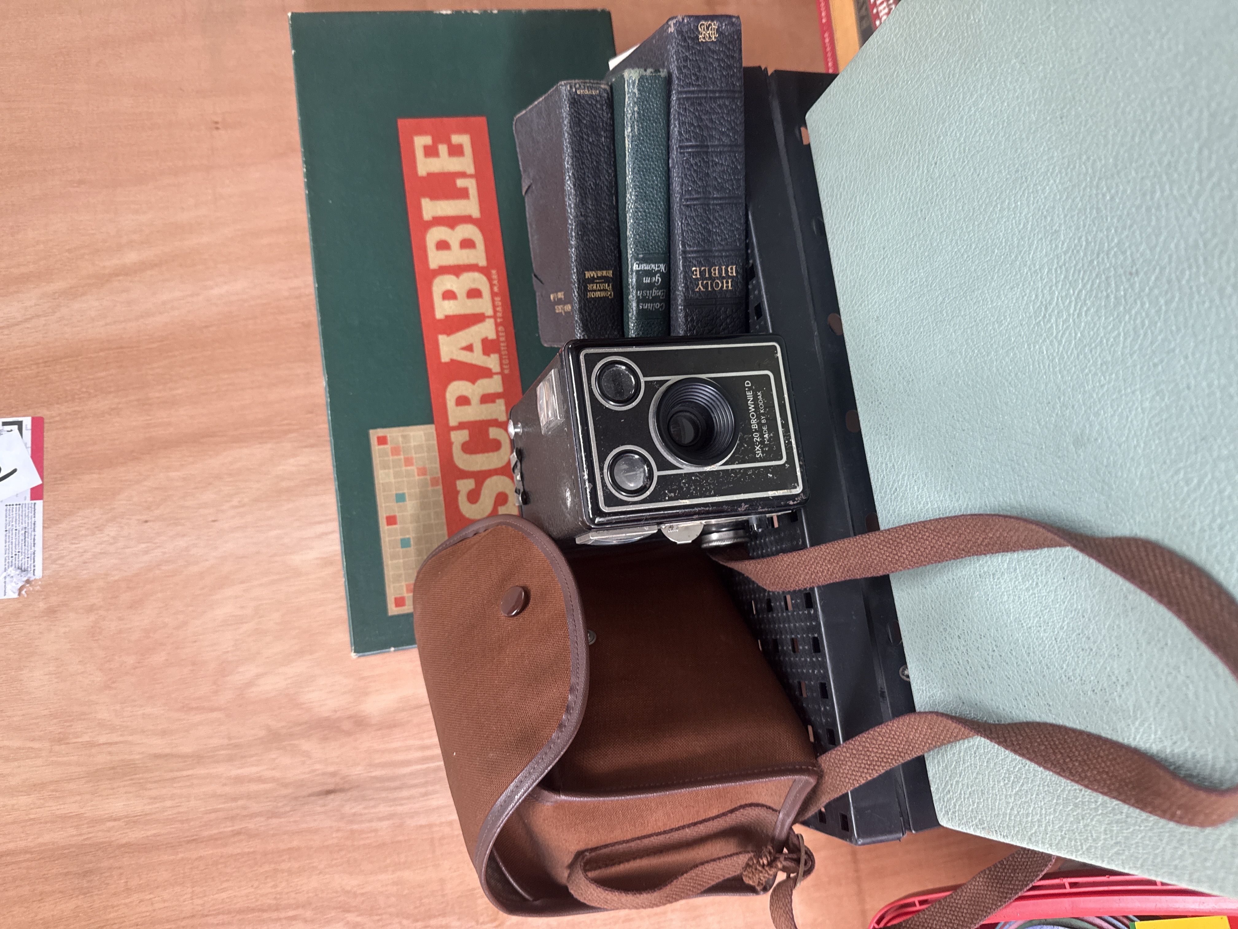 This collection features a variety of vintage household items and collectibles. Primary items include a Kodak Six-20 Brownie D box camera with a brown canvas carrying case and a two-tone blue and green textured Brexton picnic case. The group includes a red LEGO storage bin containing assorted plastic bricks and colorful stacking rings, alongside a boxed Scrabble game. A small selection of books is present, including a Holy Bible, a Collins dictionary, and a Book of Common Prayer. Personal accessories consist of two cameo brooches, one featuring a blue ground and the other a pink ground, a brown crocodile-patterned wallet, and a white pearlescent clutch bag with a decorative clasp. Additional objects include two metal decanter tags labeled WHISKY and SHERRY, a set of vintage metal keys, a box of Diamond brand toothpicks, and wooden storage containers including a Hamlet branded cigar box and a Phillis cigar box. The items are arranged upon a black perforated metal base, identified as a vintage Singer sewing machine case component.